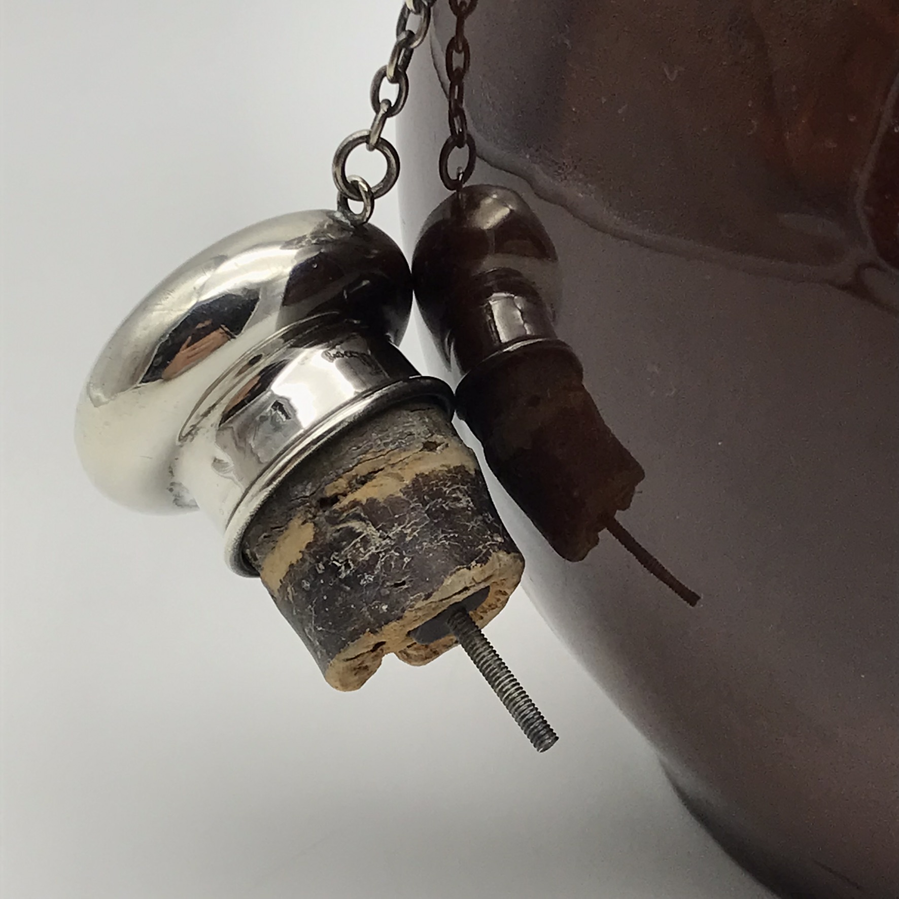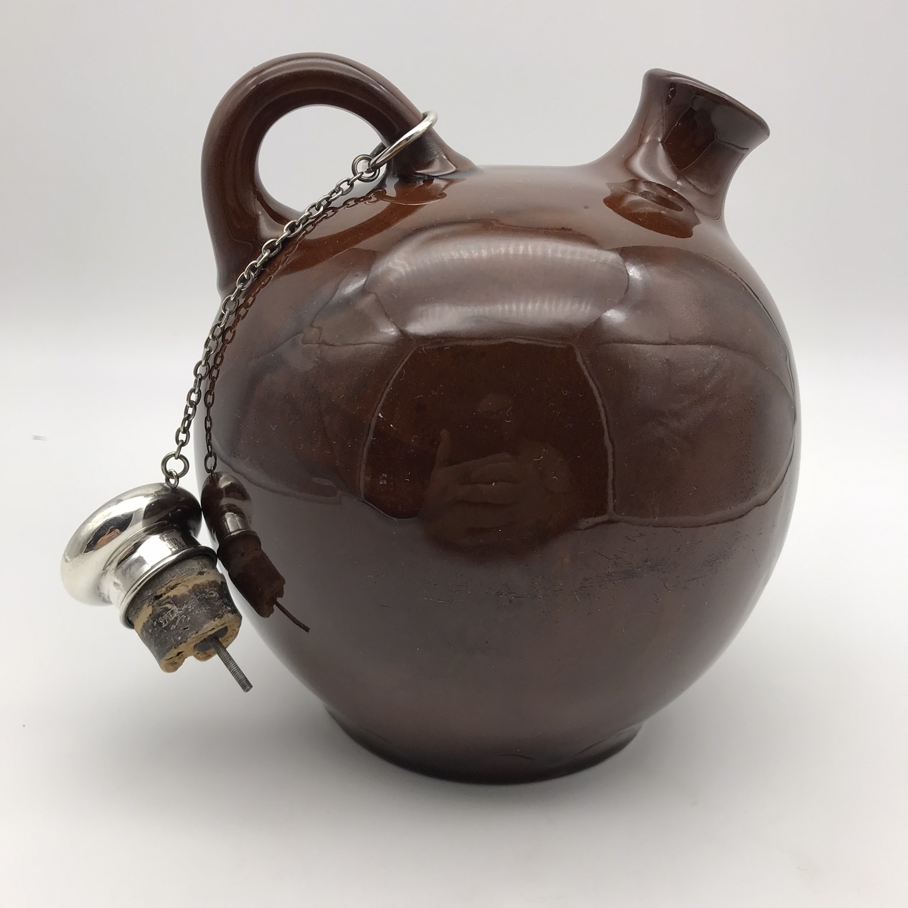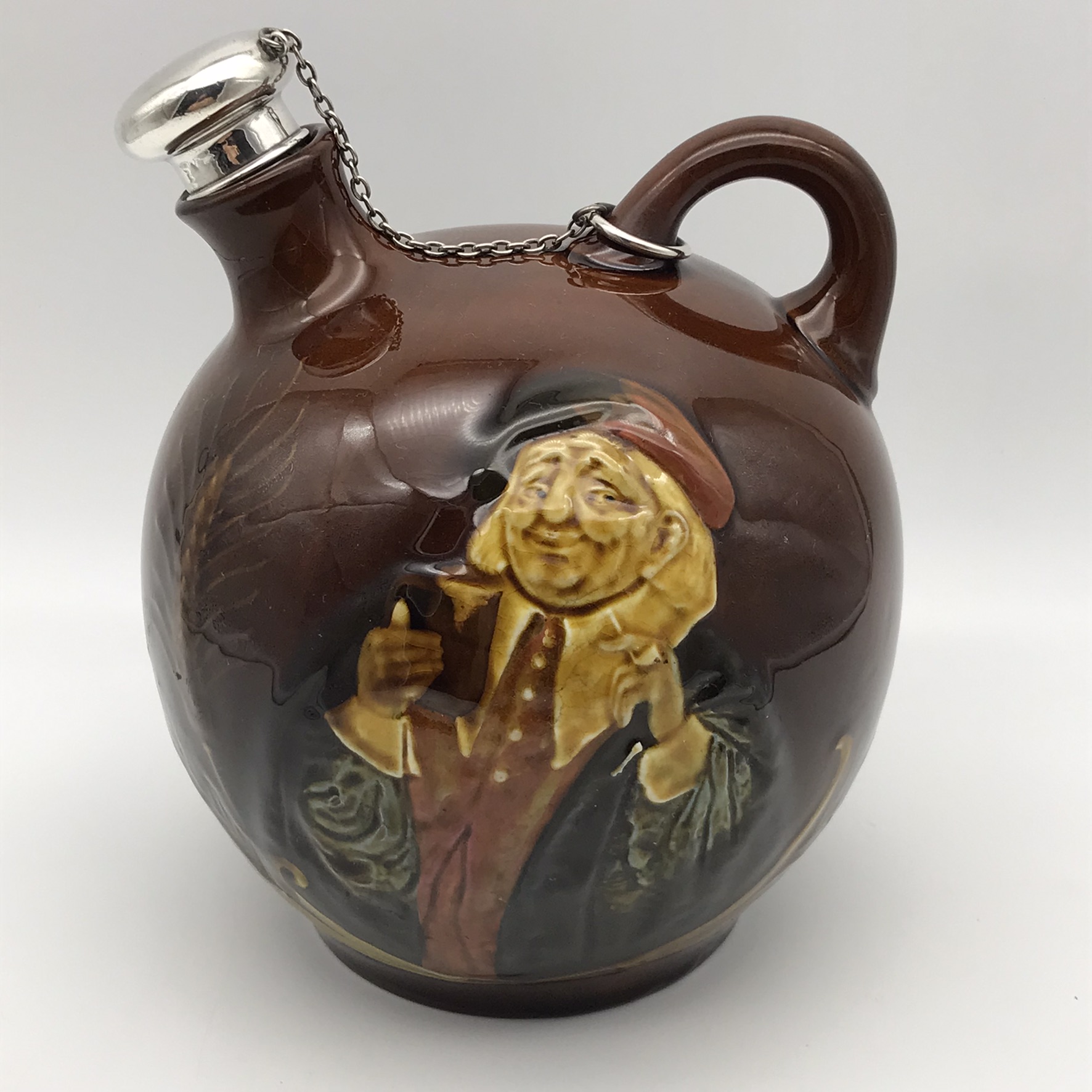 This lovely, scarce, antique Royal Doulton ‘Kingsware’ flask from the early 1900’s is quite special, as it’s complete with its original, English hallmarked sterling silver stopper and chain. These flasks rarely show up for sale with their original silver stoppers. It has an unusual globular shape with a short spout and small handle and features ‘John Barleycorn’ with a drink in hand, on the one side, all in relief. Sadly, although not very noticeable, the short spout near the top has been restored. The silver stopper is clearly hallmarked, informing us it was made in 1905, in London by silversmiths ‘George Betjemann & Sons’ (G.E & SONS), and other than the restoration mentioned, it’s in great condition and still has its original cork in the stopper. It stands 18cm high, with a rough diameter of 15cm at its widest and weighs 790g.