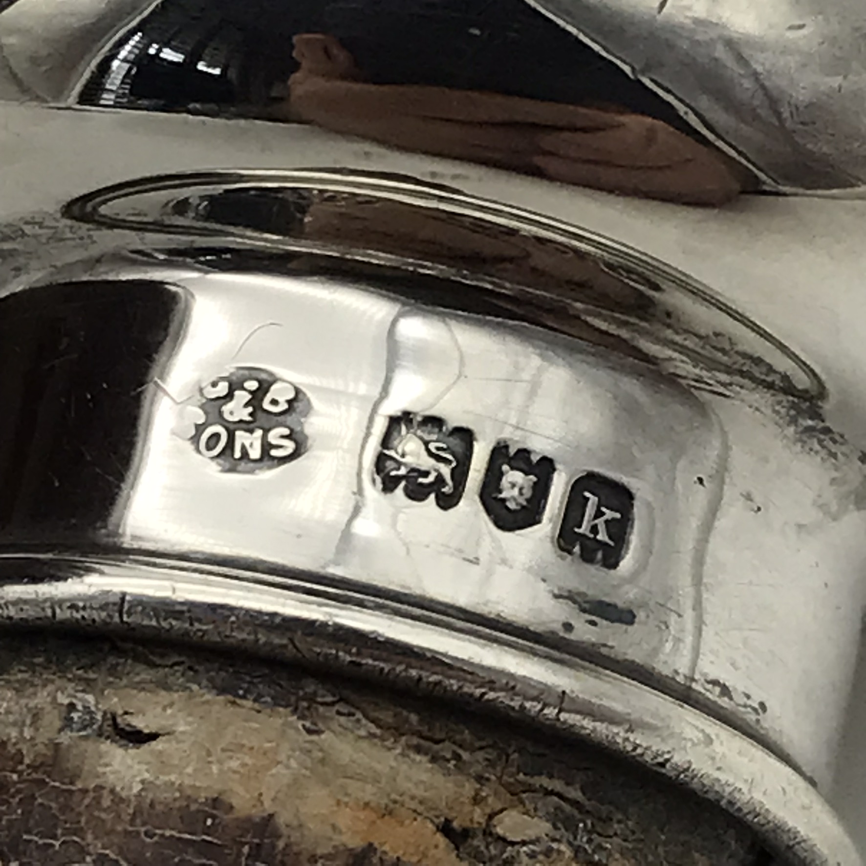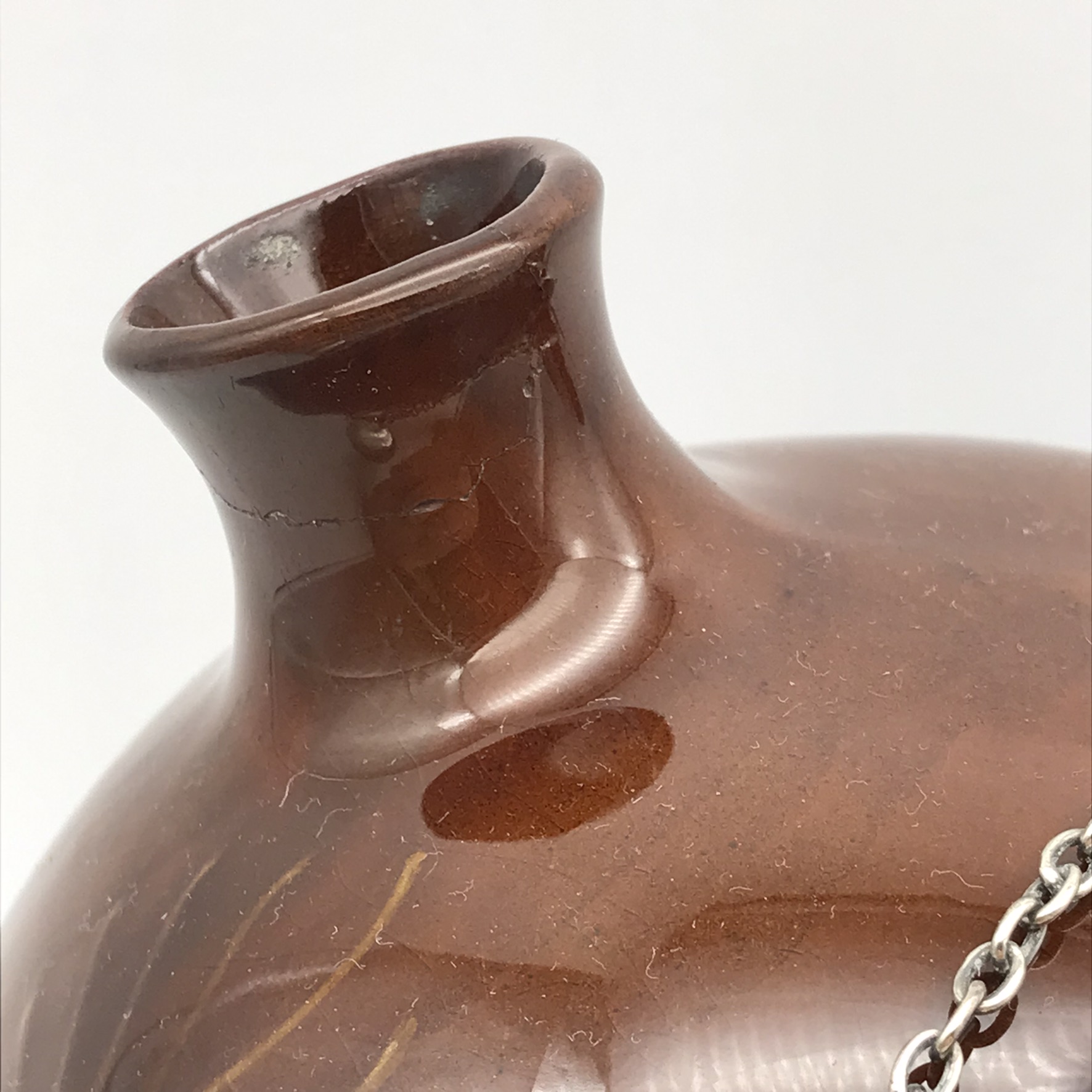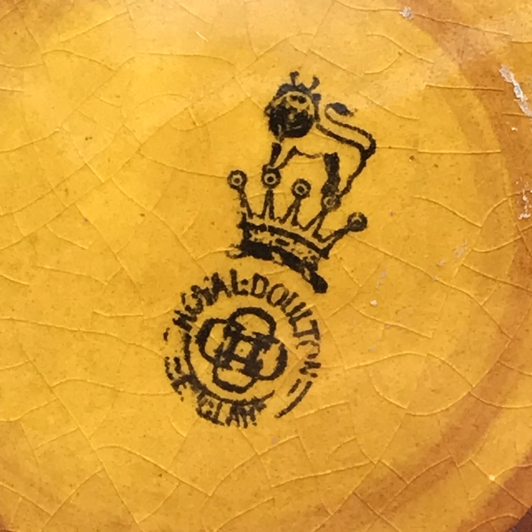 This lovely, scarce, antique Royal Doulton ‘Kingsware’ flask from the early 1900’s is quite special, as it’s complete with its original, English hallmarked sterling silver stopper and chain. These flasks rarely show up for sale with their original silver stoppers. It has an unusual globular shape with a short spout and small handle and features ‘John Barleycorn’ with a drink in hand, on the one side, all in relief. Sadly, although not very noticeable, the short spout near the top has been restored. The silver stopper is clearly hallmarked, informing us it was made in 1905, in London by silversmiths ‘George Betjemann & Sons’ (G.E & SONS), and other than the restoration mentioned, it’s in great condition and still has its original cork in the stopper. It stands 18cm high, with a rough diameter of 15cm at its widest and weighs 790g.