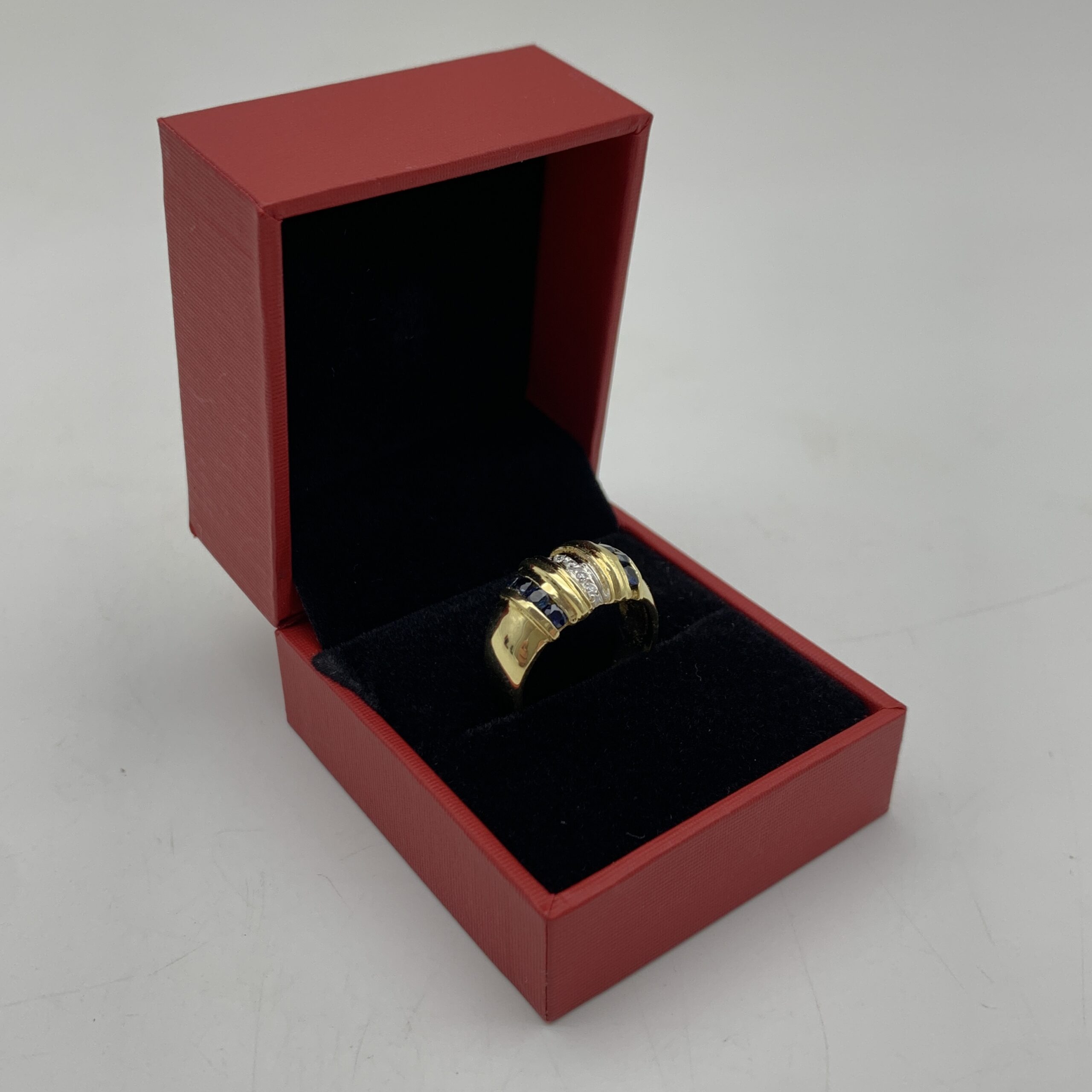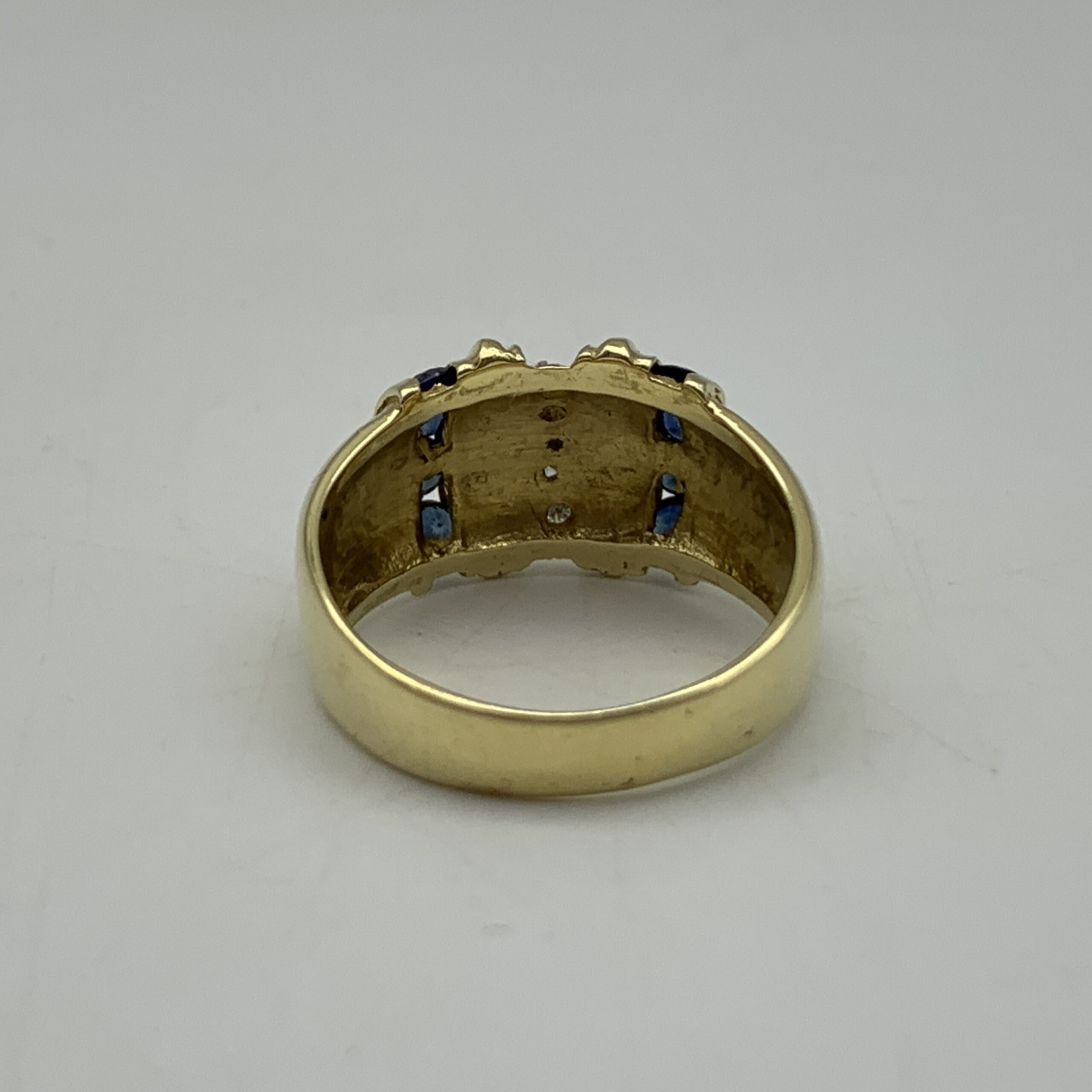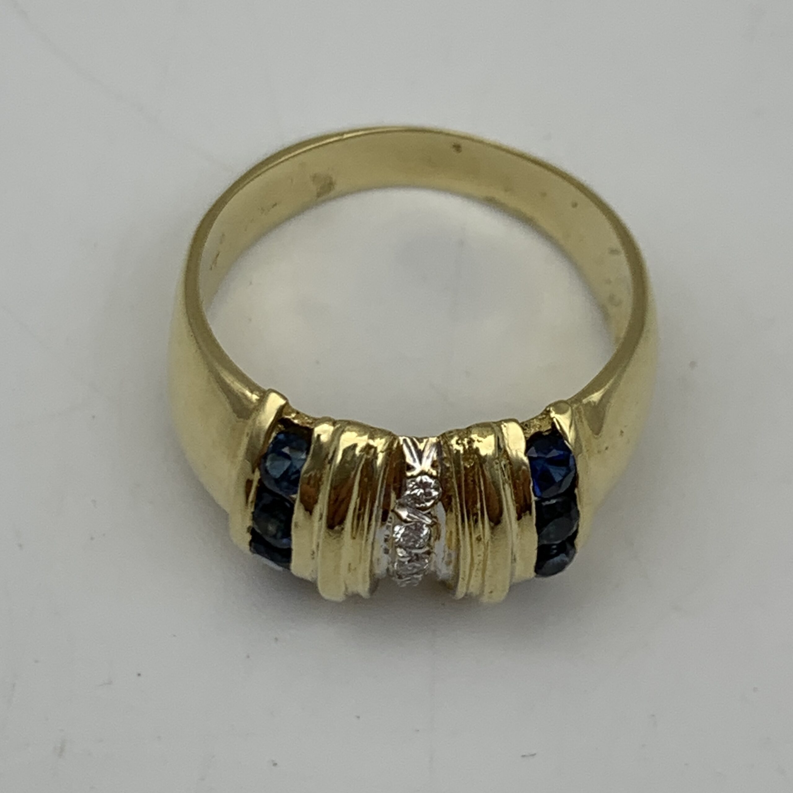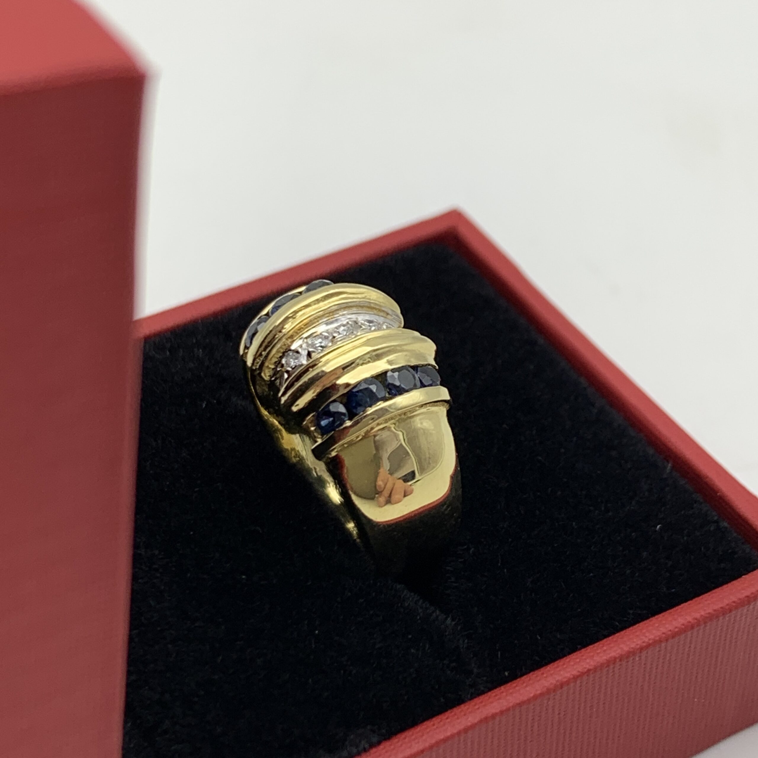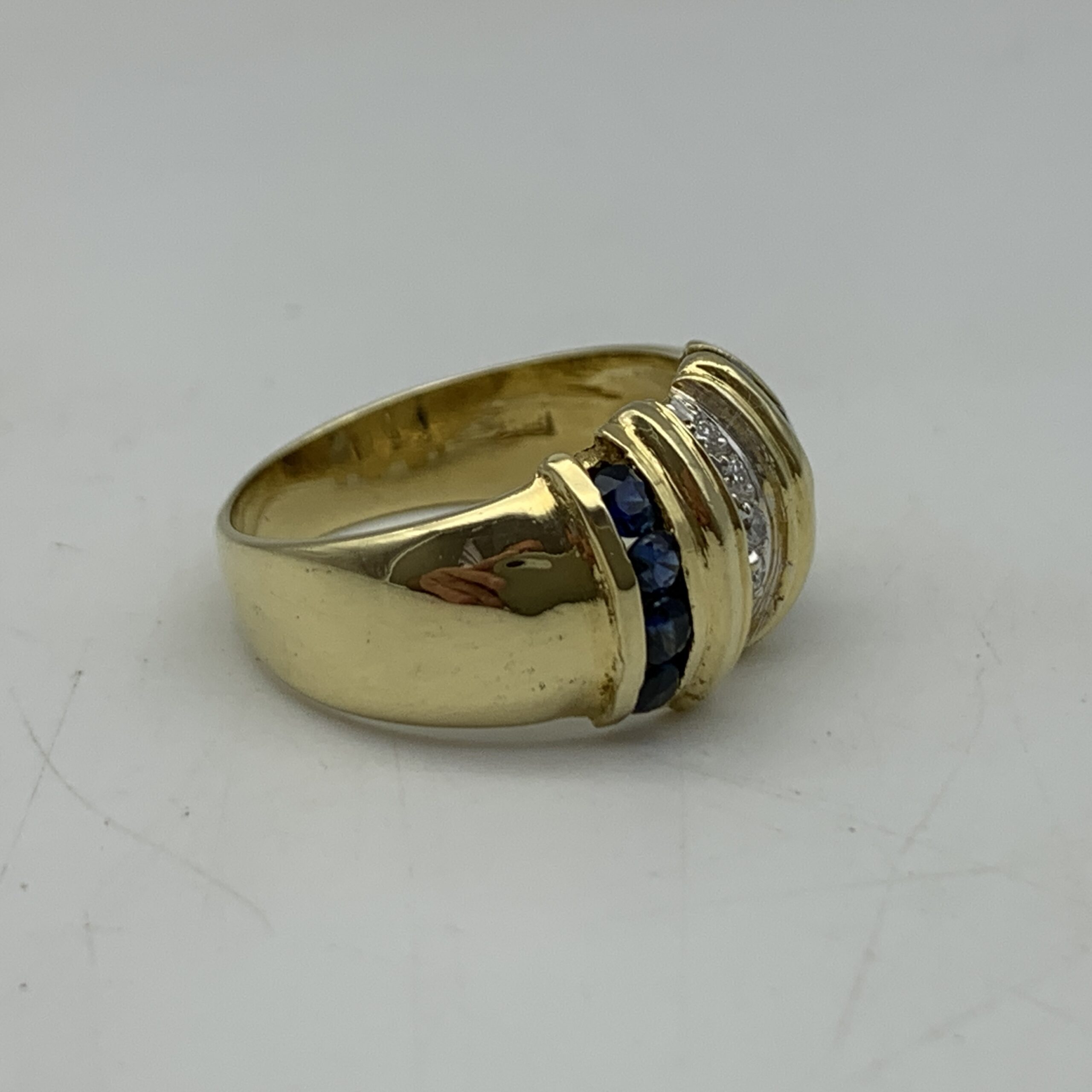 This very attractive, pre-owned, solid 18ct gold, diamond and sapphire dress ring is beautifully made with two rows of four, ‘channel-set’ Ceylon blue sapphires and a row of five, ‘claw-set’ diamonds down the centre. It’s a super quality ring that’s in excellent condition with a ring size of ‘L 1/2’, and a weight of 6,4g.