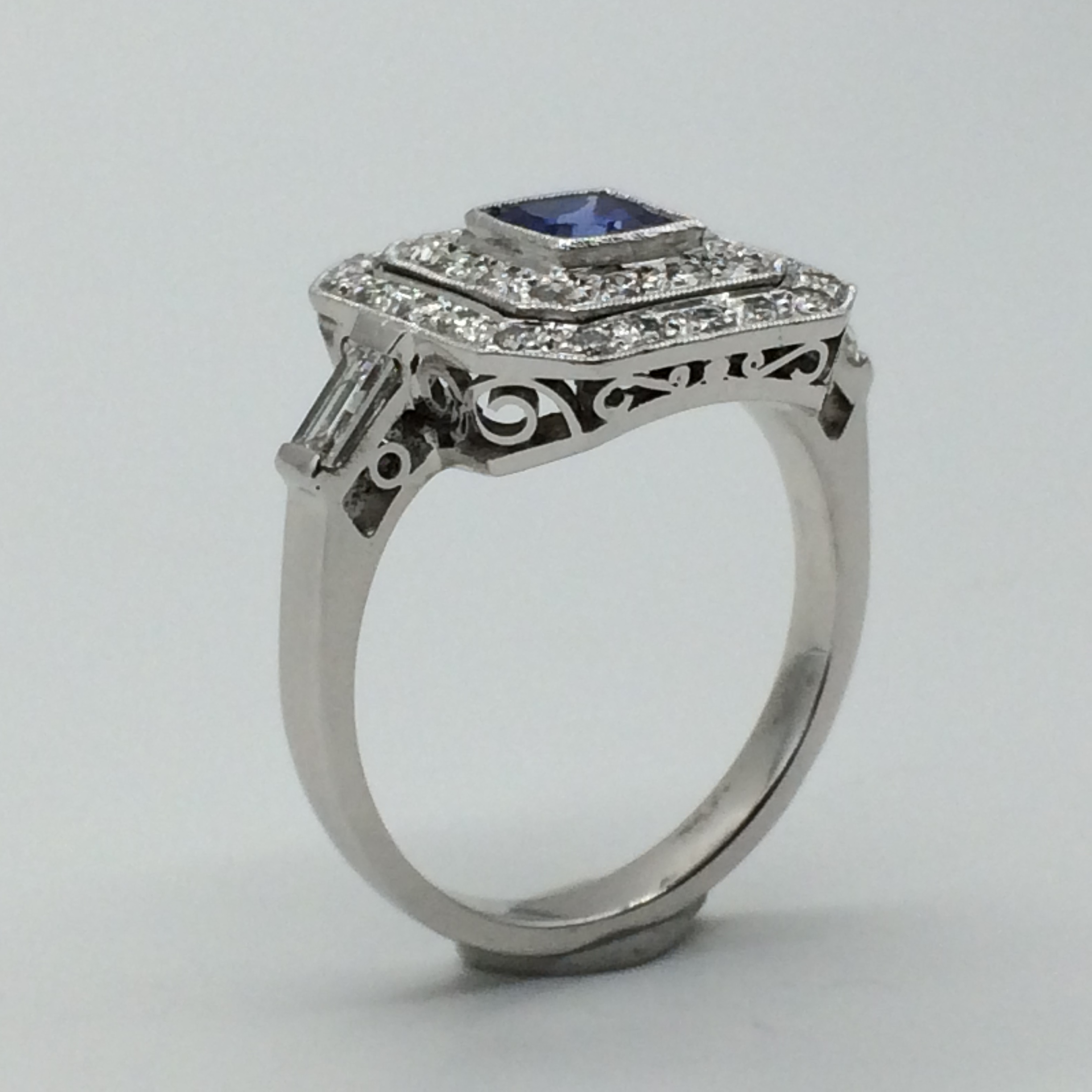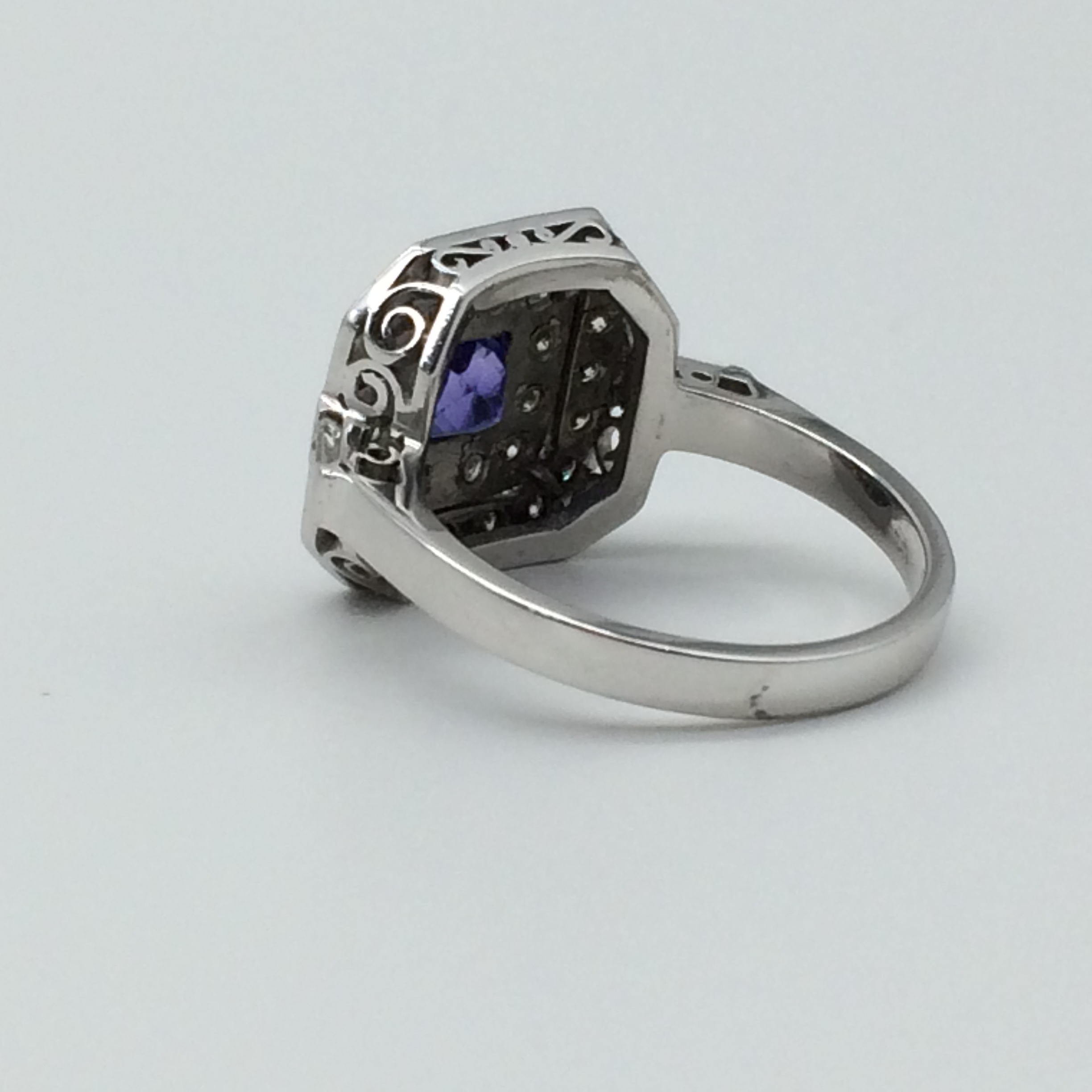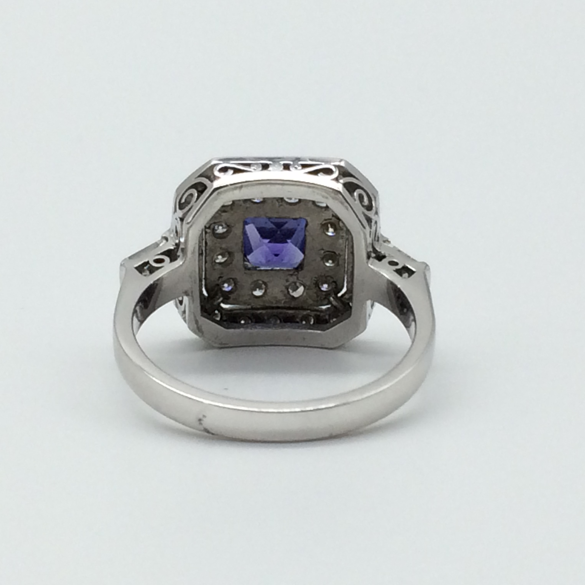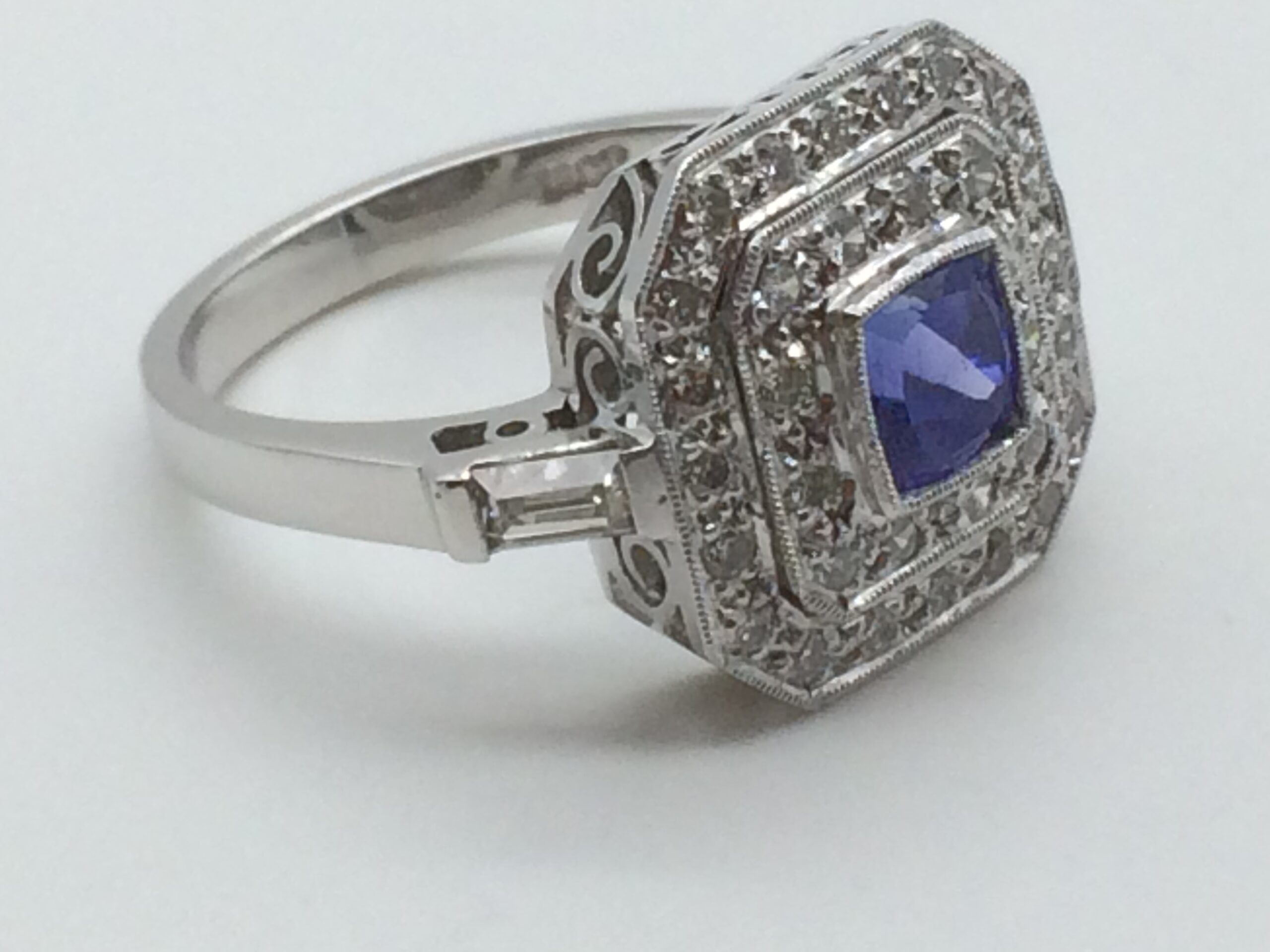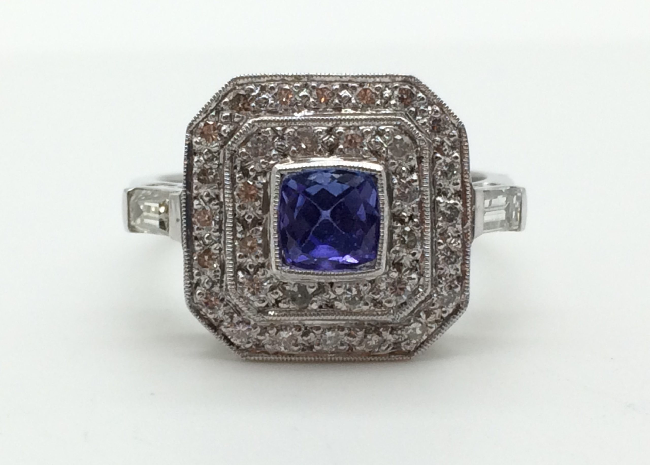 This striking Art Deco style 18ct white gold dress ring is set with 1 x large ‘cushion’ cut tanzanite (5.00mm x 5.00mm), 2 x ‘baguette’ diamonds (=0.16ct ) and 32 x ‘brilliant’ cut diamonds (=0.32ct). The ring is in excellent condition and weighs 5.69g. Ring Size 'O'.