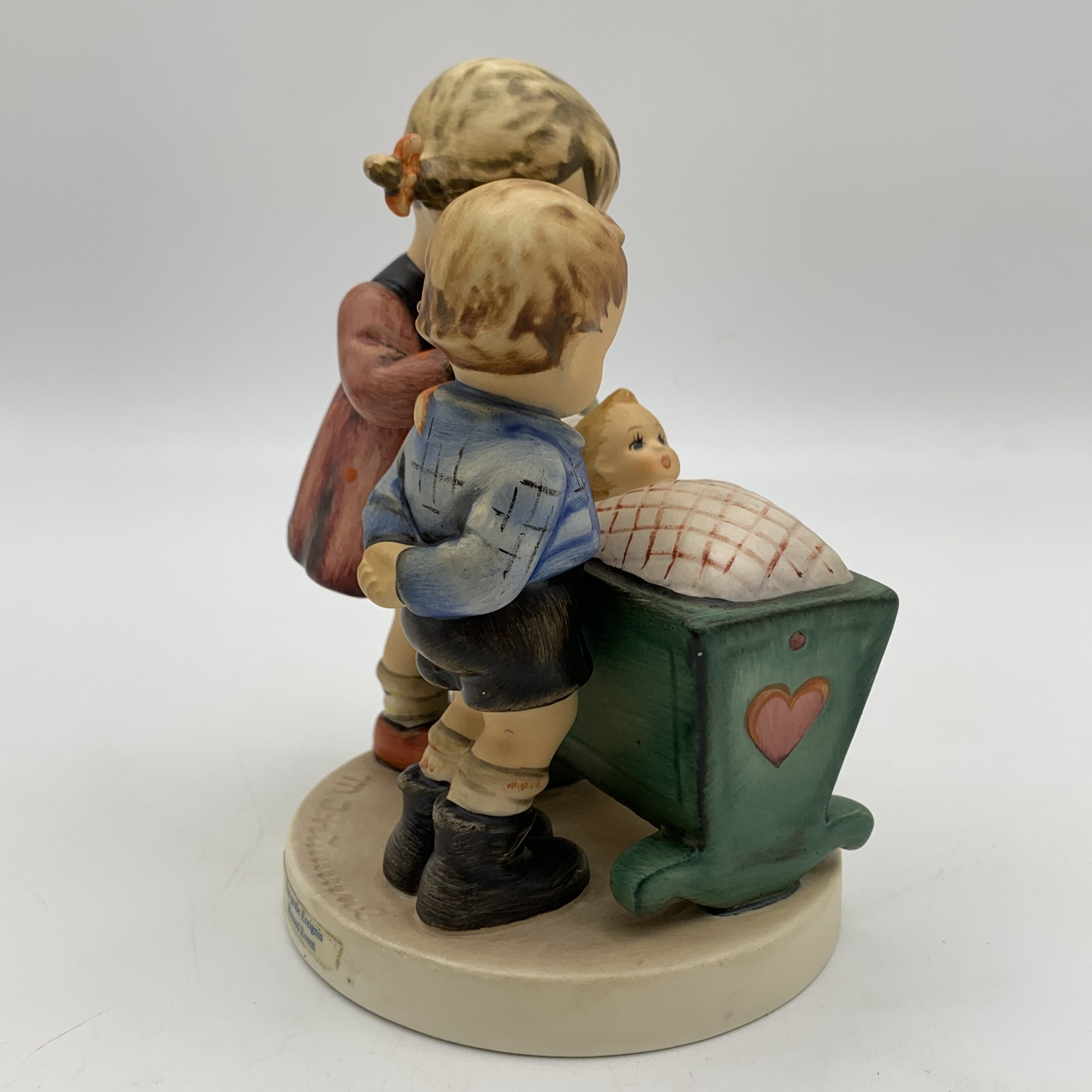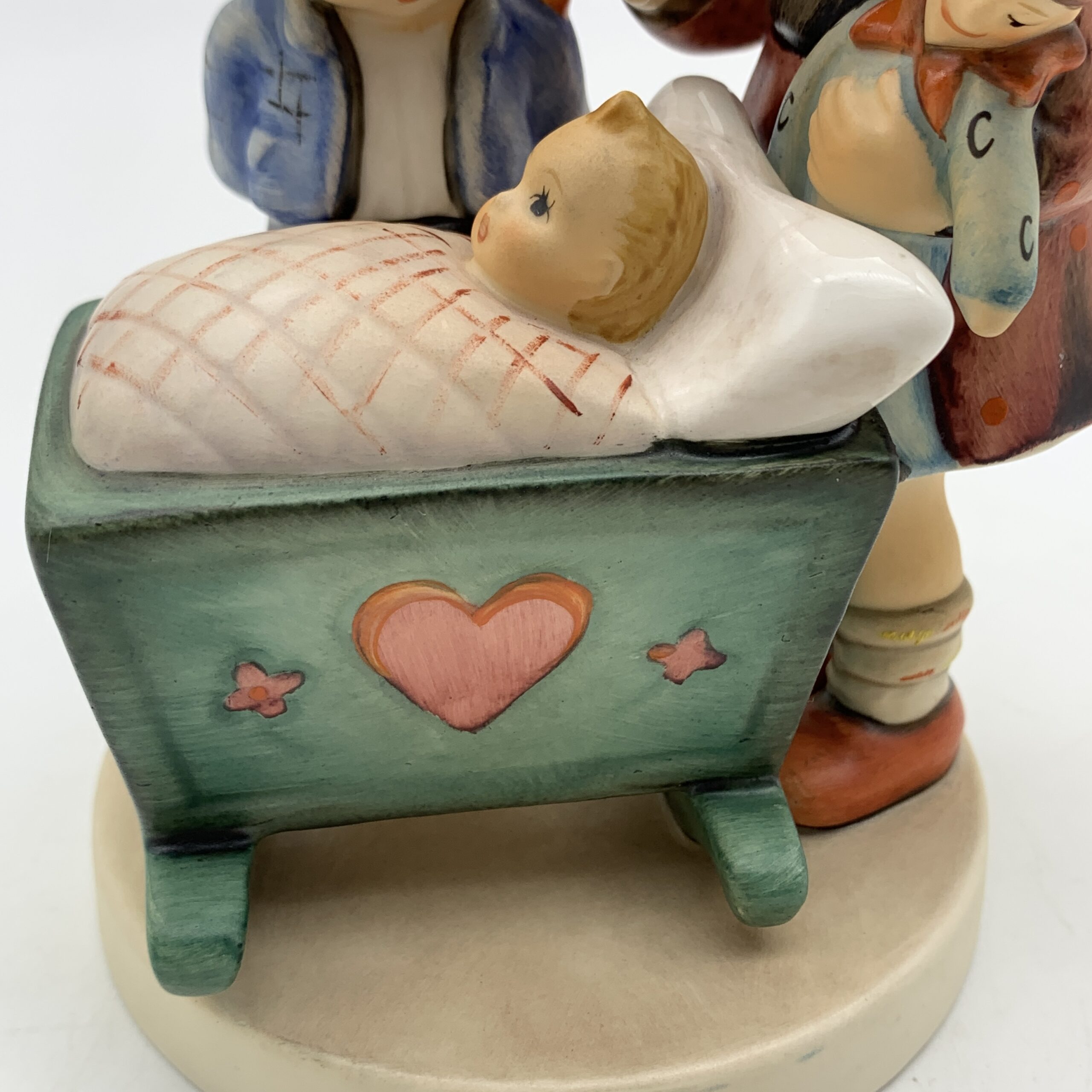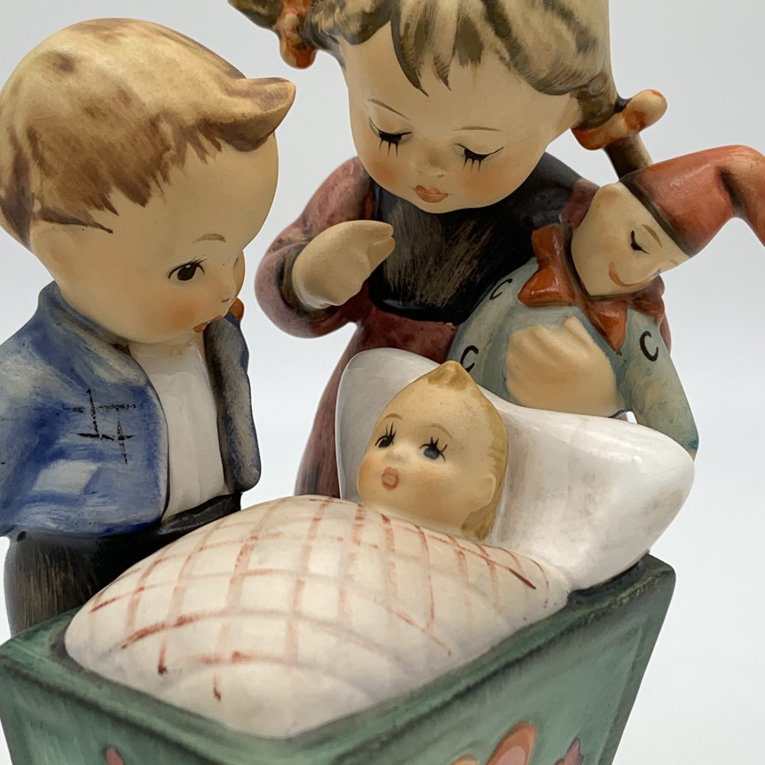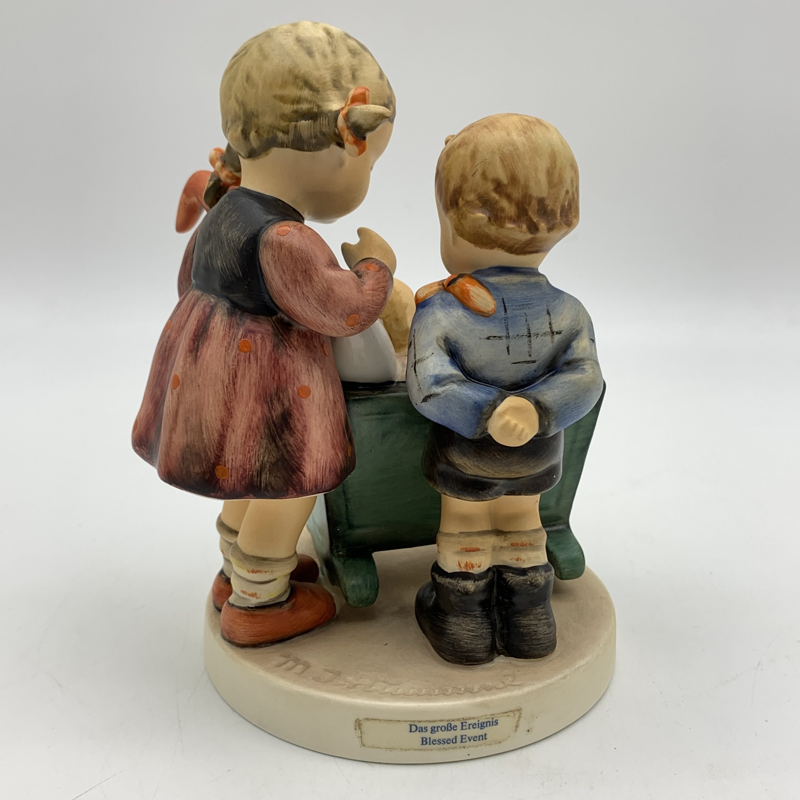 This adorable, large, hand painted ‘Hummel’ figurine, titled ‘Blessed Event’, features a young boy and girl, probably siblings, admiring a newborn baby tucked snuggly in its cradle. The base is impressed with the model number ‘333’ and the date ‘1955’ for when it was originally designed by ‘Arthur Moeller’. It carries the blue ‘TMK 7’ backstamp, dating this piece between 1990 and 1999. This lovely figure is in excellent condition and stands 13,5cm high by 10cm at its widest.