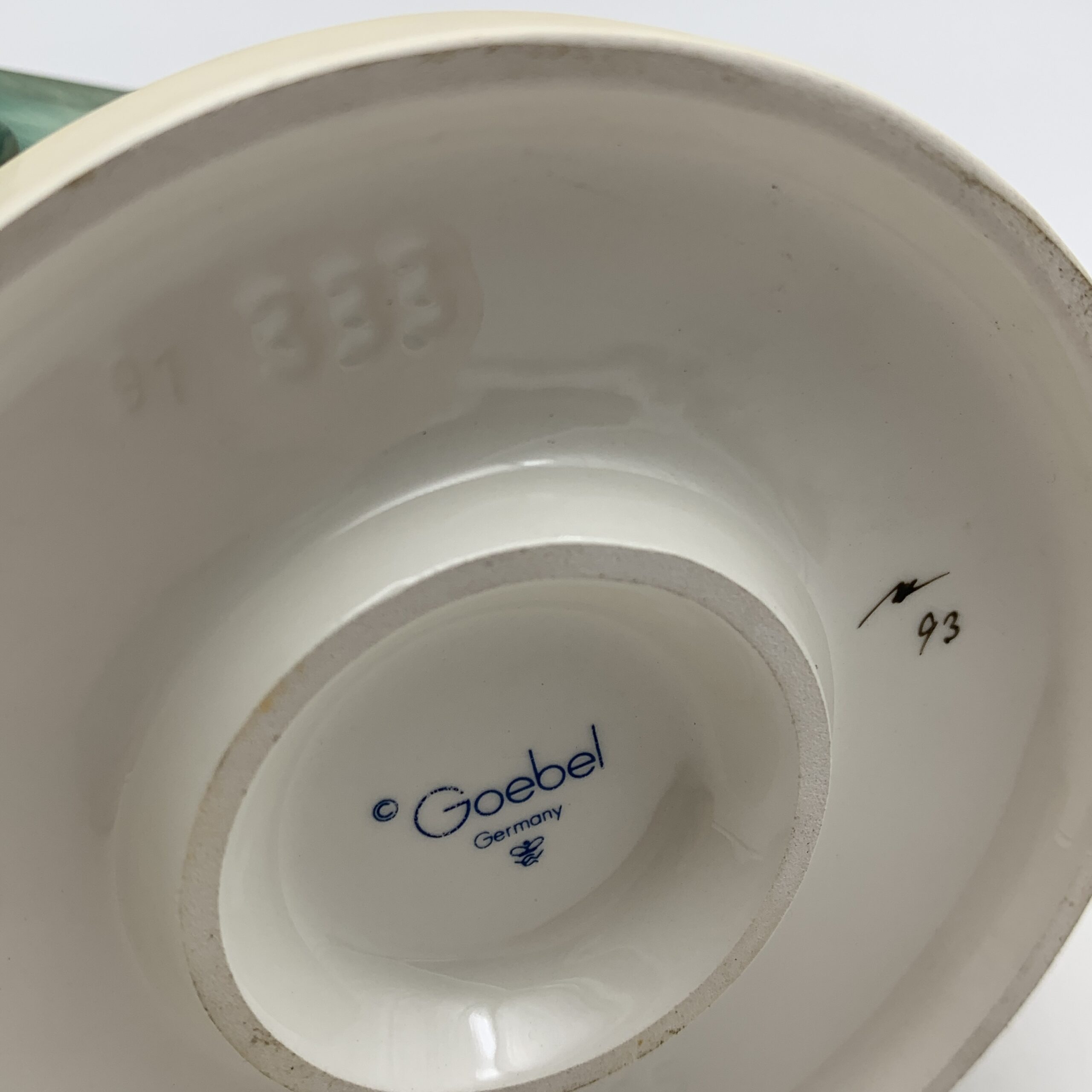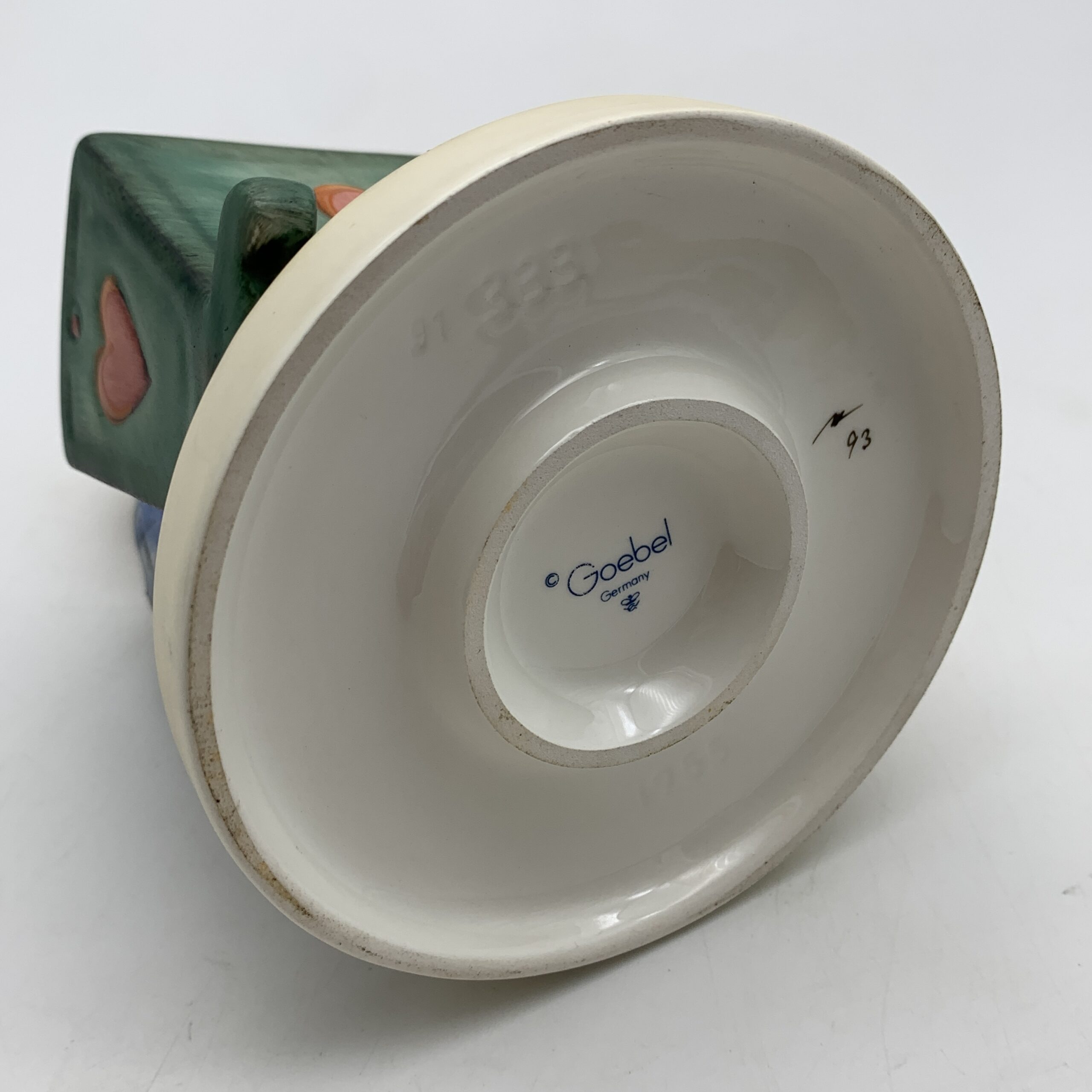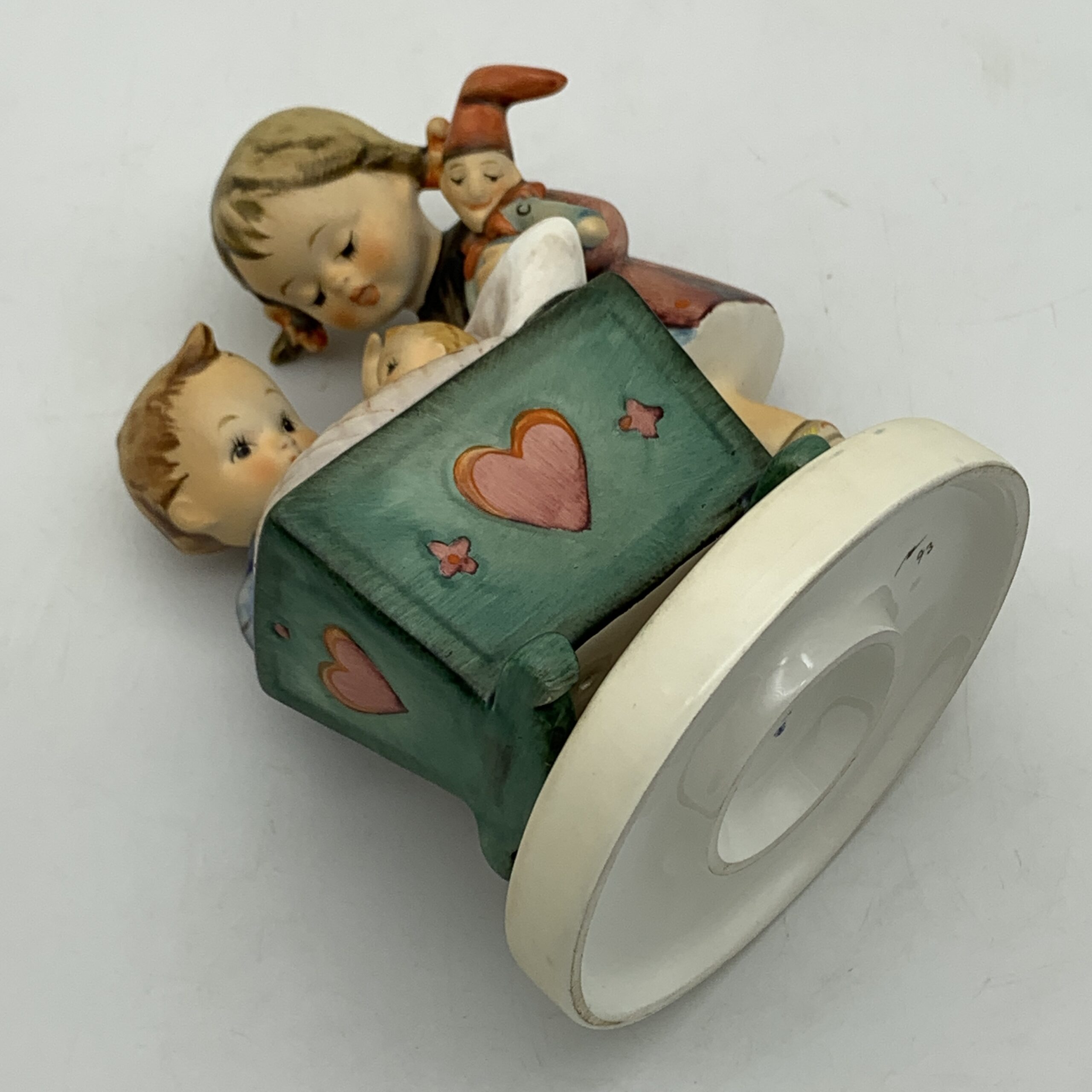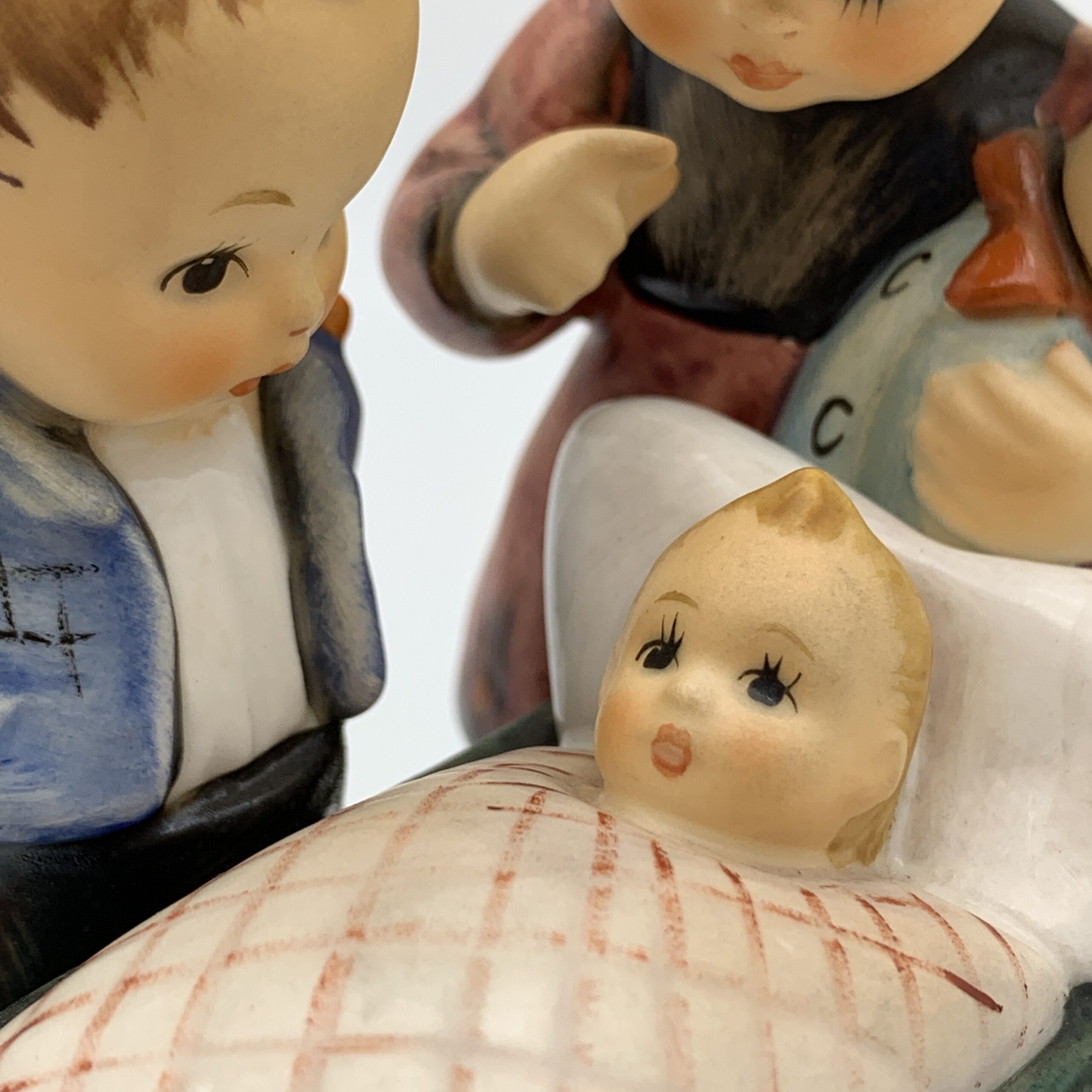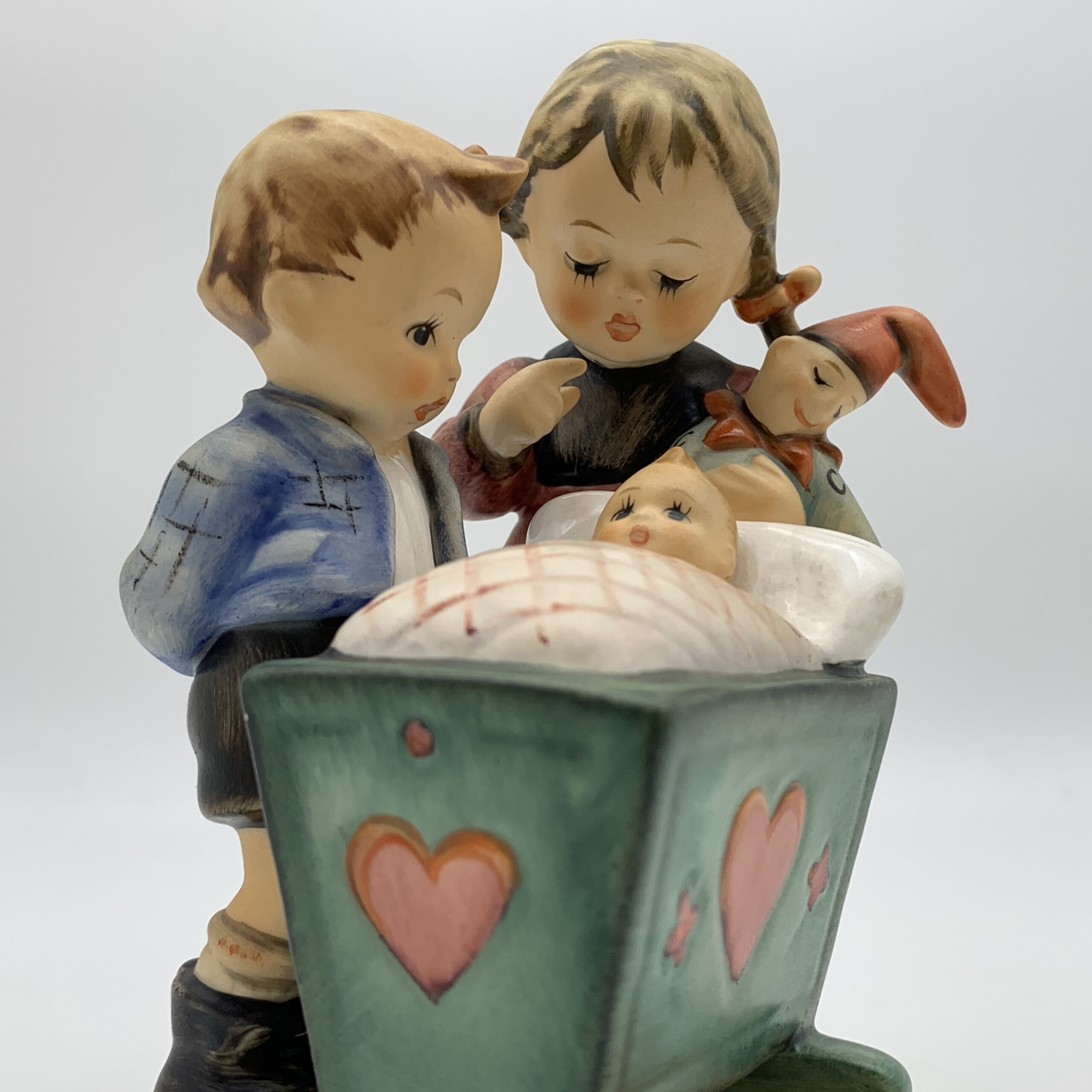 This adorable, large, hand painted ‘Hummel’ figurine, titled ‘Blessed Event’, features a young boy and girl, probably siblings, admiring a newborn baby tucked snuggly in its cradle. The base is impressed with the model number ‘333’ and the date ‘1955’ for when it was originally designed by ‘Arthur Moeller’. It carries the blue ‘TMK 7’ backstamp, dating this piece between 1990 and 1999. This lovely figure is in excellent condition and stands 13,5cm high by 10cm at its widest.