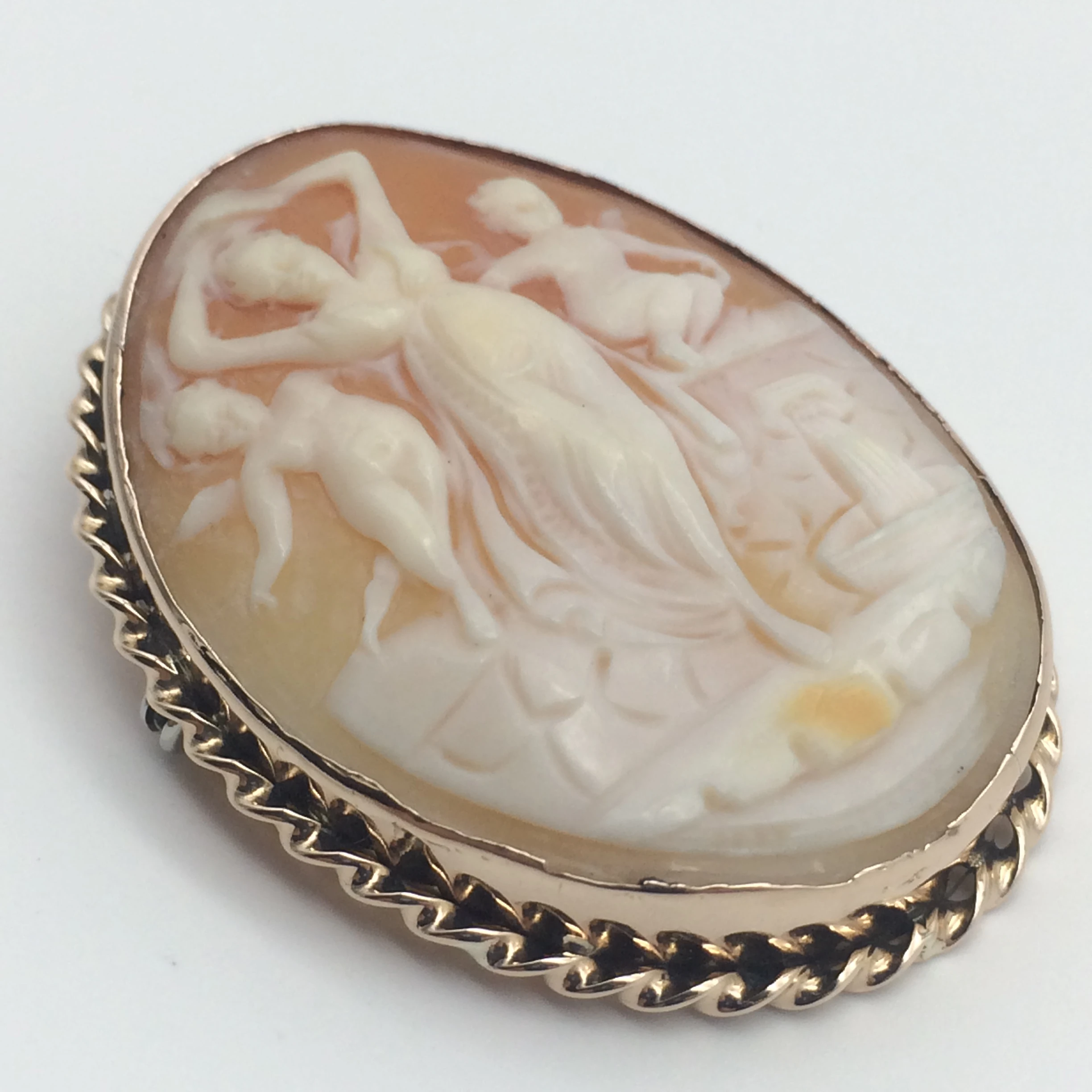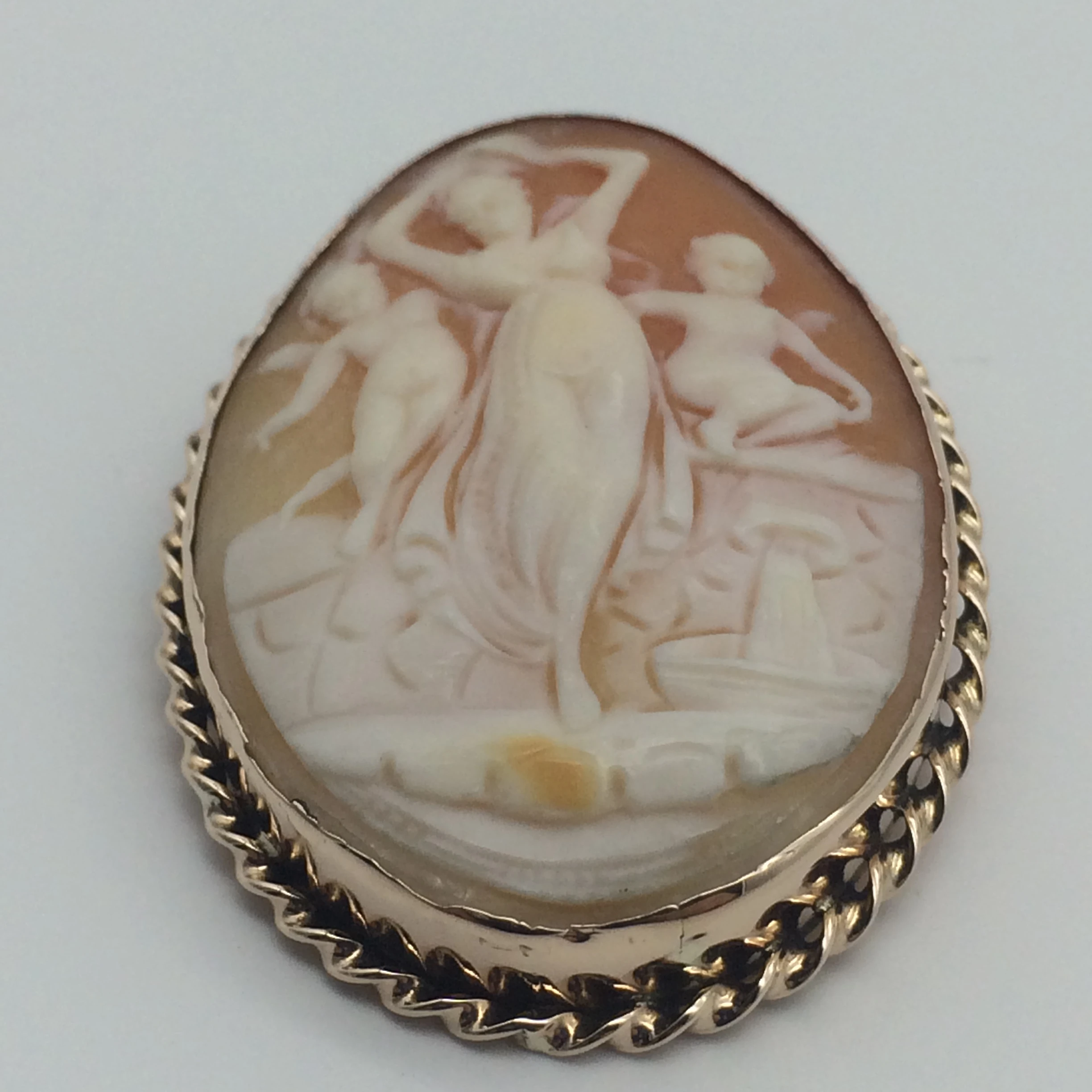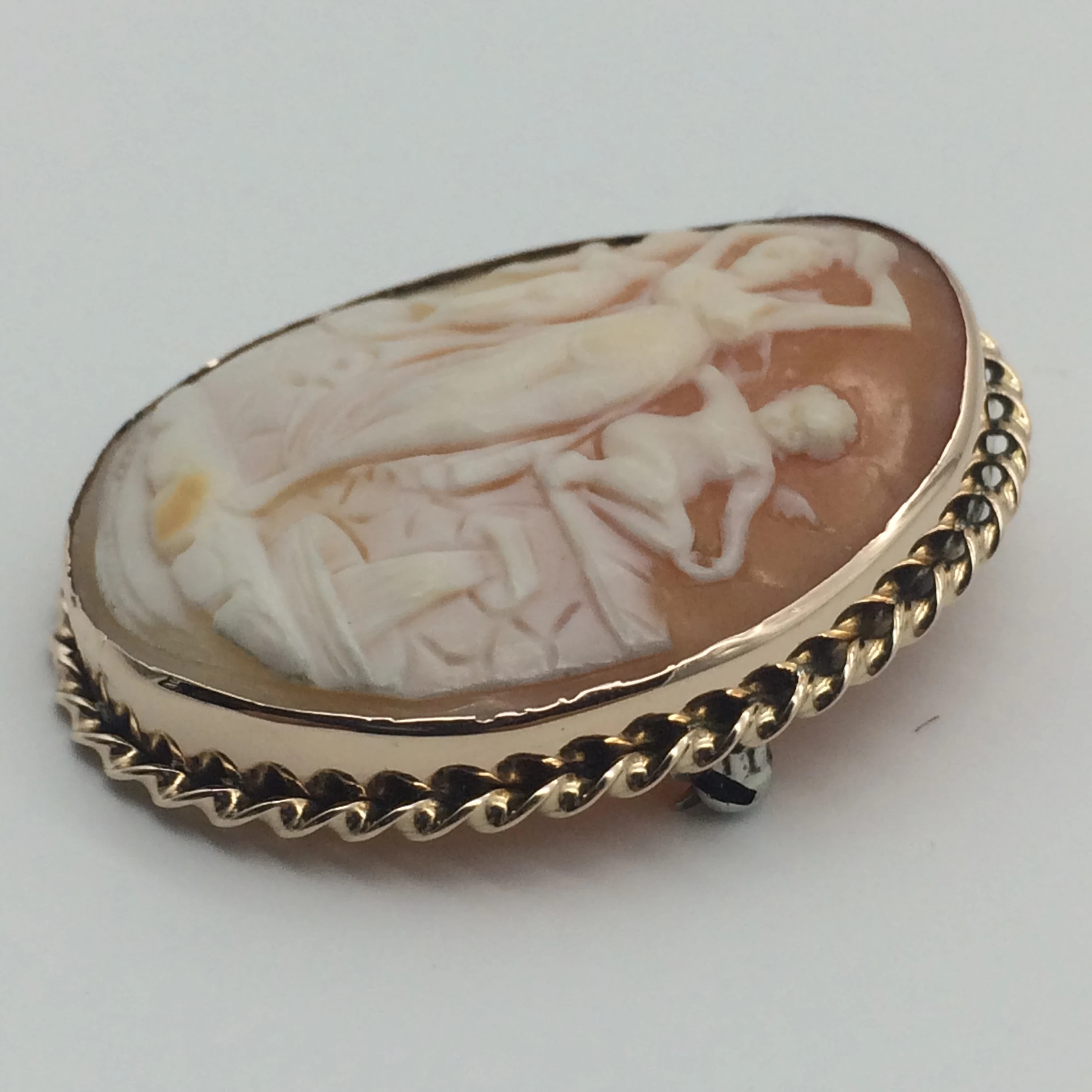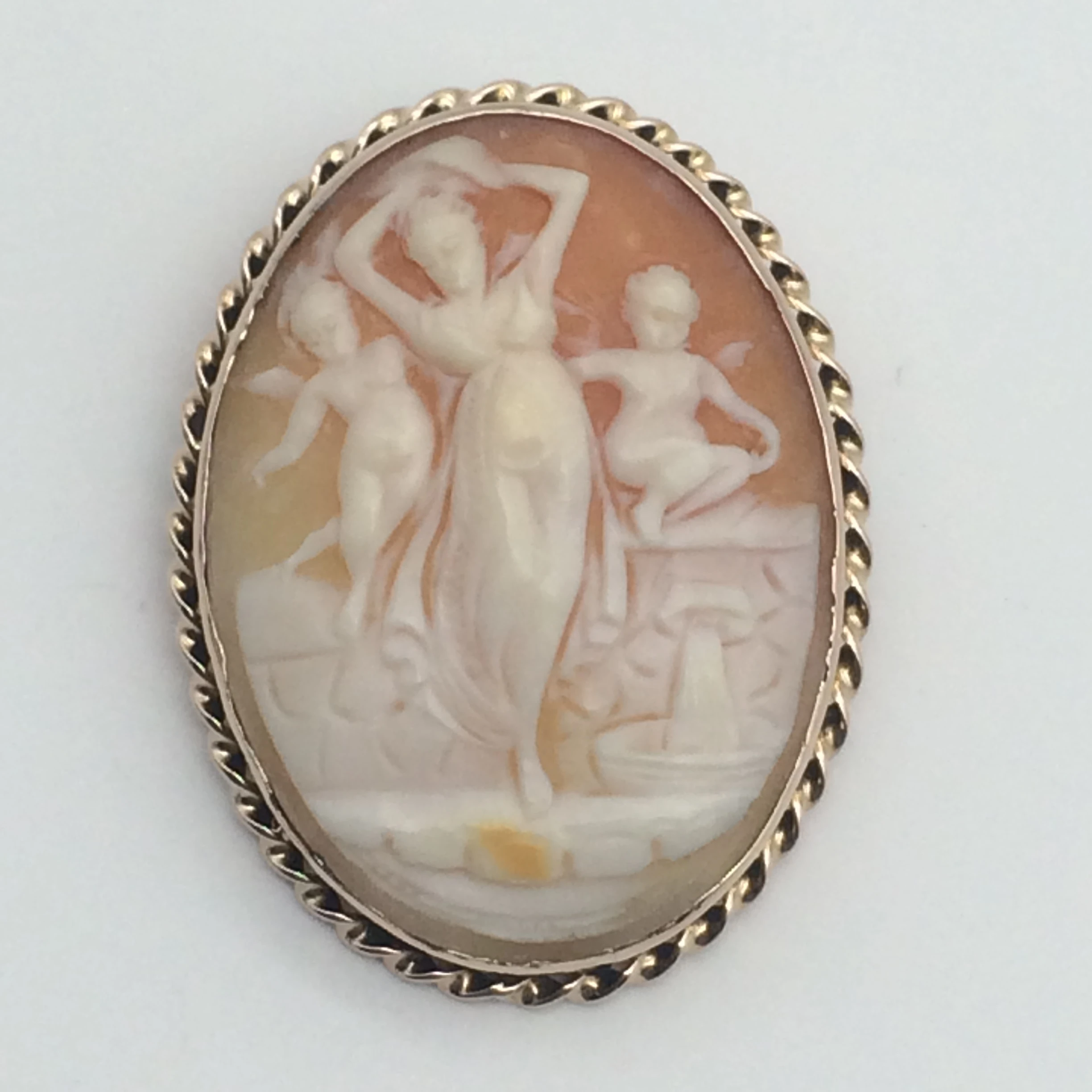 This early, beautifully carved cameo features a lady and two small cherubs, one on either side of her. The cameo is carved from cornelian shell and is set in an oval 9ct gold frame decorated with a gold twisted rope around the edge. With a secure pin and hanger, it can be worn either as a pendant or brooch. It is in excellent condition and dates to the early 1900’s. It is stamped ‘9ct’ on the inside of the frame, measures 4.5cm x 3.3.cm and weighs 12.3g.