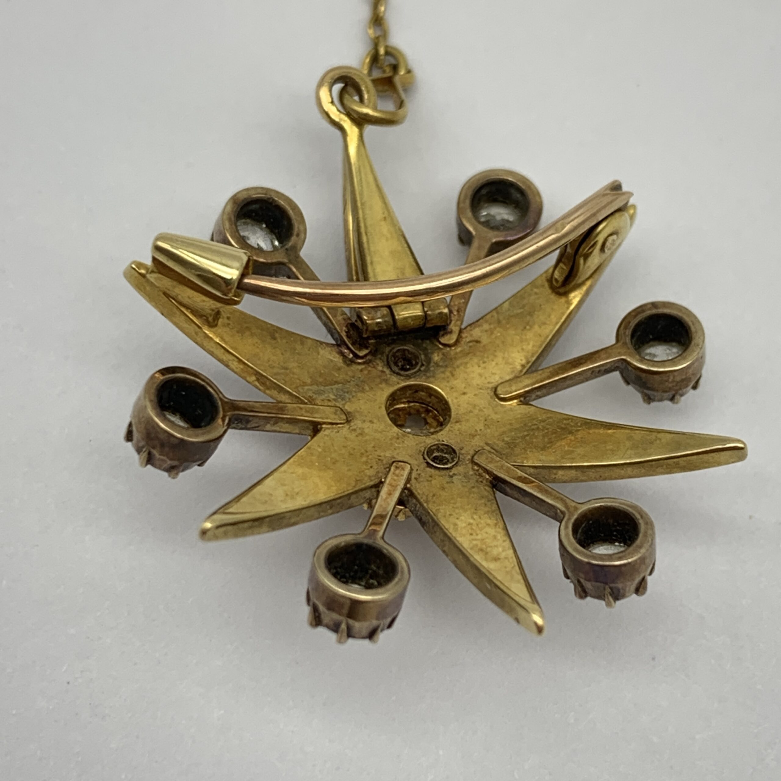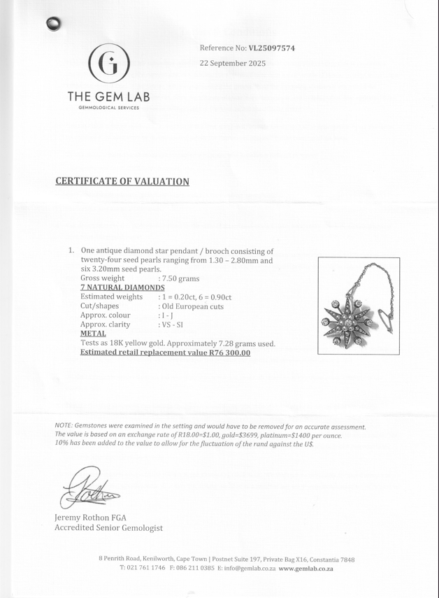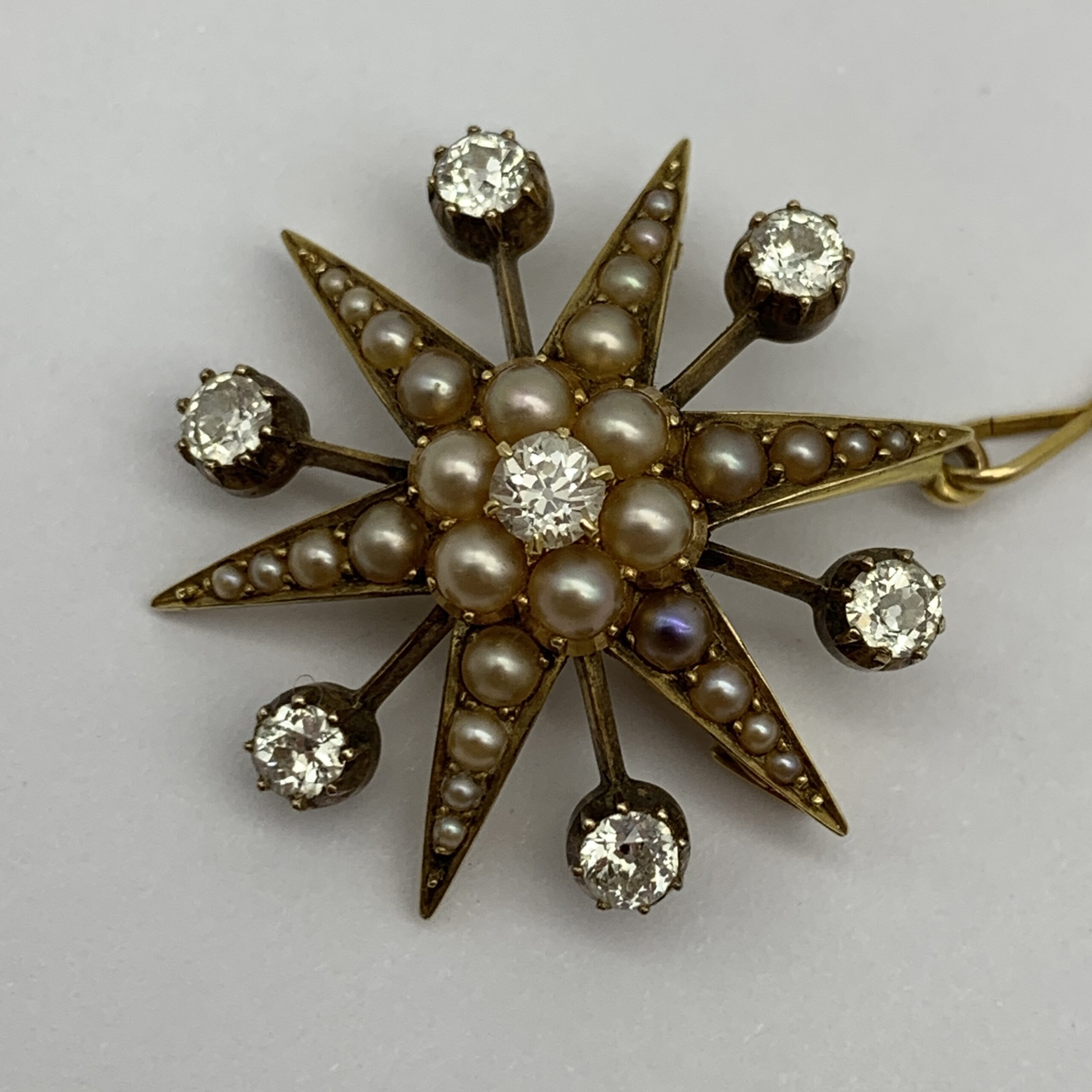 This fabulous, Victorian, 18ct gold diamond and seed pearl brooch or pendant has a lovely starburst shape with the six points of the star set with seed pearls graduating in size and branching out in between, are six sparkling ‘Old European’ cut diamonds (6 x 0.15ct). The centre, in the shape of a raised flower features an ‘Old European’ cut diamond (0.20ct) with a row of pearls around it. This fine quality and beautifully crafted piece is fitted with a small, hinged hanger at the back, so it can either be worn as a brooch or pendant. It’s in excellent condition with a secure pin and comes with a small safety chain. The brooch measures 2,7cm x 2,7cm and weighs 7,5g.