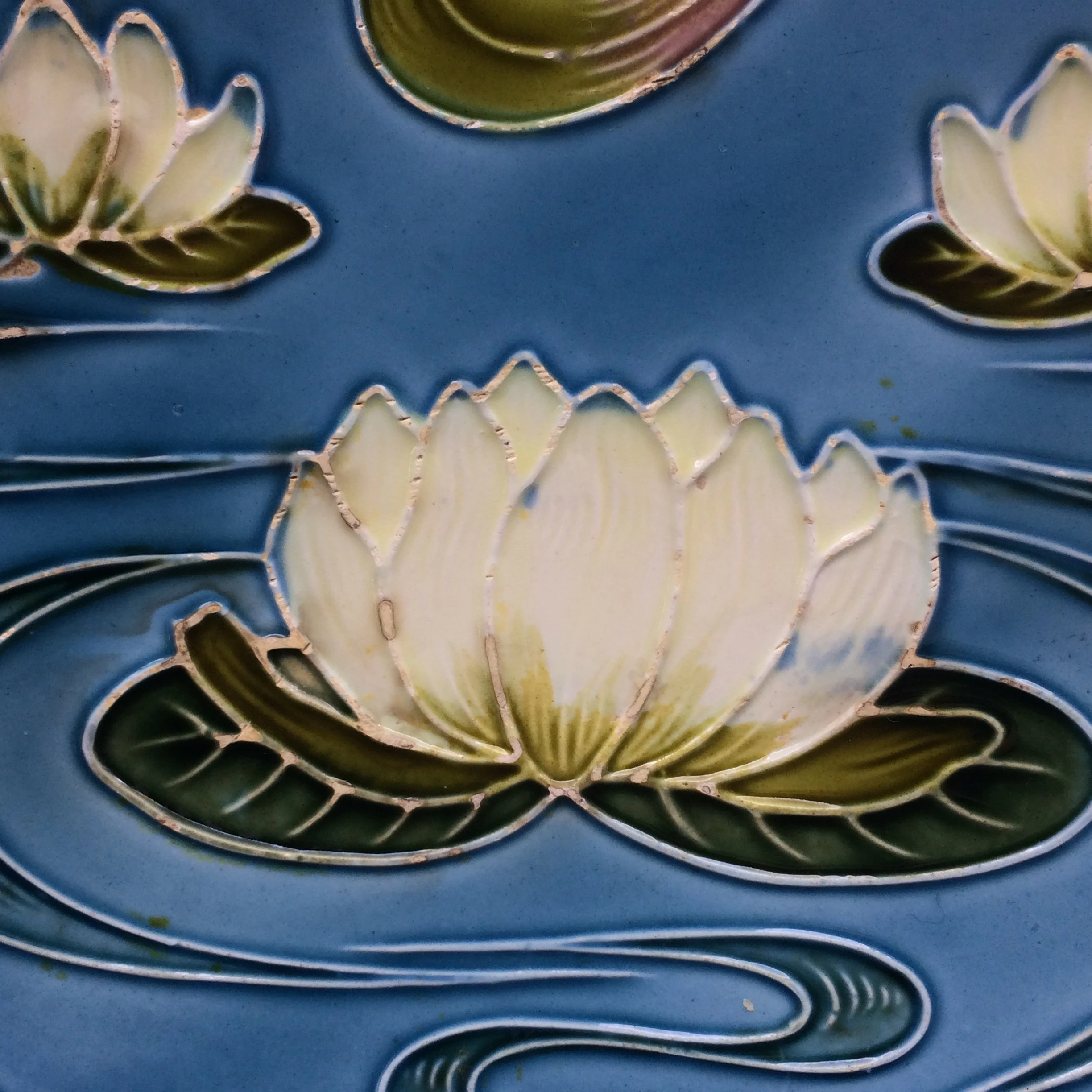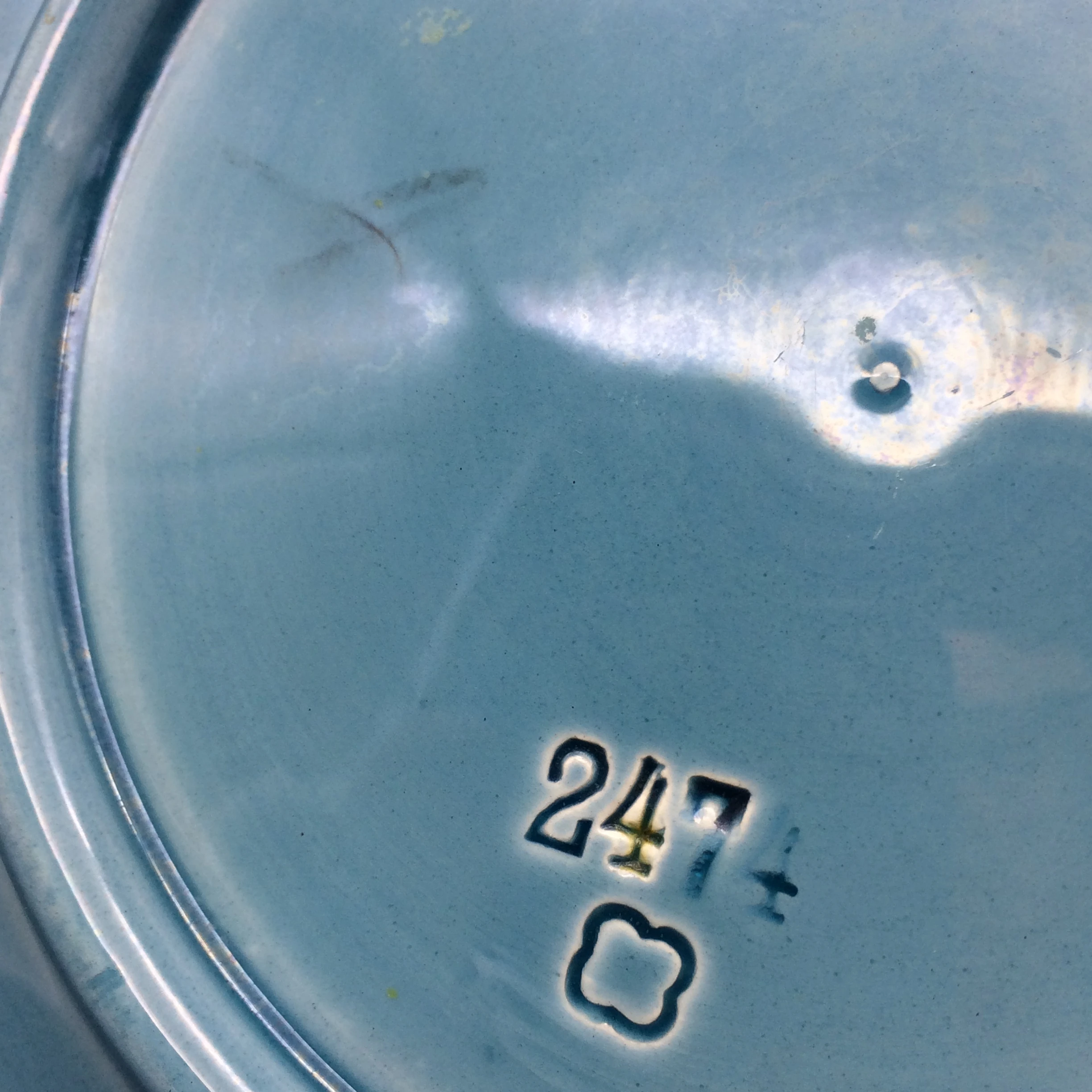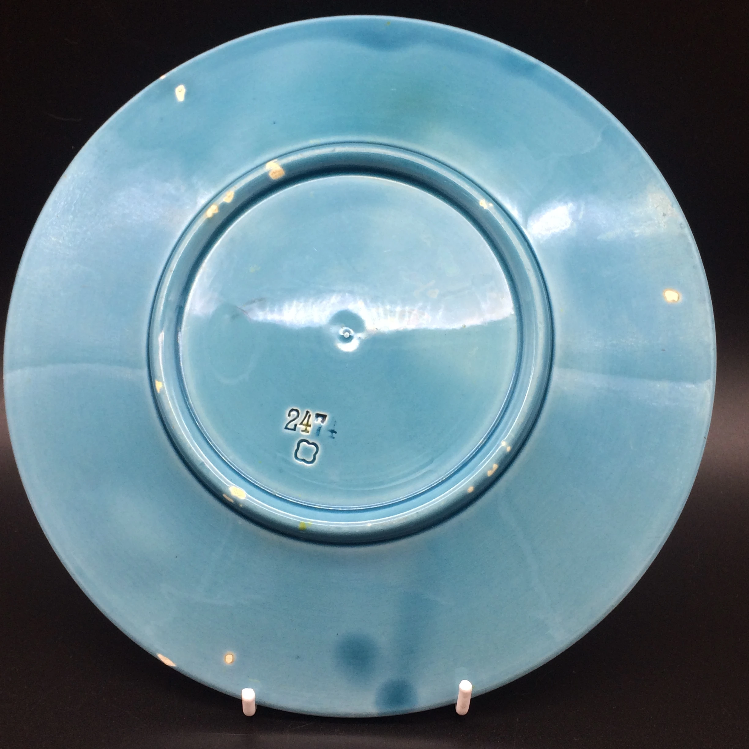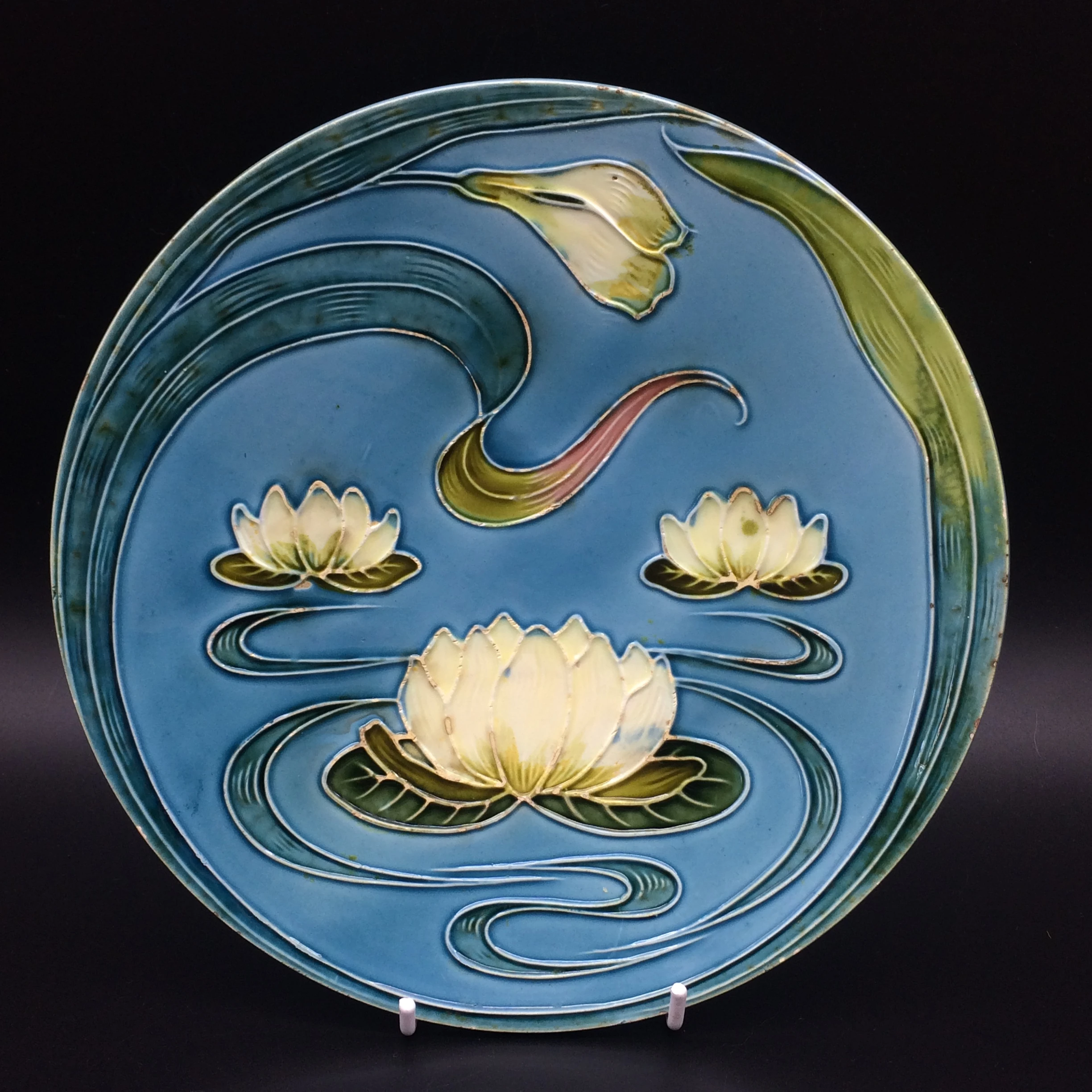This beautiful Majolica plate is decorated with 3 white water lilies on a blue background in typical Art Nouveau style. According to my research it was made in Germany by ‘Georg Schmider Zell Potteries’ and dates to the early 1900’s. It has the number ‘2474’ impressed on the back and other than a small paint chip on the rear edge of the plate and a couple of very minor rough edges on the foot of the plate, it is in excellent condition.