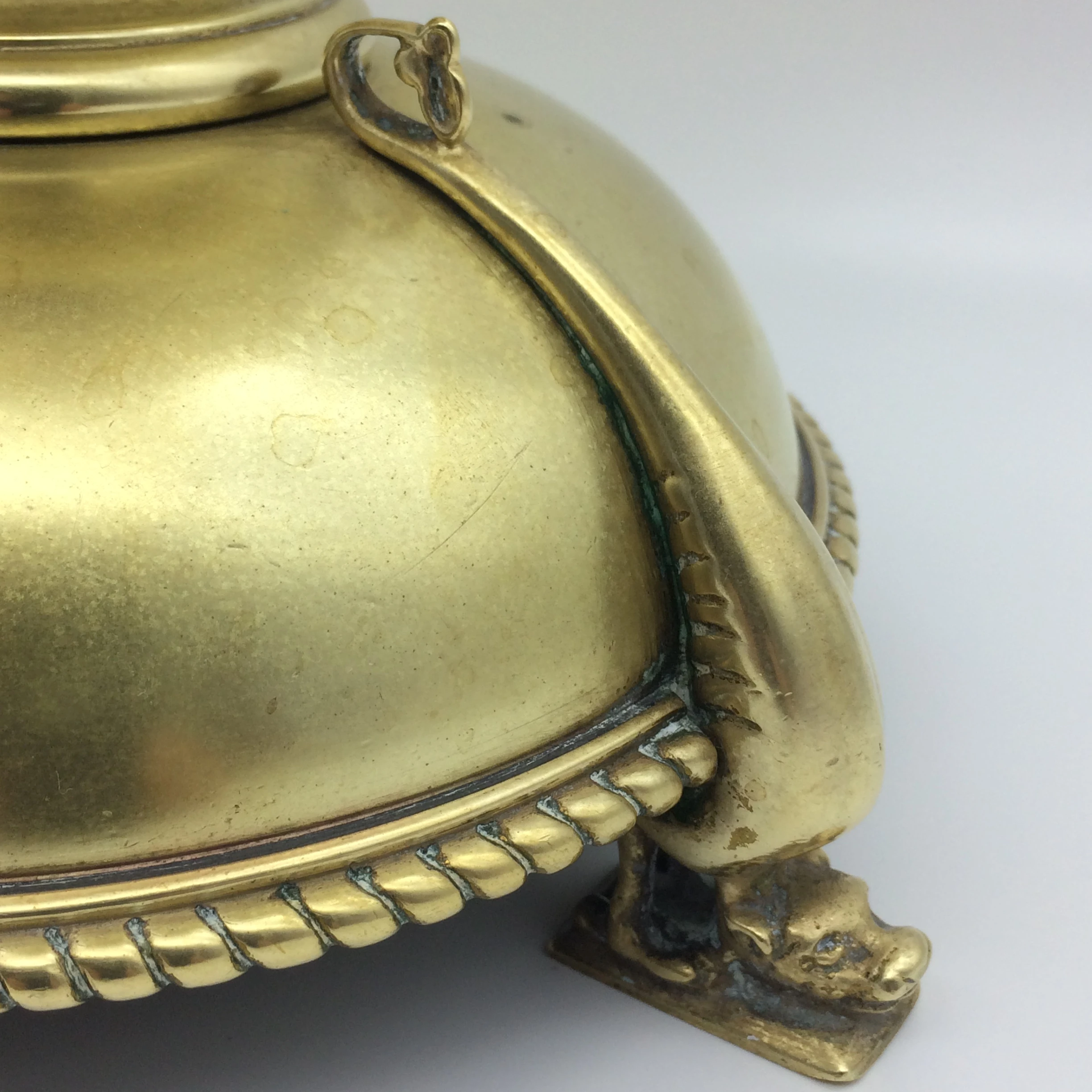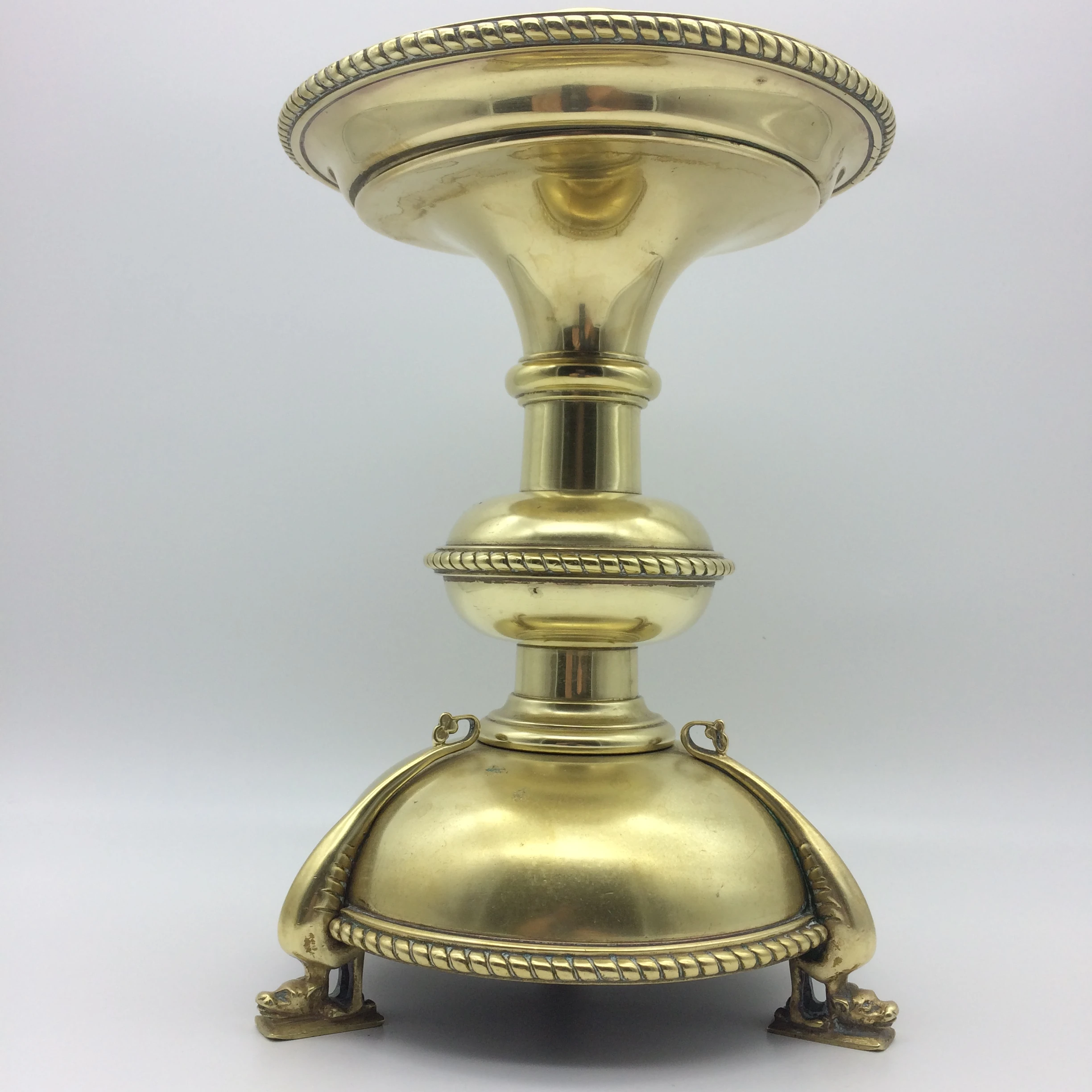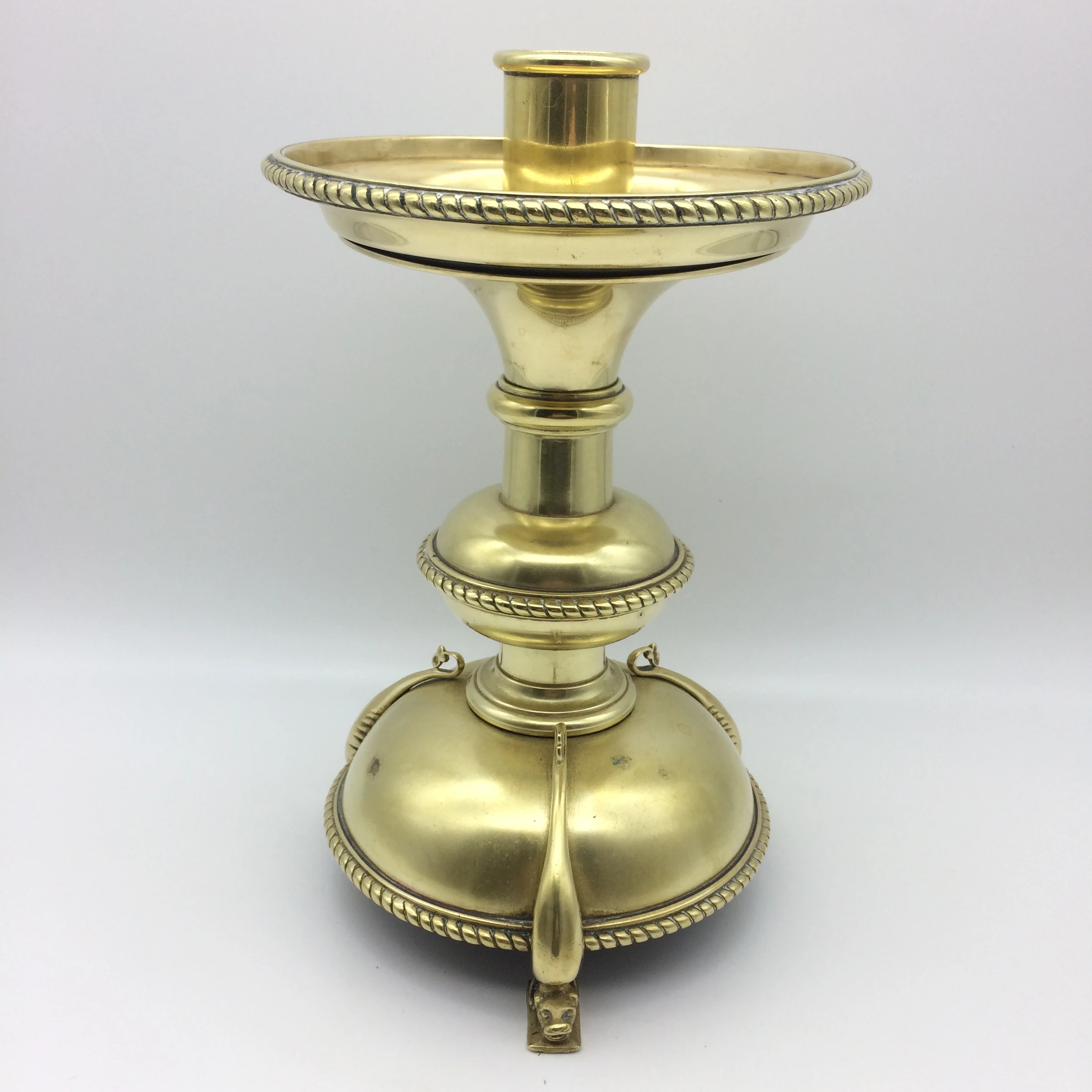 This early, large, heavy altar candle stand is in excellent condition for its age and has a lovely aged colour to it. It sits on three mythical animal feet and stands 27cm high, measures 17cm at its widest and weighs 2,120kg's.