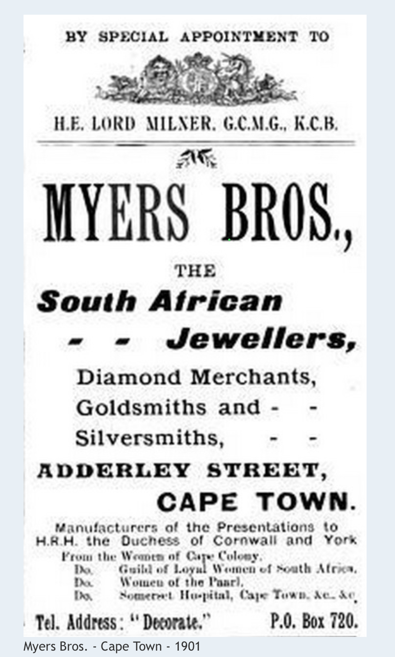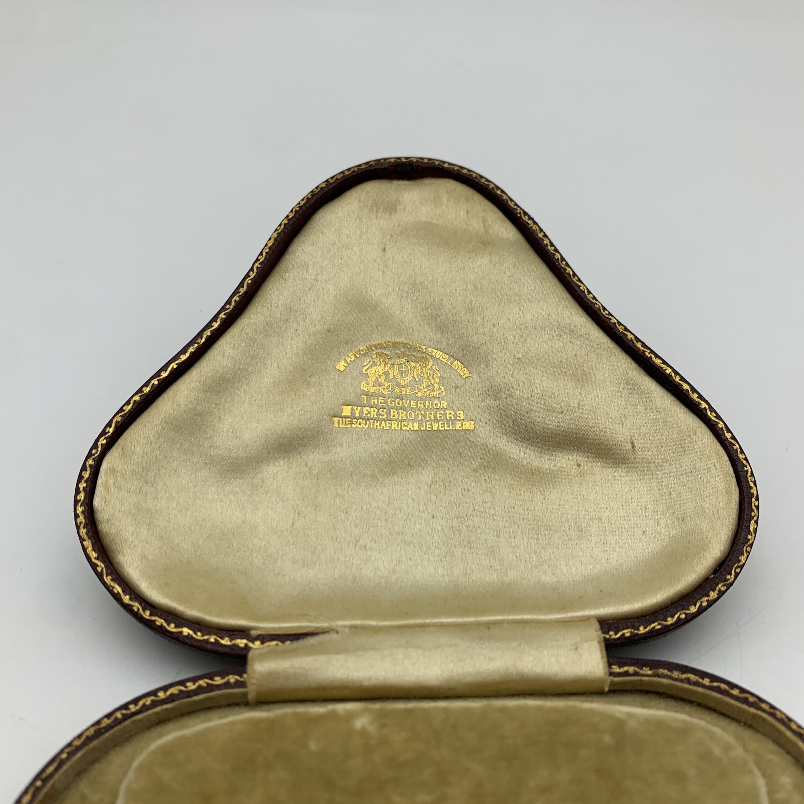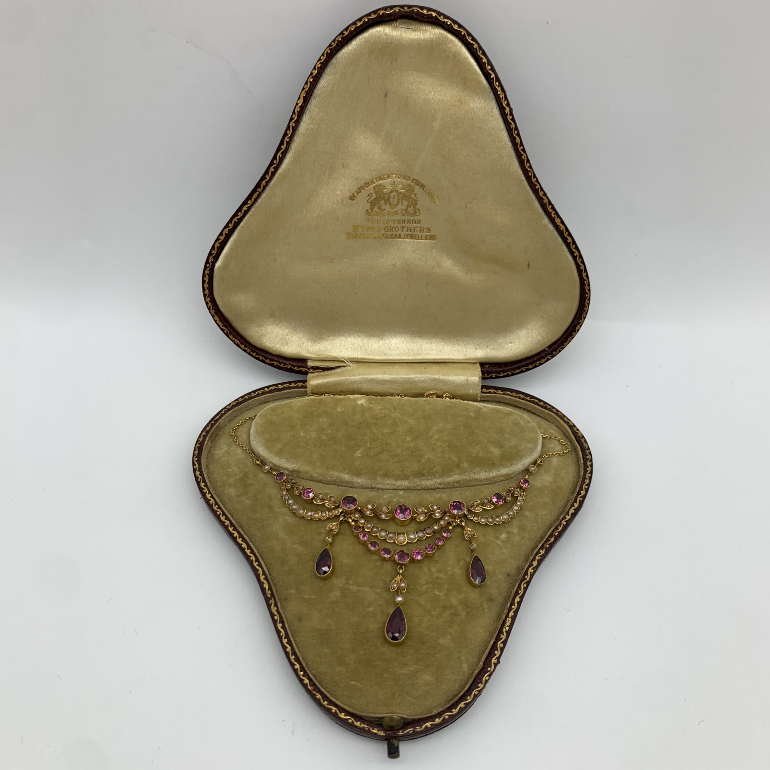This antique, possibly Victorian, exquisite 15ct gold, garnet and seed pearl necklace is in superb condition, with its original presentation case. It’s beautifully made, with various articulated sections and finely decorated with swags of numerous seed pearls and garnets, completed with three lovely pear-shaped drop garnets. This beautiful necklace comes with its original custom-made and velvet, silk lined leatherette hinged case, with a gilt stamped name and crest in the lid ‘BY APPOINTMENT TO HIS EXCELLENCY THE GOVERNOR’ ‘MYERS BROTHERS, THE SOUTH AFRICAN JEWELLERS’. The ‘Myers Brothers’ were the original South African retailers, then based in Adderley Street in Cape Town (I’ve attached an old photograph and advert that I came across). The necklace is in amazing condition and hangs freely with a secure clasp at the back and is clearly stamped ‘15ct’.