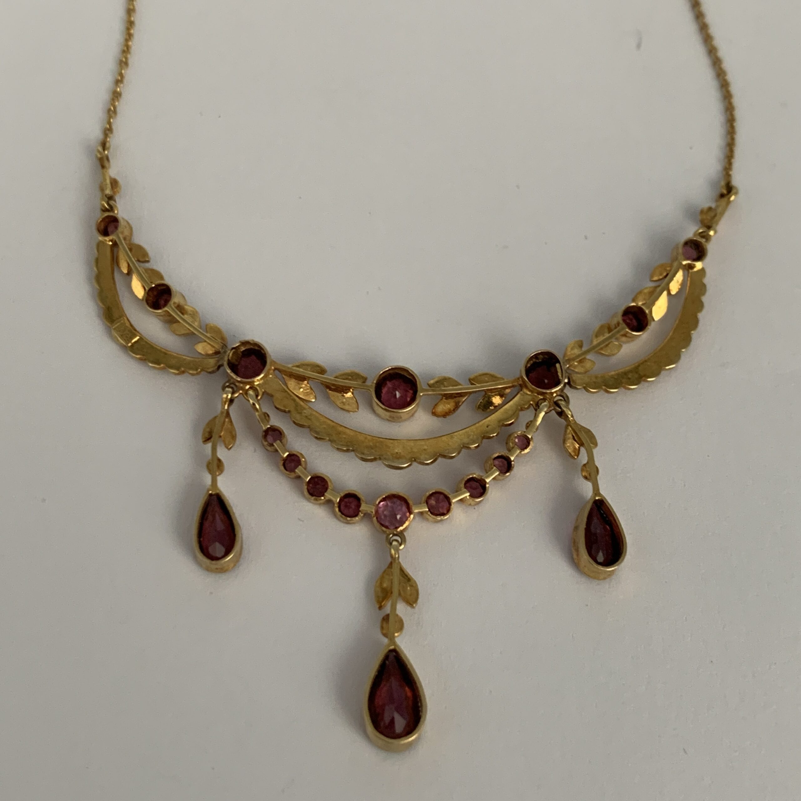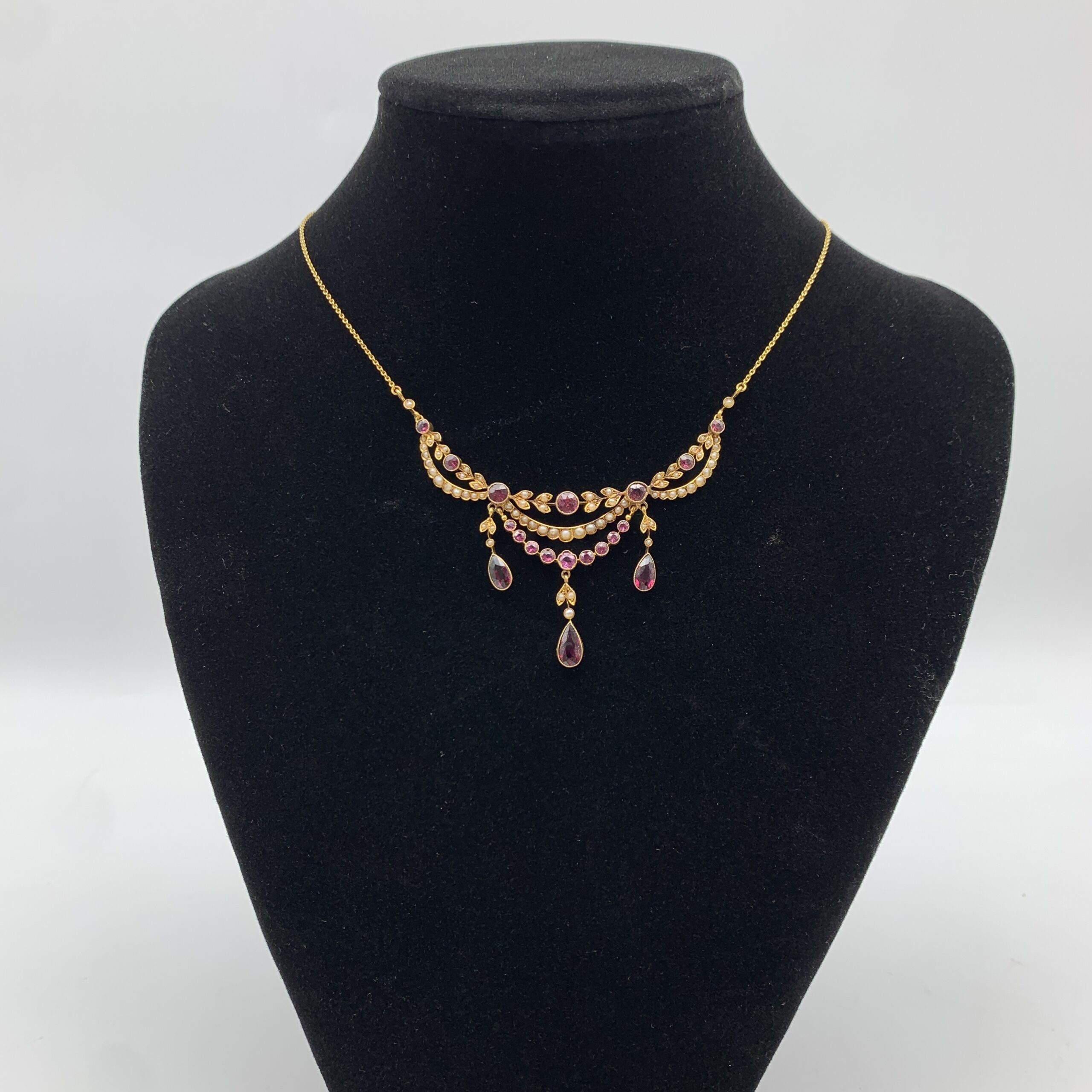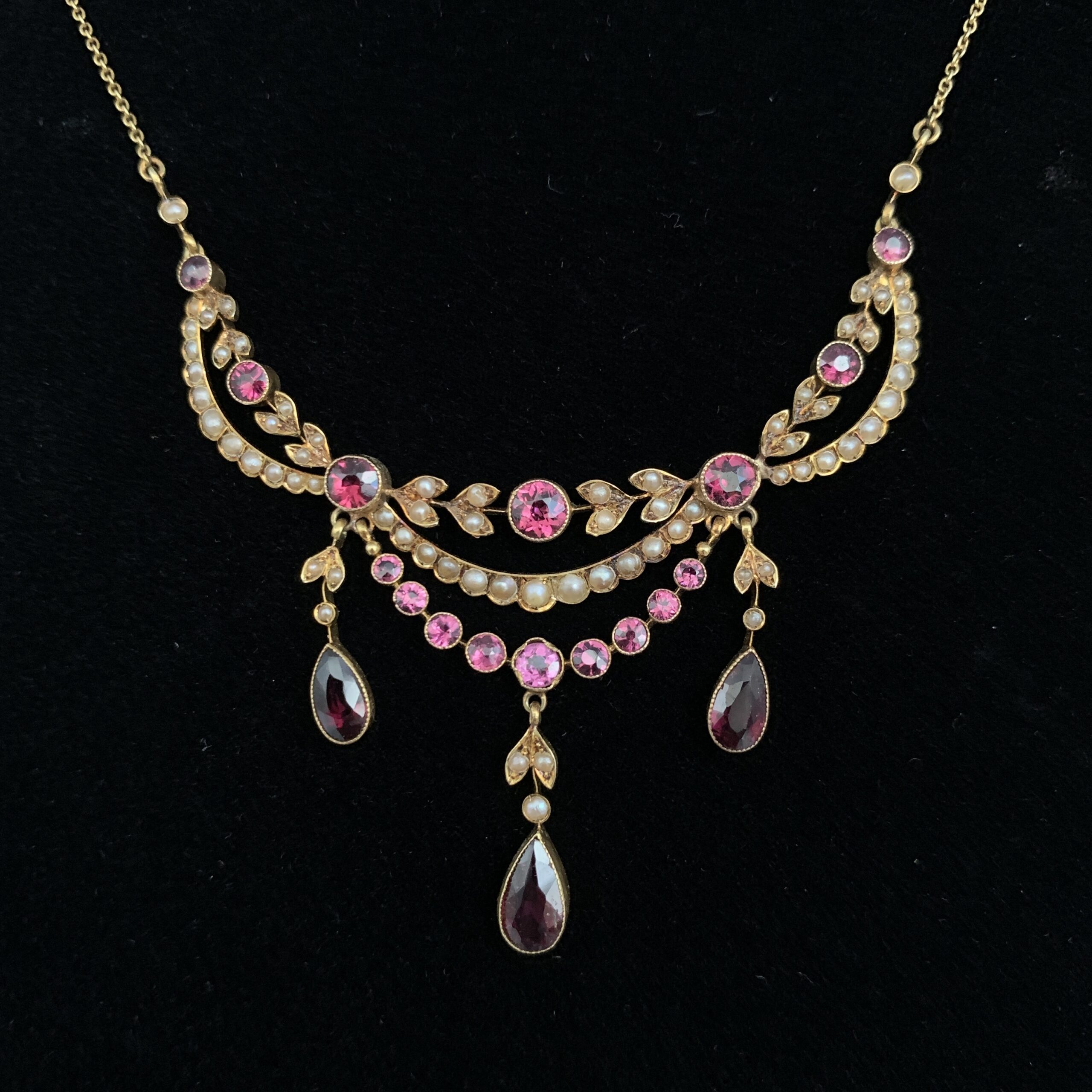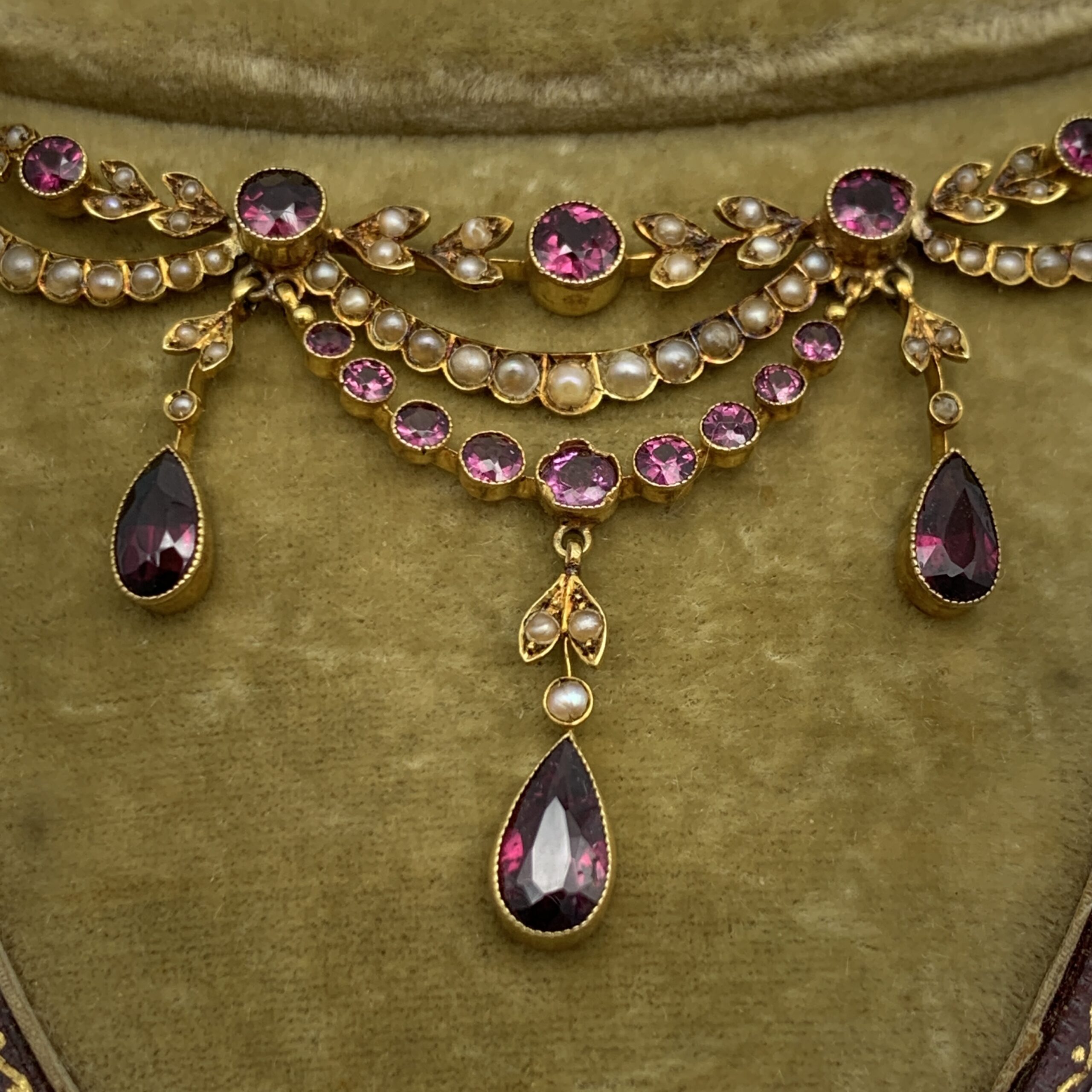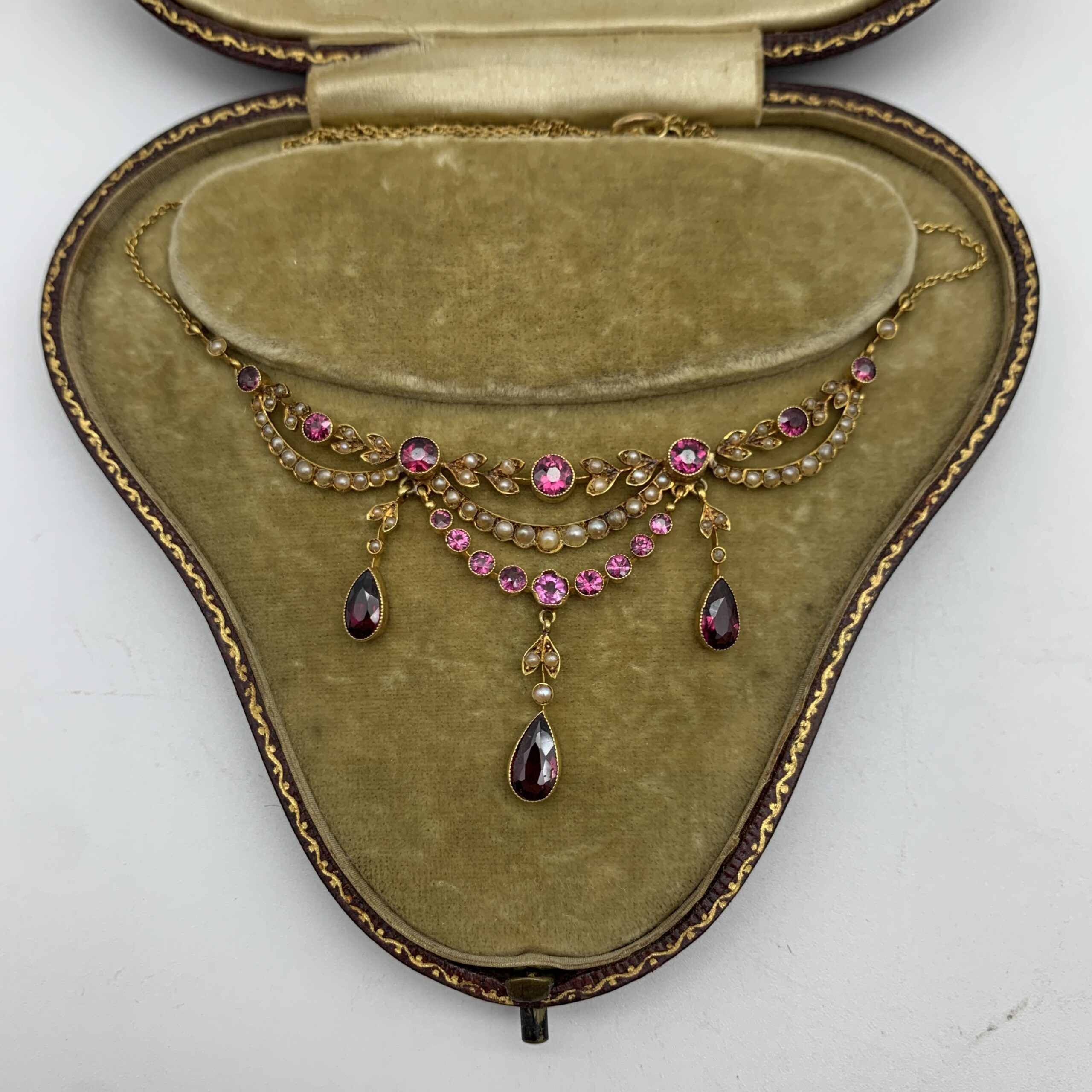 Antique Cased 14ct Gold, Garnet & Seed Pearl Necklace