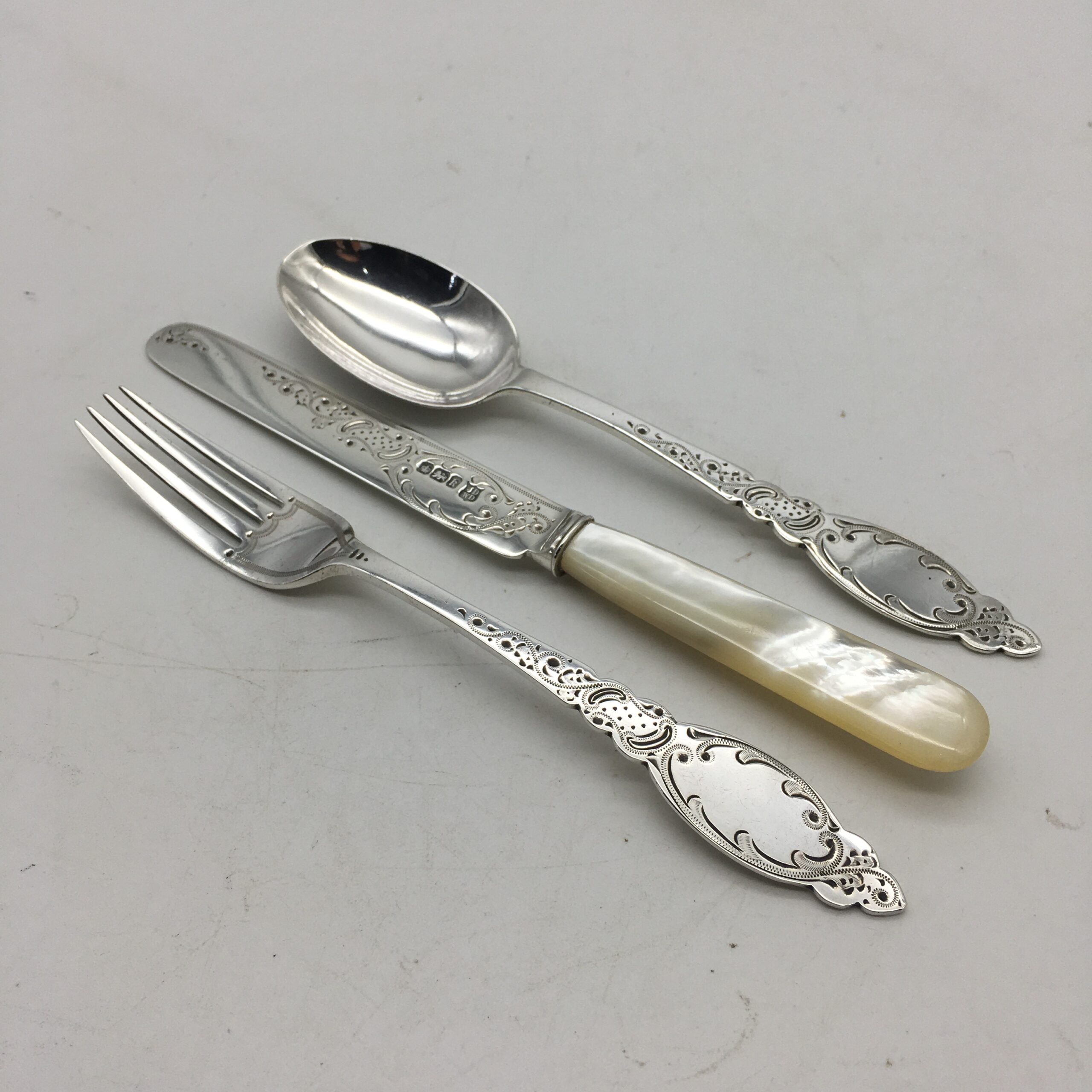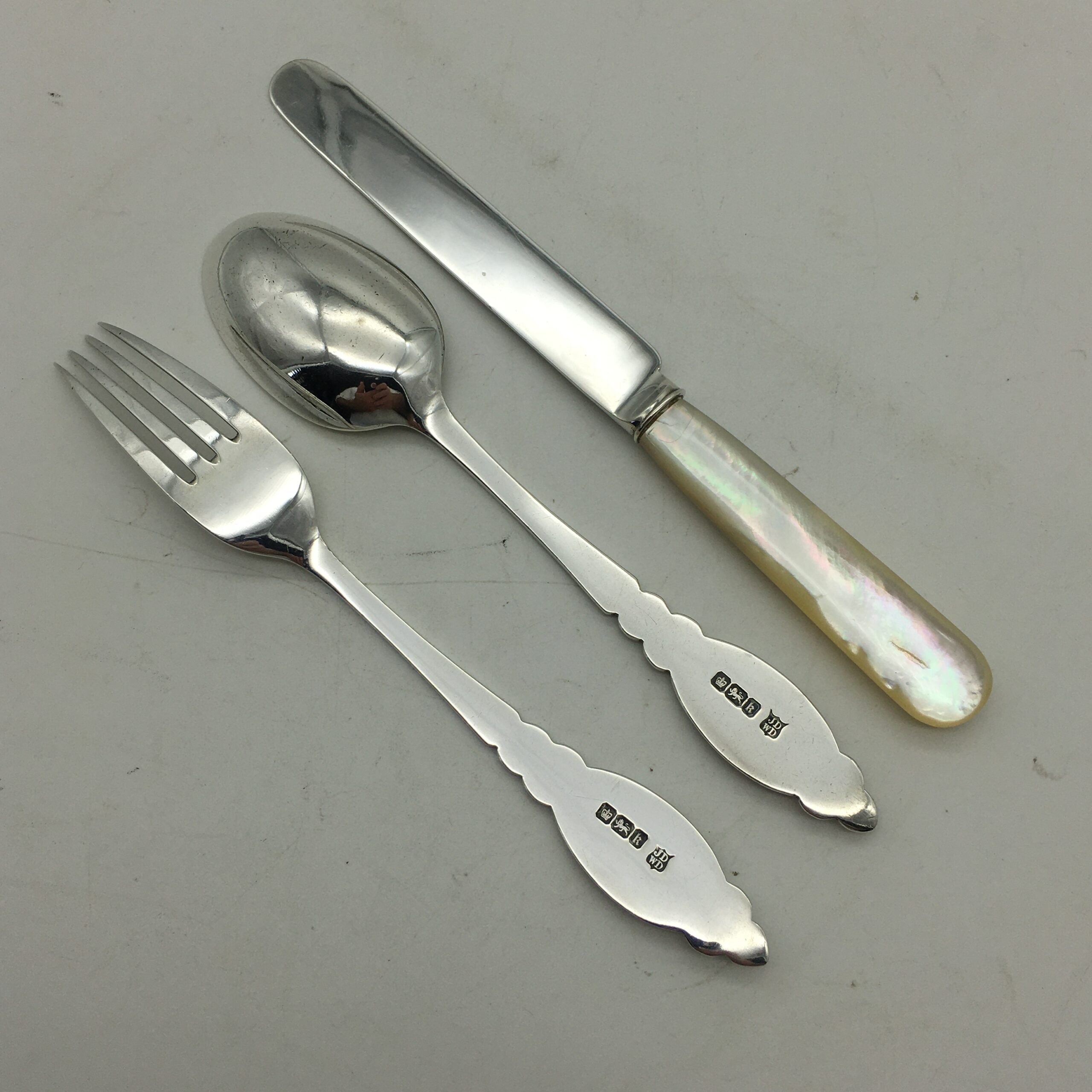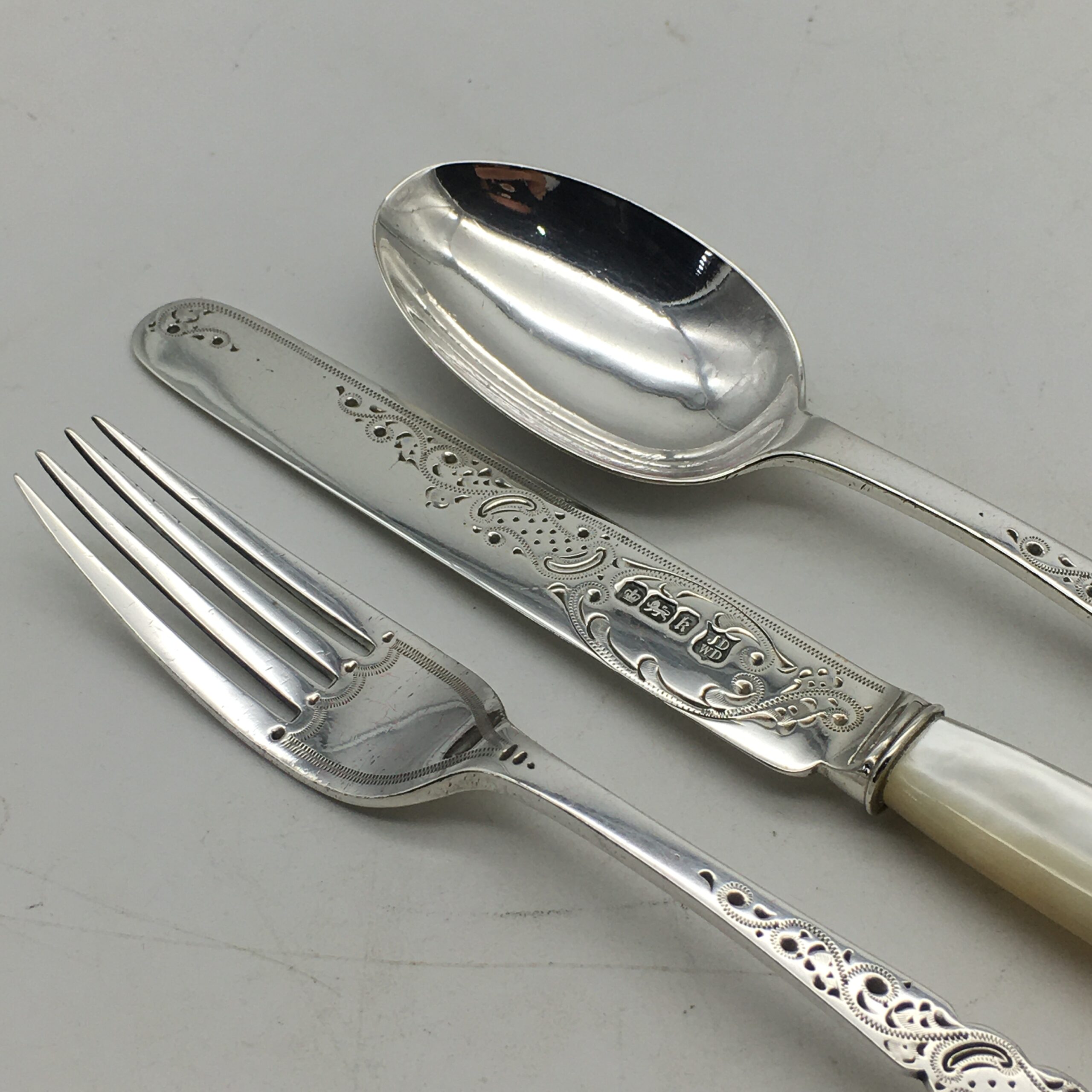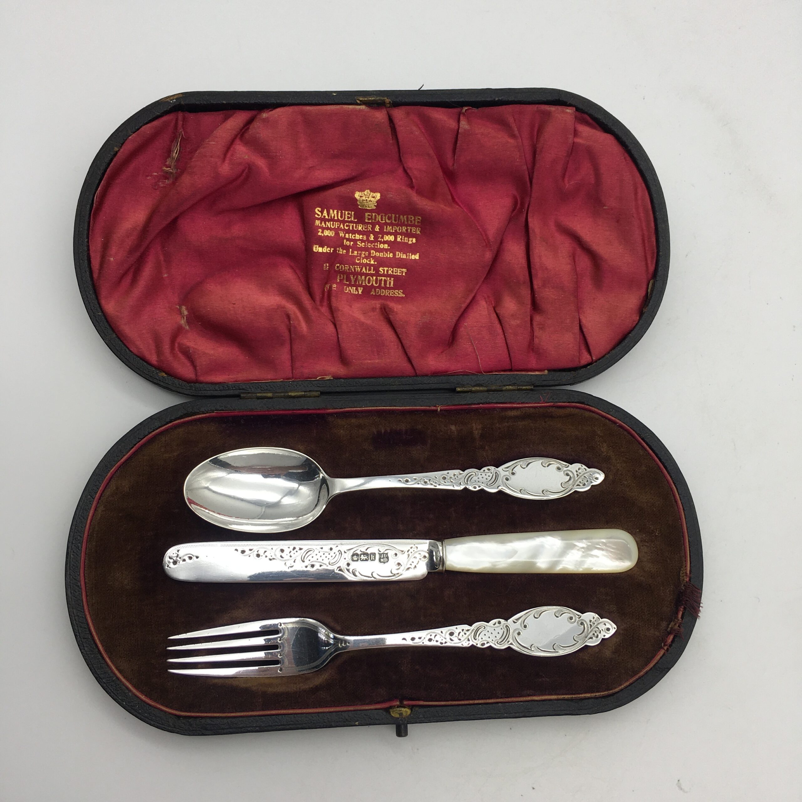 This very early, great quality, solid silver christening set, with its original fitted case, is in excellent condition and appears to have never been used. It comprises of a silver fork, silver spoon and a lovely ‘mother of pearl’ handled silver knife. The three pieces have been beautifully engraved with a lovely pattern, and the spoon & fork have blank cartouches. Each piece is clearly hallmarked for Sheffield, England 1902 and stamped ‘JD WD’ for silversmiths ‘John & William Deakin’. The set comes with its original leatherette case, lined with red satin and velvet, and the lid is stamped by the original retailers ‘SAMUEL EDGCUMBE’ ‘Manufacturer & Importer’. They measure in length, spoon 14cm, fork 14,5cm, knife 15,5cm and together weigh 68,3g. The case measures 21cm x 10cm x 3cm.
