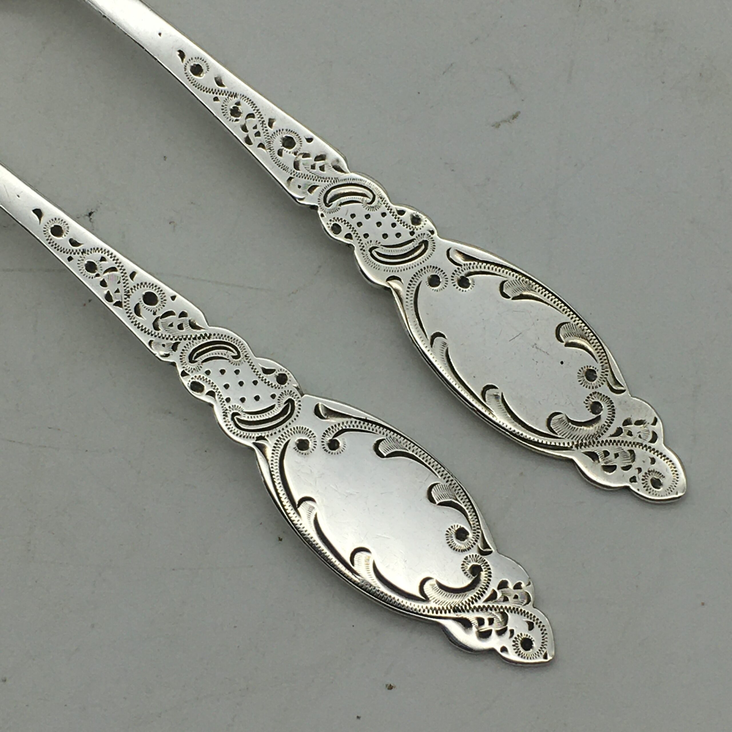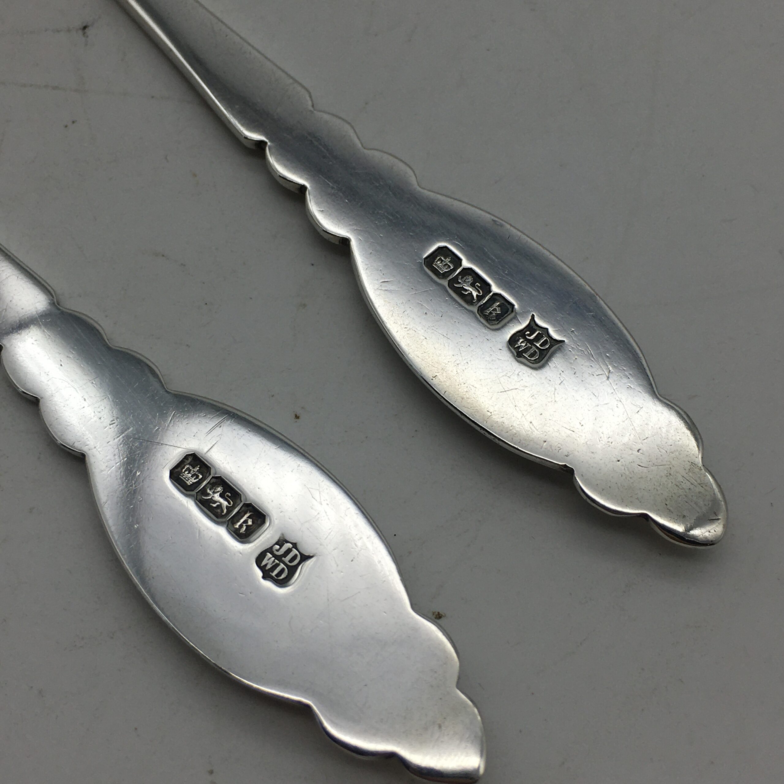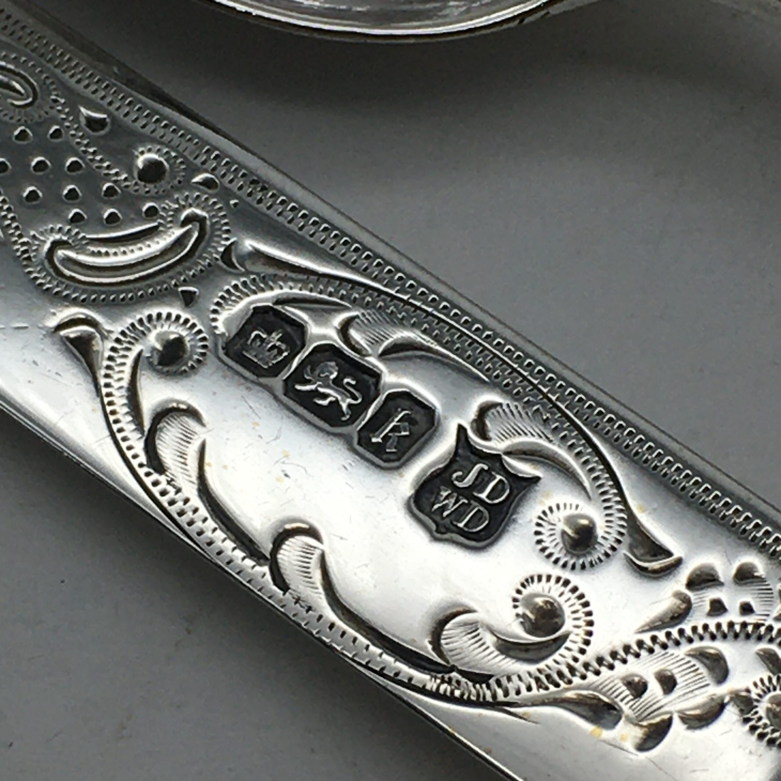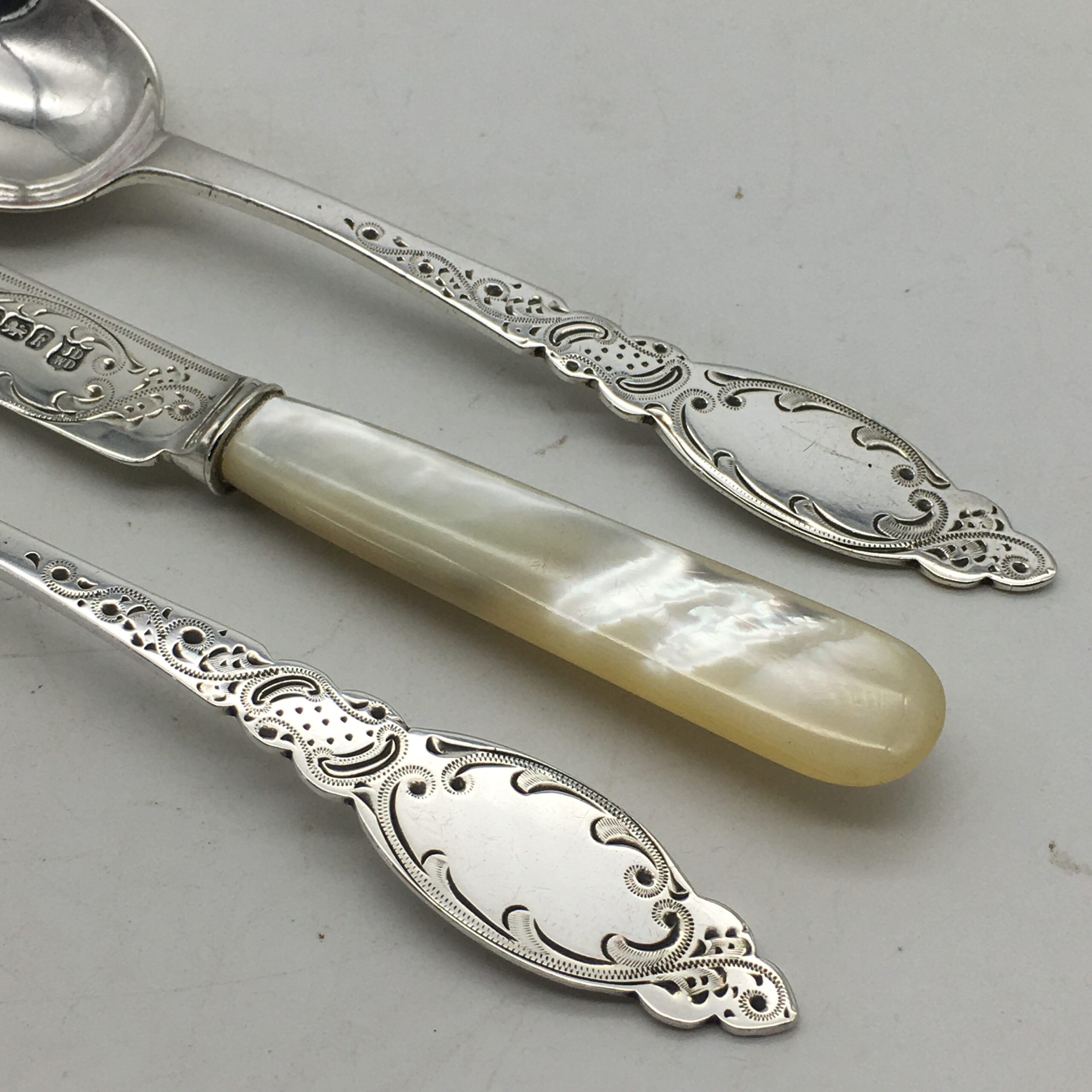 This very early, great quality, solid silver christening set, with its original fitted case, is in excellent condition and appears to have never been used. It comprises of a silver fork, silver spoon and a lovely ‘mother of pearl’ handled silver knife. The three pieces have been beautifully engraved with a lovely pattern, and the spoon & fork have blank cartouches. Each piece is clearly hallmarked for Sheffield, England 1902 and stamped ‘JD WD’ for silversmiths ‘John & William Deakin’. The set comes with its original leatherette case, lined with red satin and velvet, and the lid is stamped by the original retailers ‘SAMUEL EDGCUMBE’ ‘Manufacturer & Importer’. They measure in length, spoon 14cm, fork 14,5cm, knife 15,5cm and together weigh 68,3g. The case measures 21cm x 10cm x 3cm.