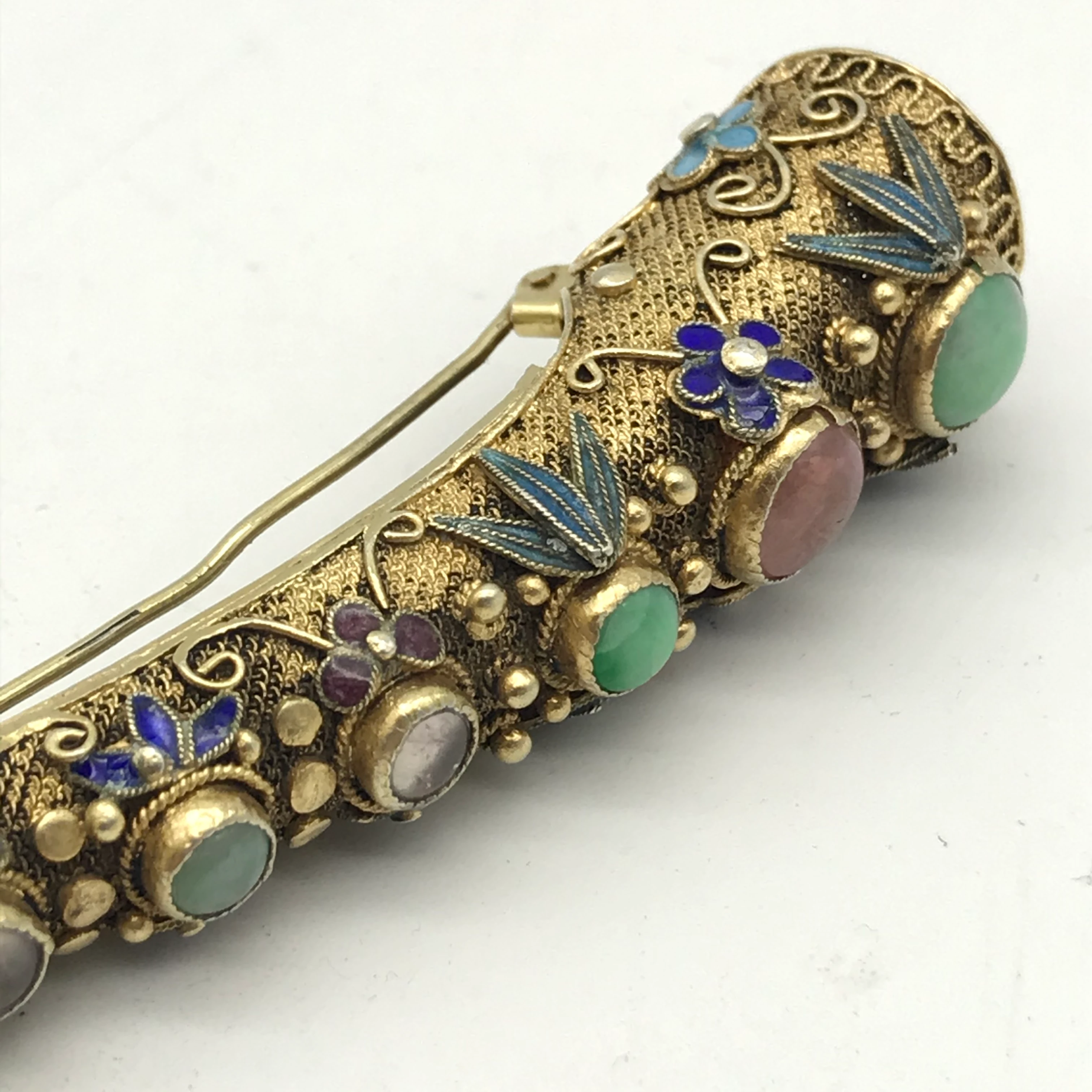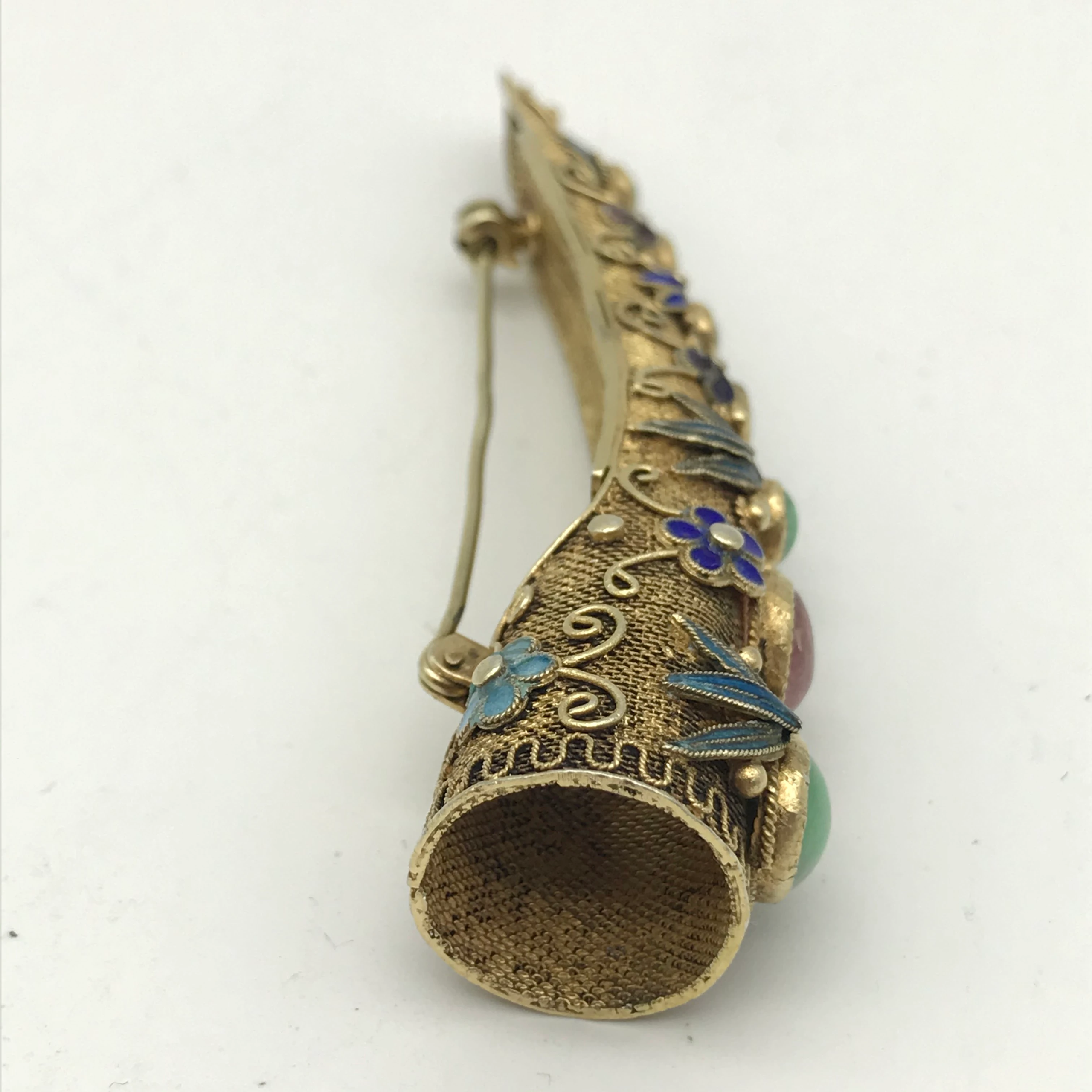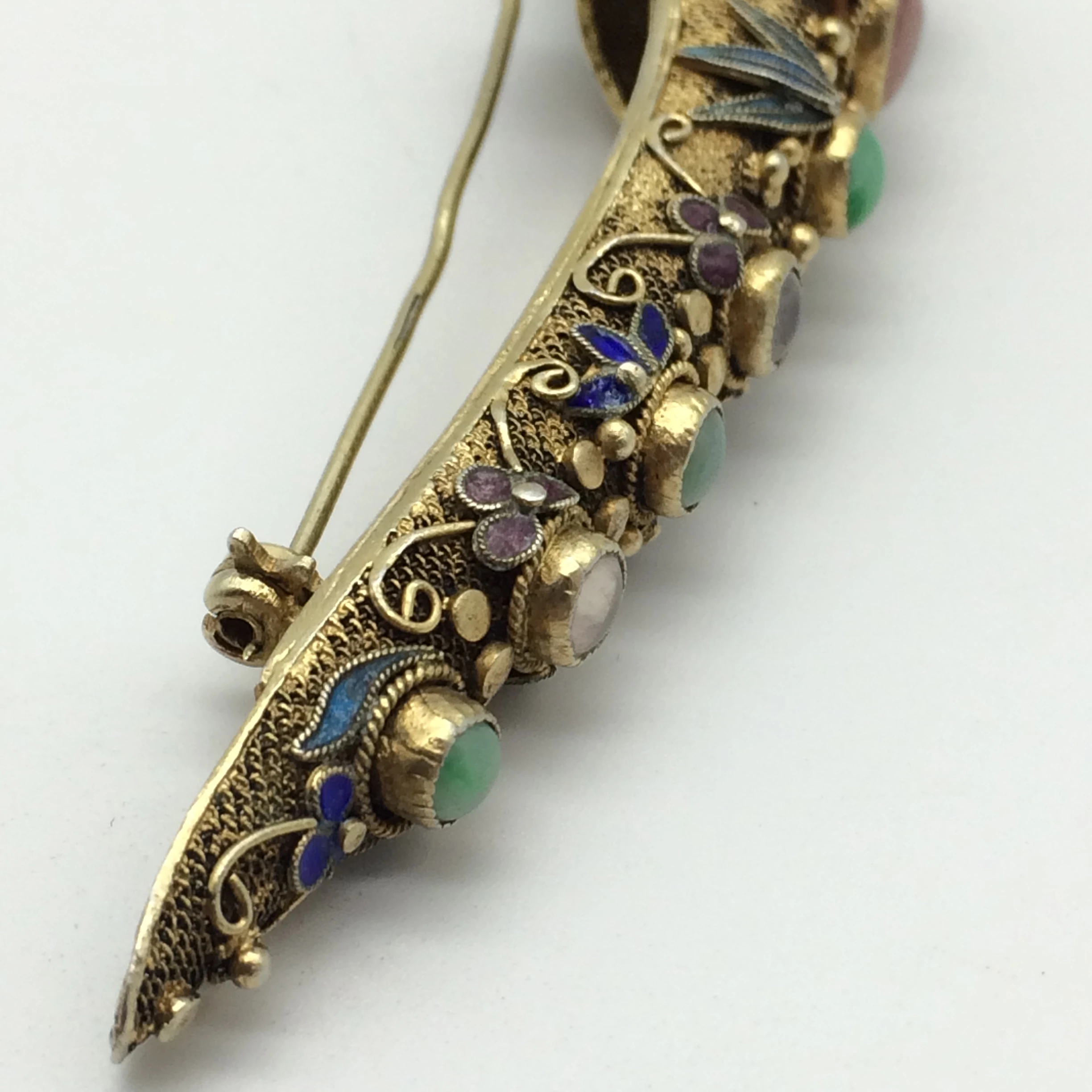 This exquisite, silver gilt, filigree brooch, made from an antique Chinese fingernail guard or protector, which were worn by high status women to protect their fingernails, is in excellent condition. It is beautifully crafted and decorated with gemstones and enamel flowers and petals and is stamped silver on the back. It measures 8.5cm in length and weighs 15.5g.