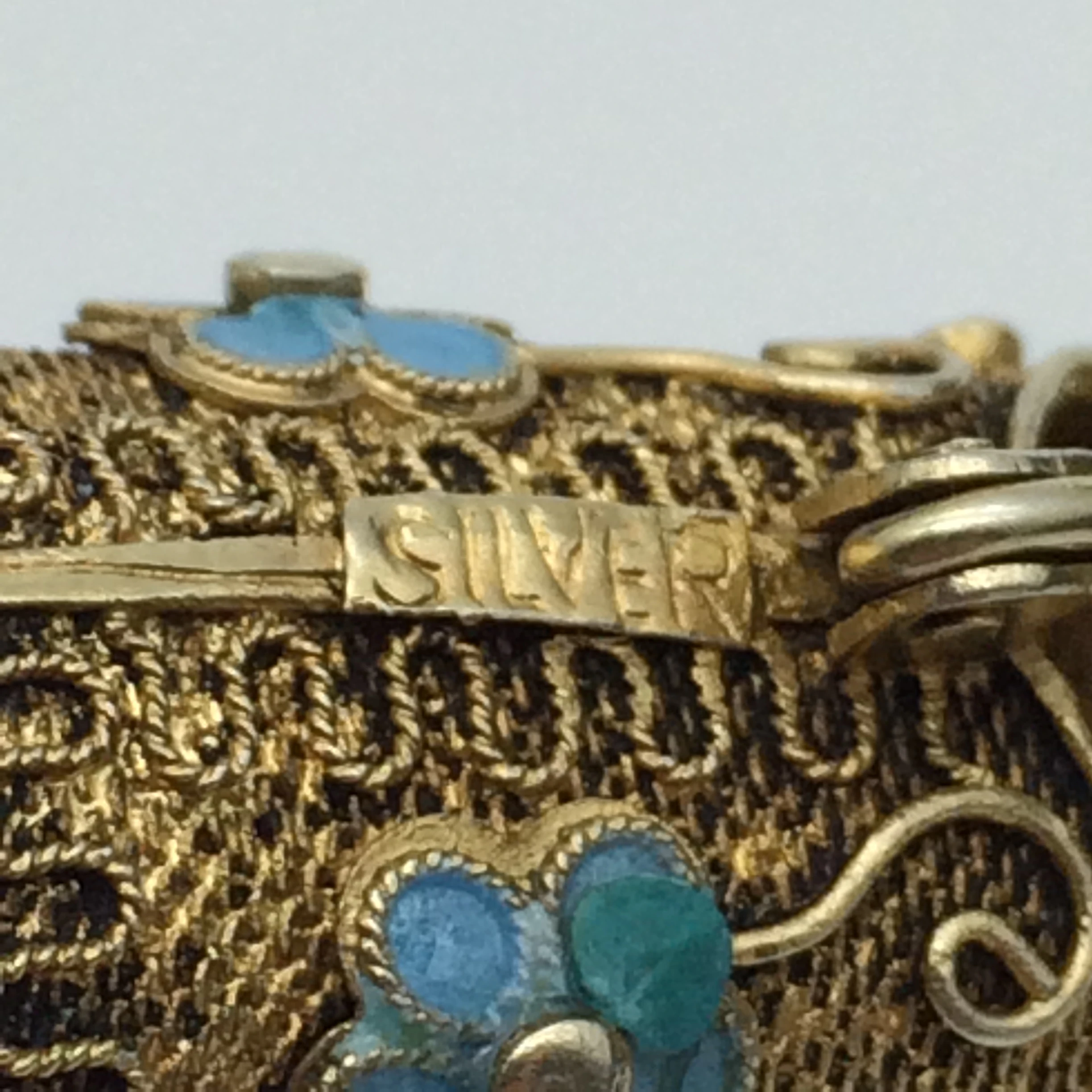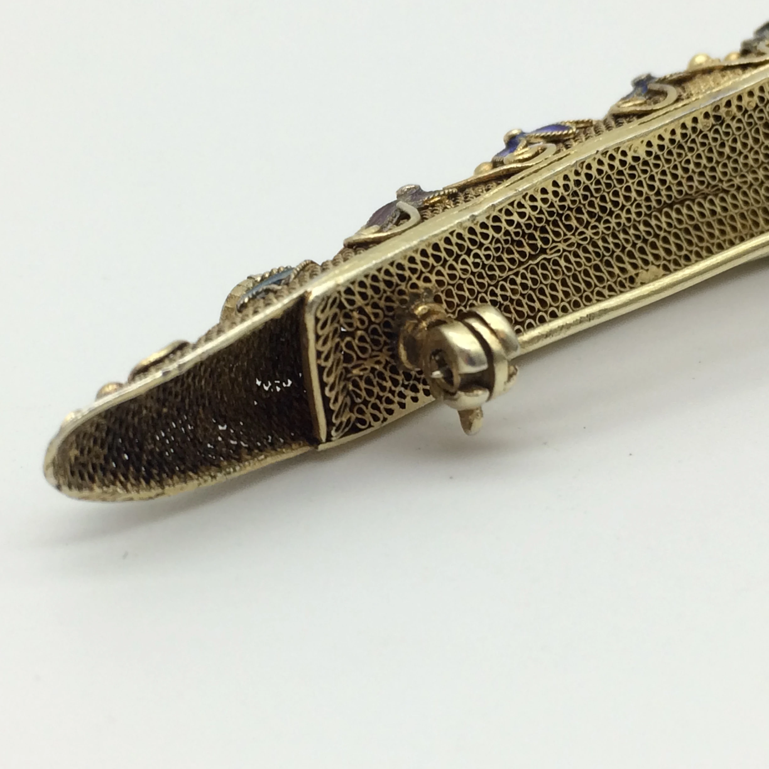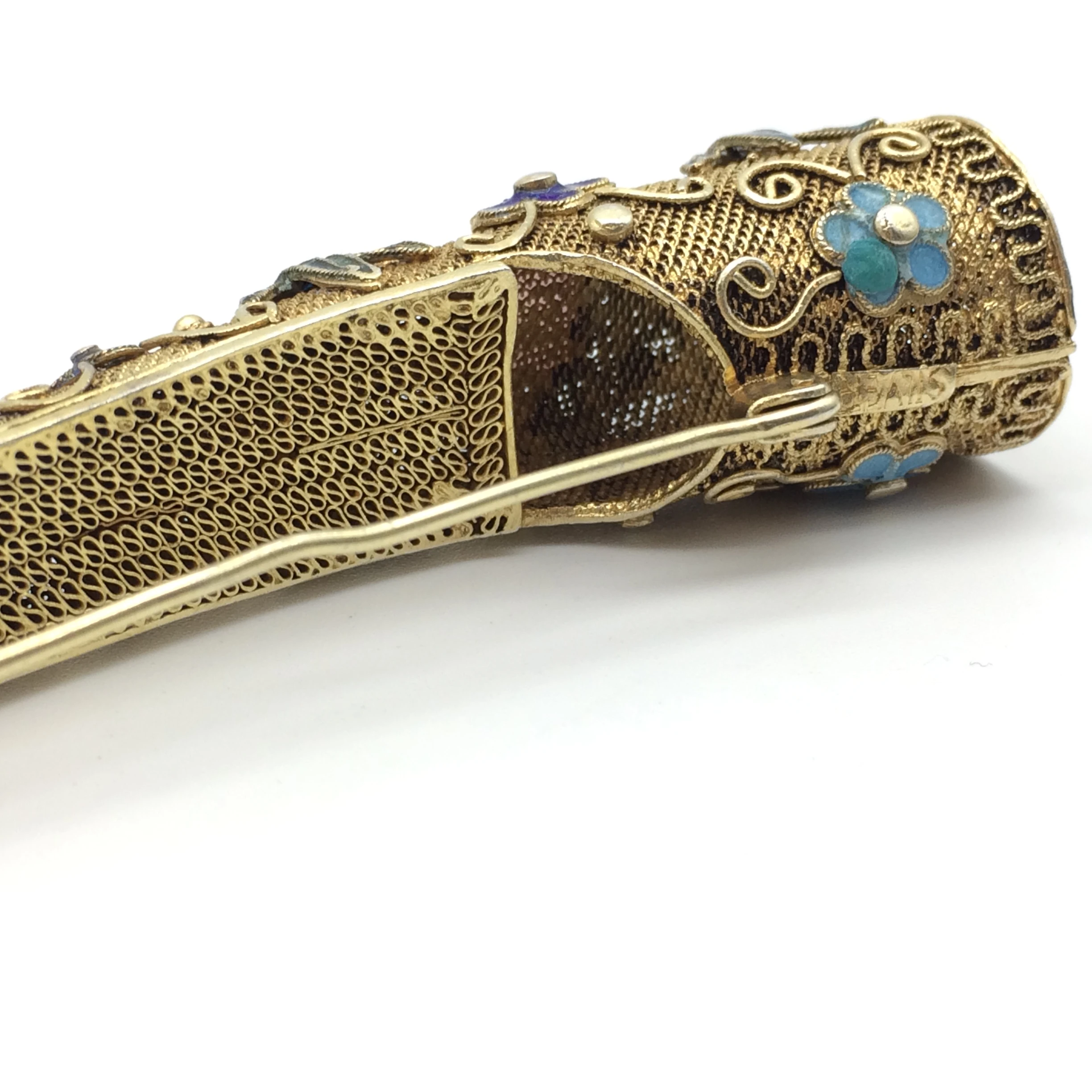 This exquisite, silver gilt, filigree brooch, made from an antique Chinese fingernail guard or protector, which were worn by high status women to protect their fingernails, is in excellent condition. It is beautifully crafted and decorated with gemstones and enamel flowers and petals and is stamped silver on the back. It measures 8.5cm in length and weighs 15.5g.
