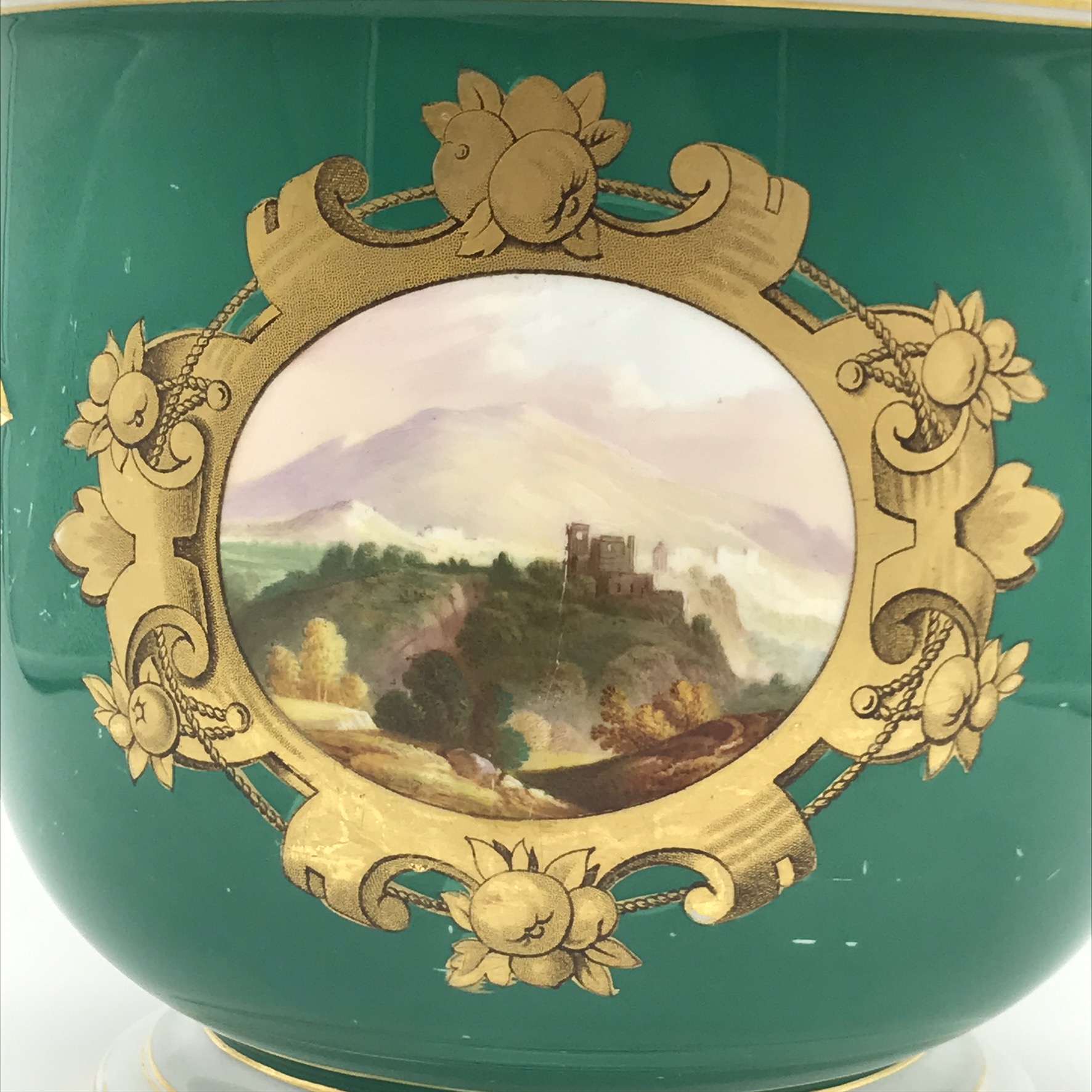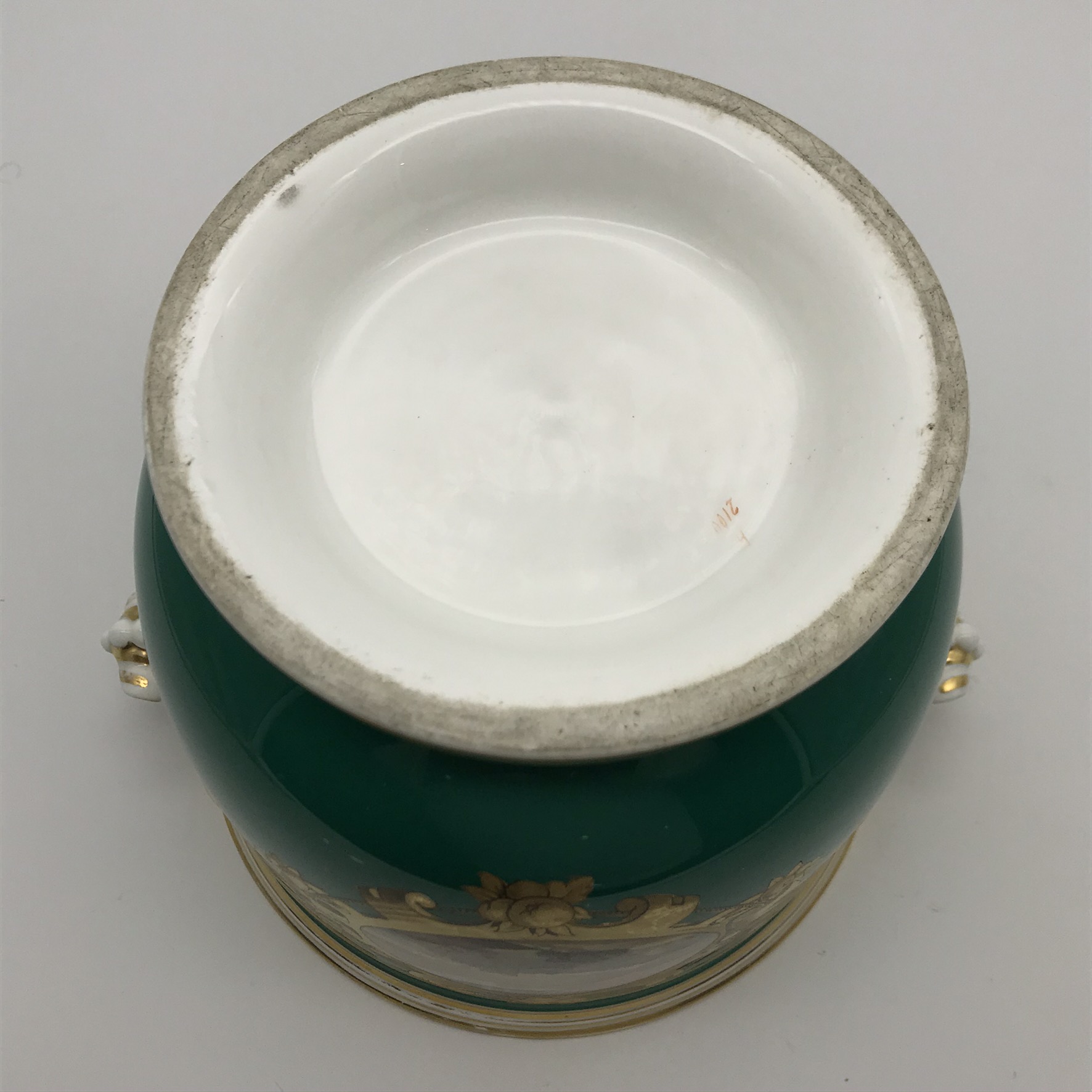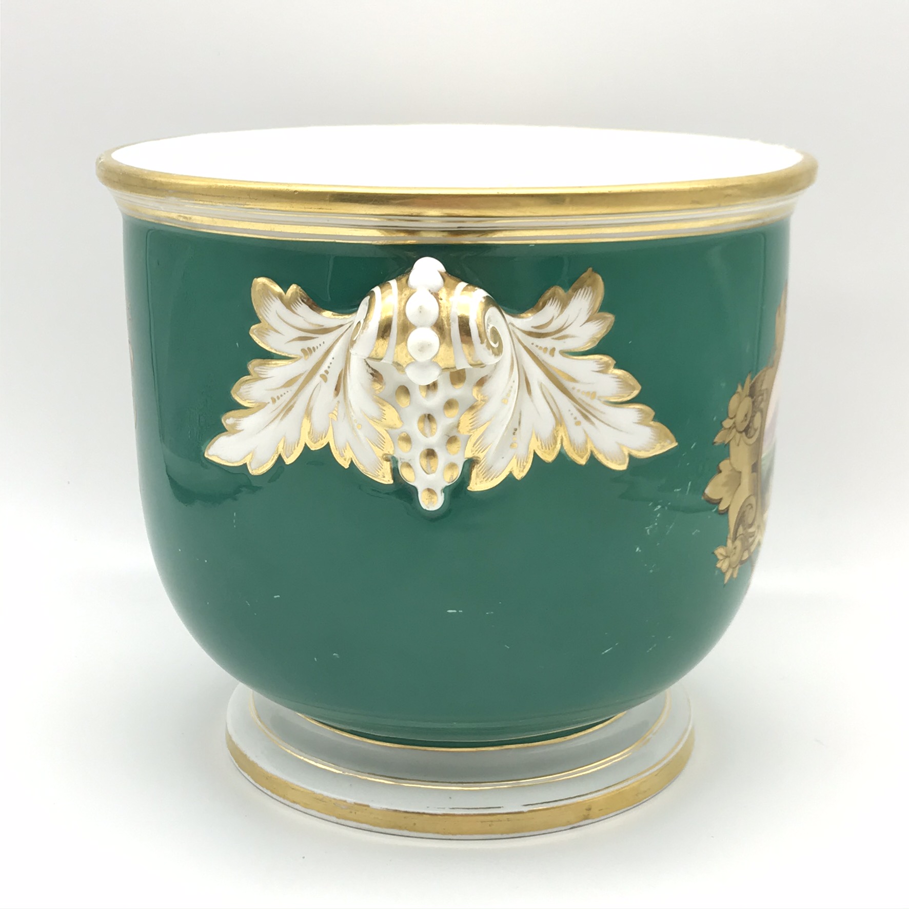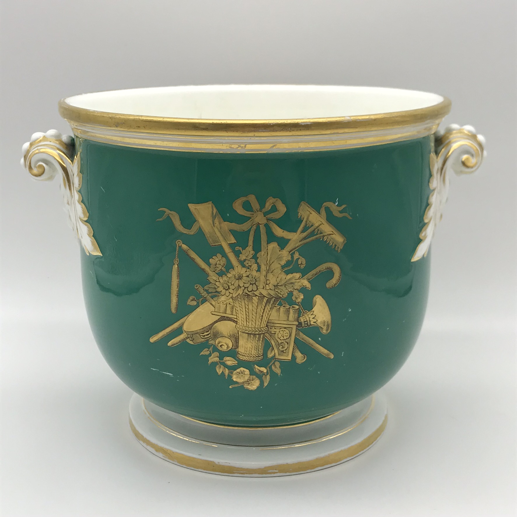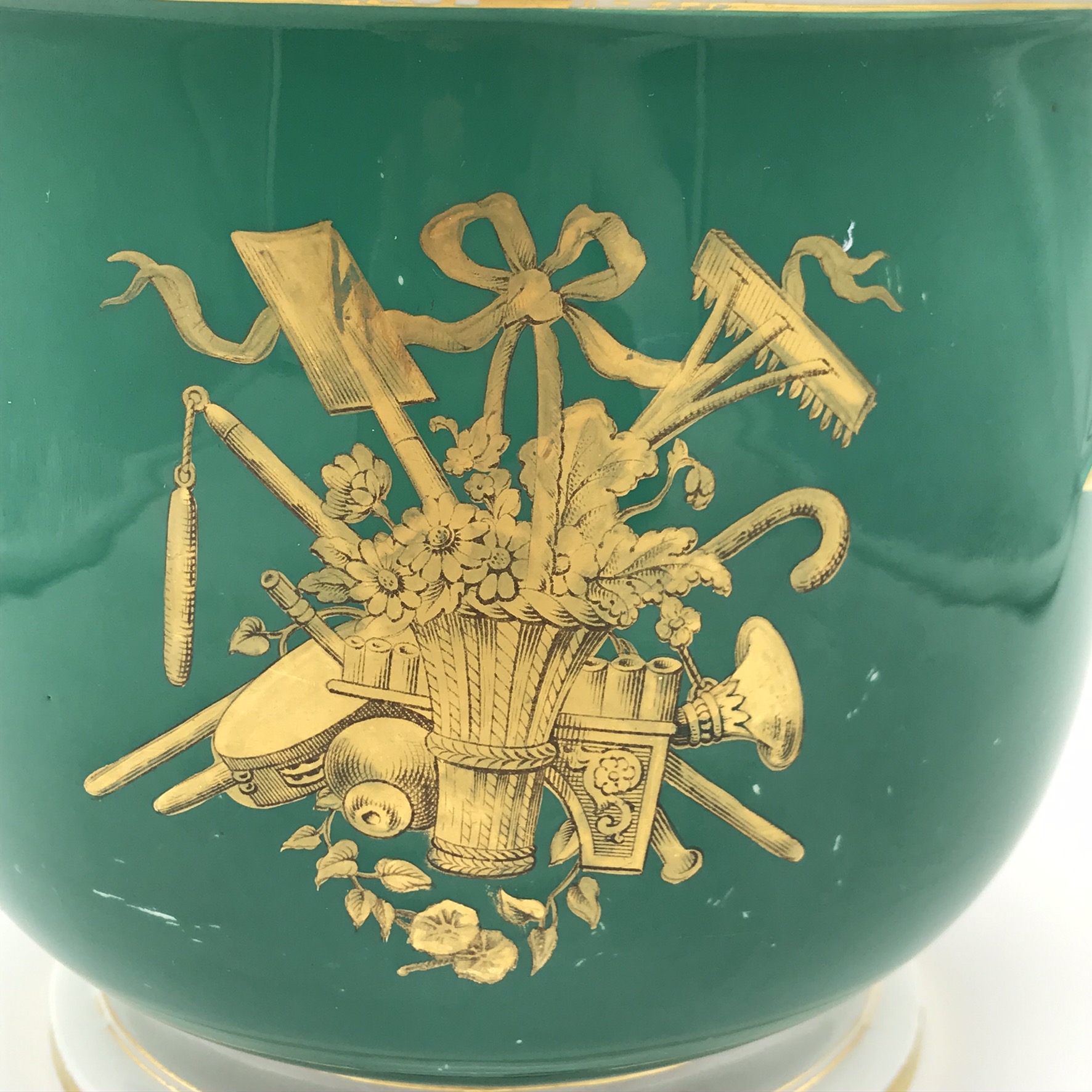 This wonderful, seldom seen, large antique French porcelain wine cooler or jardiniere from the early 1800’s, has a super bulbous shape with lovely, white, gilt acanthus shaped handles. It has a dark green background with a beautiful hand painted round panel on the front, of a country scene with a castle, boarded with a beautiful, detailed gilt frame with apples. On the back, there’s a wonderful hand painted gilt picture, combining musical instruments, farming tools and a large basket of flowers with knotted ribbon above (a tambourine, pan flute, horn, spade, rake etc). There’s also, on the base, a small hand painted number ‘2100’ with the letter ‘F’ above. Other than some wear to the gilding on the rims, and minor scratches to the green background and interior, it’s in great condition. The jardiniere stands 16,3cm high, with a top diameter of 18,3cm, a base diameter of 13,5cm, a handle-to-handle measurement of 22cm and it weighs 1,7kg.