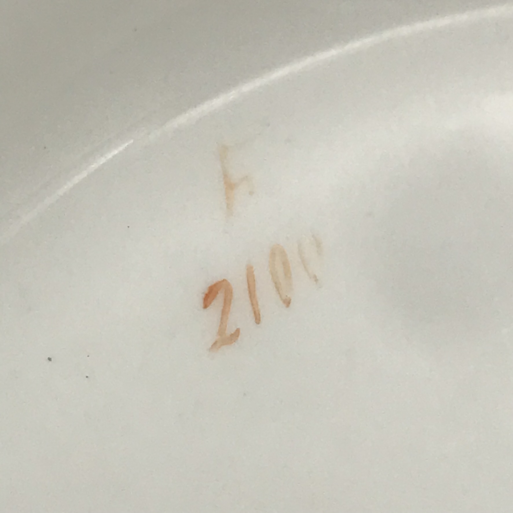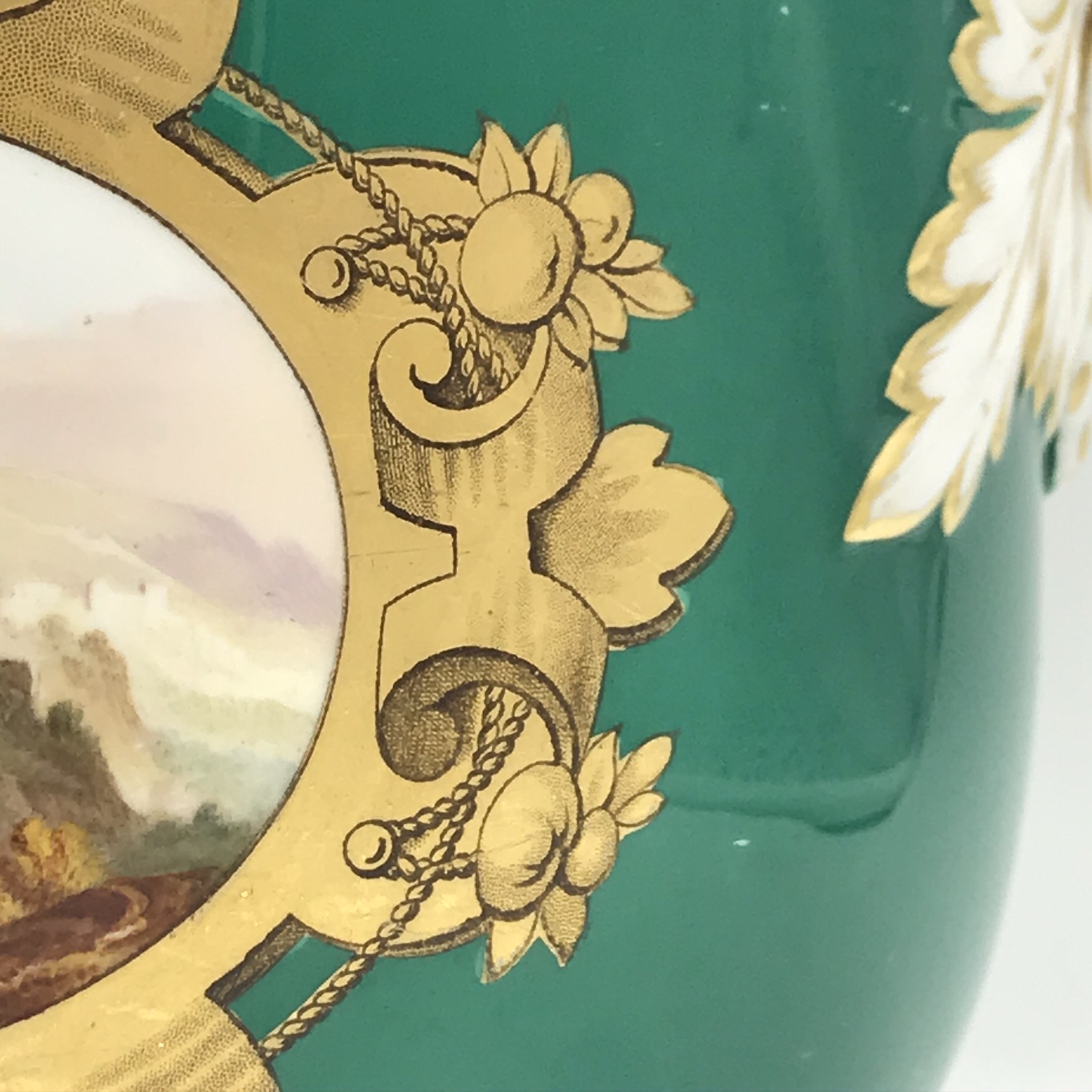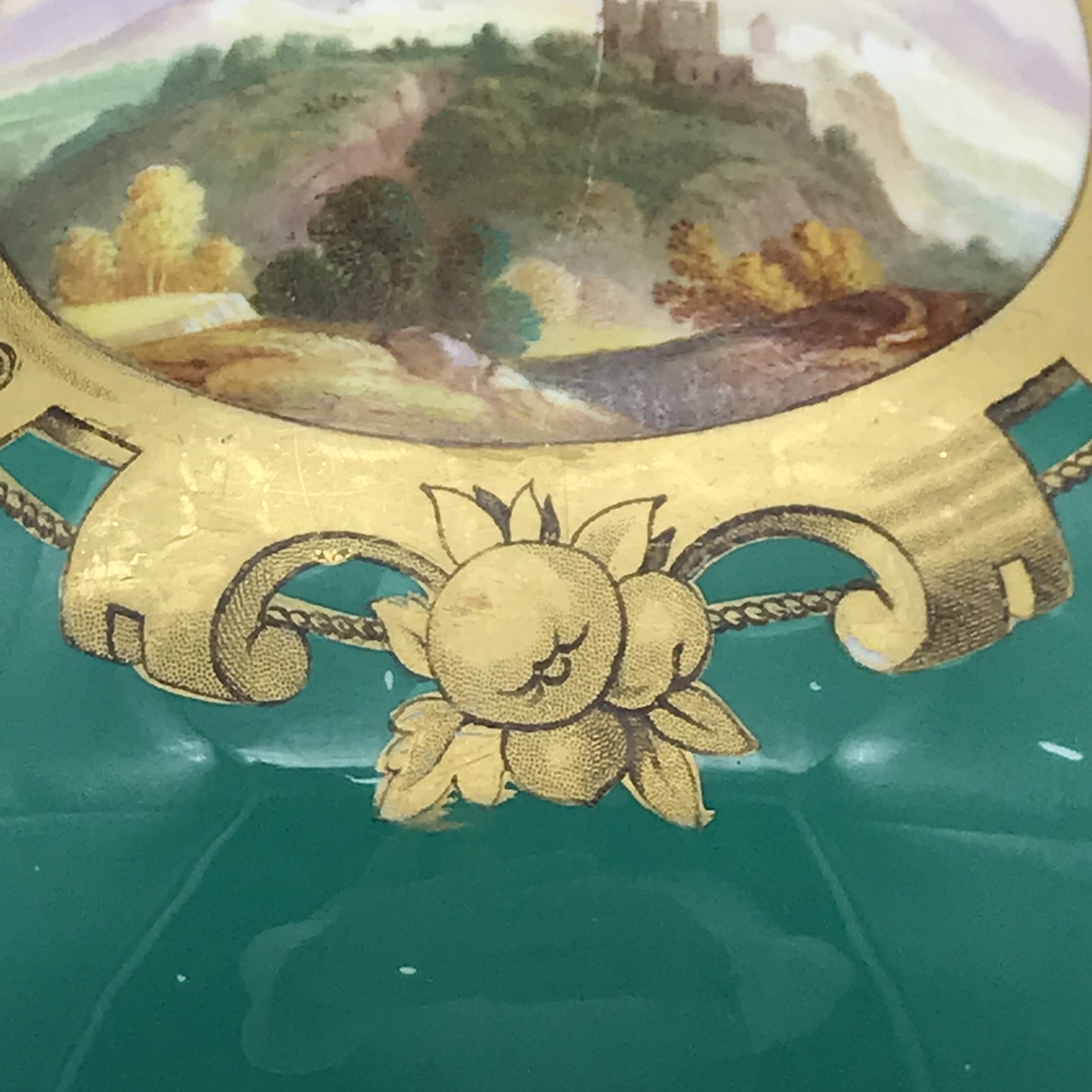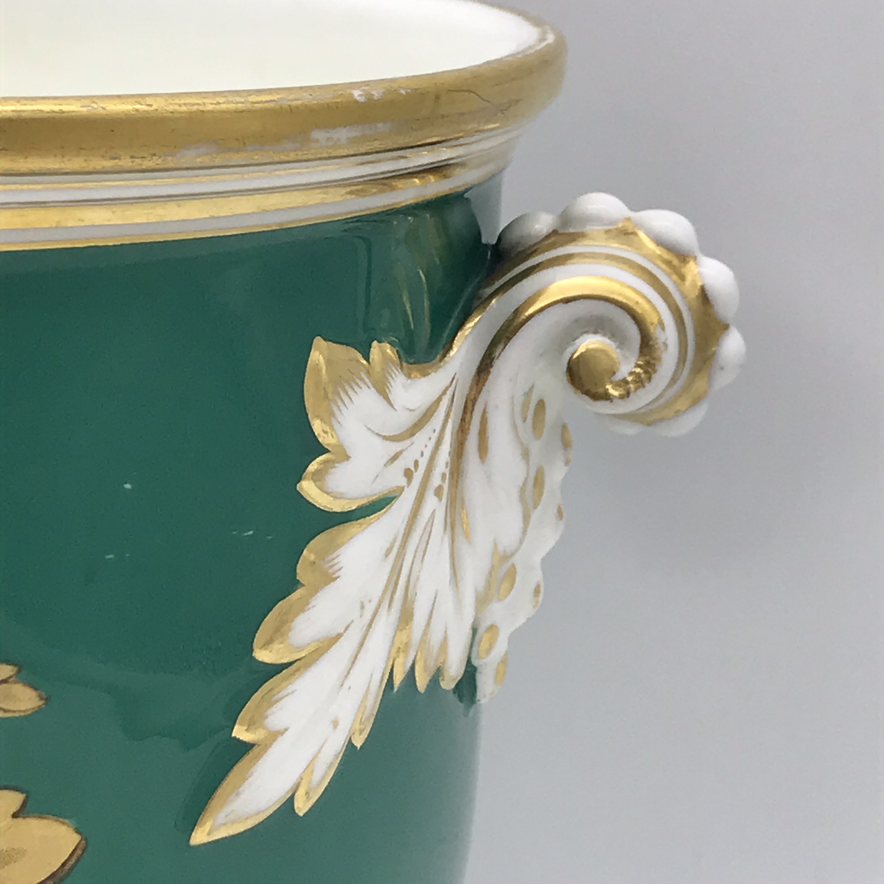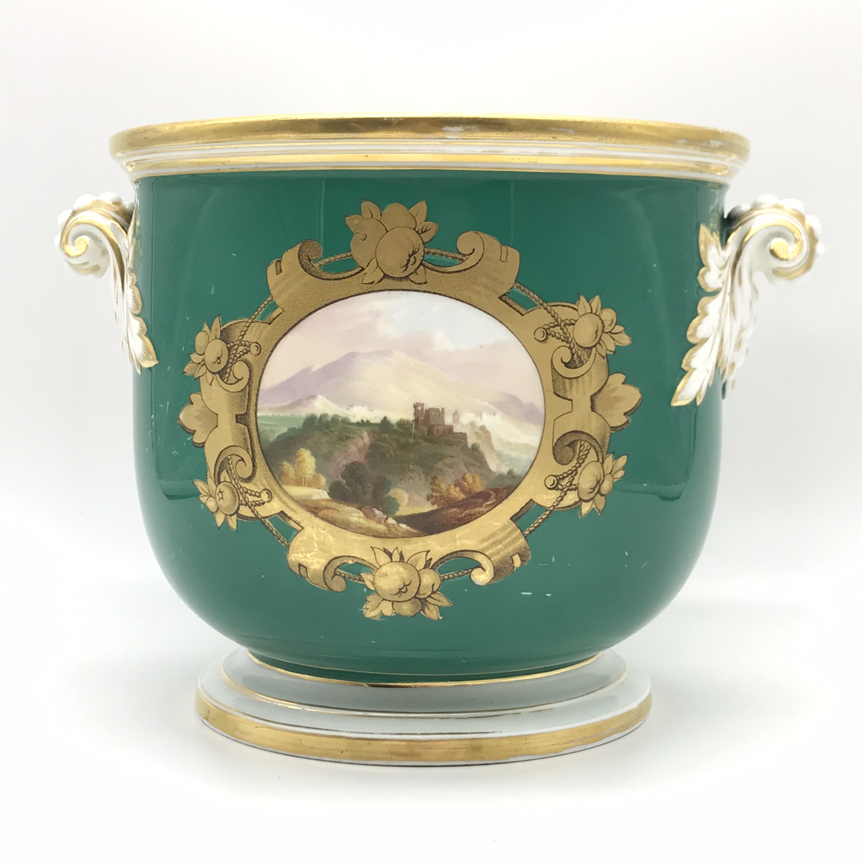 This wonderful, seldom seen, large antique French porcelain wine cooler or jardiniere from the early 1800’s, has a super bulbous shape with lovely, white, gilt acanthus shaped handles. It has a dark green background with a beautiful hand painted round panel on the front, of a country scene with a castle, boarded with a beautiful, detailed gilt frame with apples. On the back, there’s a wonderful hand painted gilt picture, combining musical instruments, farming tools and a large basket of flowers with knotted ribbon above (a tambourine, pan flute, horn, spade, rake etc). There’s also, on the base, a small hand painted number ‘2100’ with the letter ‘F’ above. Other than some wear to the gilding on the rims, and minor scratches to the green background and interior, it’s in great condition. The jardiniere stands 16,3cm high, with a top diameter of 18,3cm, a base diameter of 13,5cm, a handle-to-handle measurement of 22cm and it weighs 1,7kg.
