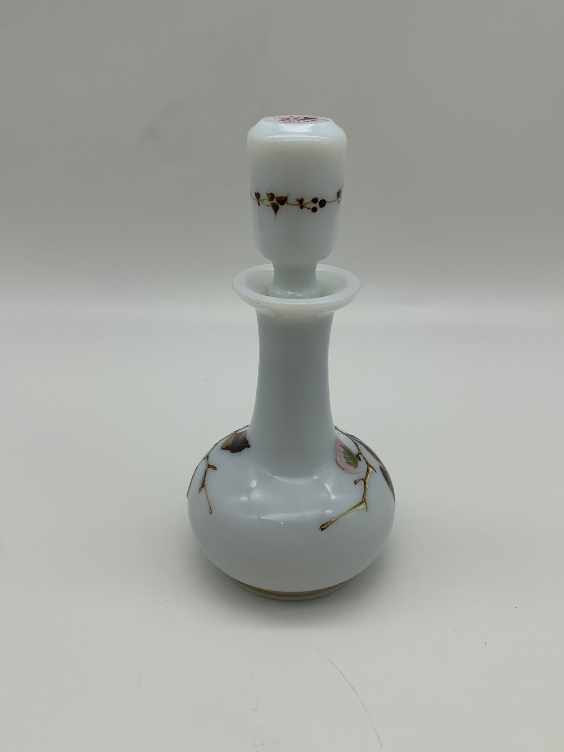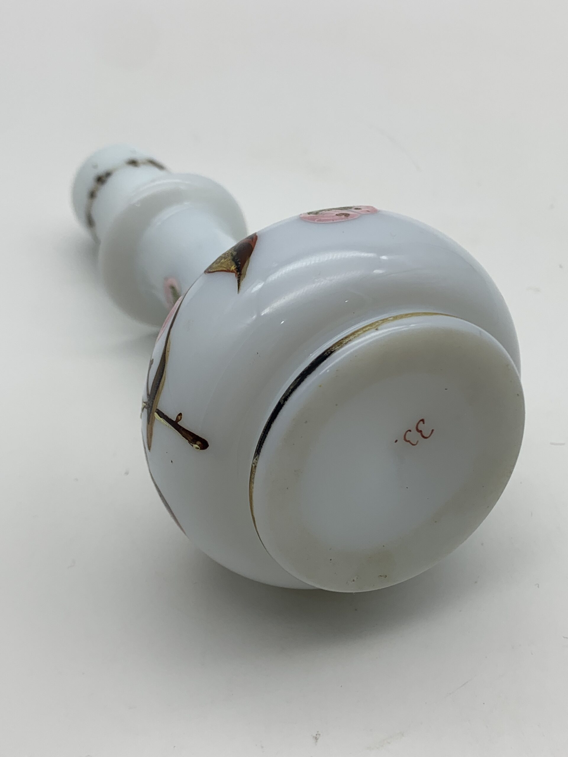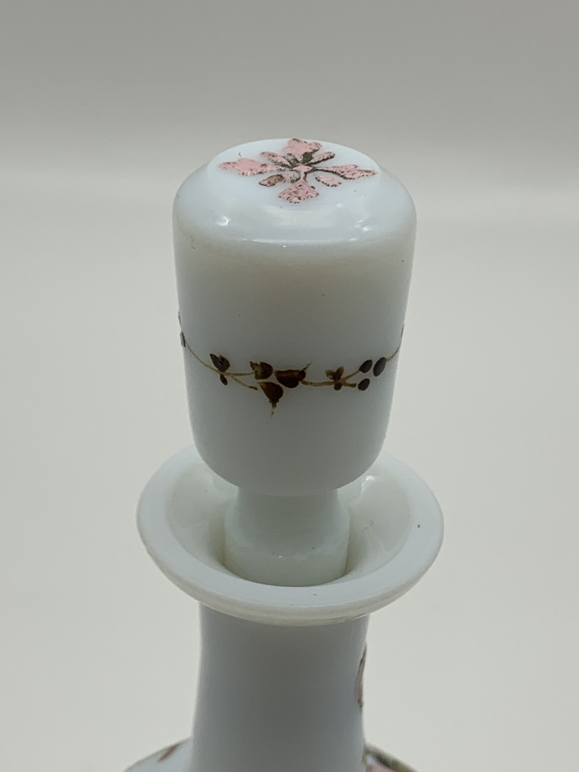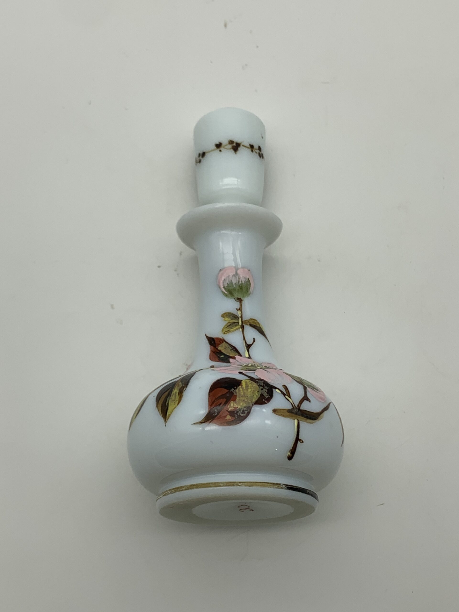 This wonderful, antique, opaline glass scent bottle and stopper from the early 1900’s, is beautifully hand painted in enamels, with a bunch of pink flowers and autumn-coloured leaves against a white opaline background. The perfume bottle & stopper are in excellent condition and stands 13cm high with a diameter of 6,3cm and weight of 147g.