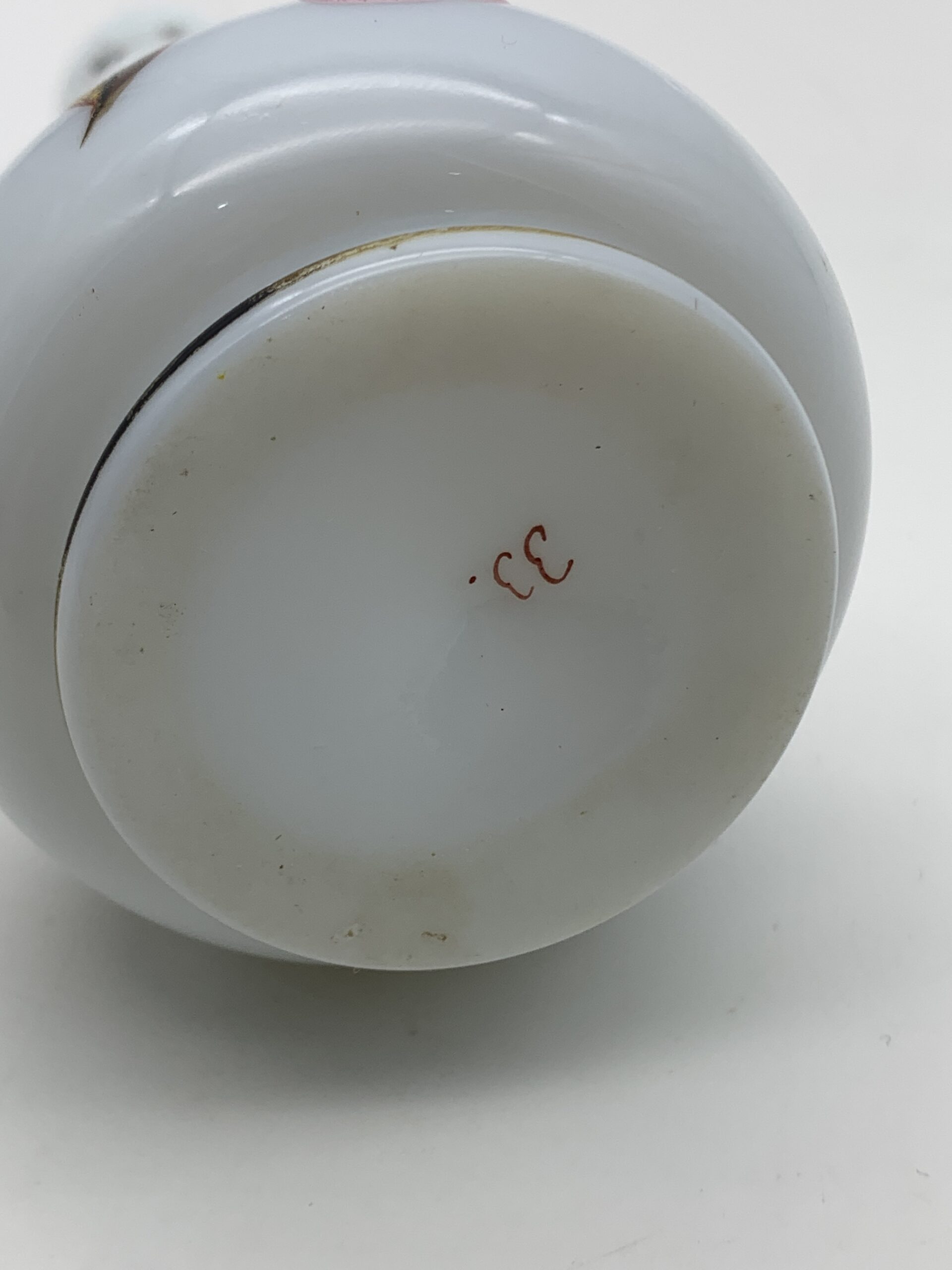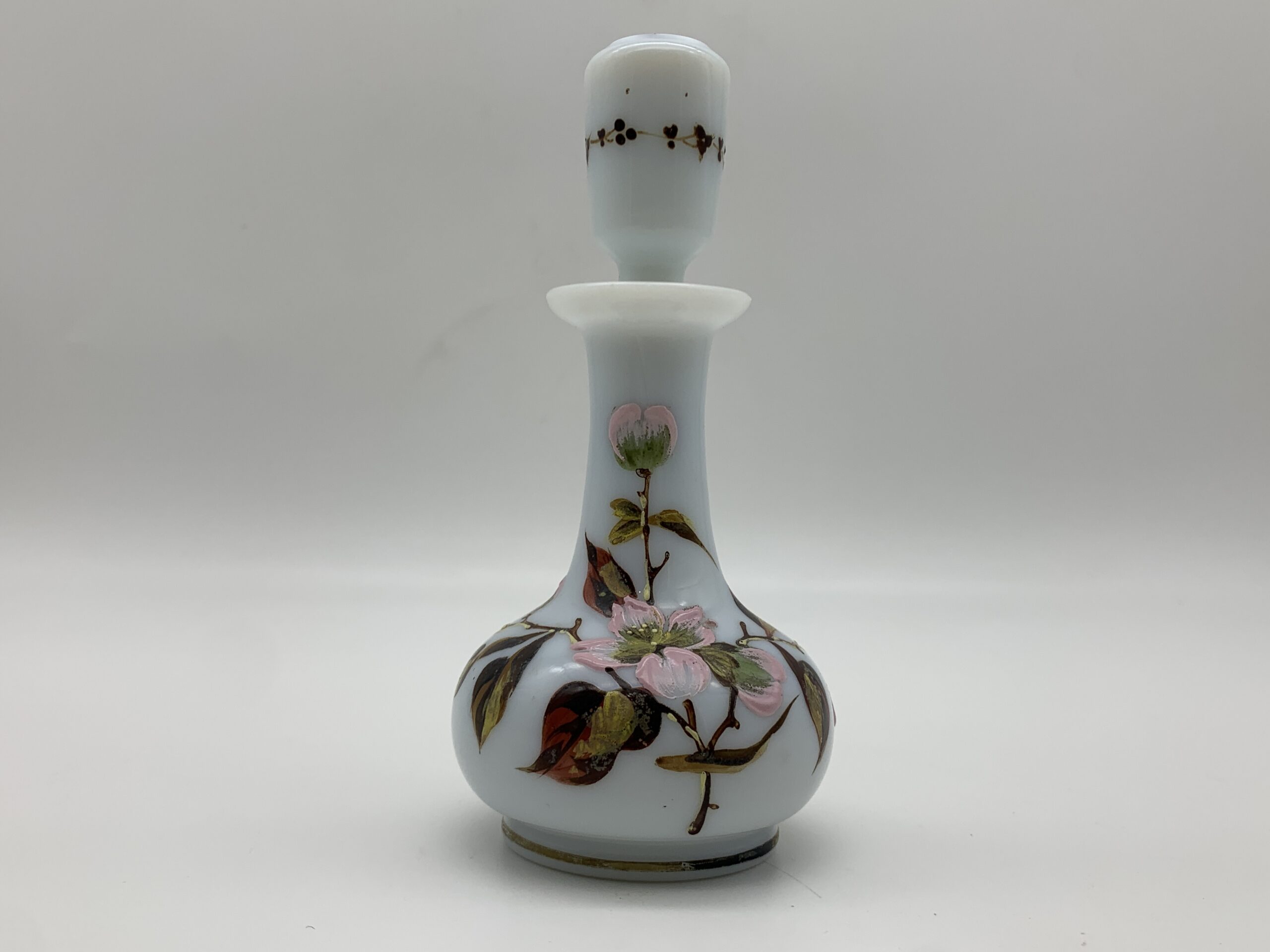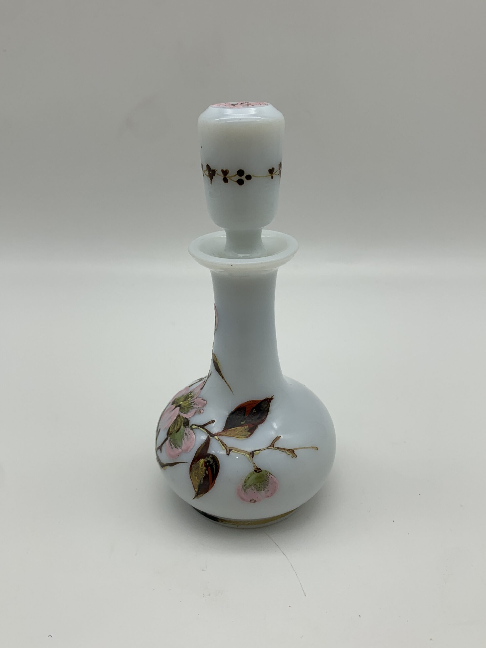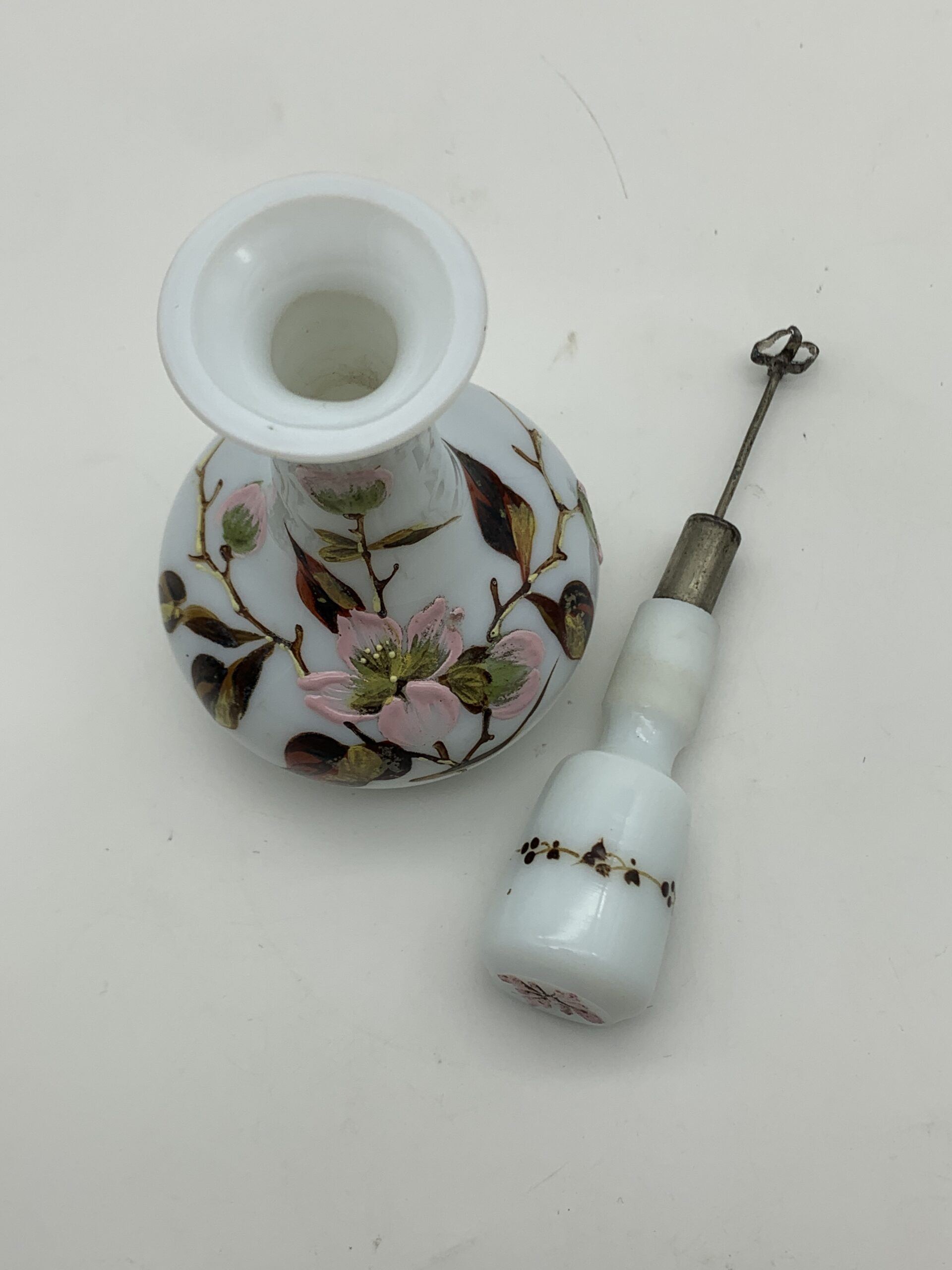 This wonderful, antique, opaline glass scent bottle and stopper from the early 1900’s, is beautifully hand painted in enamels, with a bunch of pink flowers and autumn-coloured leaves against a white opaline background. The perfume bottle & stopper are in excellent condition and stands 13cm high with a diameter of 6,3cm and weight of 147g.