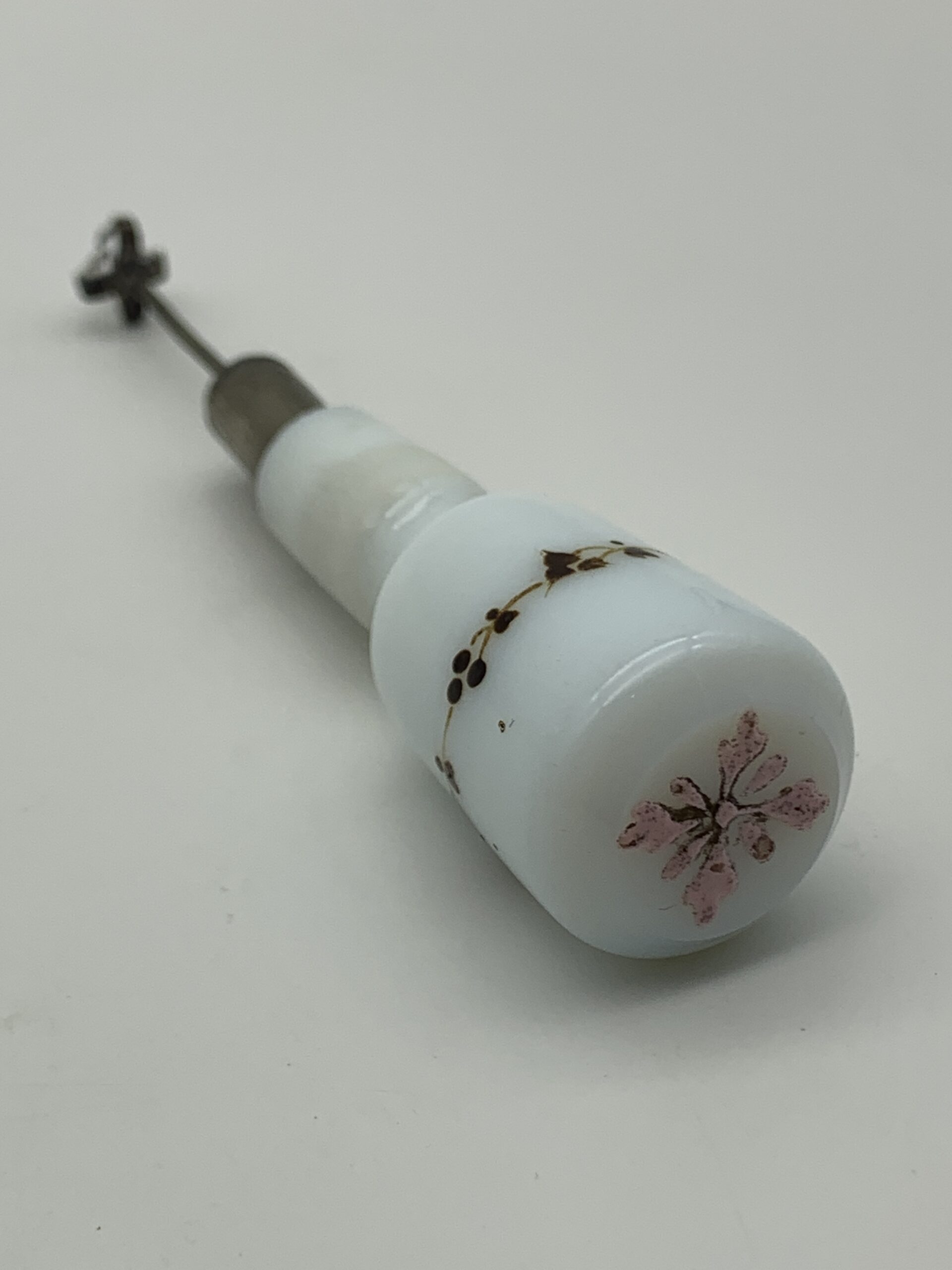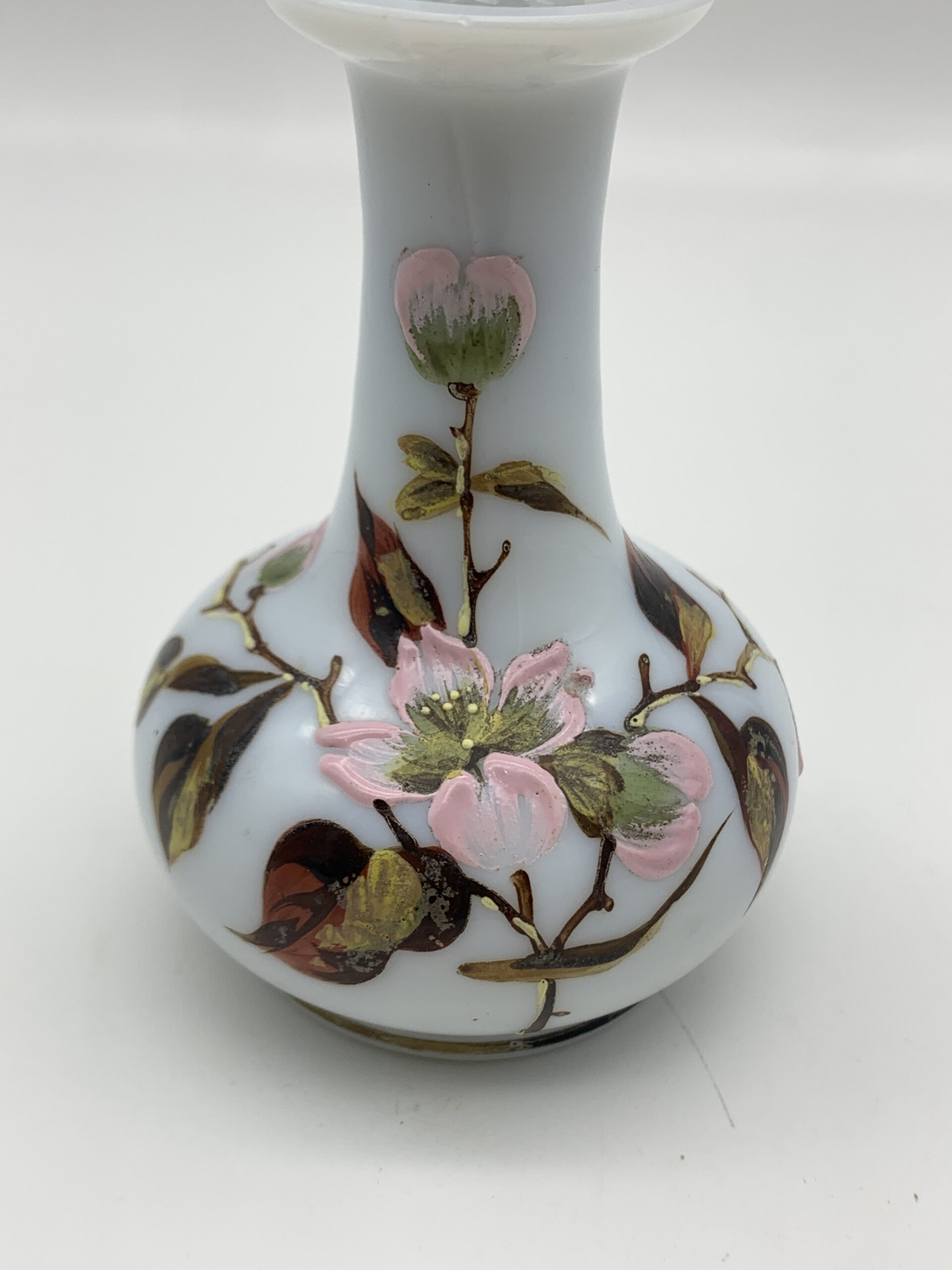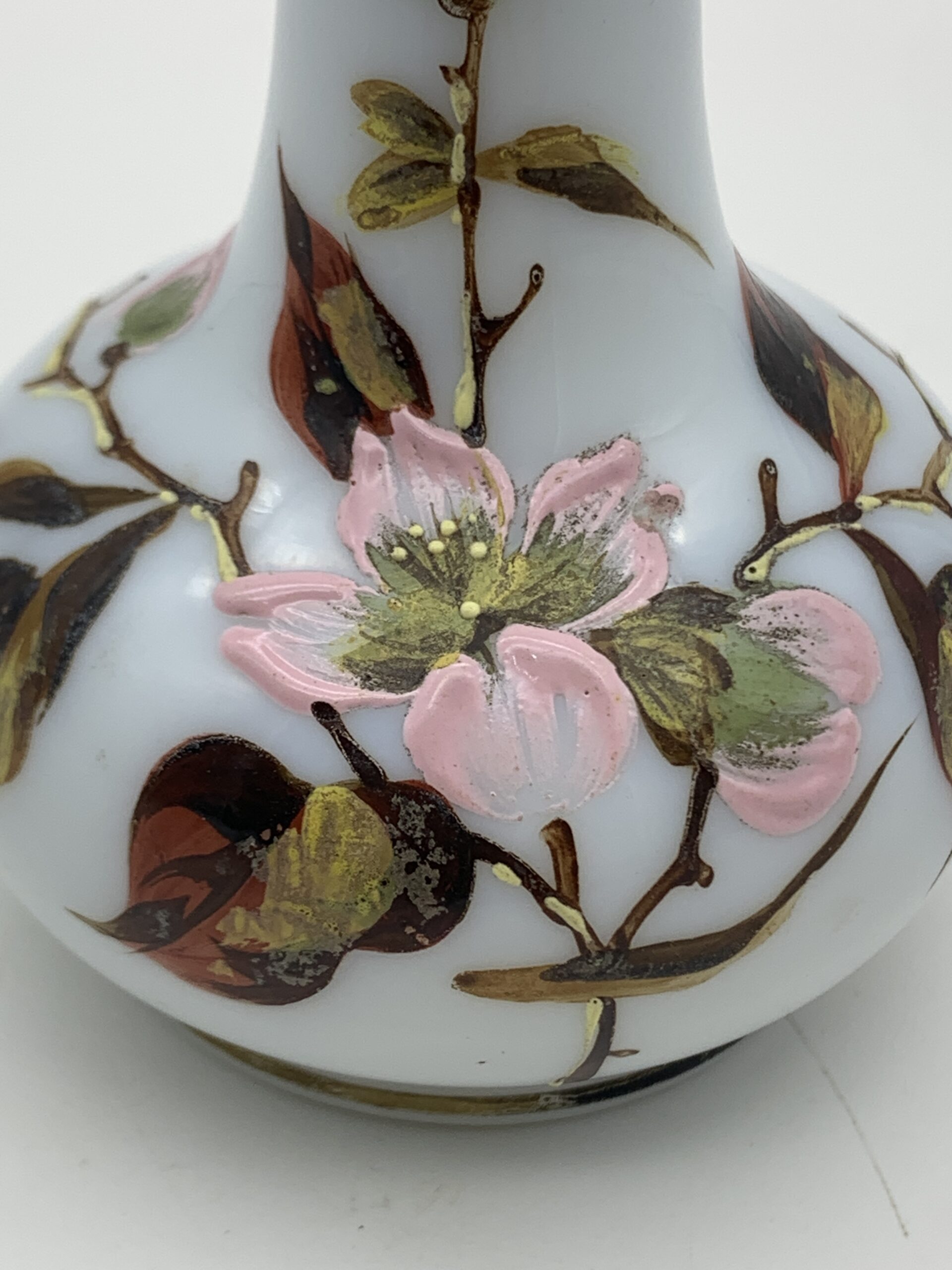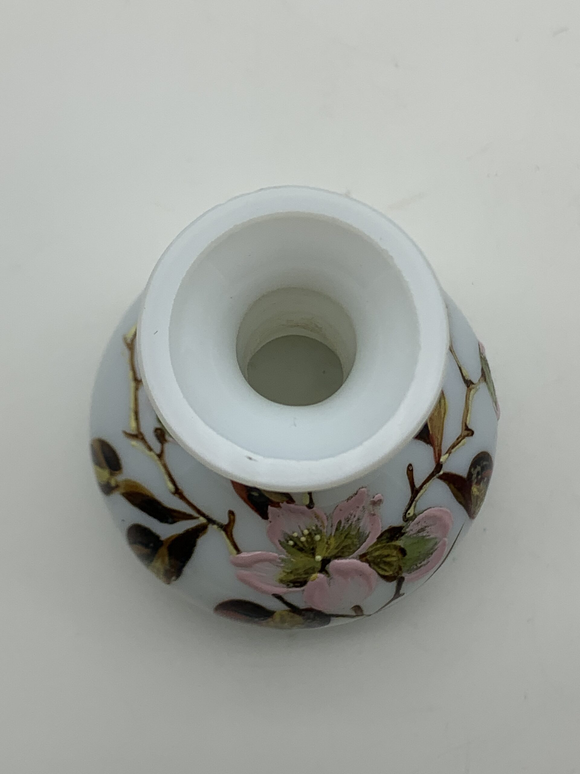 This wonderful, antique, opaline glass scent bottle and stopper from the early 1900’s, is beautifully hand painted in enamels, with a bunch of pink flowers and autumn-coloured leaves against a white opaline background. The perfume bottle & stopper are in excellent condition and stands 13cm high with a diameter of 6,3cm and weight of 147g.