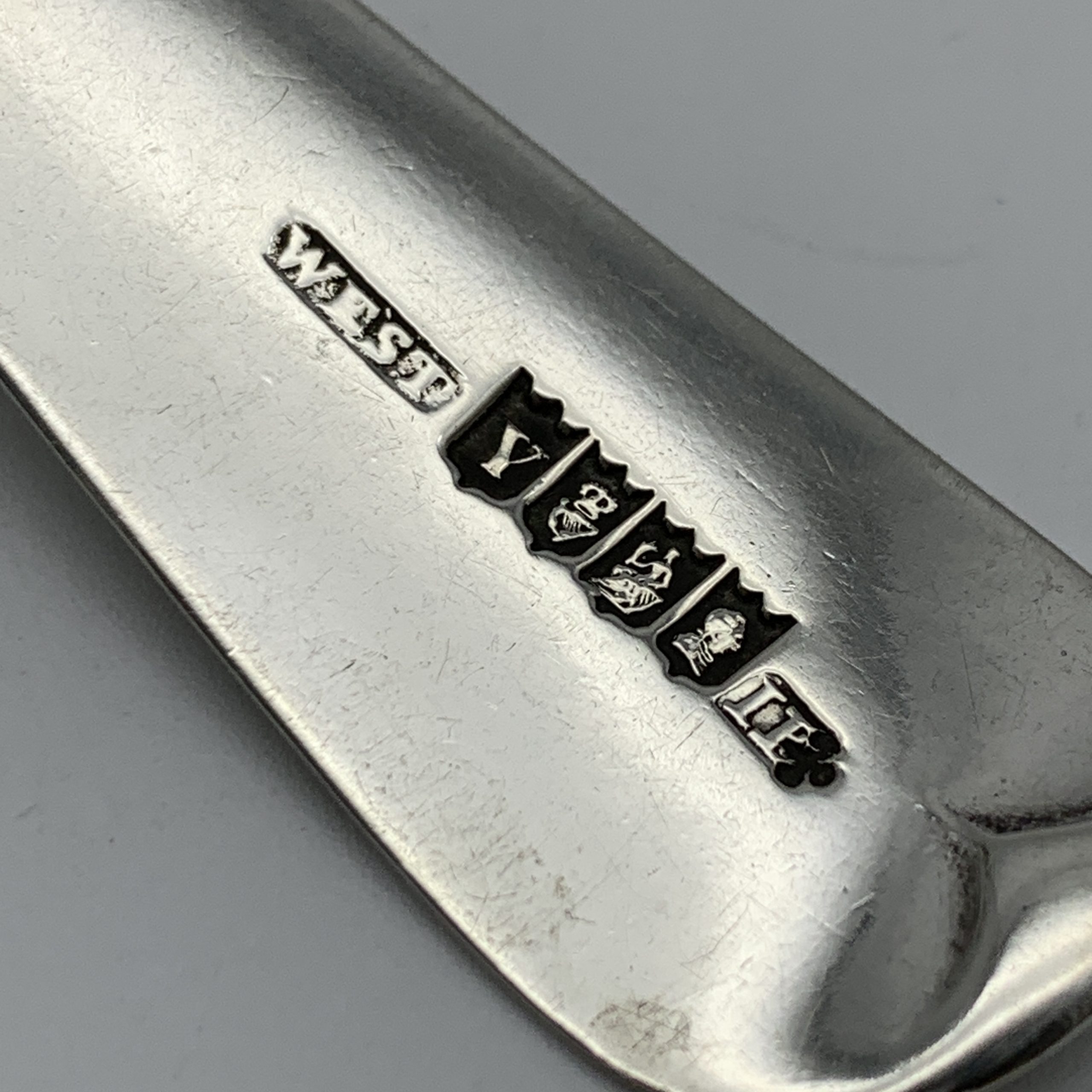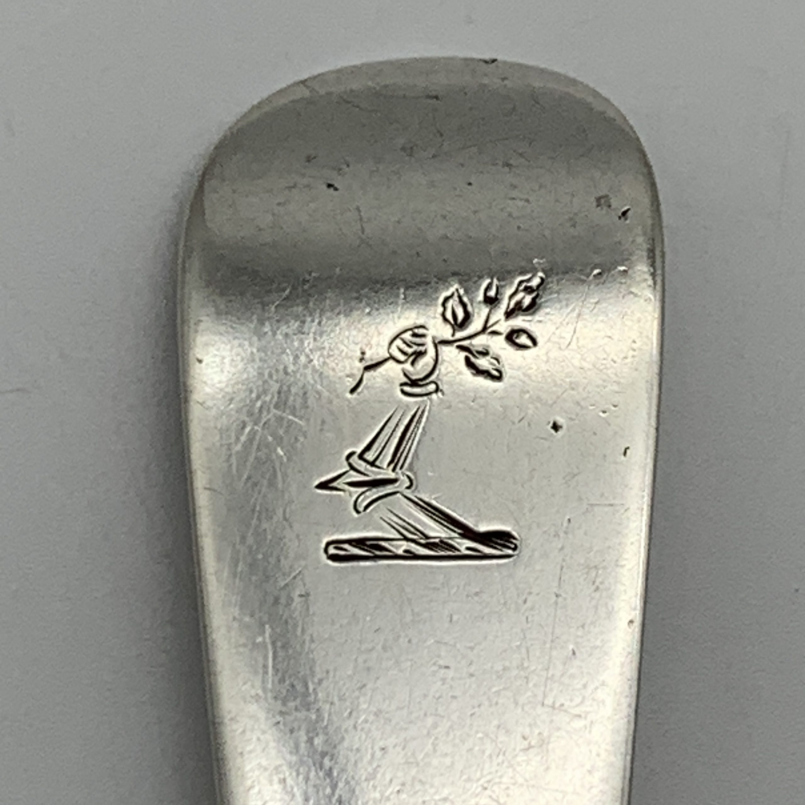 This lovely sterling silver, Irish ‘George III’ ‘Rat-Tail’ sauce ladle was made in 1819 in Dublin, Ireland by silversmiths ‘John Pittar’ (IP) and retailed by ‘WEST’ (The West’s were prominent Dublin silversmiths and retailers). It’s in great condition with good clear hallmarks and a pronounced ‘rat-tail’ on the back of the bowl and has an engraved family crest of an ‘arm holding a small branch of leaves.’ The ladle measures 15cm in length and 4,9cm across the bowl and weighs 34,2g.