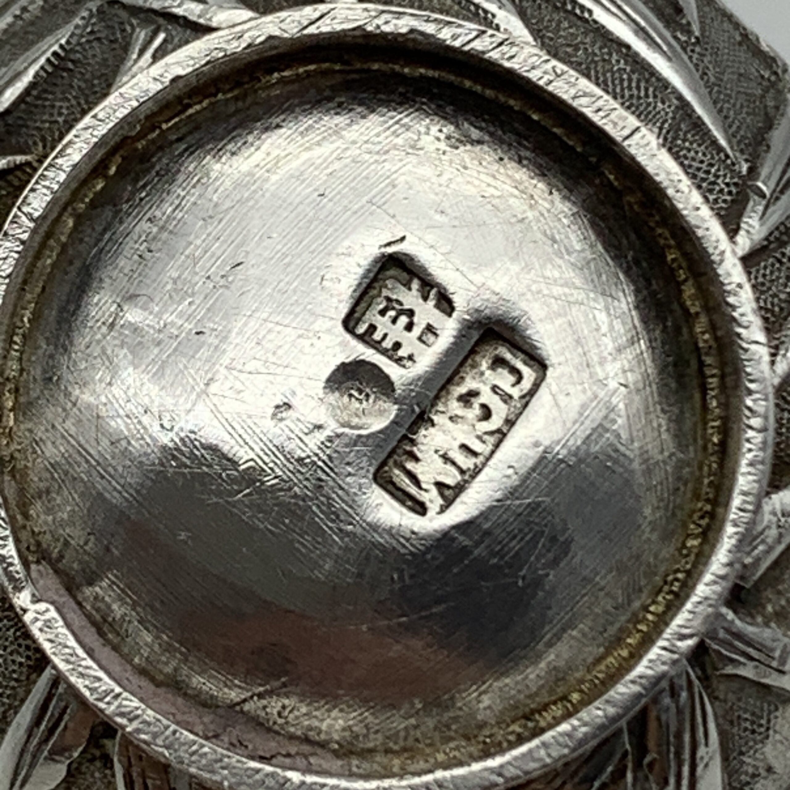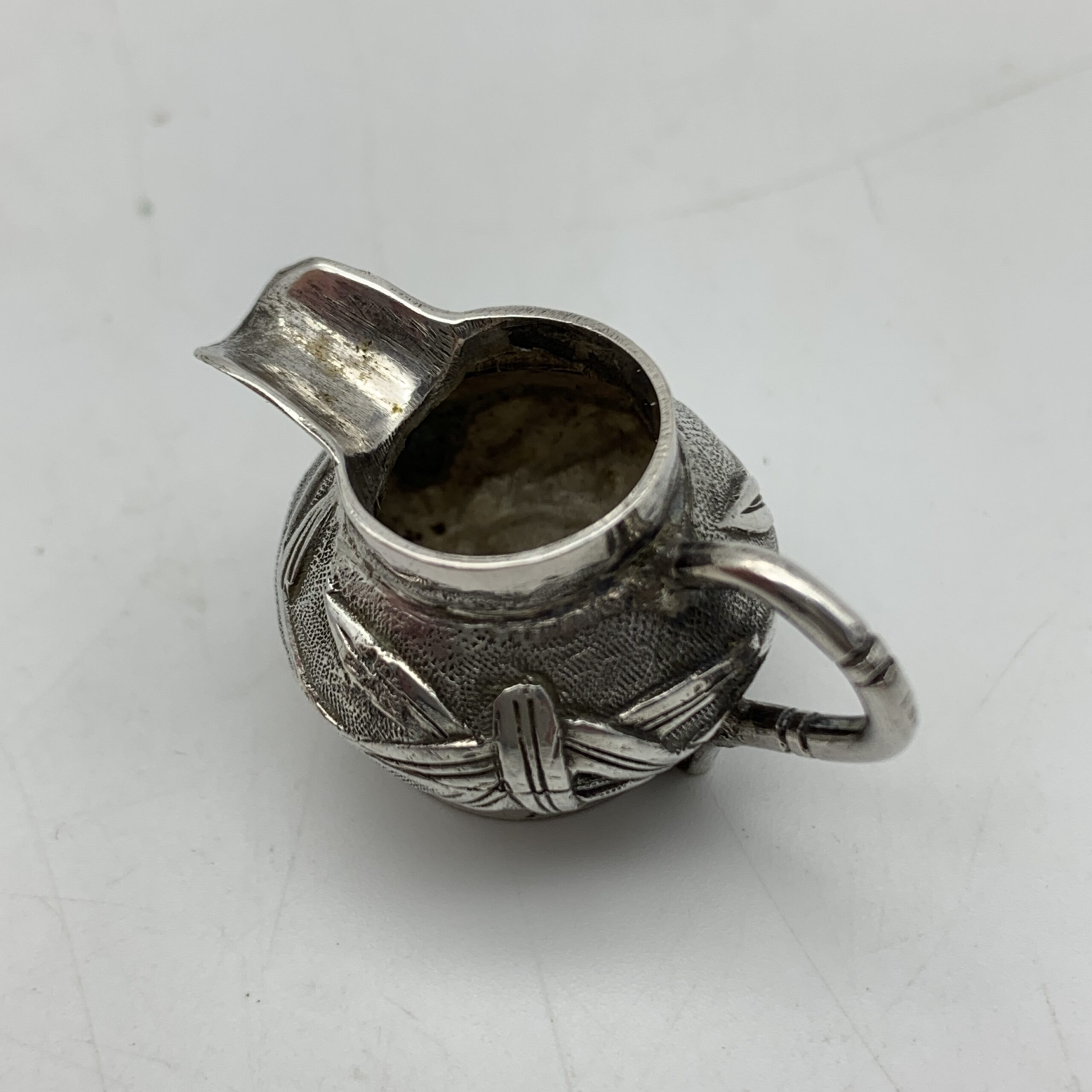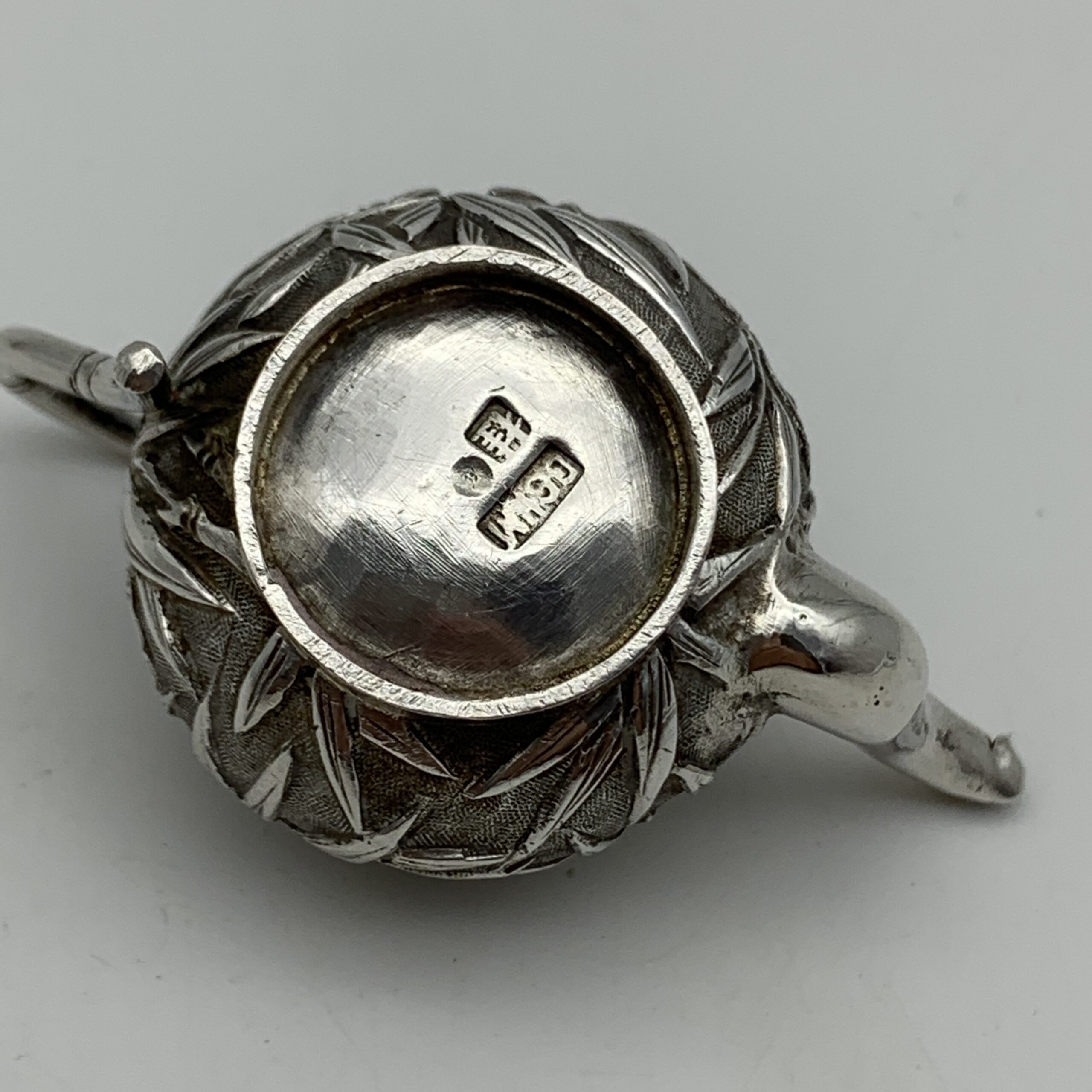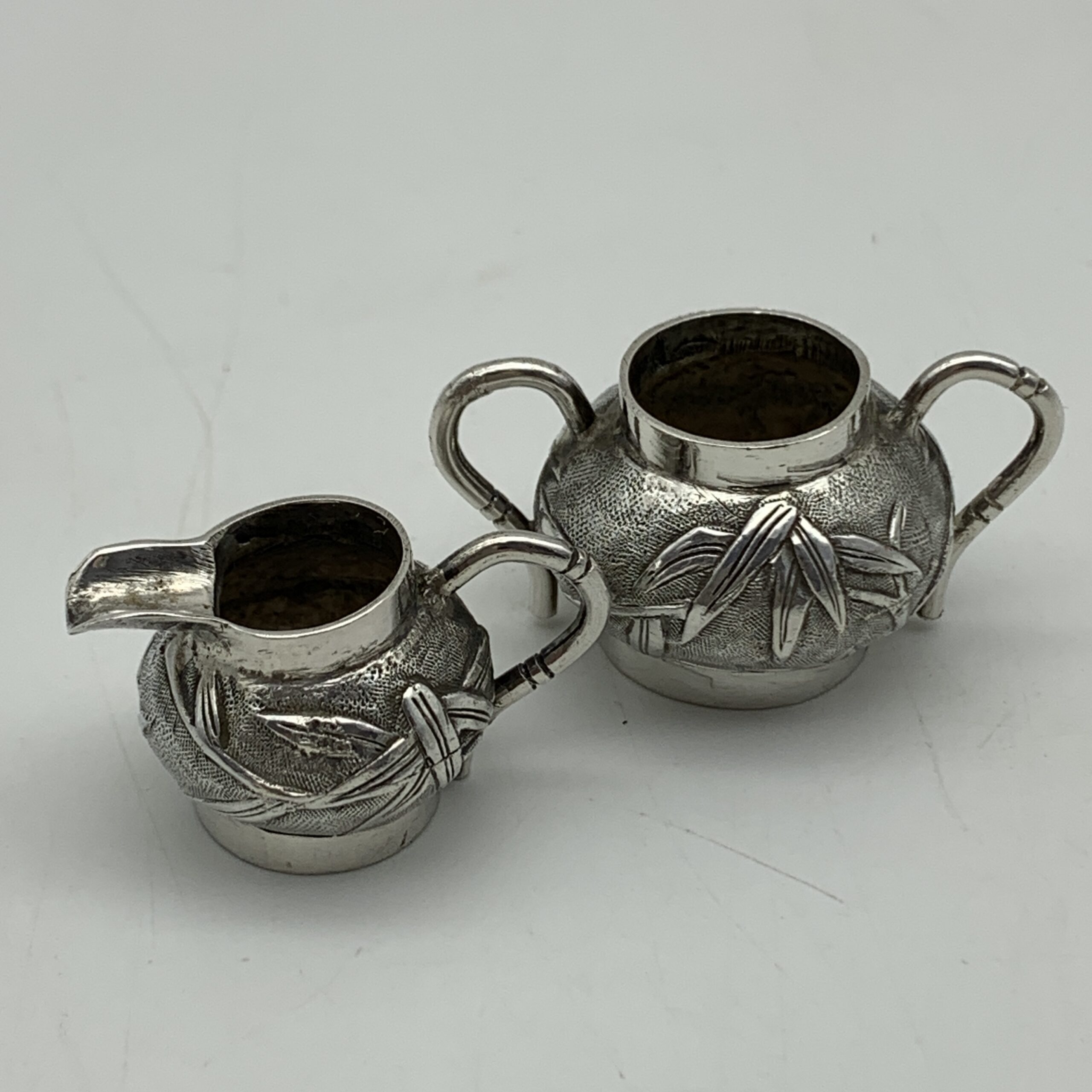 This very collectable, charming, scarce, solid silver ‘Chinese Export’ miniature tea set was made by the well-known silversmith ‘Wang Hing’, who traded out of Canton and Hong Kong between 1875 and 1925. It consists of a tiny teapot & lid, milk jug and sugar bowl, all finely crafted and beautifully decorated with lovely, raised bamboo detail. The base of the teapot is stamped with the ‘WH’ Chinese silver mark for ‘Wang Hing & Co’ and ‘90’ referring to the quality of silver (above 90%), and a Chinese ‘chopmark’. This wonderful miniature tea set is in excellent condition with a snug fitting lid. The teapot stands 30mm high (52mm from handle to spout) x 30mm, the sugar bowl stands 20mm high (37mm handle to handle) x 25mm, the milk jug stands 18mm high (30mm handle to spout) x 20mm and together they weigh 37,6g.