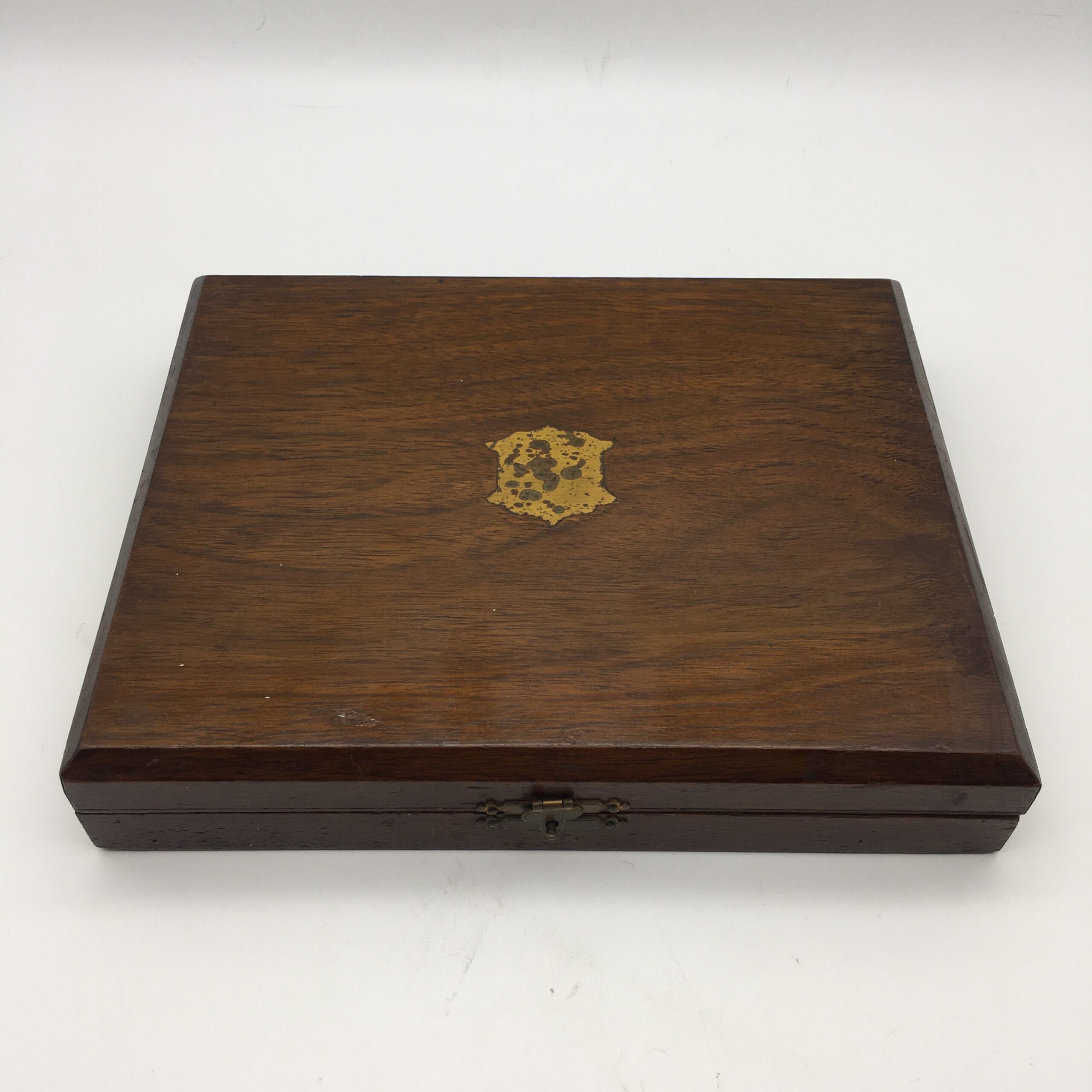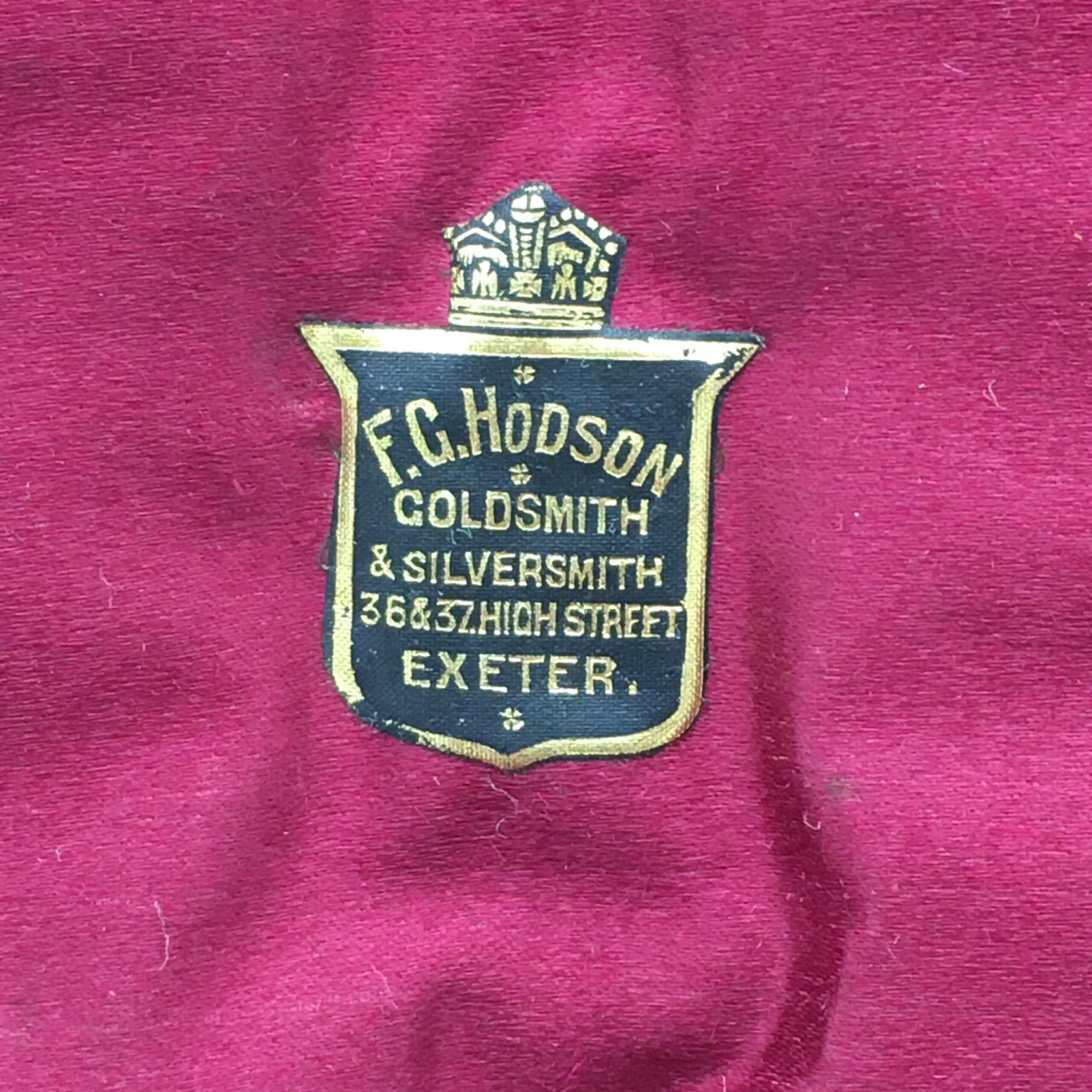 This lovely, great quality, silver-plate and mother of pearl fruit or dessert set from the late 1800’s, early 1900’s, consists of six knives and six forks and are presented in their original fitted solid oak case lined with maroon satin and velvet. The knives and forks all have lovely decorative ferules, with the knife blades being beautifully engraved and carrying the makers stamp ‘A & DS with an hour-glass’, for silversmiths ‘Charles James Allen & Sidney Darwin’ from Sheffield, England. The lid of the case still has the original retailers label for ‘F.C. HODSON Goldsmith & Silversmith, EXETER’ and both the oak case and cutlery are in great condition The case measures 24cm x 19cm x 4,5cm, with cutlery weighs 985g.