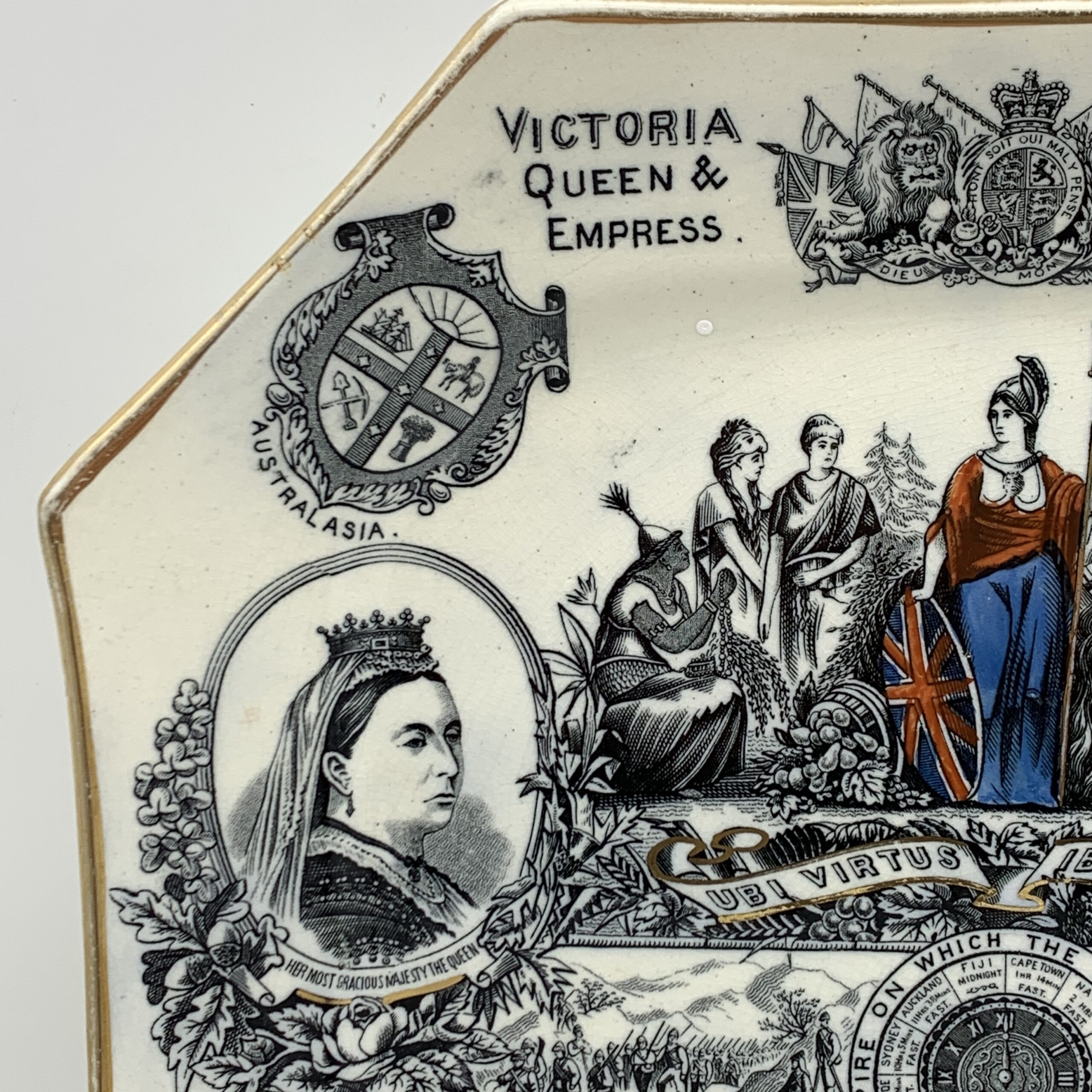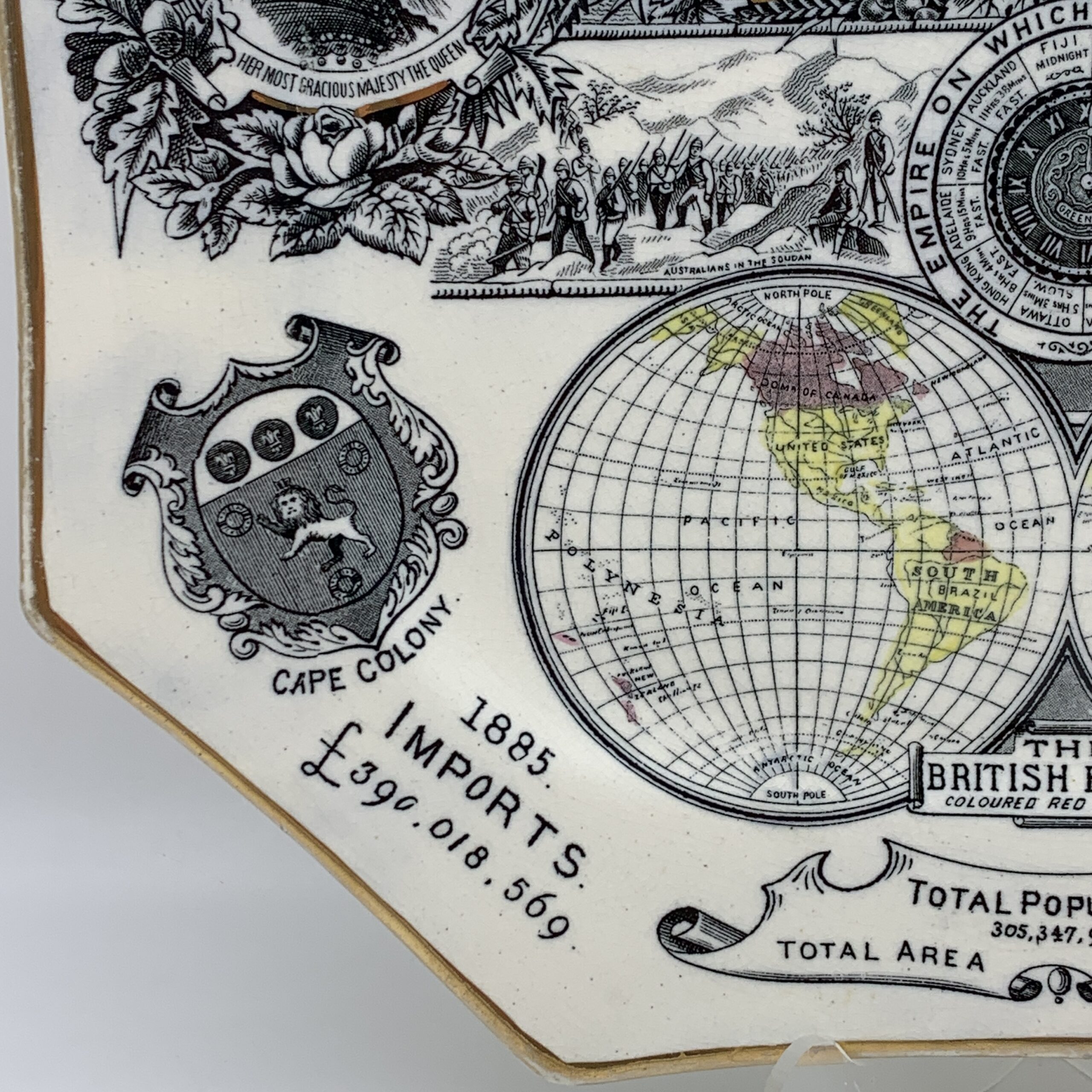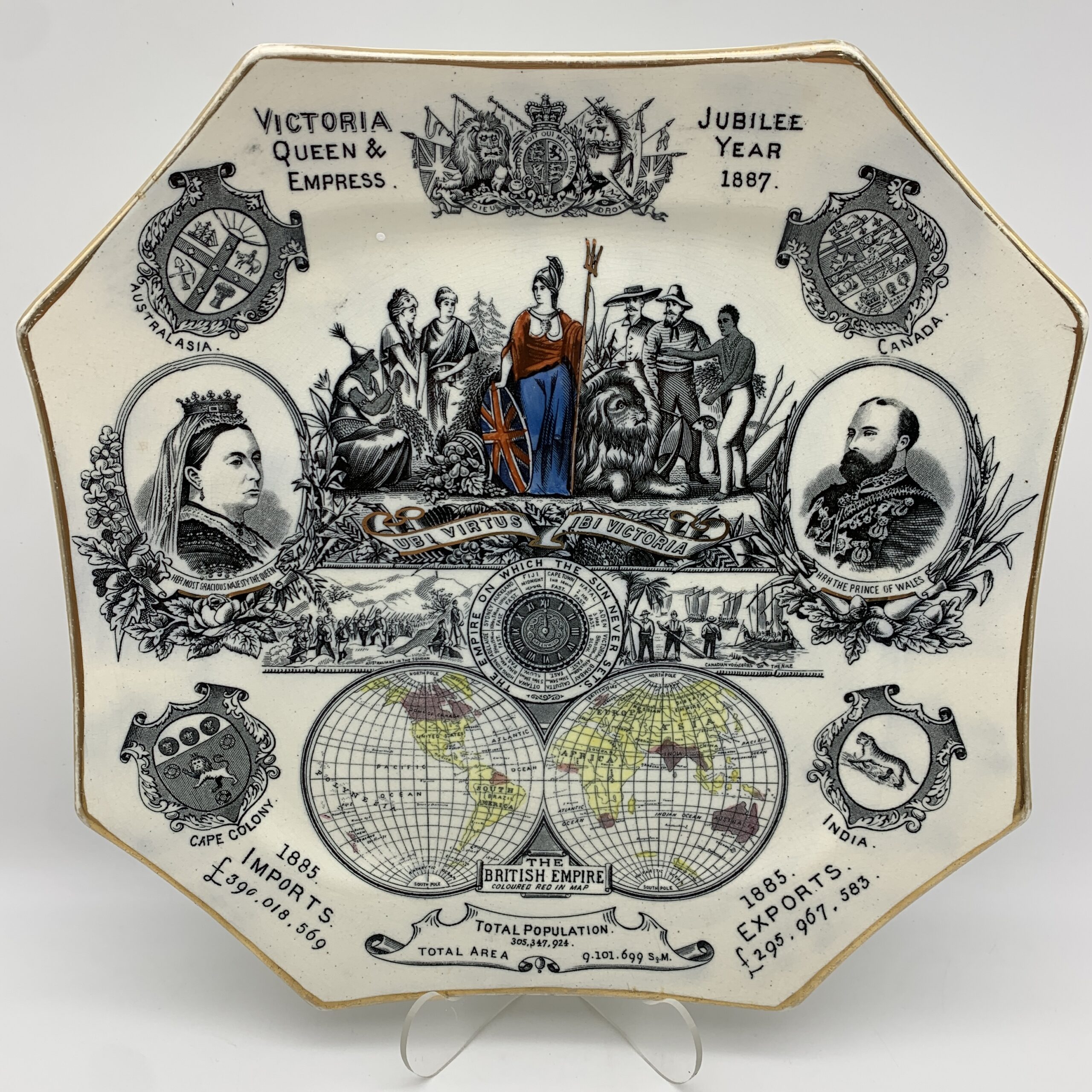 This impressive, antique, commemorative plate celebrating Queen Victoria’s golden Jubilee in 1887 is in excellent condition with wonderful detail. Octagonal in shape, it depicts portraits of Queen Victoria and the Prince of Wales with crests of Australia, Canada, Cape Colony and India showing the extent of the British Empire at the time, listing the value of imports and exports, its population figures and a maps of the world highlighting their empire, as well as a central compass motif with the motto ‘THE EMPIRE ON WHICH THE SUN NEVER SETS’. The black transfer is painted, in places, in blue, red and yellow colours with gold leaf highlights and a gold leaved edged border. The plate measures 24,5cm x 24,5cm and is stamped ‘AS ACCEPTED BY HER MAJESTY’ on the back along with the Registered Design number ‘RdNo.63164’.