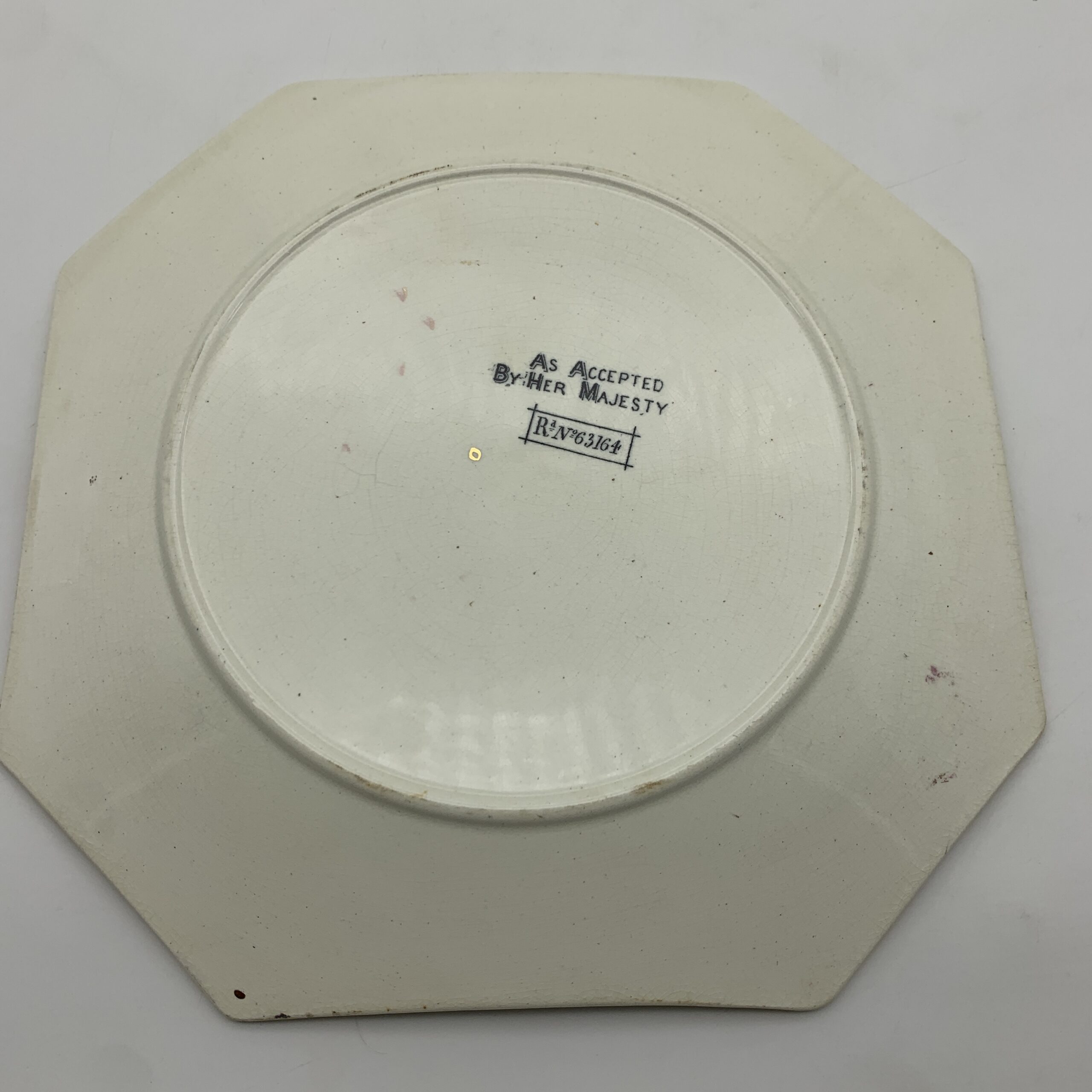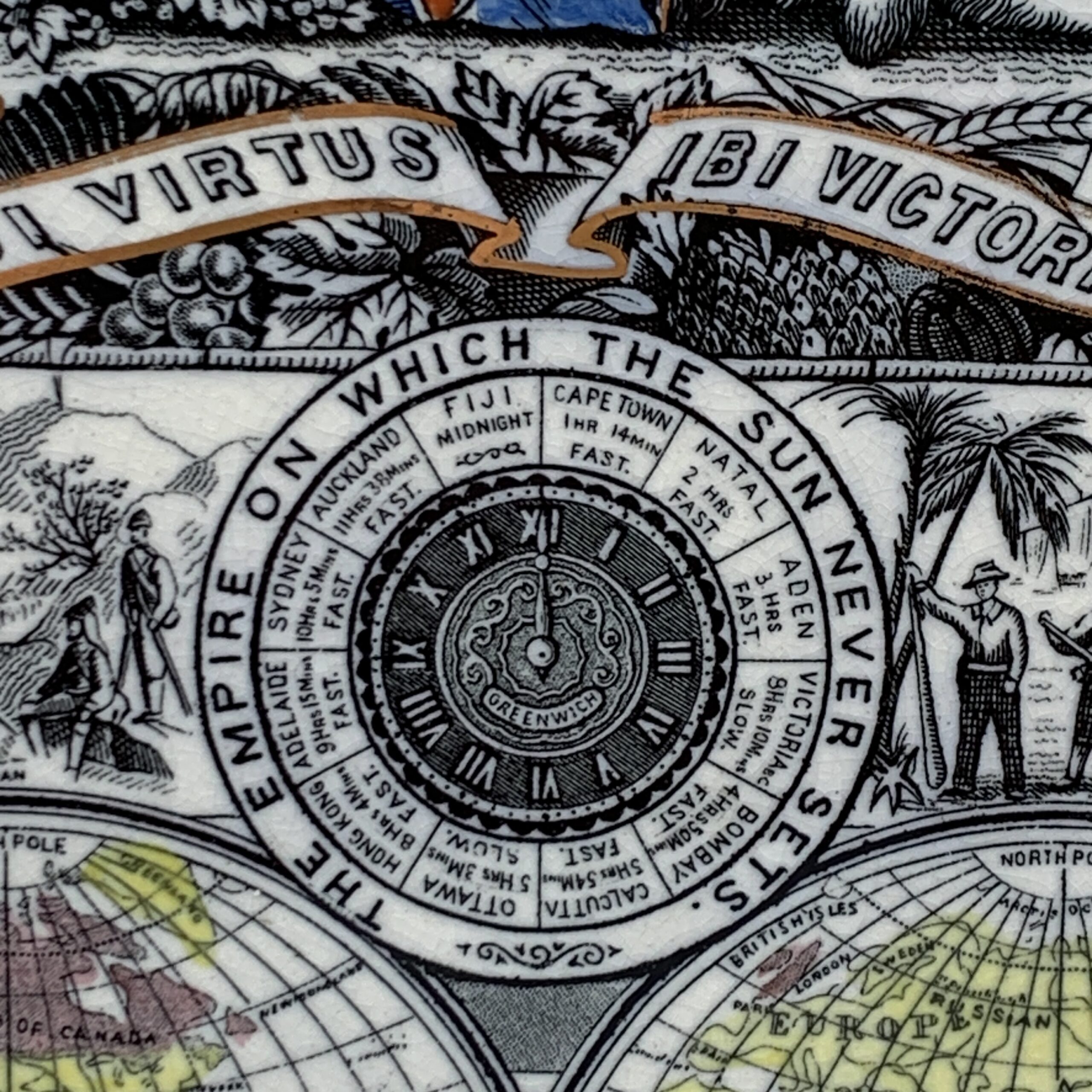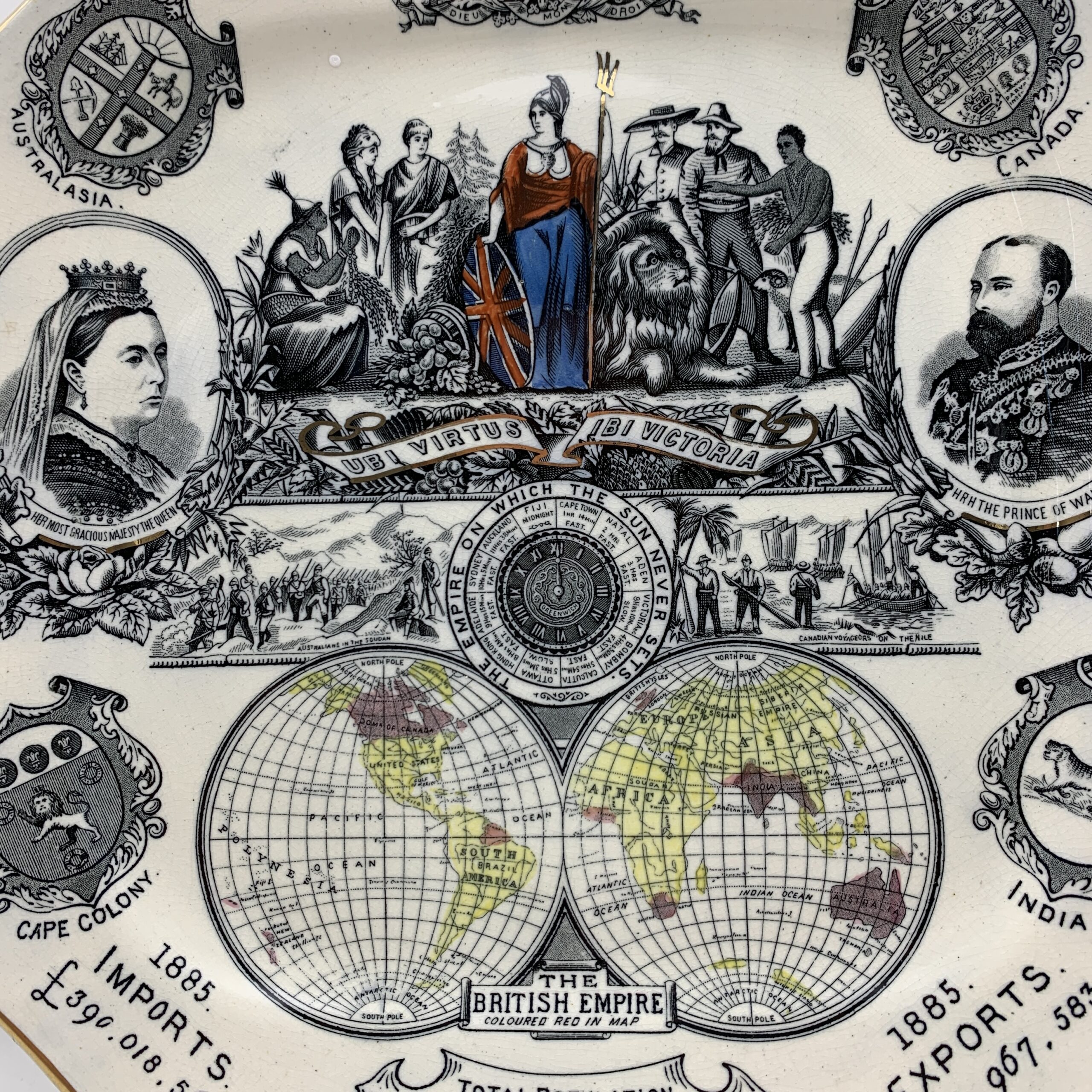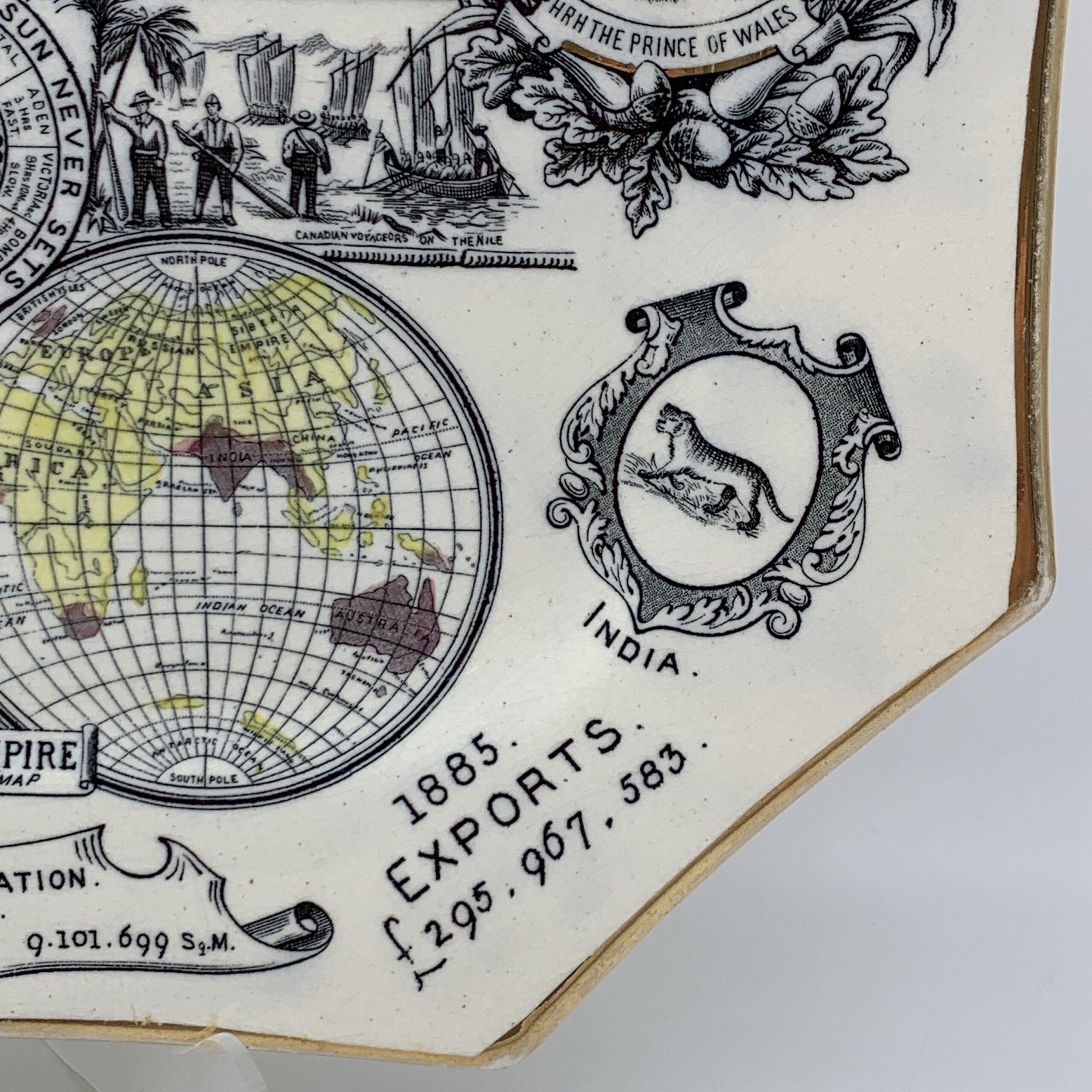 This impressive, antique, commemorative plate celebrating Queen Victoria’s golden Jubilee in 1887 is in excellent condition with wonderful detail. Octagonal in shape, it depicts portraits of Queen Victoria and the Prince of Wales with crests of Australia, Canada, Cape Colony and India showing the extent of the British Empire at the time, listing the value of imports and exports, its population figures and a maps of the world highlighting their empire, as well as a central compass motif with the motto ‘THE EMPIRE ON WHICH THE SUN NEVER SETS’. The black transfer is painted, in places, in blue, red and yellow colours with gold leaf highlights and a gold leaved edged border. The plate measures 24,5cm x 24,5cm and is stamped ‘AS ACCEPTED BY HER MAJESTY’ on the back along with the Registered Design number ‘RdNo.63164’.