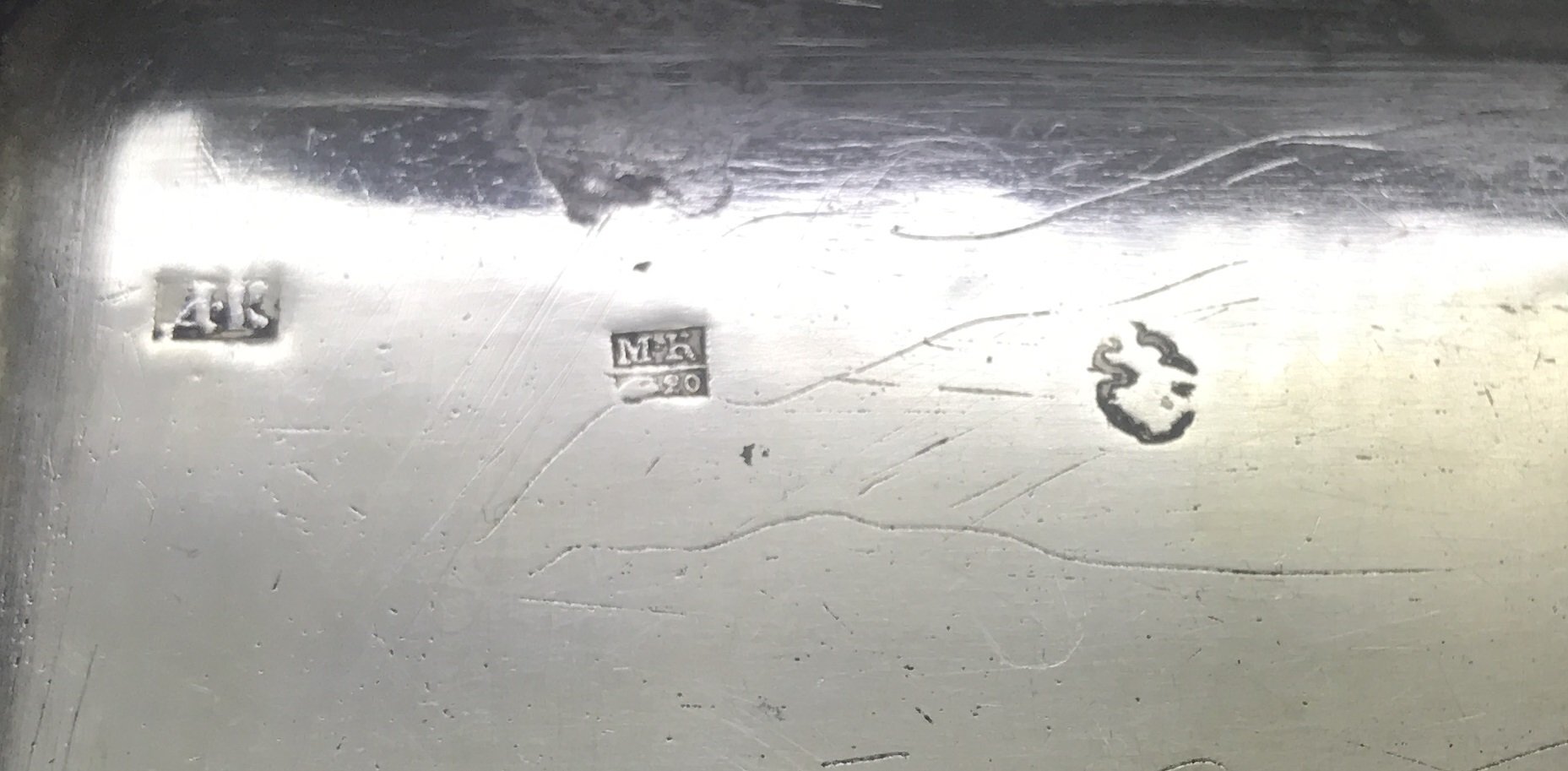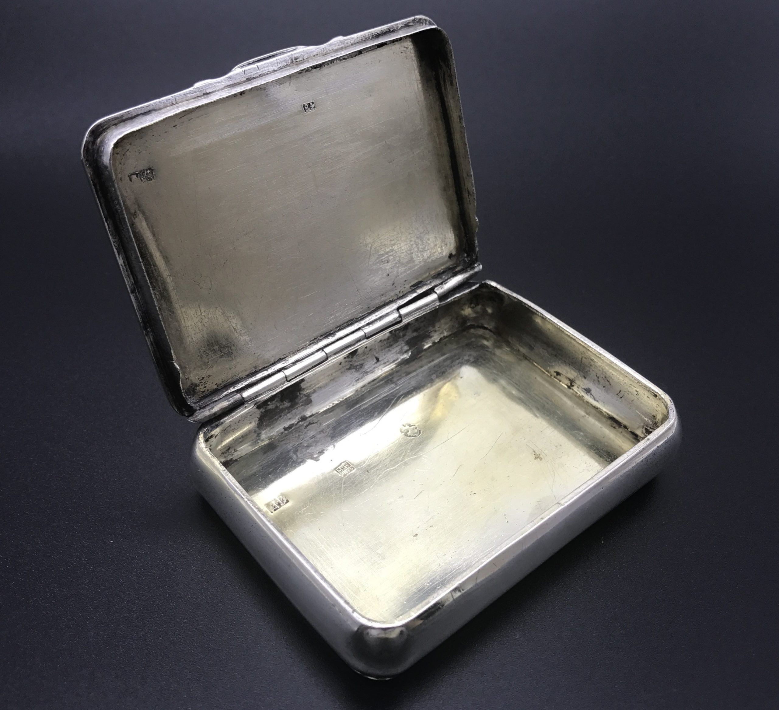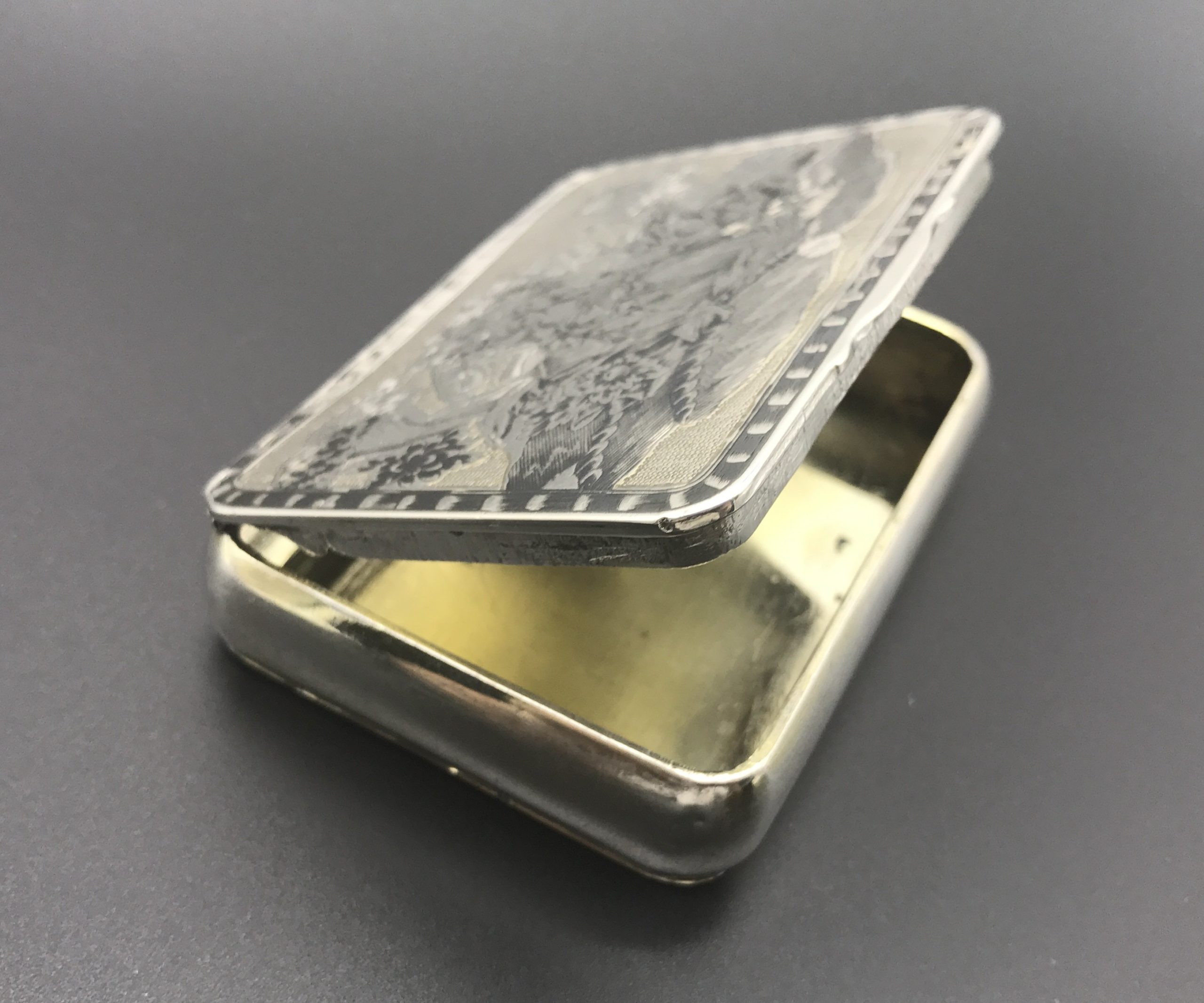 An exceptional, fine and impressive antique Russian silver niello box. In a rectangular form with shaped sides, rounded corners and hinged lid. It is stamped ‘MK 1820’ – Mikhail Mikhailovich Karpinsky (Moscow 1800-1824). There are 4 other stamps – AR and 84 and 2 others I can’t identify. The box is in good condition with no dents or repairs but has some niello missing in places on both sides. The interior shows signs of original gilding. It measures 8.6cm in length, 6.5cm in width, 1.7mm in depth and weighs 98.8g.