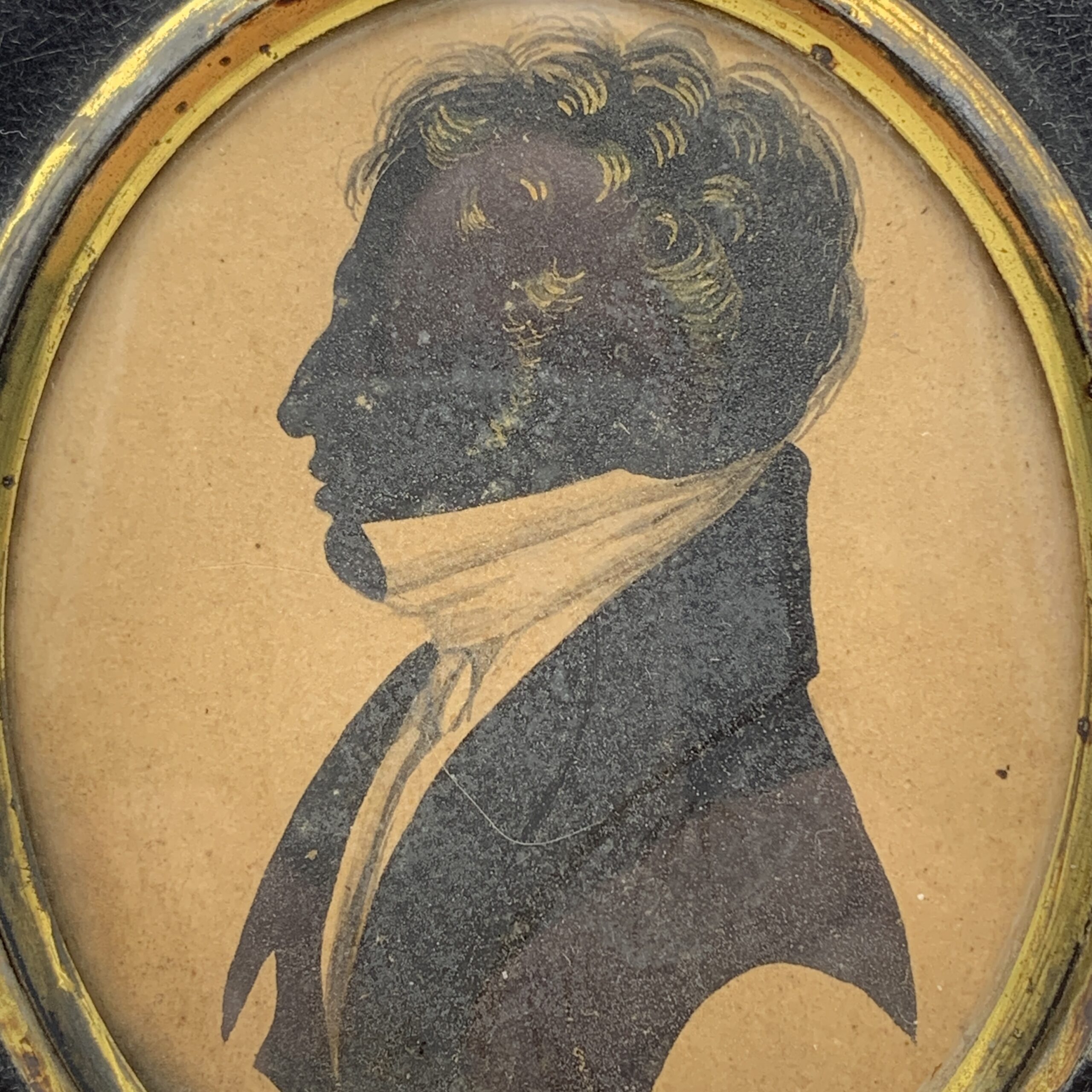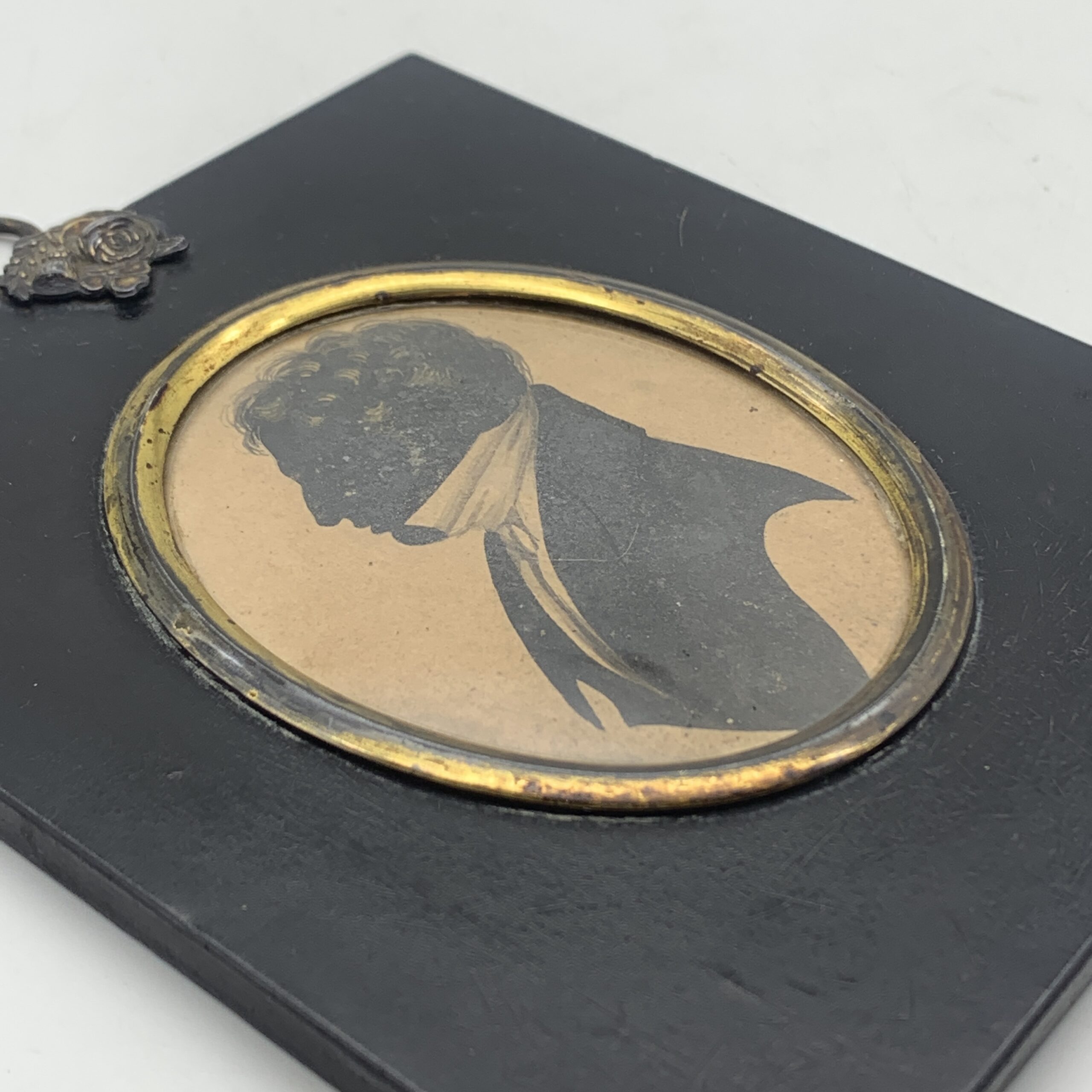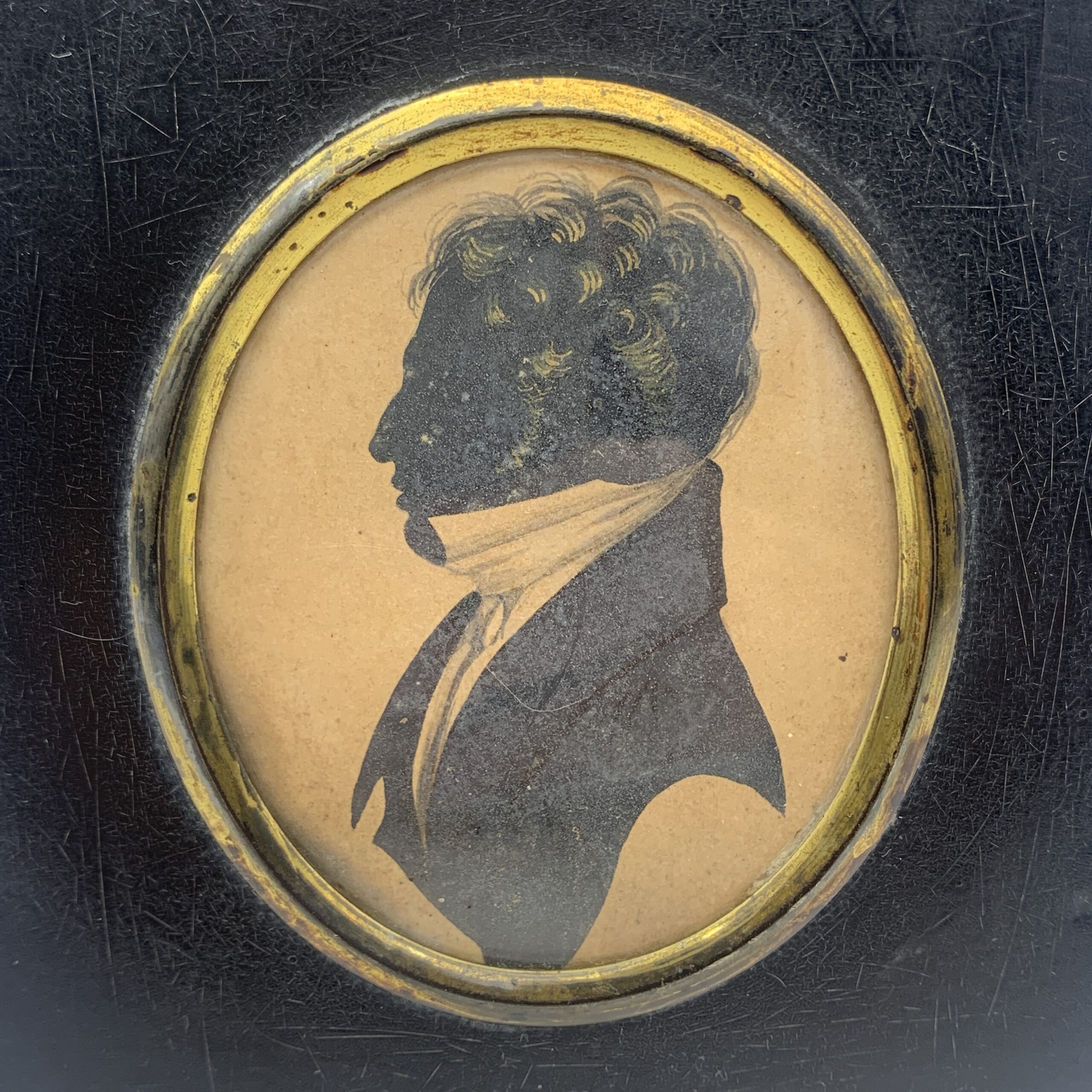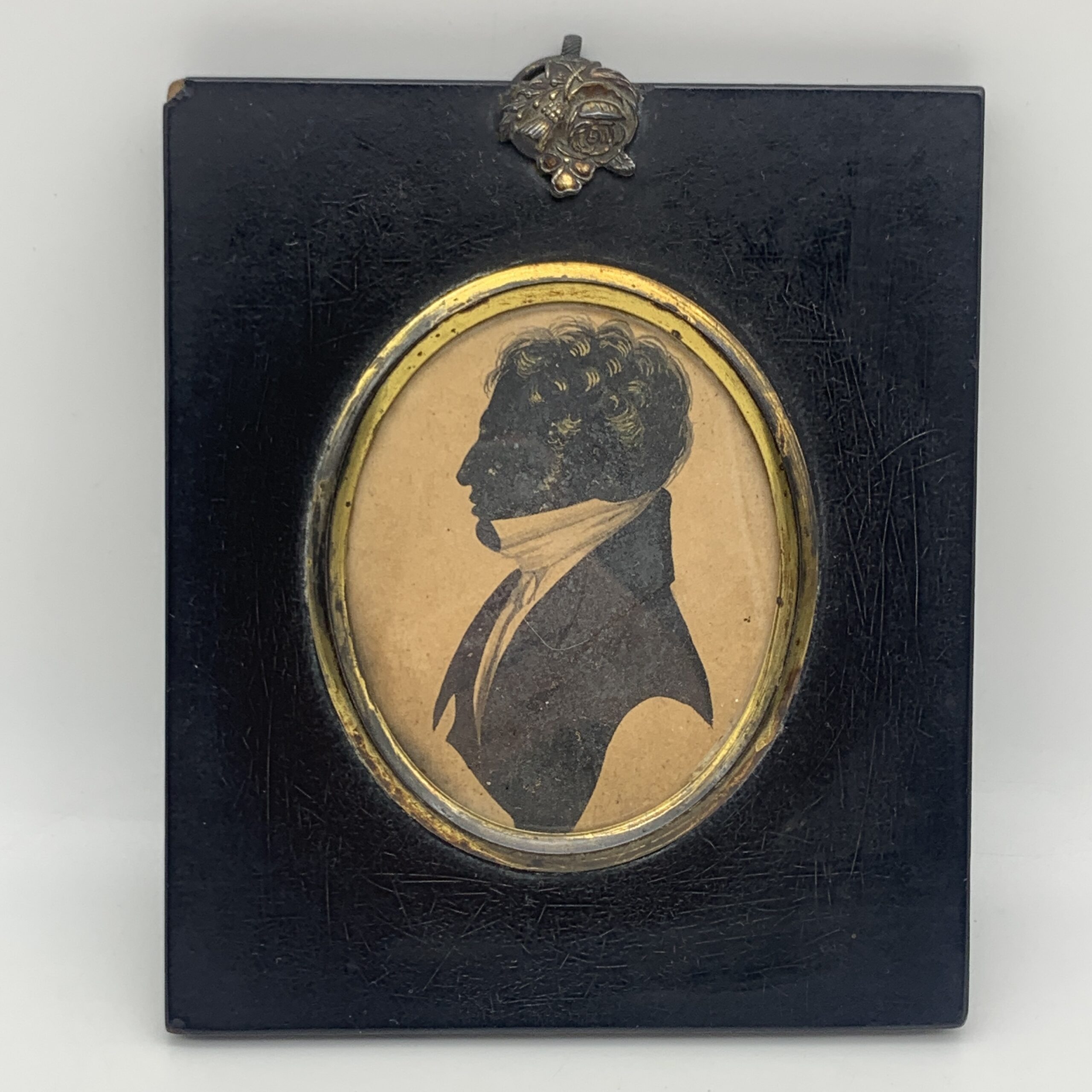 This lovely, antique, framed silhouette from the early 1800’s, features a side profile bust of a young man wearing a suit with a white shirt and high collar. It’s housed behind domed glass in an oval gilt bezel in its original black wooden frame, with a brass floral fixture with a hanging ring. Other than a tiny chip to the frame and some gilt loss to the bezel, it’s in great condition. The framed silhouette measures 13cm x 10cm.
