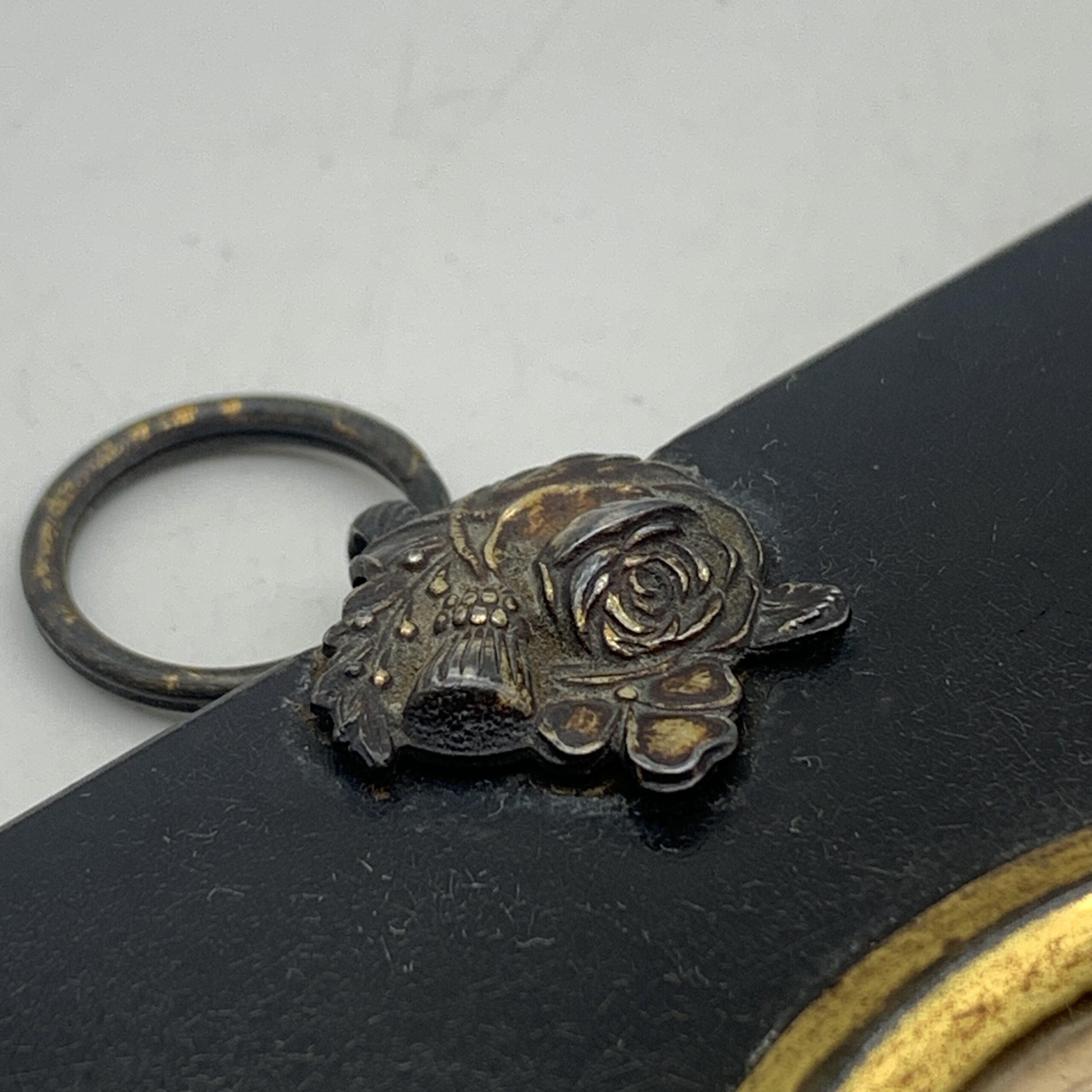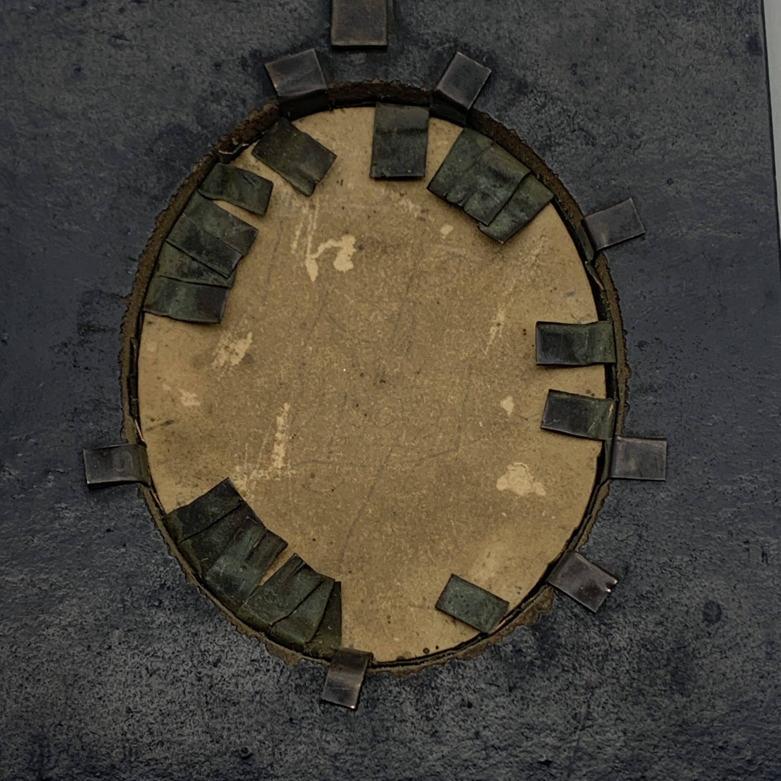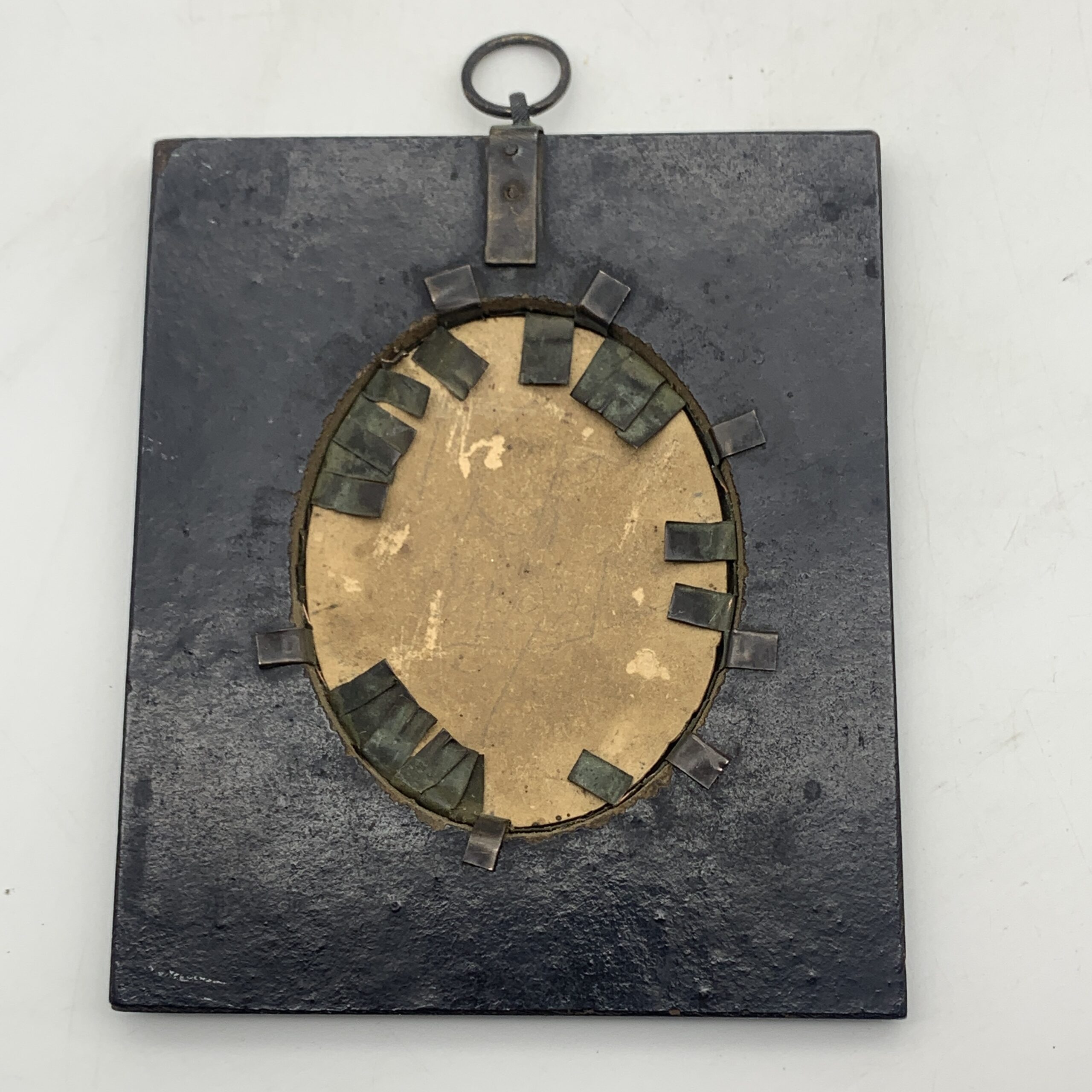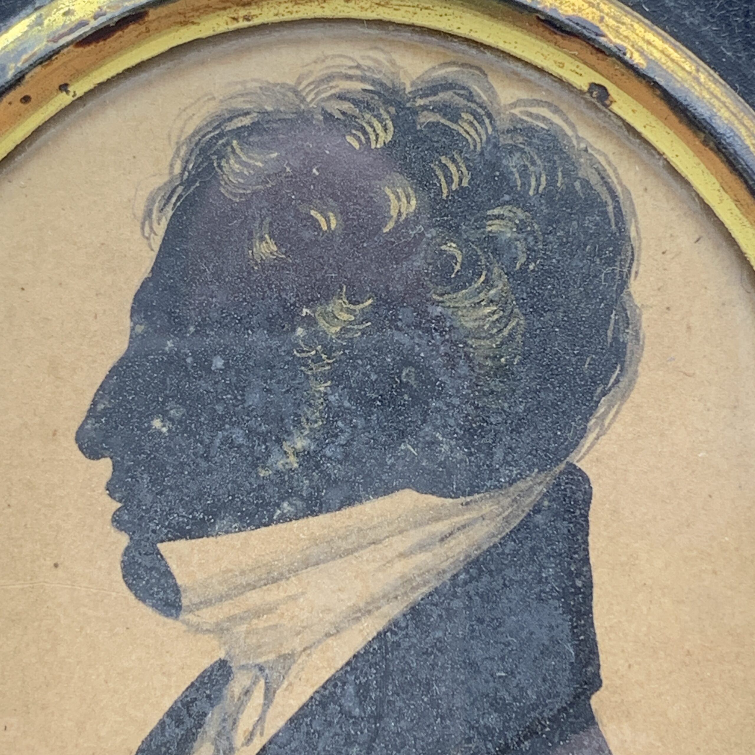 This lovely, antique, framed silhouette from the early 1800’s, features a side profile bust of a young man wearing a suit with a white shirt and high collar. It’s housed behind domed glass in an oval gilt bezel in its original black wooden frame, with a brass floral fixture with a hanging ring. Other than a tiny chip to the frame and some gilt loss to the bezel, it’s in great condition. The framed silhouette measures 13cm x 10cm.