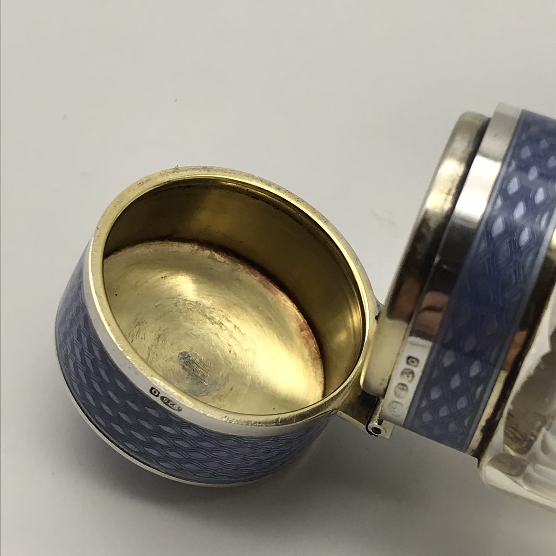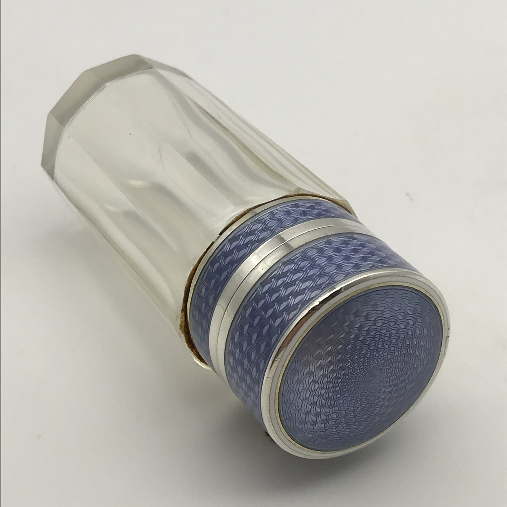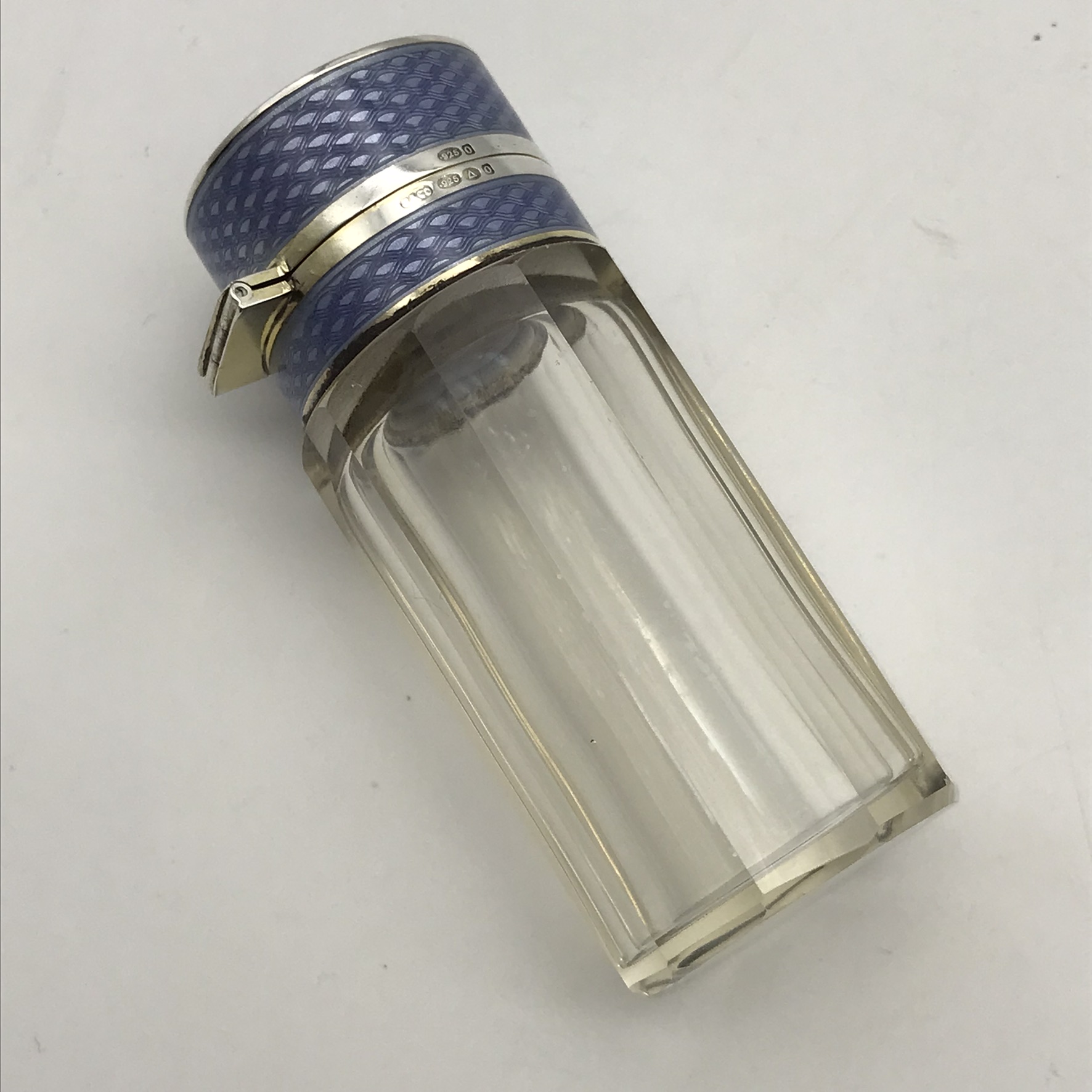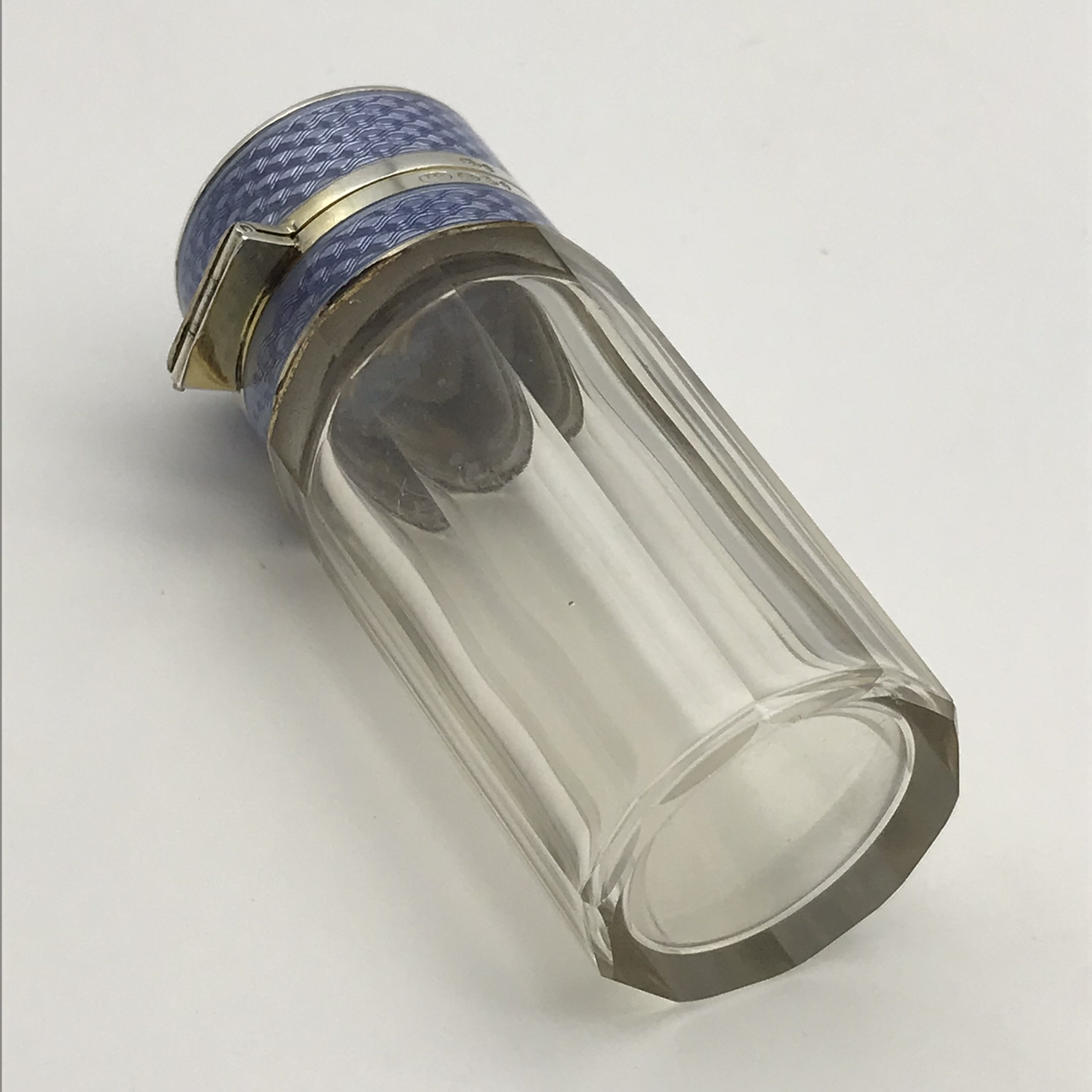 This attractive, super quality, antique, solid silver topped scent bottle has a wonderful pale blue guilloche enamel hinged lid and collar and has its original snug fitting, internal stopper. It is hallmarked and stamped with silver import marks for Birmingham 1938, and ‘S & Co’ for importers ‘Steinhart & Co.’, as well as ‘.925’ for sterling silver. This lovely scent bottle is in excellent condition and still retains the original gilding in the lid. It stands 7,7cm high, with a base diameter of 3cm and weighs 87g.