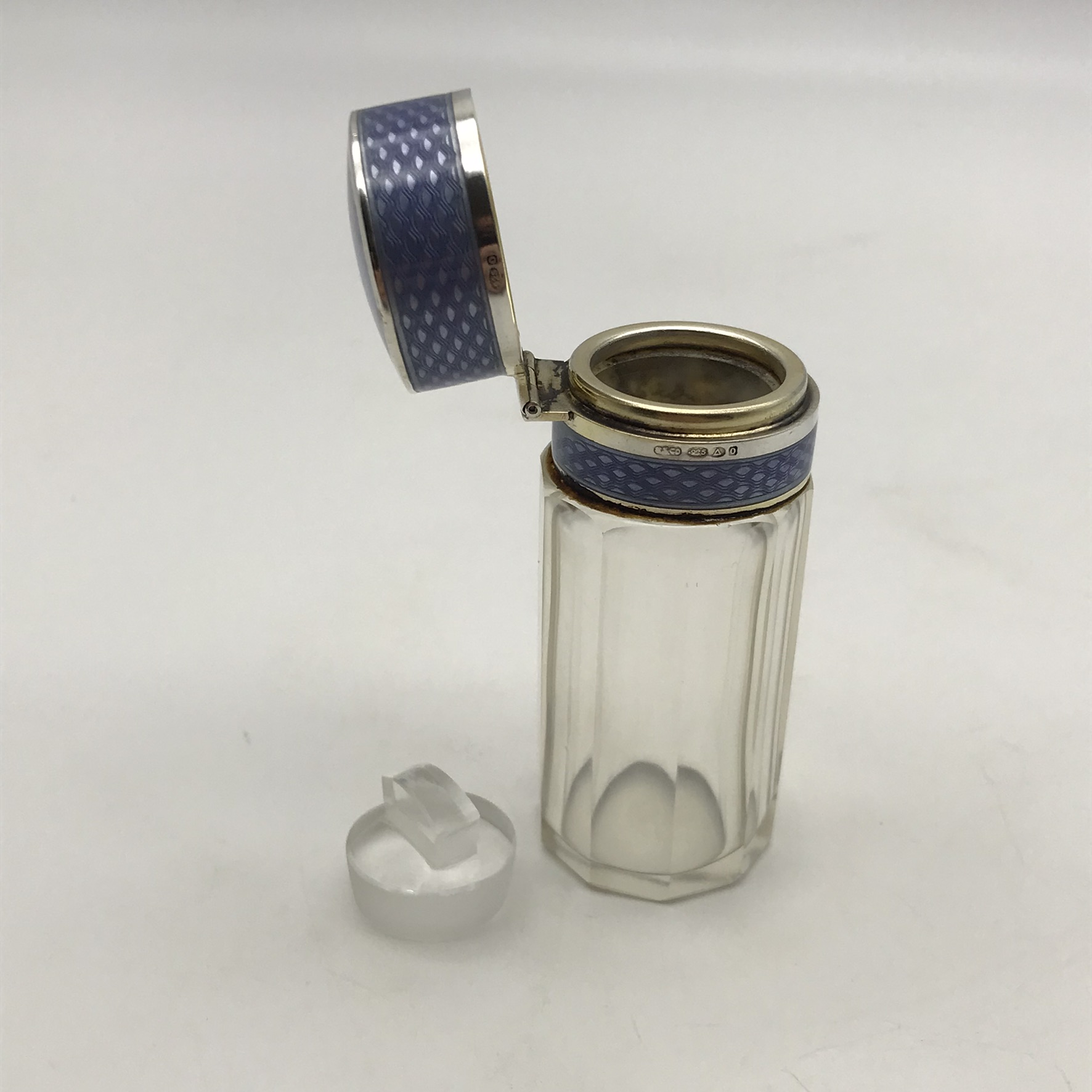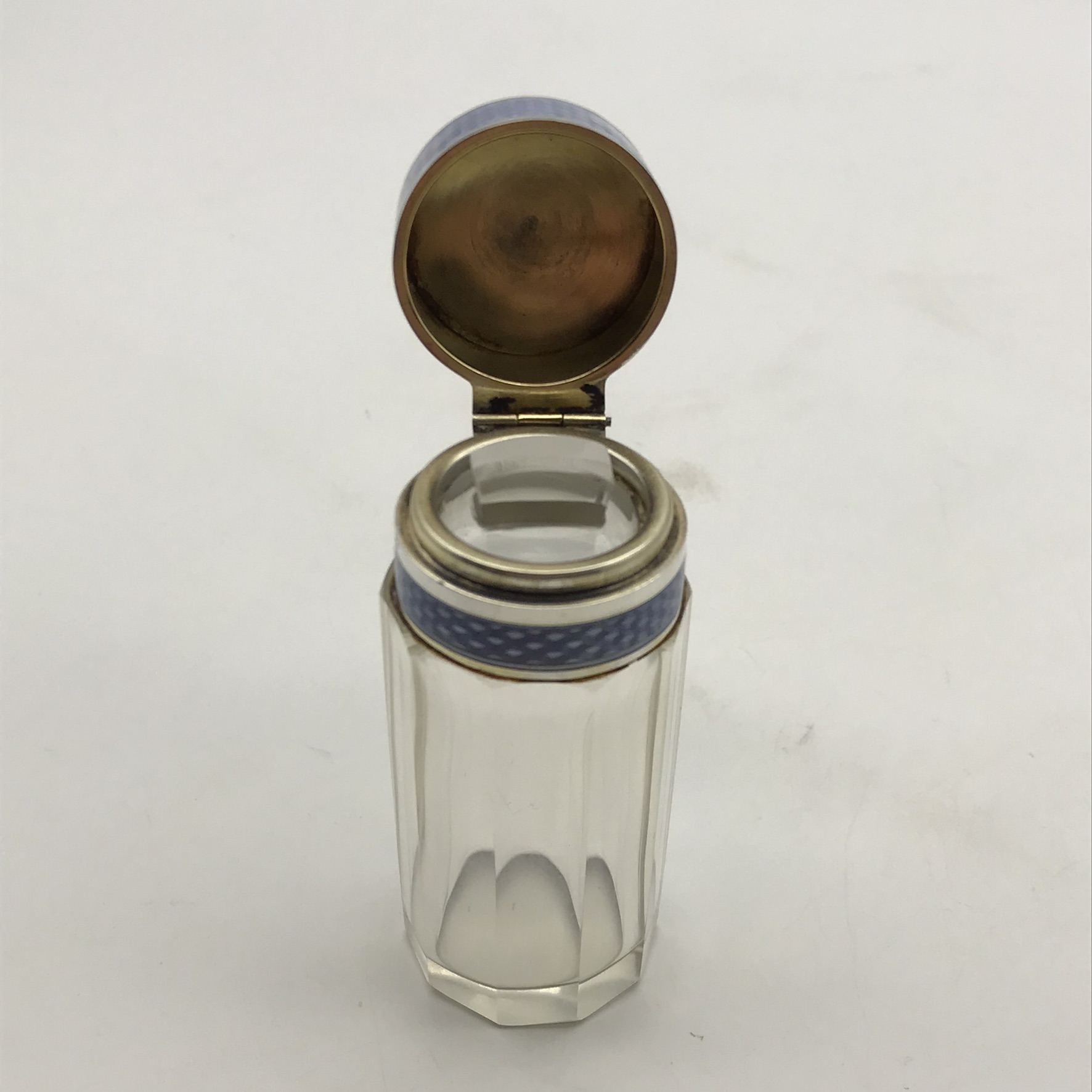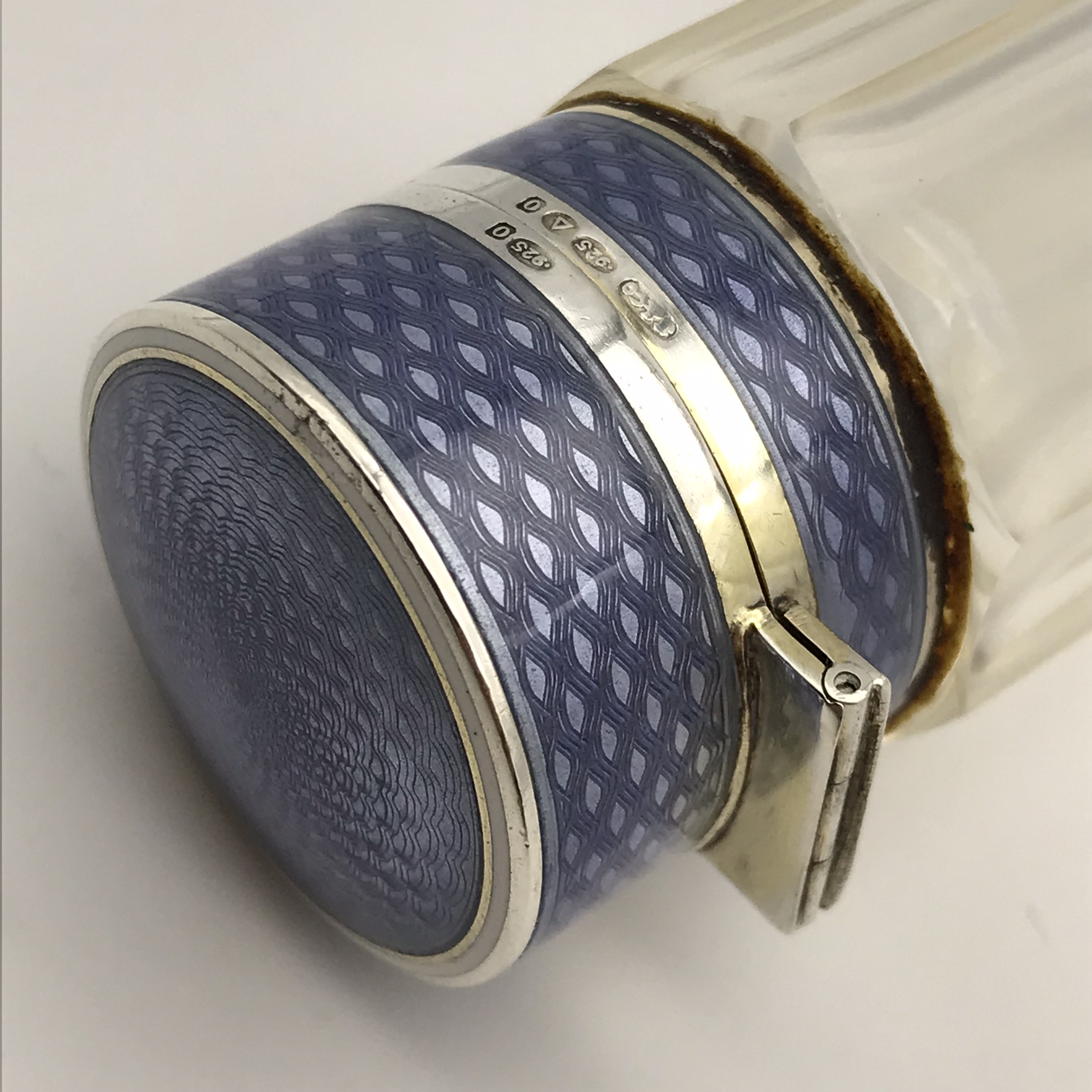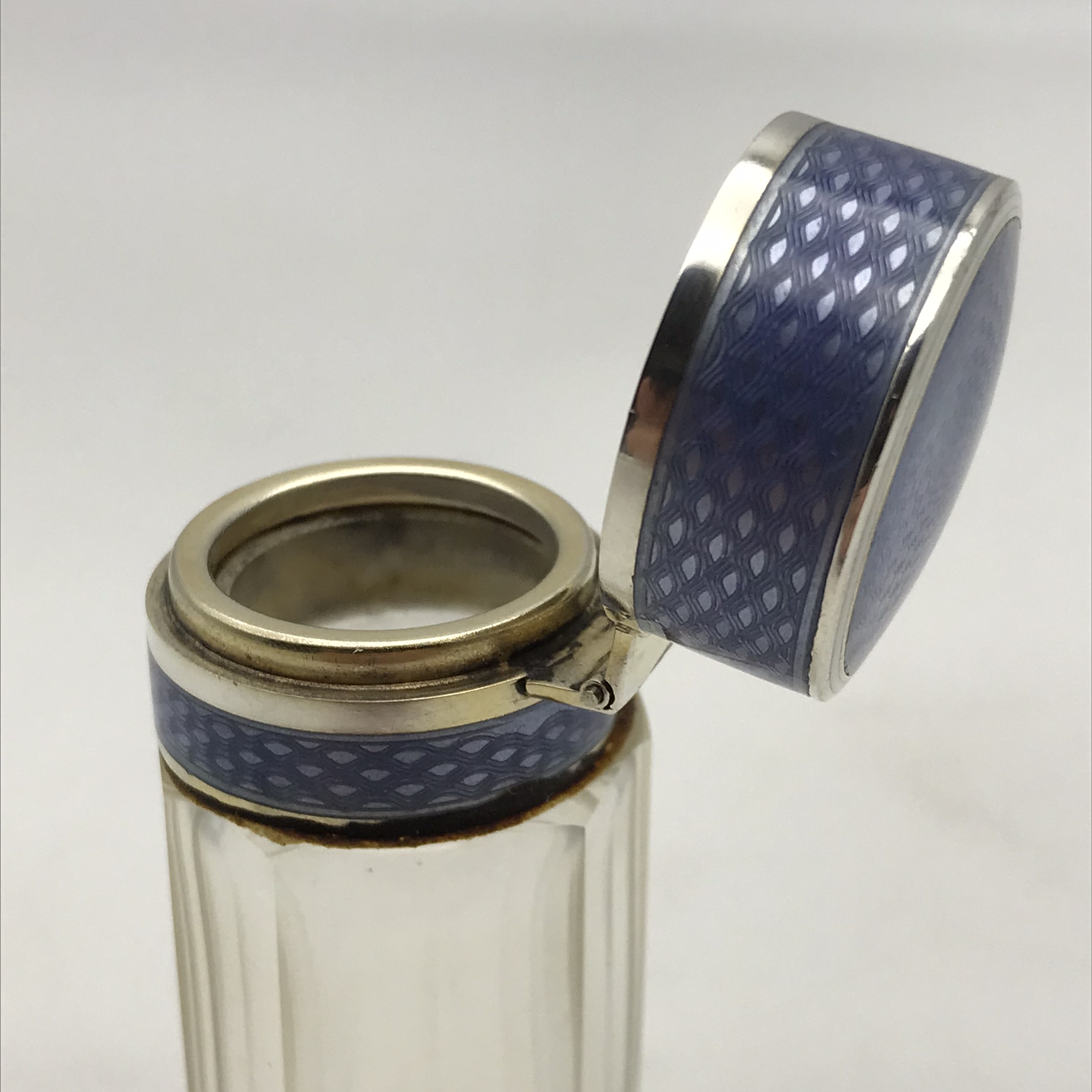 This attractive, super quality, antique, solid silver topped scent bottle has a wonderful pale blue guilloche enamel hinged lid and collar and has its original snug fitting, internal stopper. It is hallmarked and stamped with silver import marks for Birmingham 1938, and ‘S & Co’ for importers ‘Steinhart & Co.’, as well as ‘.925’ for sterling silver. This lovely scent bottle is in excellent condition and still retains the original gilding in the lid. It stands 7,7cm high, with a base diameter of 3cm and weighs 87g.