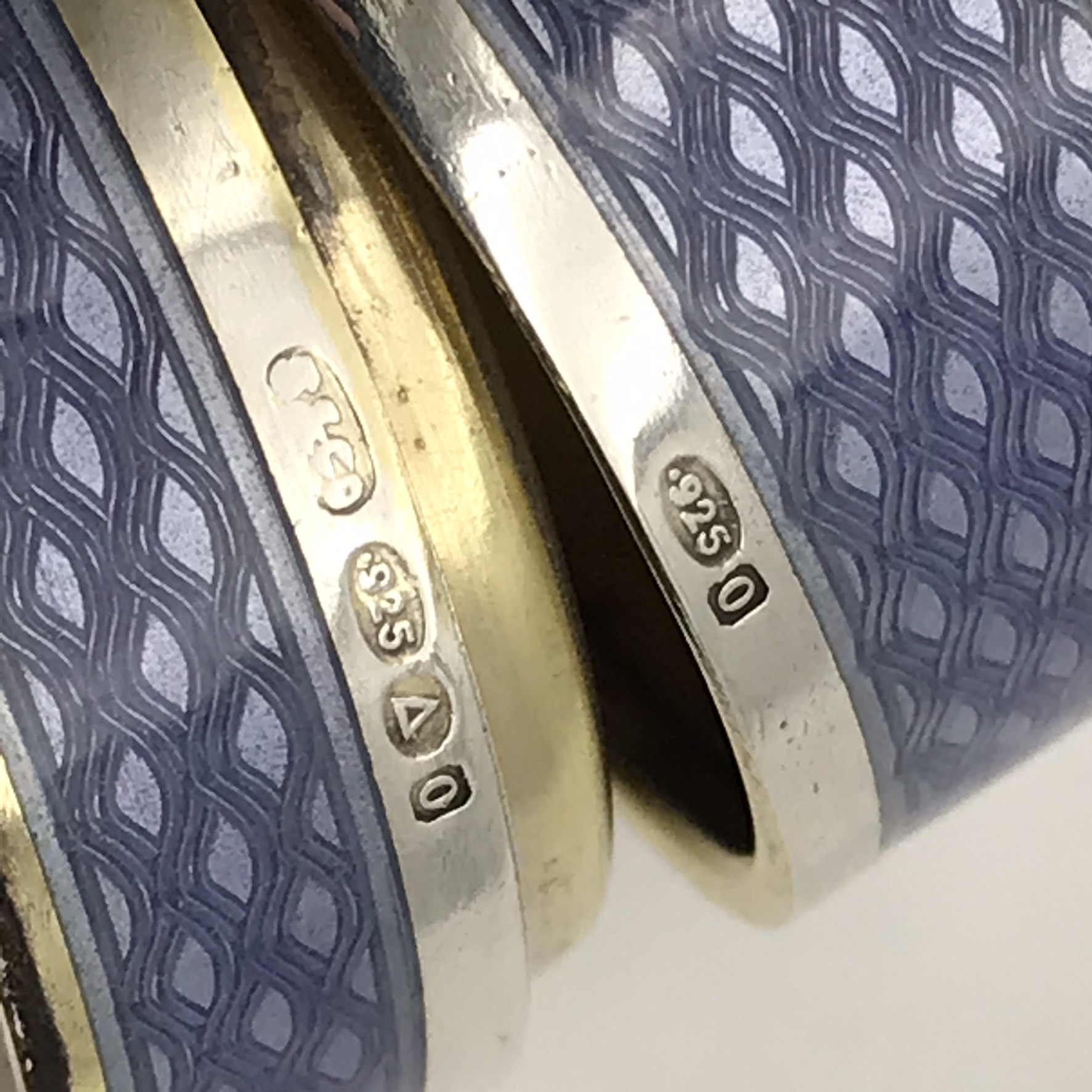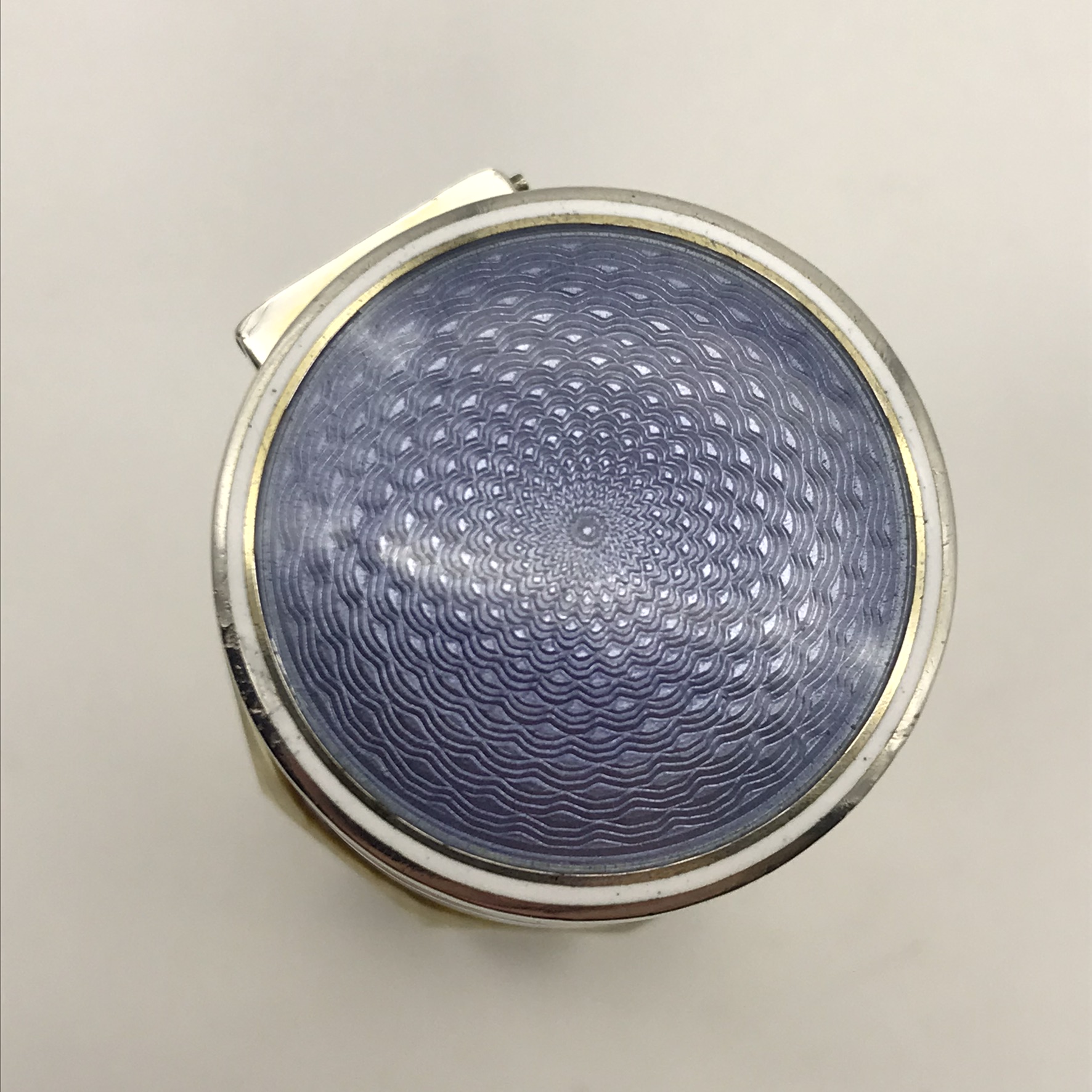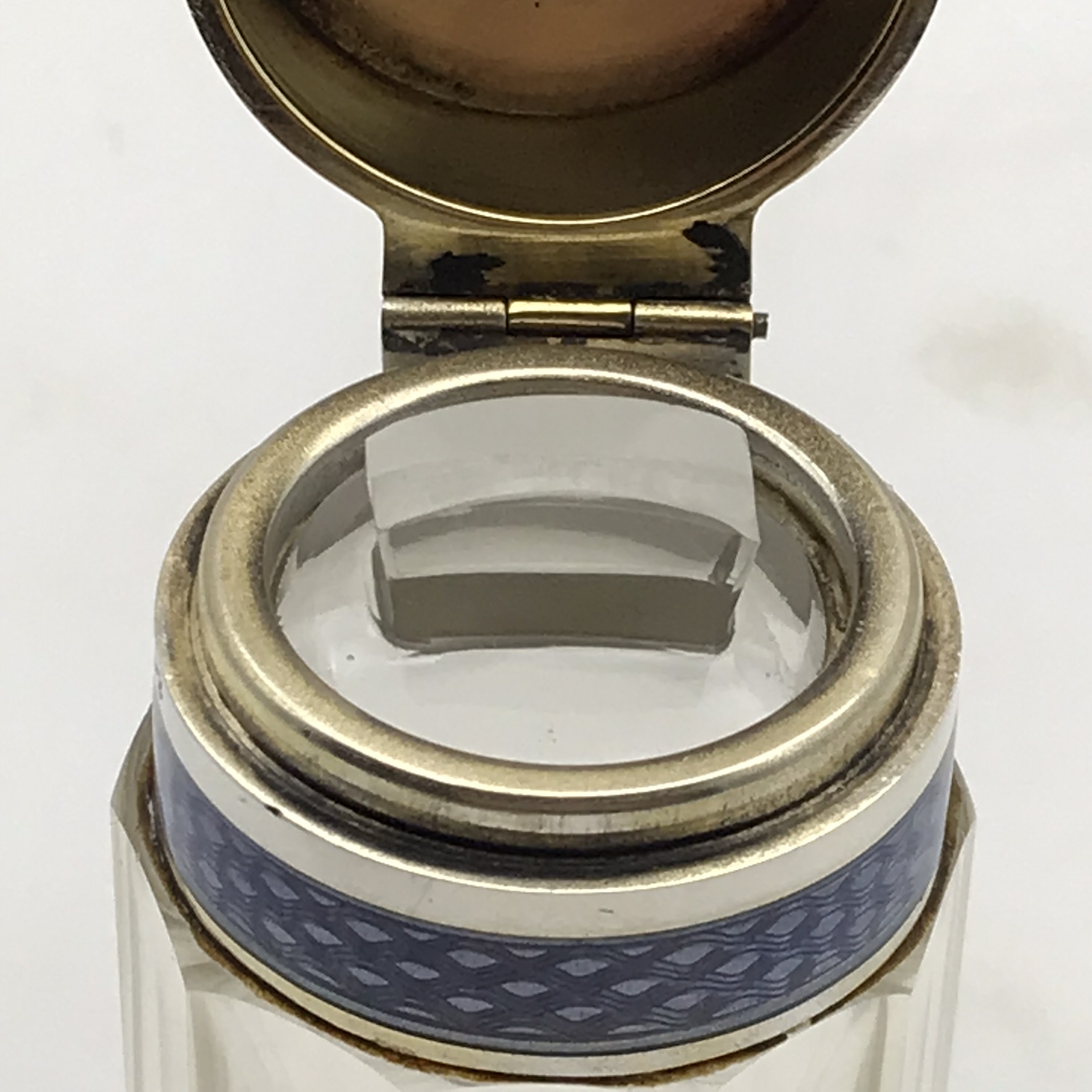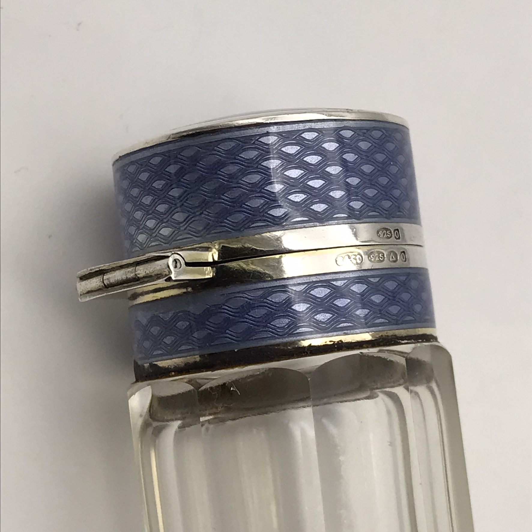 This attractive, super quality, antique, solid silver topped scent bottle has a wonderful pale blue guilloche enamel hinged lid and collar and has its original snug fitting, internal stopper. It is hallmarked and stamped with silver import marks for Birmingham 1938, and ‘S & Co’ for importers ‘Steinhart & Co.’, as well as ‘.925’ for sterling silver. This lovely scent bottle is in excellent condition and still retains the original gilding in the lid. It stands 7,7cm high, with a base diameter of 3cm and weighs 87g.
