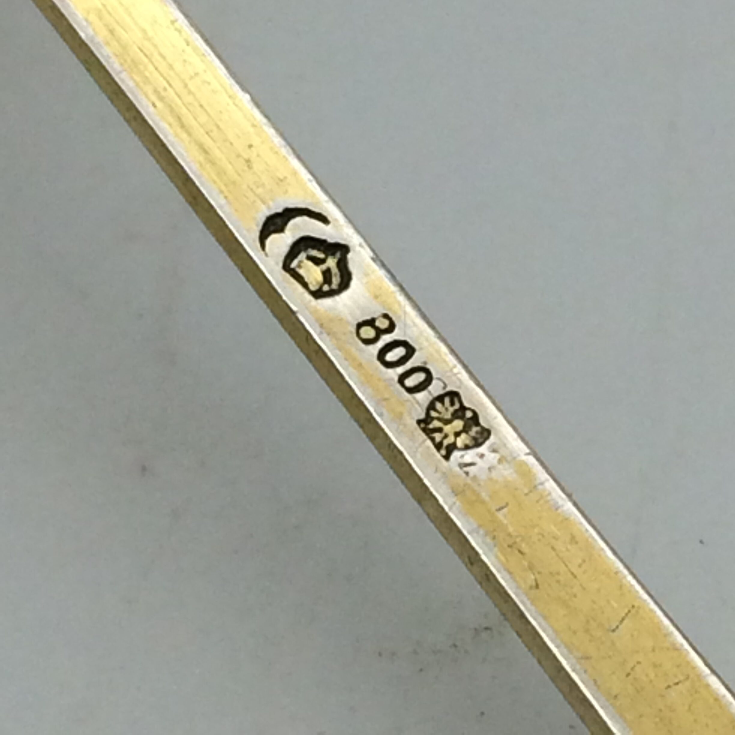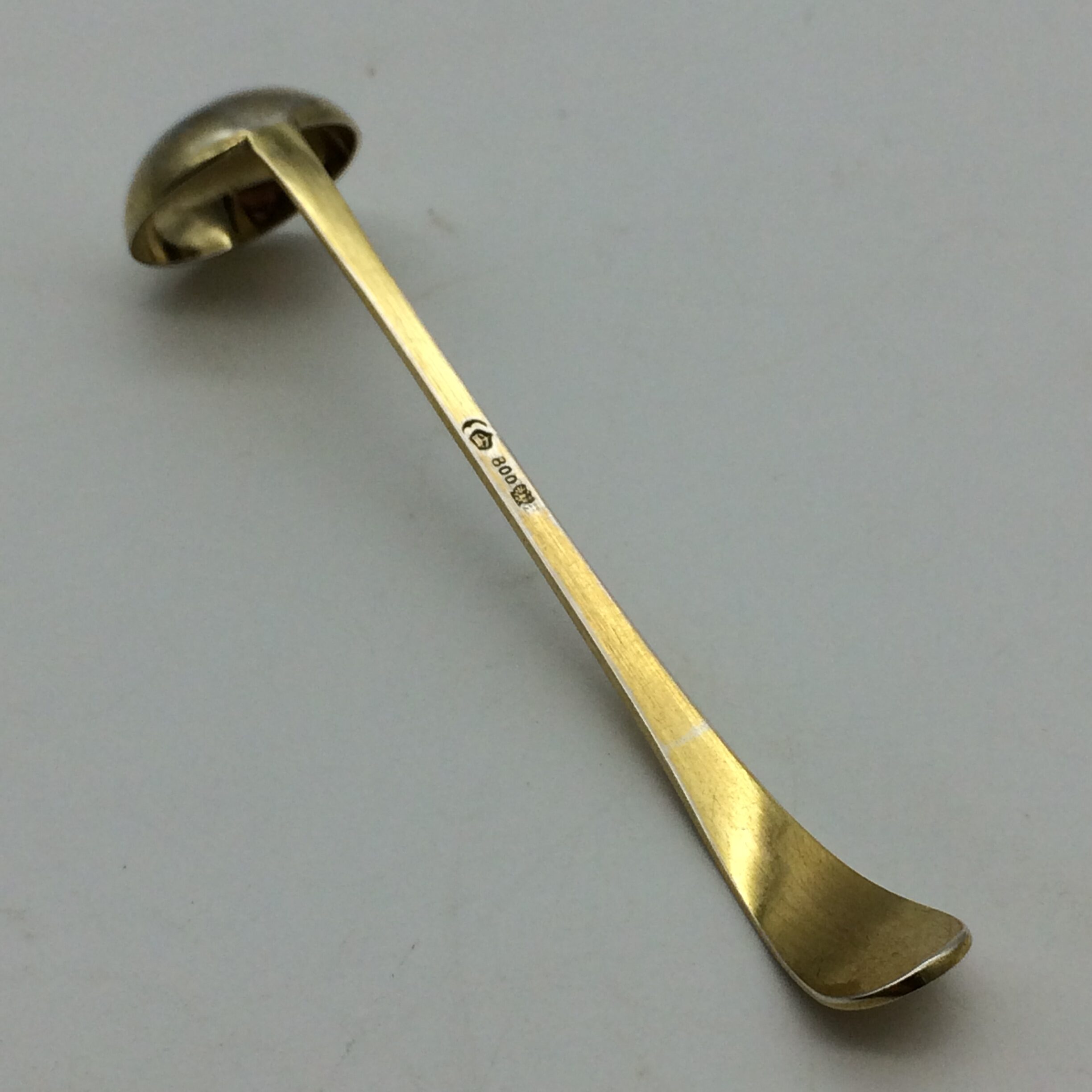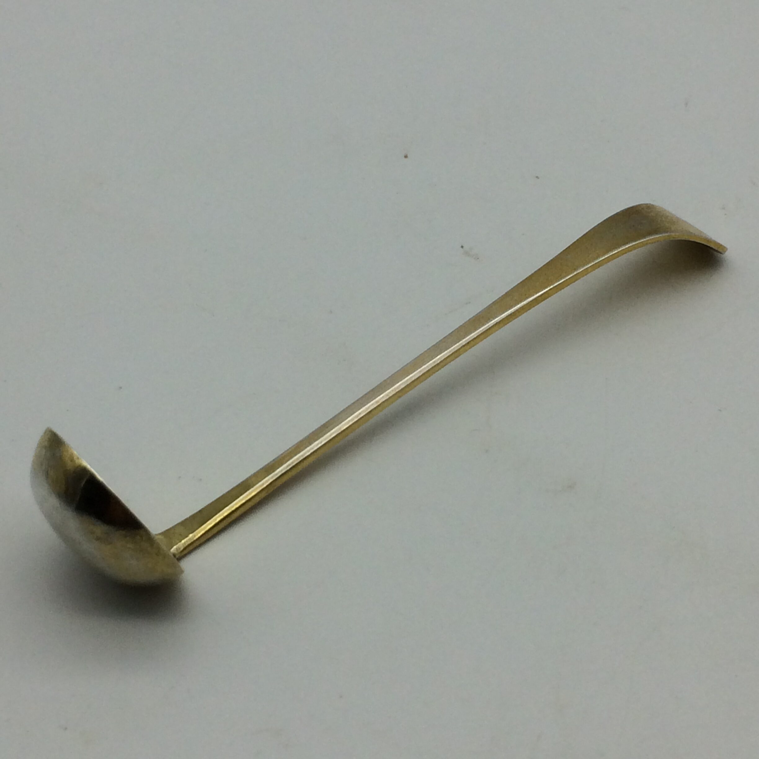This lovely, small, solid silver ladle, from the early 1900’s, is completely gilded and would make an ideal mint sauce spoon, or something similar. The ladle was made in Heilbronne, Germany by silversmiths ‘Bruckmann & Sohne’. It measures 10,8cm in length, a width of 2,3cm and weighs 11,2g.