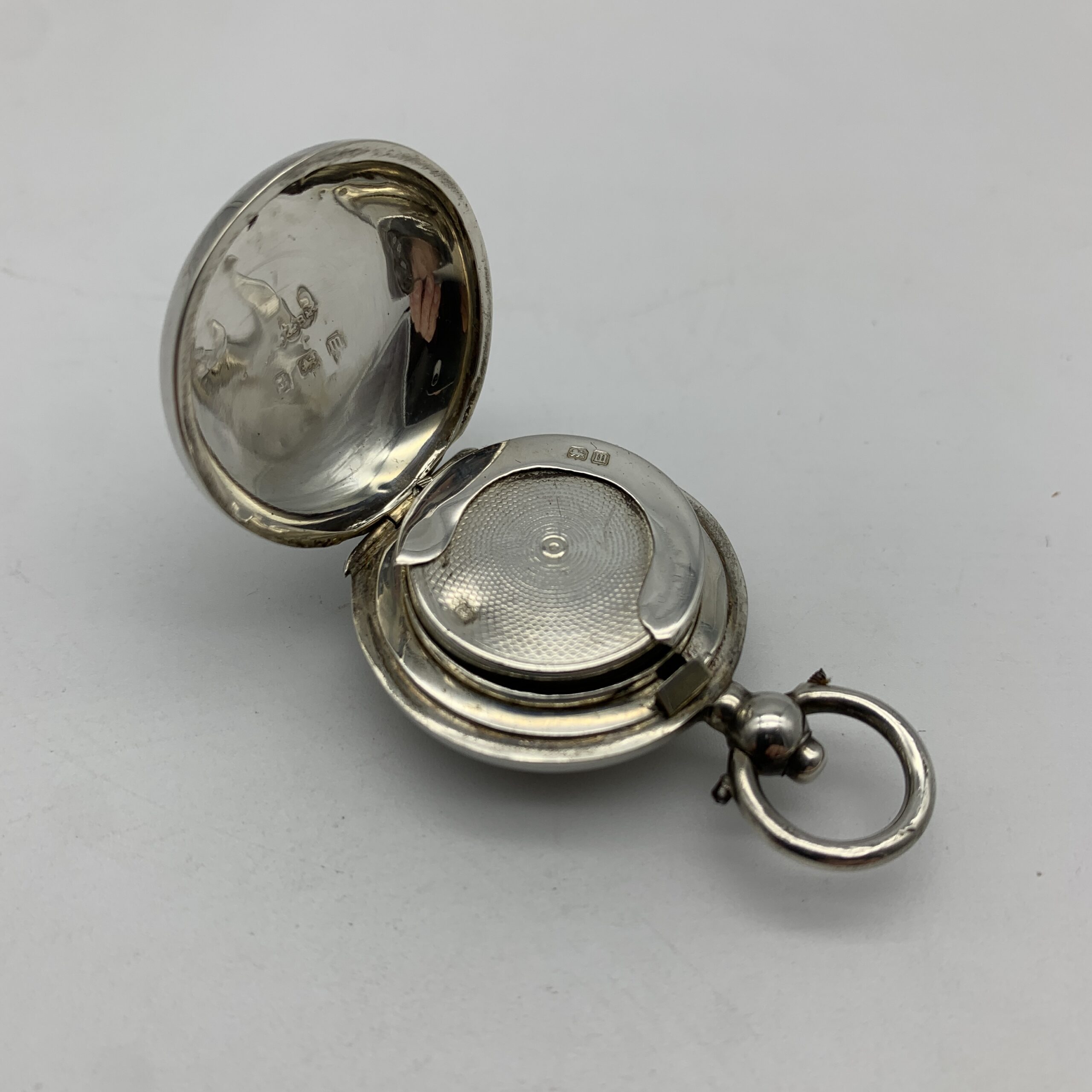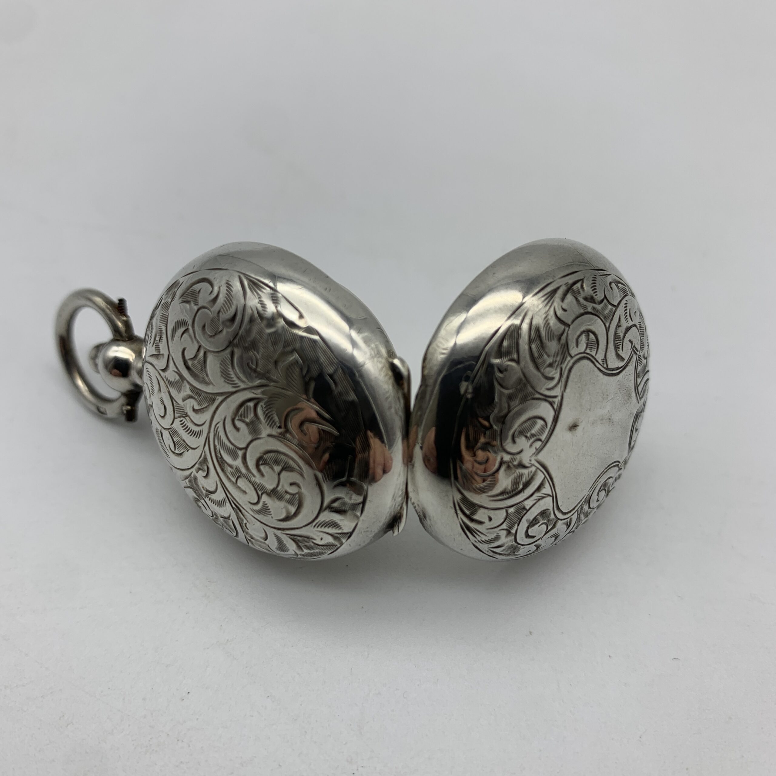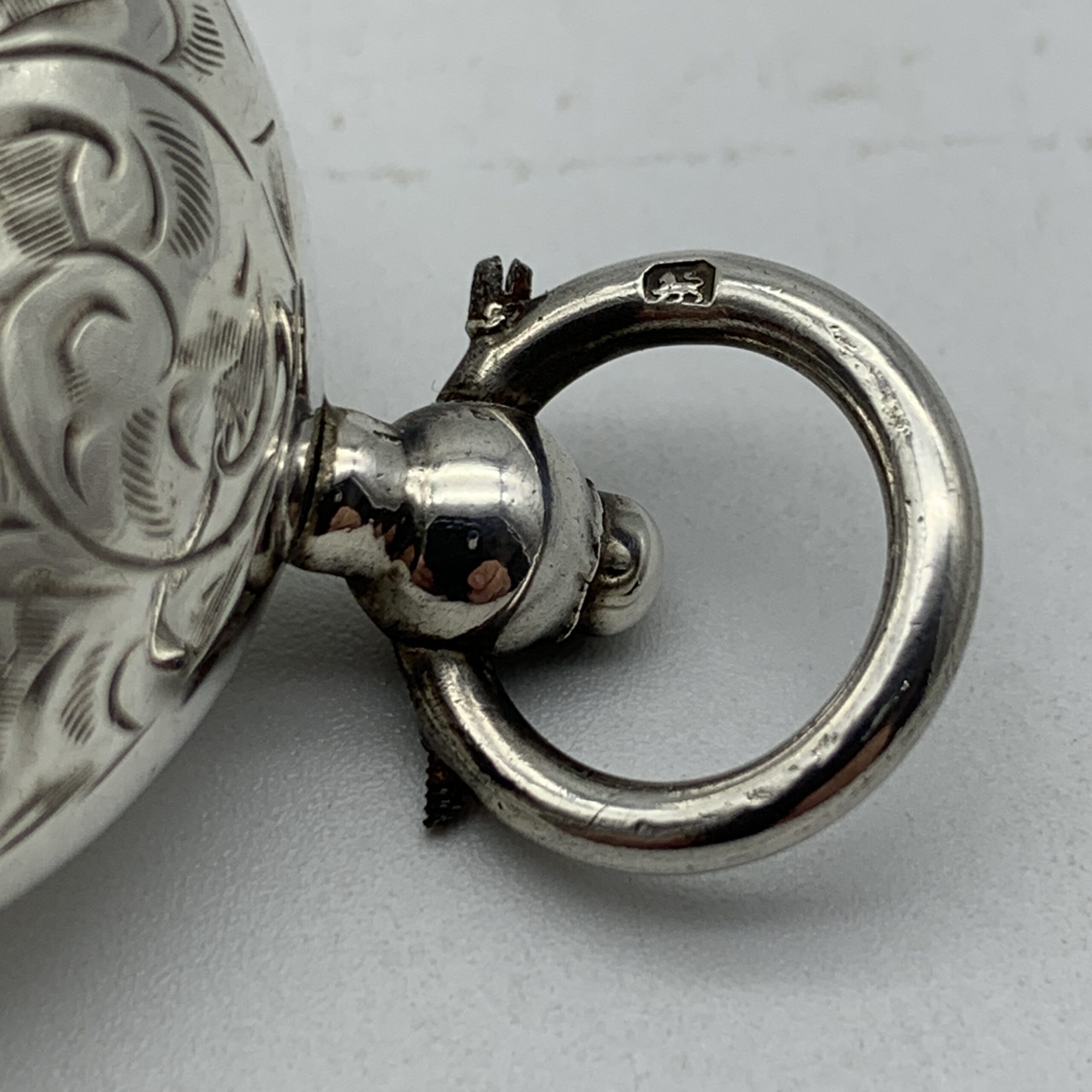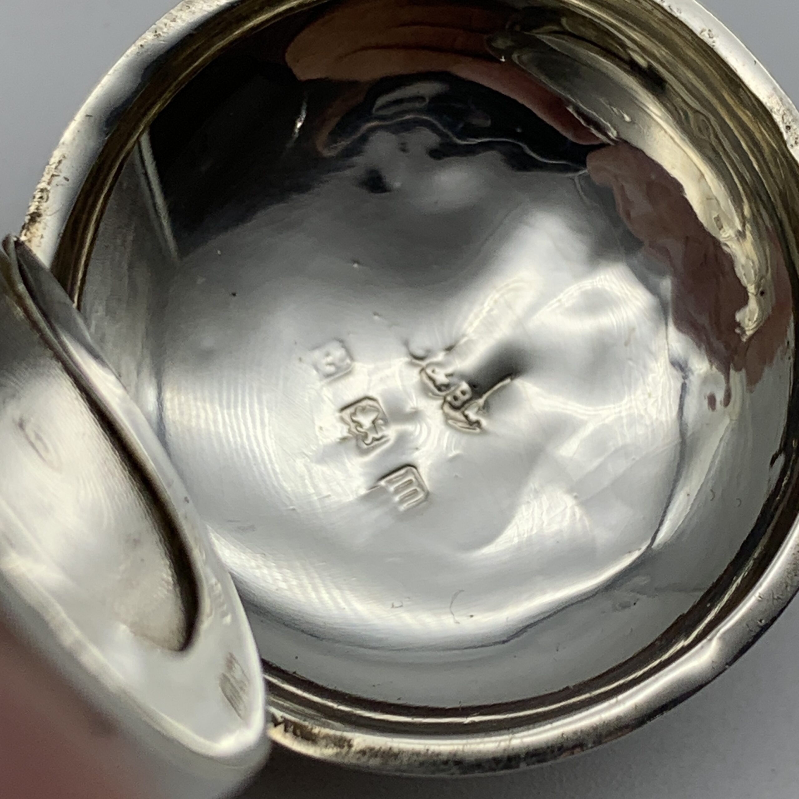 This attractive, English hallmarked, sterling silver sovereign case is beautifully decorated with ‘acanthus’ leaves on both sides, with a blank shield shaped cartouche on the front. It has a push button sprung lid, with a sprung inner compartment for a Sovereign coin and is fitted with a swivel suspension ring. The case was made in Birmingham in 1911 by silversmiths ‘Edward Ernest Smith & William Bartlam’ trading as ‘Smith & Bartlam’ (S & BM) and other than very minor age-related wear to the lid it’s in excellent condition and functions perfectly. It measures 30mm in diameter (47mm with its loop), and weighs 17g.