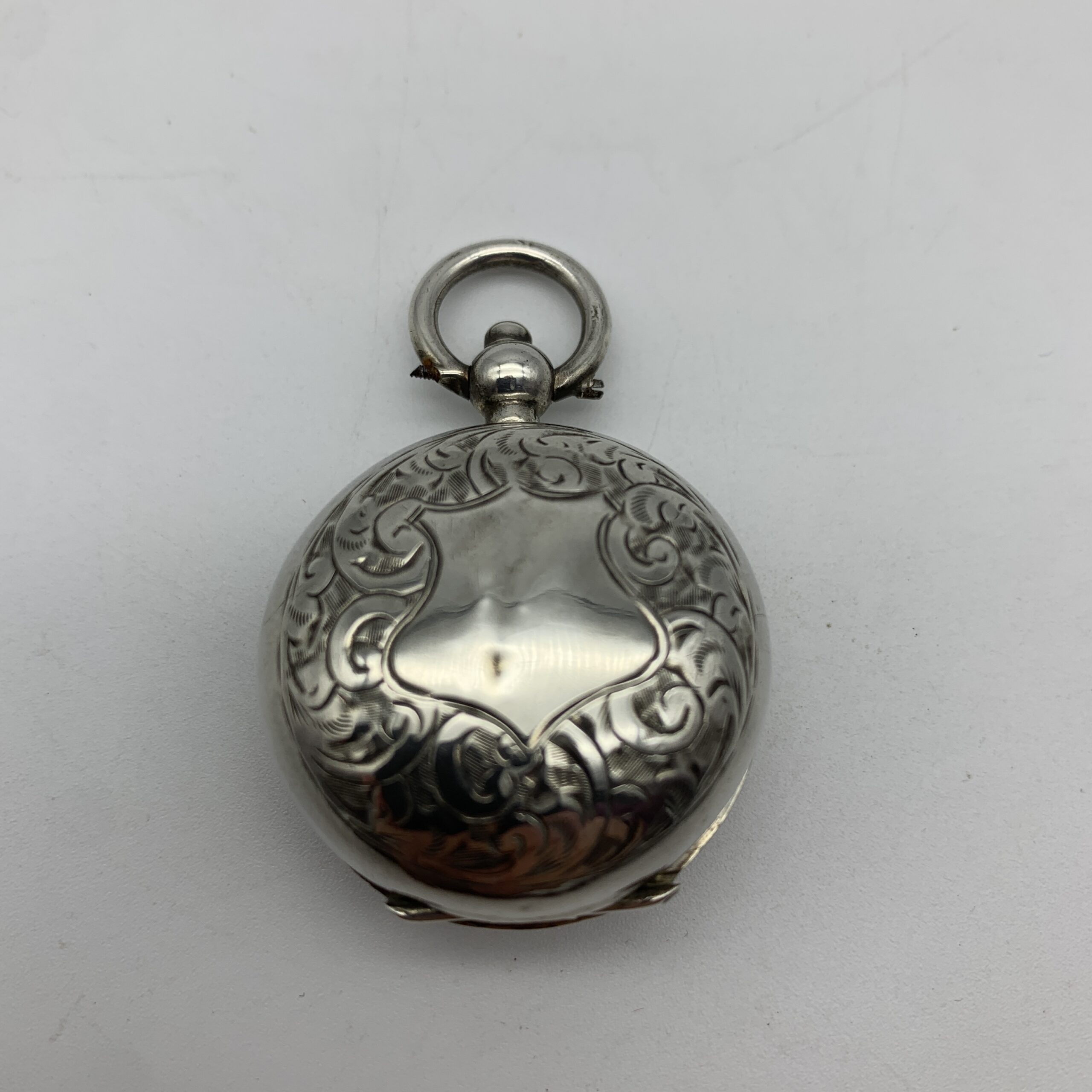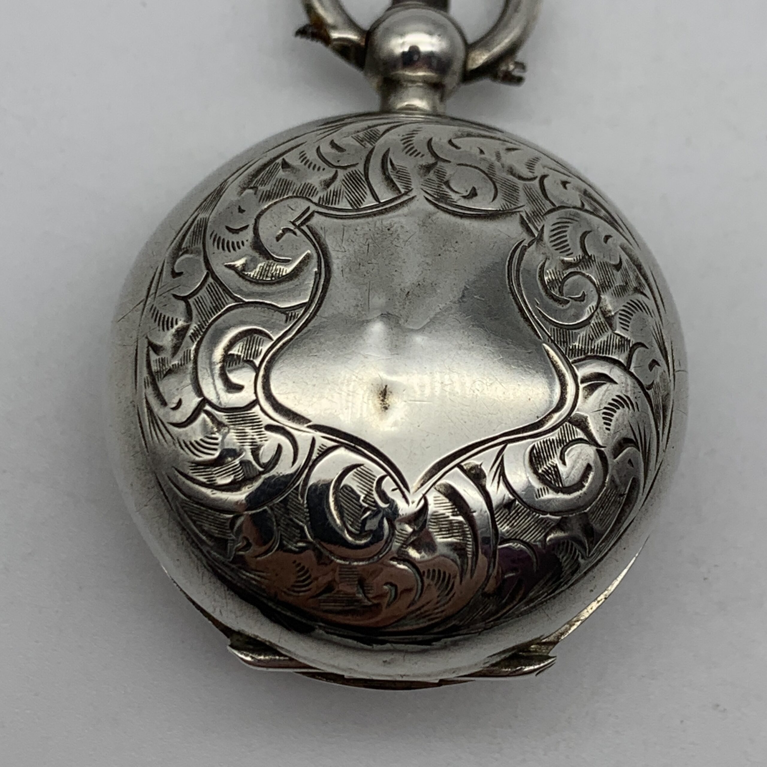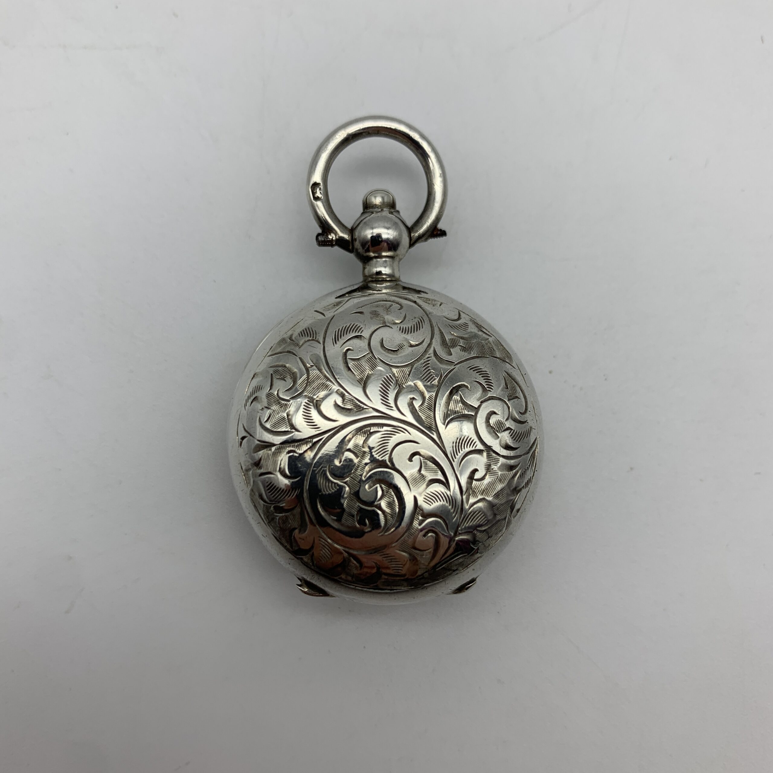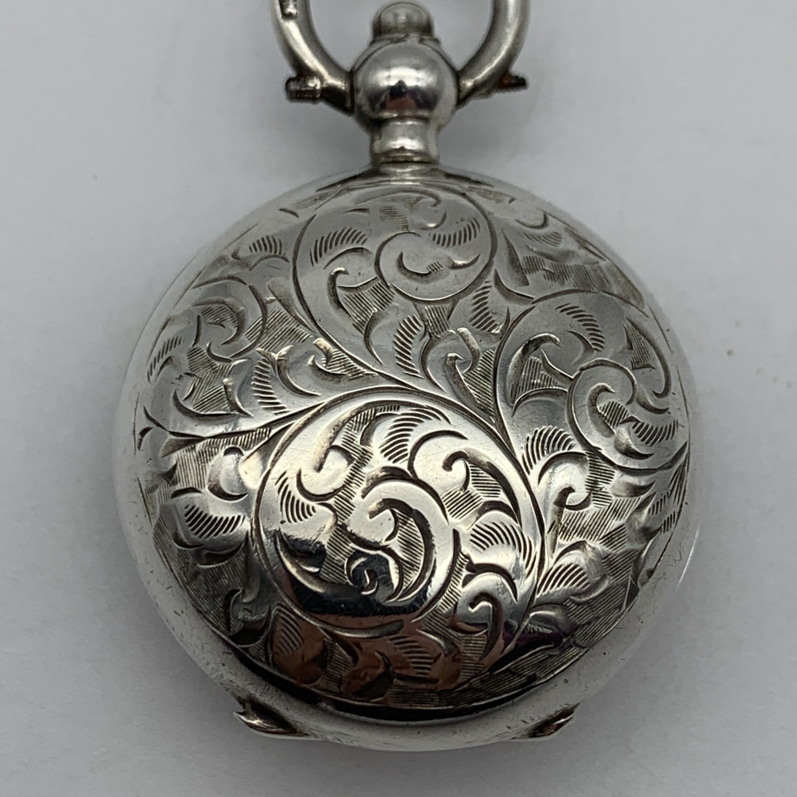 This attractive, English hallmarked, sterling silver sovereign case is beautifully decorated with ‘acanthus’ leaves on both sides, with a blank shield shaped cartouche on the front. It has a push button sprung lid, with a sprung inner compartment for a Sovereign coin and is fitted with a swivel suspension ring. The case was made in Birmingham in 1911 by silversmiths ‘Edward Ernest Smith & William Bartlam’ trading as ‘Smith & Bartlam’ (S & BM) and other than very minor age-related wear to the lid it’s in excellent condition and functions perfectly. It measures 30mm in diameter (47mm with its loop), and weighs 17g.