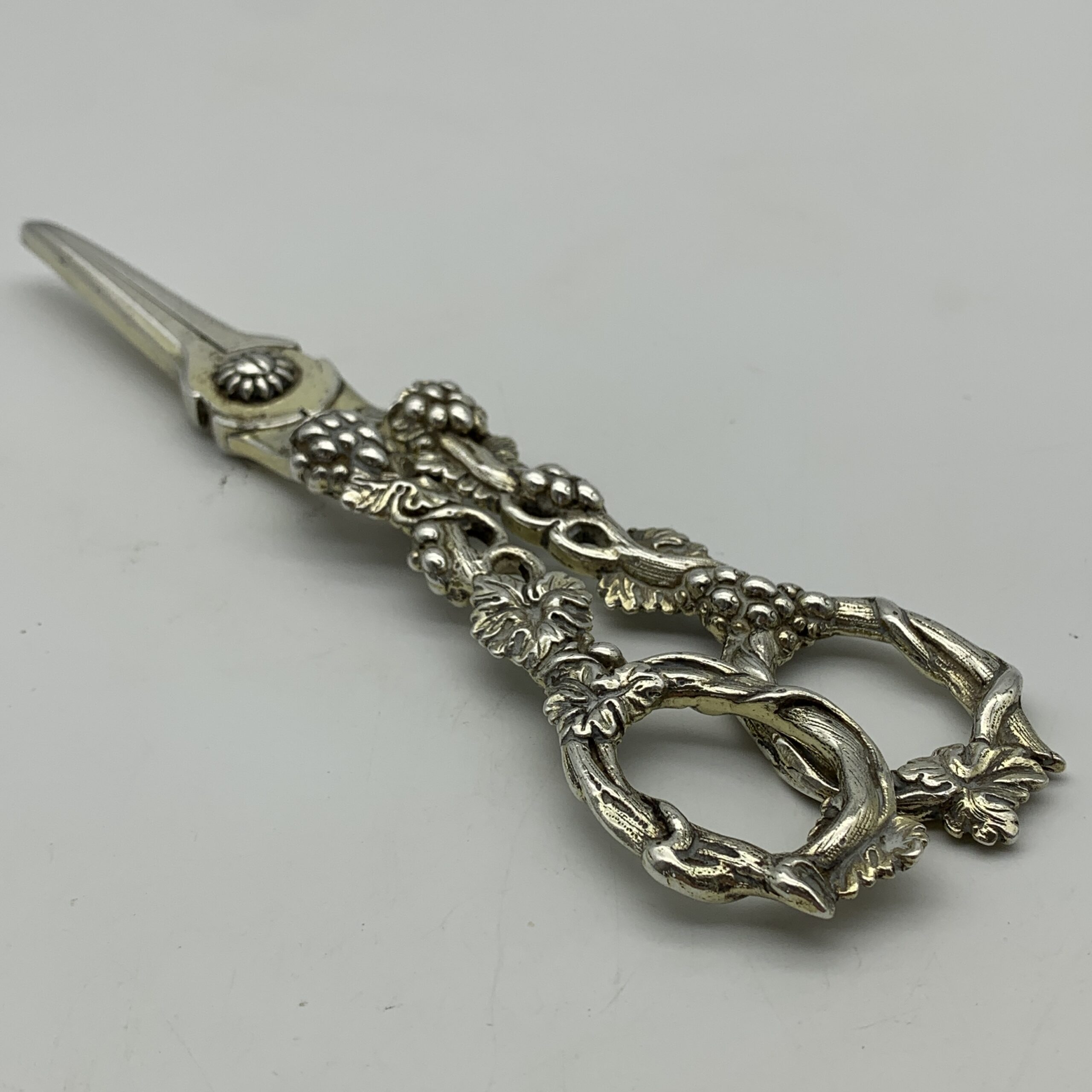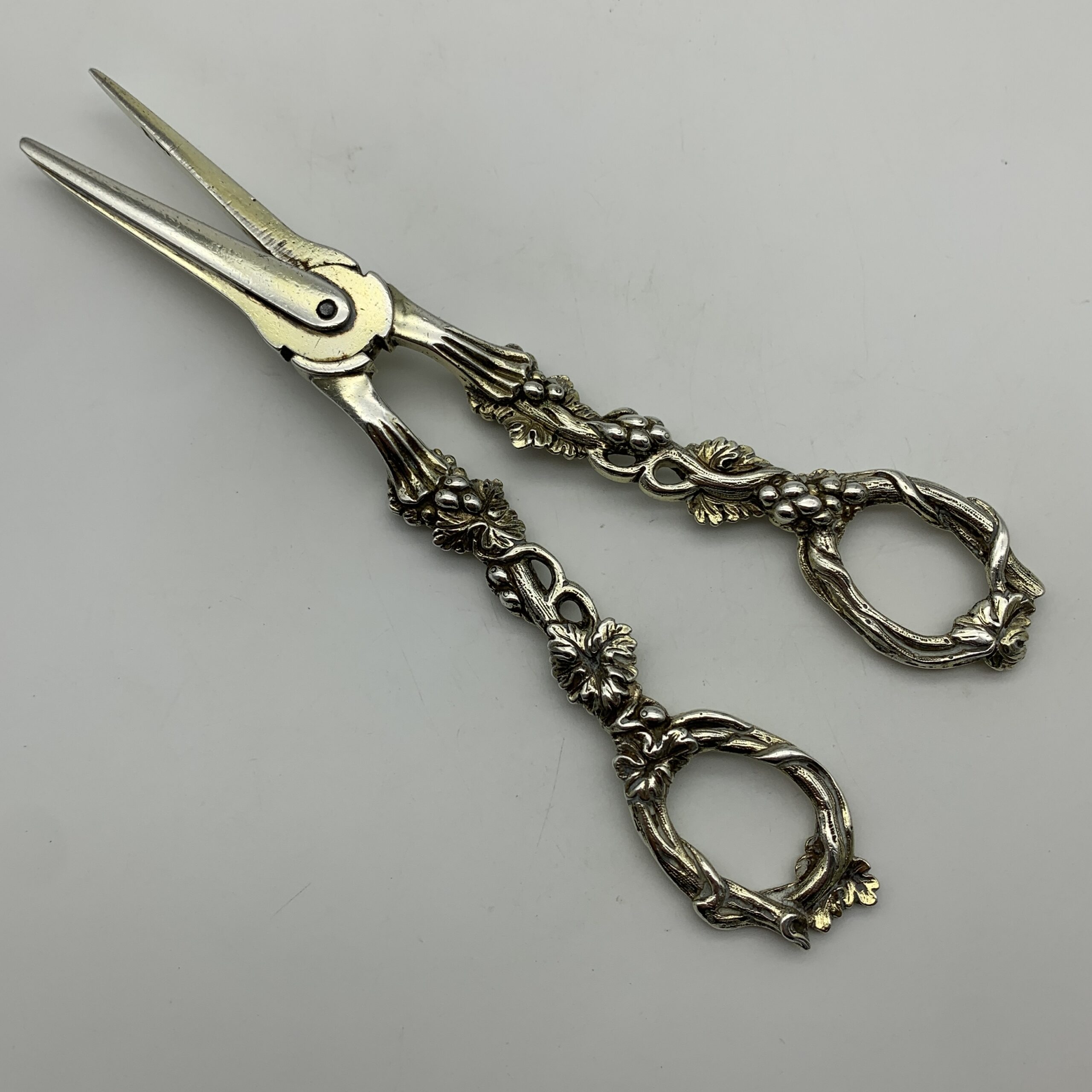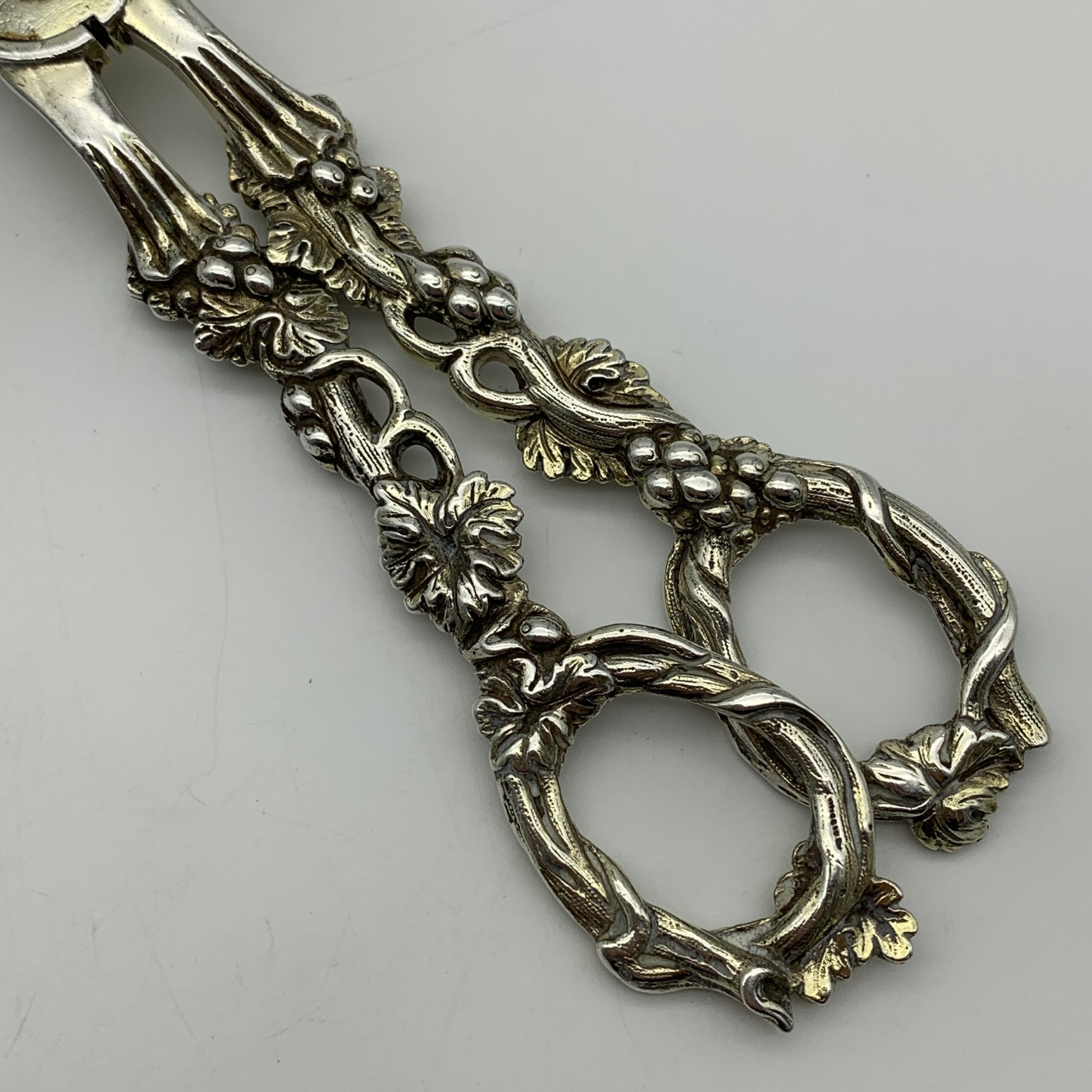 This amazing, fine quality pair of antique ‘William IV’ grape scissors from the early 1800’s, are beautifully embossed with grape vines and bunches of grapes. They were made in London by silversmiths ‘Charles Rawlings & William Summers’ (CRWS) in 1835, and are still in great condition, and retain some of their early gilding. The grape scissors measure 19,3cm in length and weigh 153g.