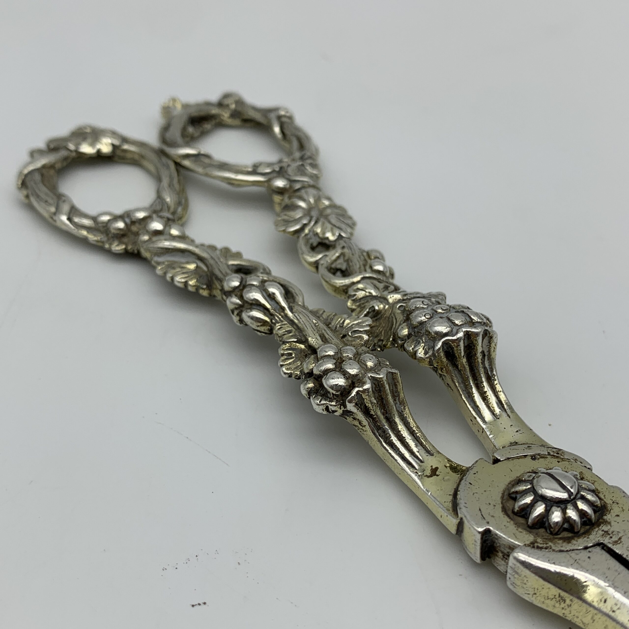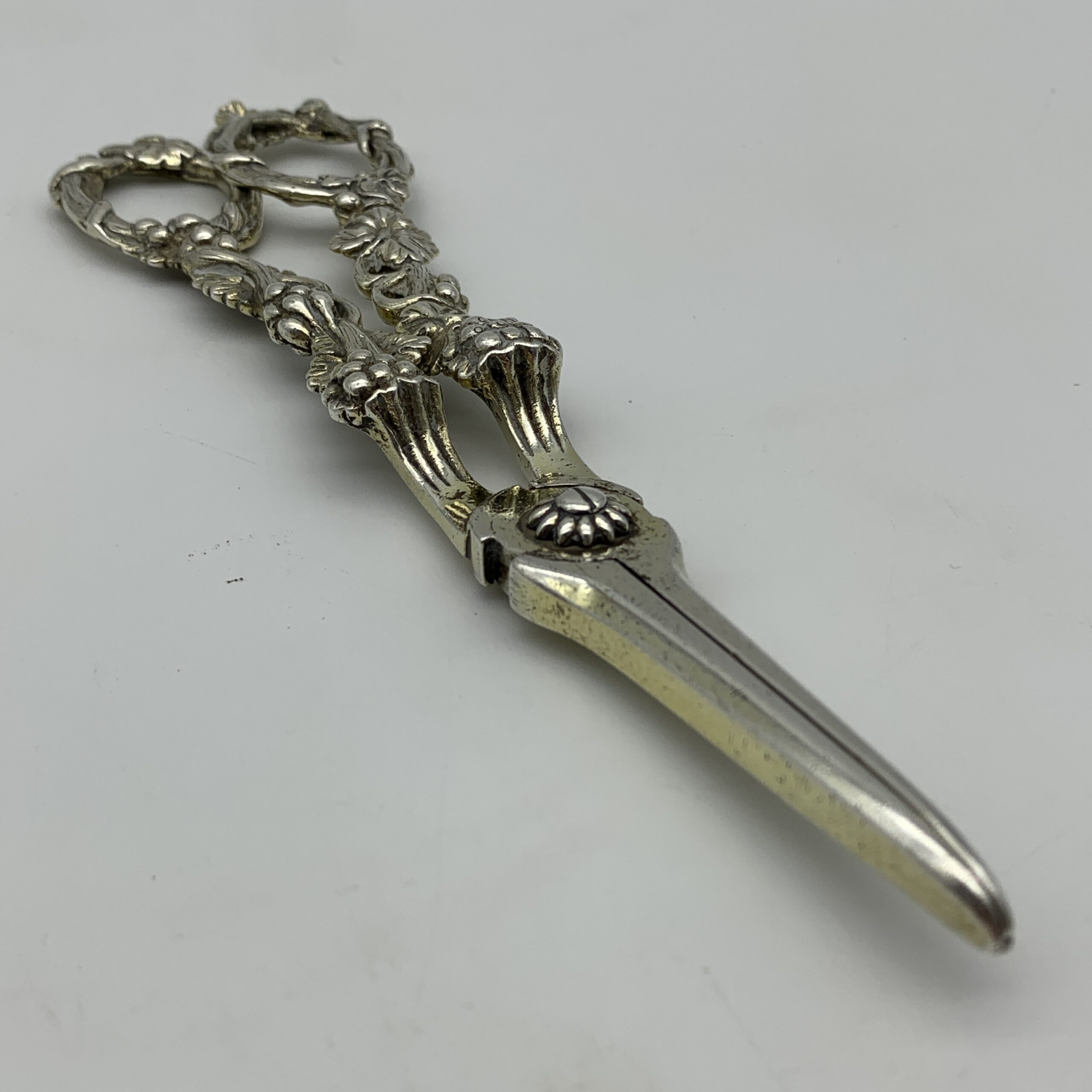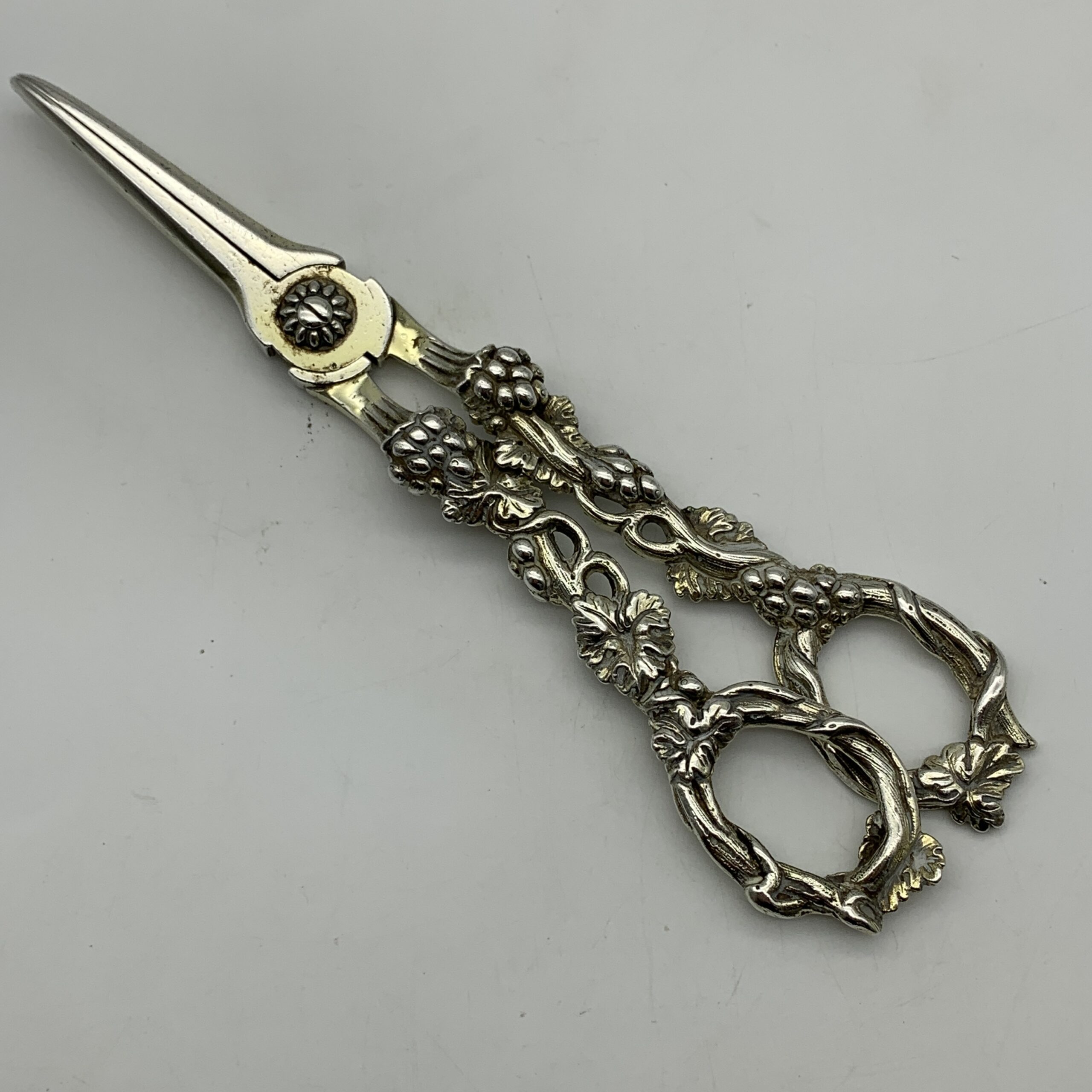 This amazing, fine quality pair of antique ‘William IV’ grape scissors from the early 1800’s, are beautifully embossed with grape vines and bunches of grapes. They were made in London by silversmiths ‘Charles Rawlings & William Summers’ (CRWS) in 1835, and are still in great condition, and retain some of their early gilding. The grape scissors measure 19,3cm in length and weigh 153g.