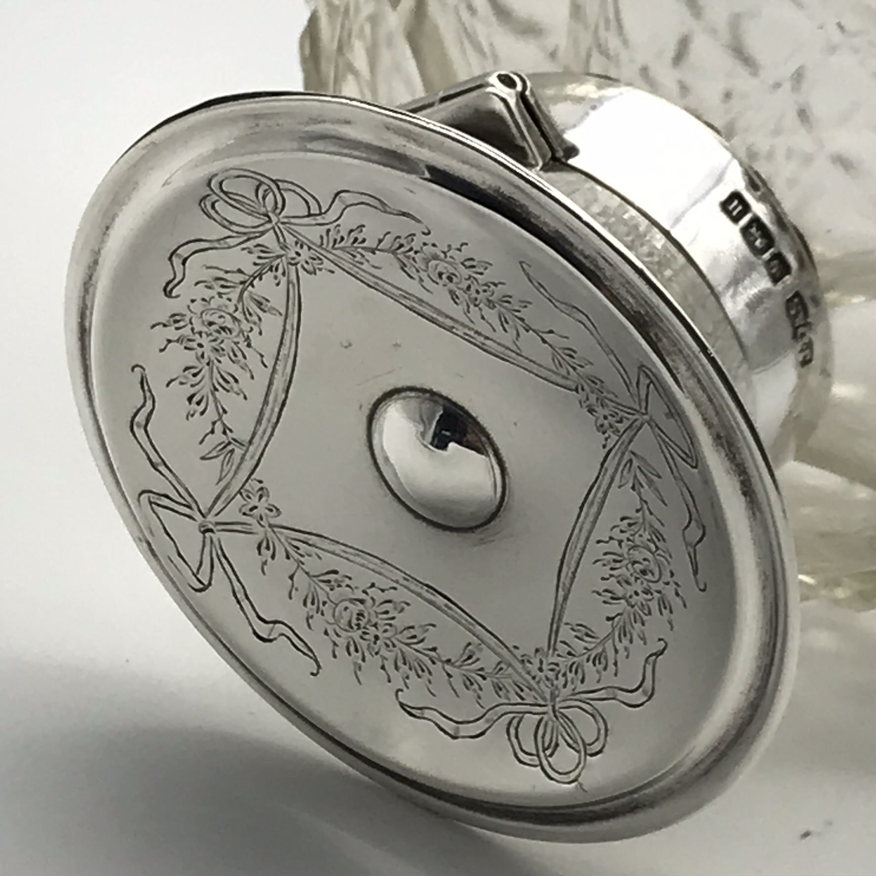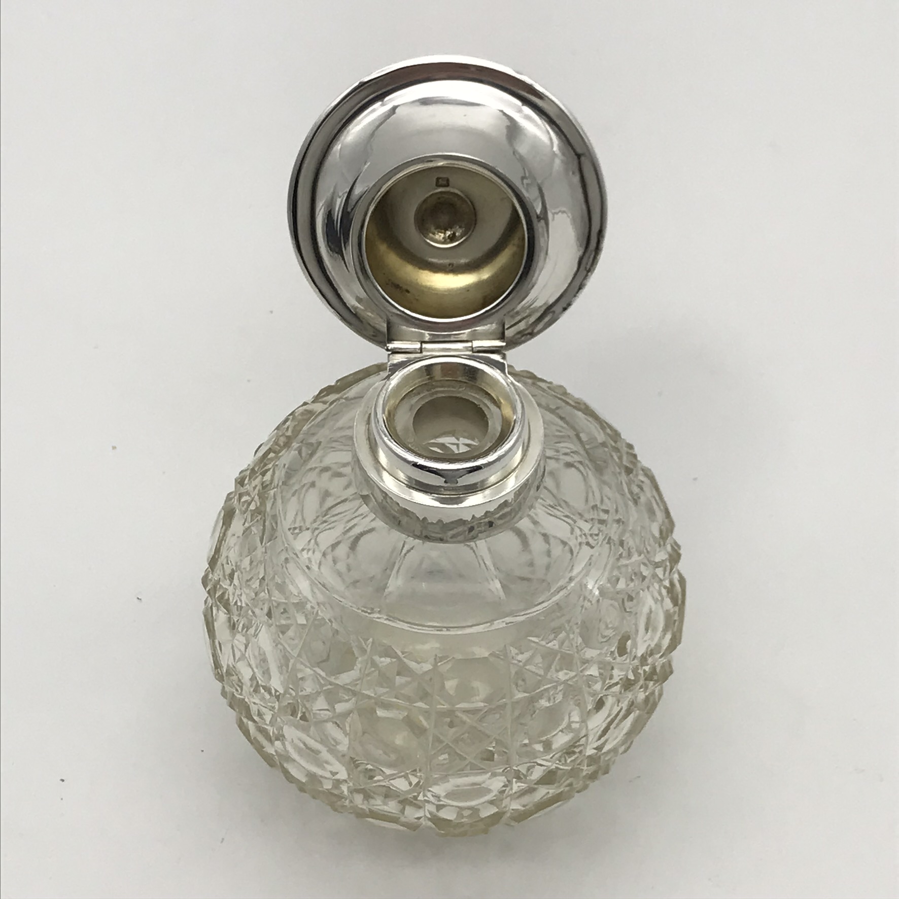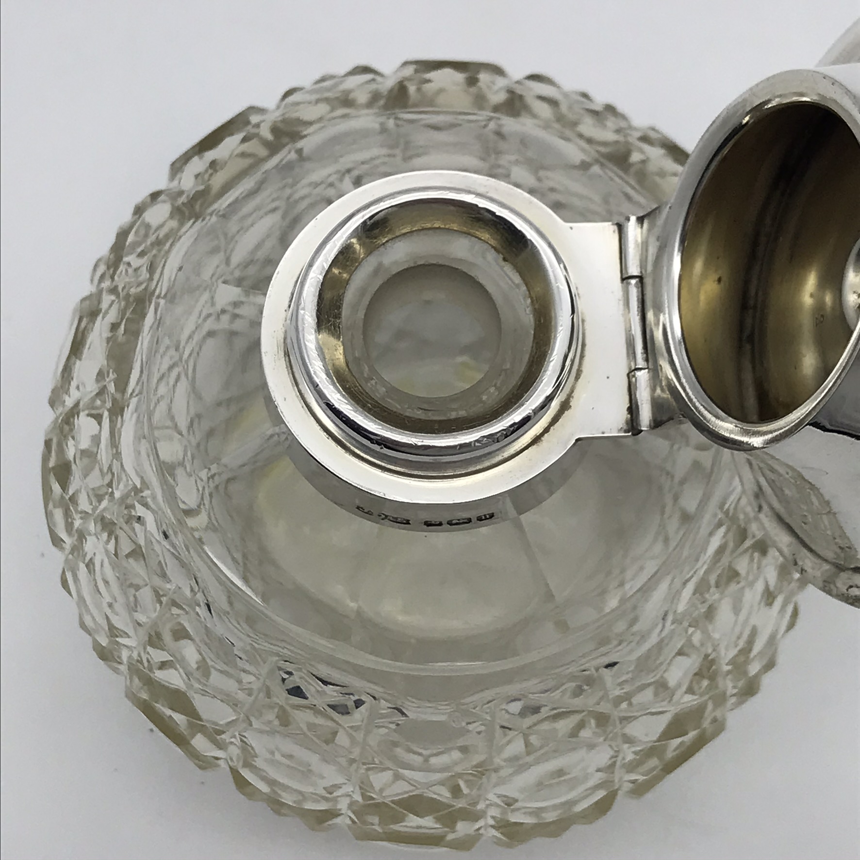 This fine quality, antique, solid silver and cut-crystal perfume bottle is hand-cut in the lovely ‘hobnail’ pattern. It has an unusual English hallmarked, wide, flat topped, hinged silver lid, decorated with a very pretty, engraved and chased floral pattern. The scent bottle was made in 1912 in Sheffield, England by silversmiths ‘James Dixon & Sons’ (J.D.&S). Other than the small internal crystal stopper missing, it’s in great condition, and it stands 11,5cm high, with a diameter of 10cm at its widest and weighs 445g.
