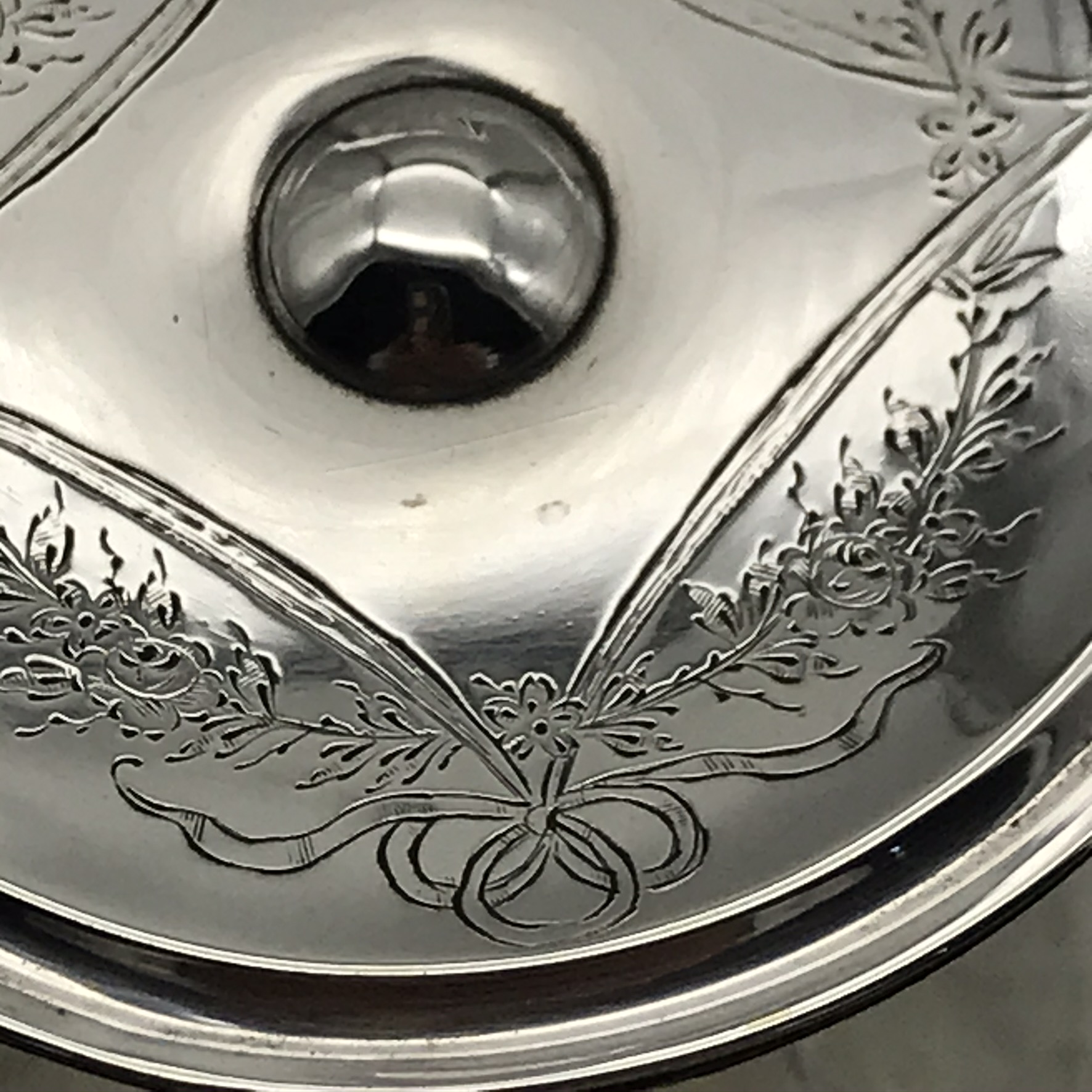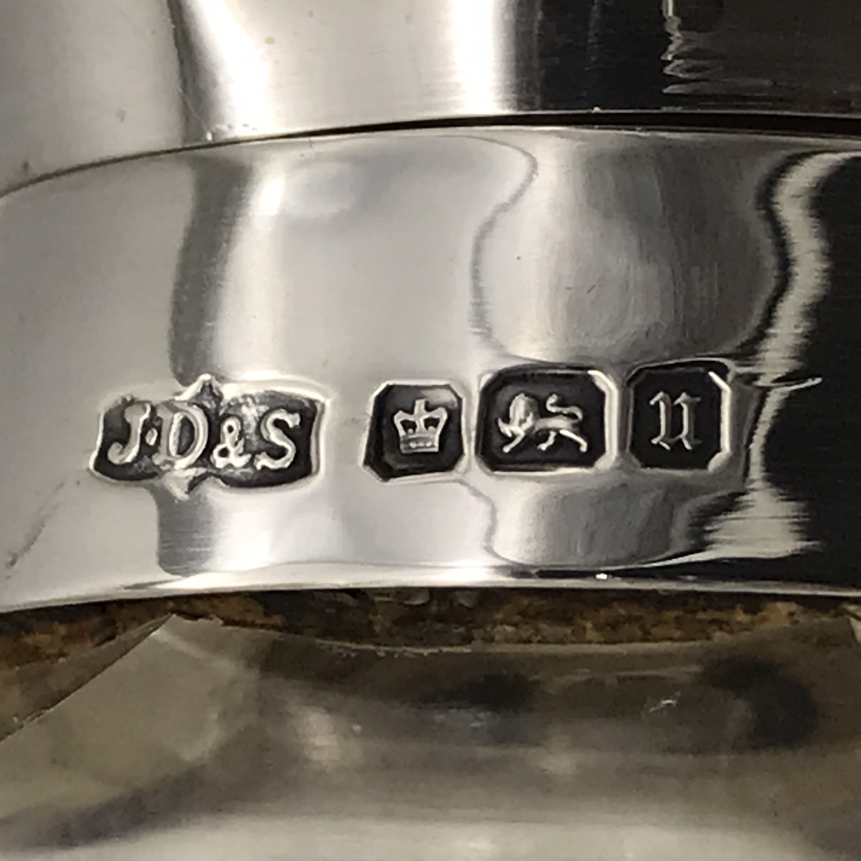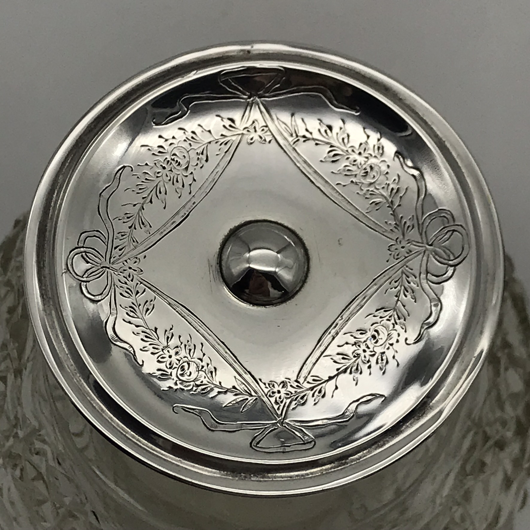 This fine quality, antique, solid silver and cut-crystal perfume bottle is hand-cut in the lovely ‘hobnail’ pattern. It has an unusual English hallmarked, wide, flat topped, hinged silver lid, decorated with a very pretty, engraved and chased floral pattern. The scent bottle was made in 1912 in Sheffield, England by silversmiths ‘James Dixon & Sons’ (J.D.&S). Other than the small internal crystal stopper missing, it’s in great condition, and it stands 11,5cm high, with a diameter of 10cm at its widest and weighs 445g.