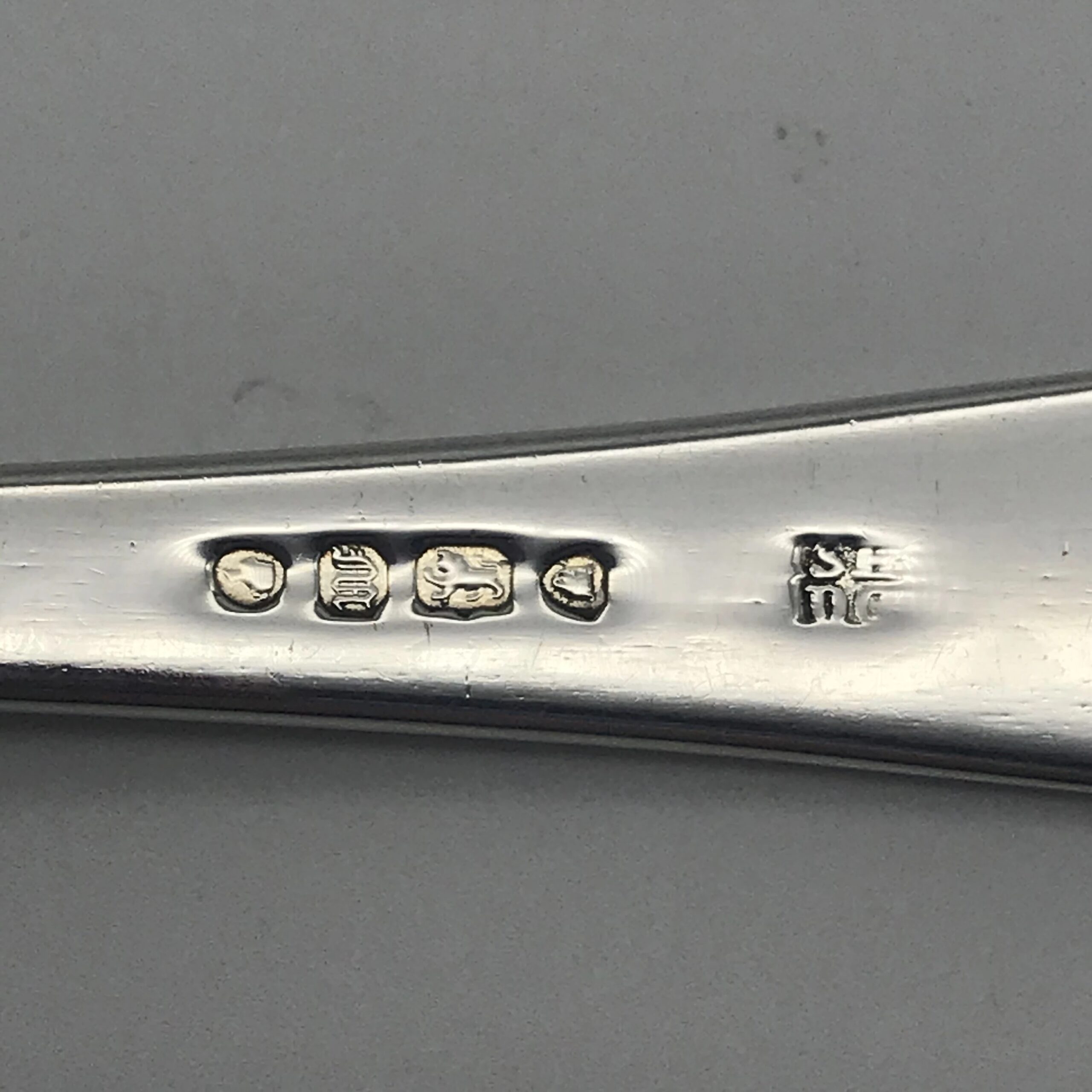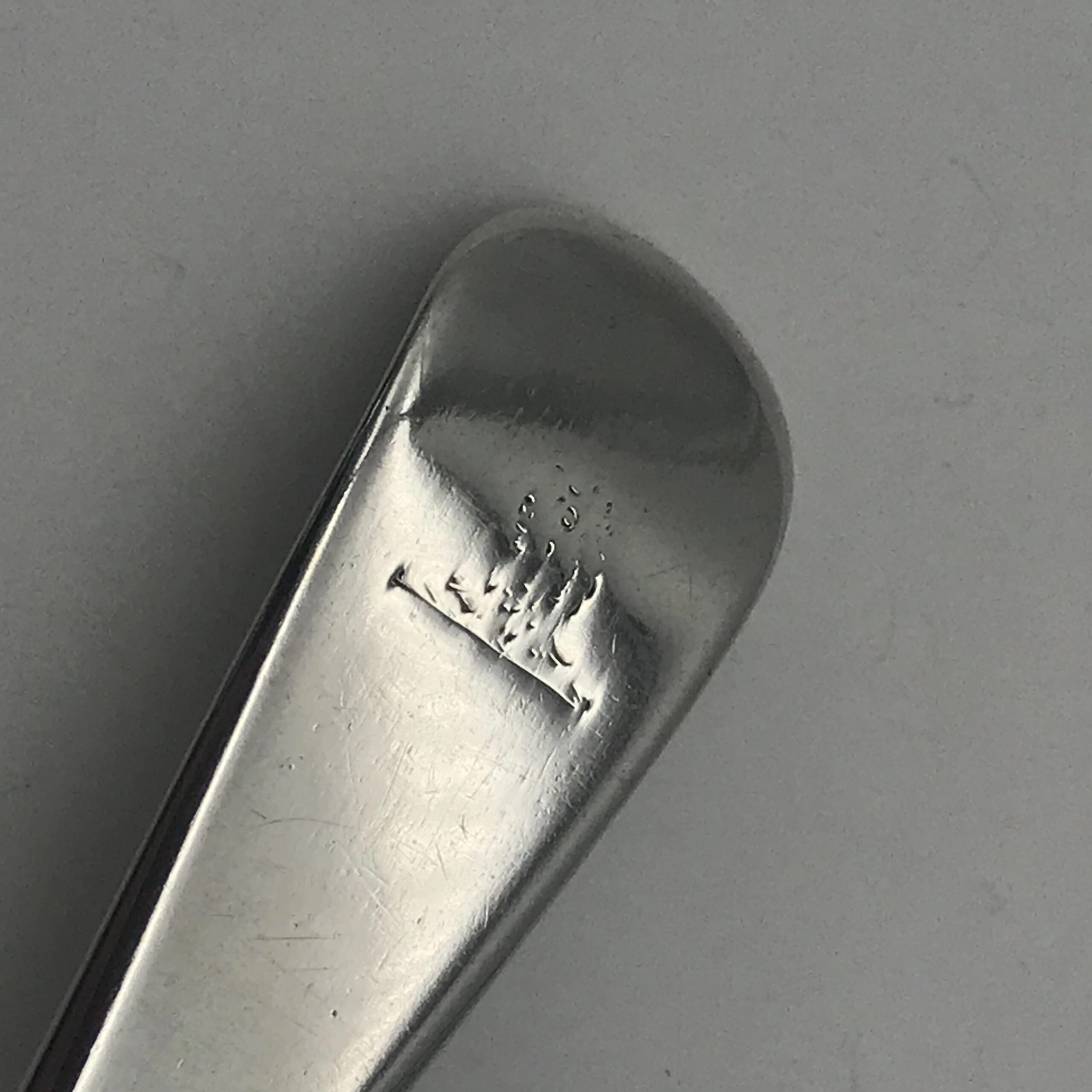 This great quality silver sauce or gravy ladle is English hallmarked for London 1847, with a maker’s mark ‘S.H.D.C.’ for silversmiths ‘Samuel Hayne & Dudley Cater.’ There is a faded crest on the top of the handle that I can’t make out. It is in excellent condition and measures 17cm in length, with a bowl width of 6cm x 5cm and weight of 49.3g.