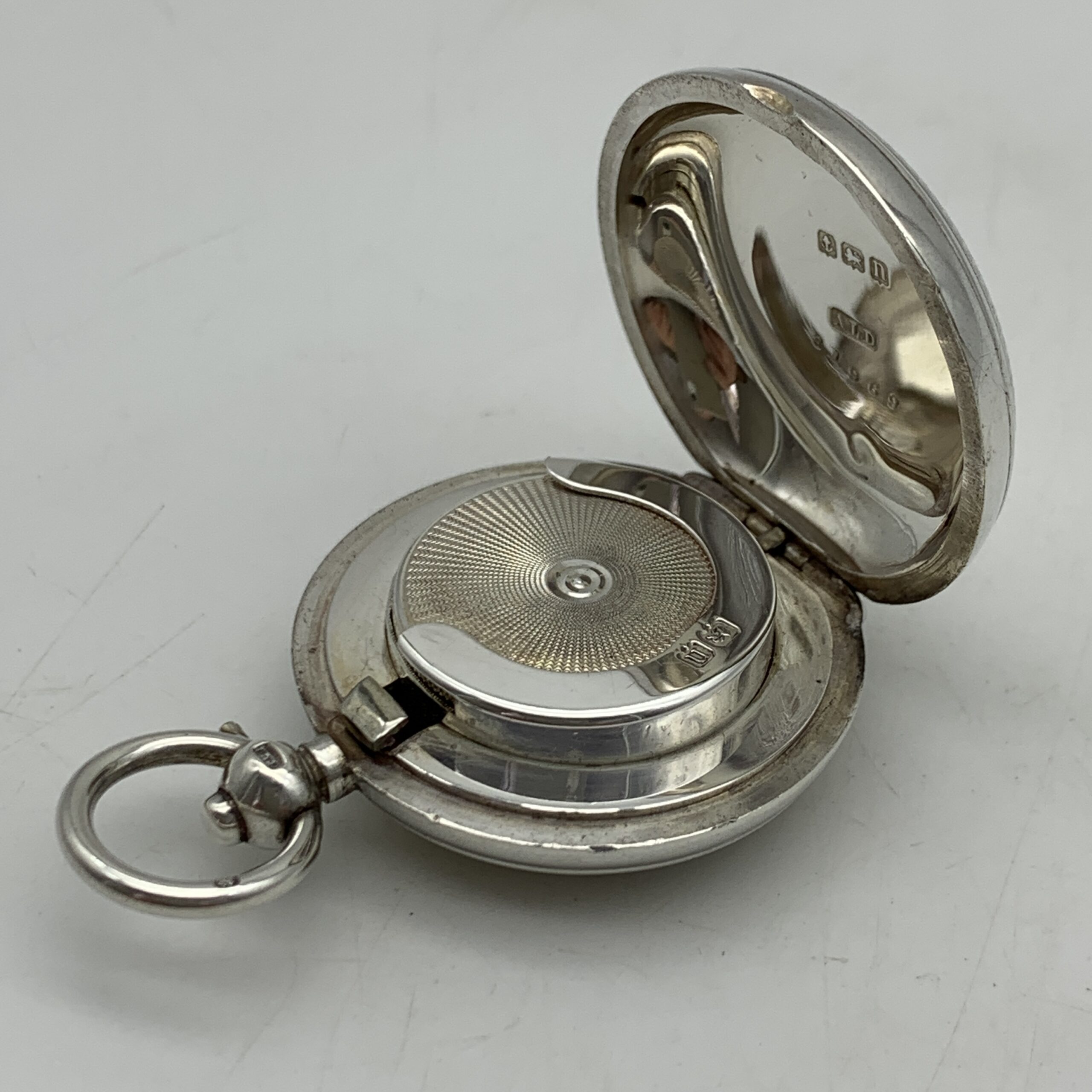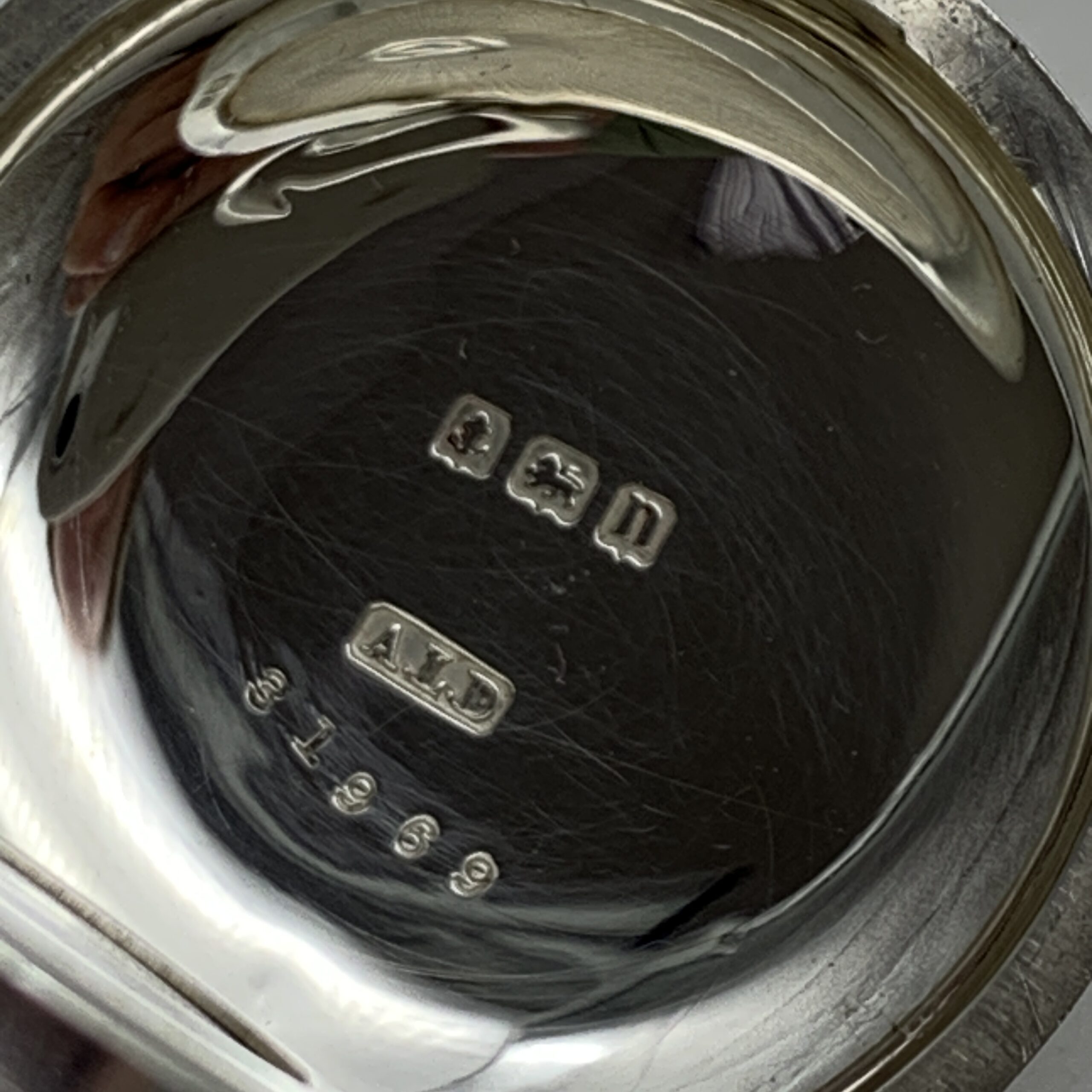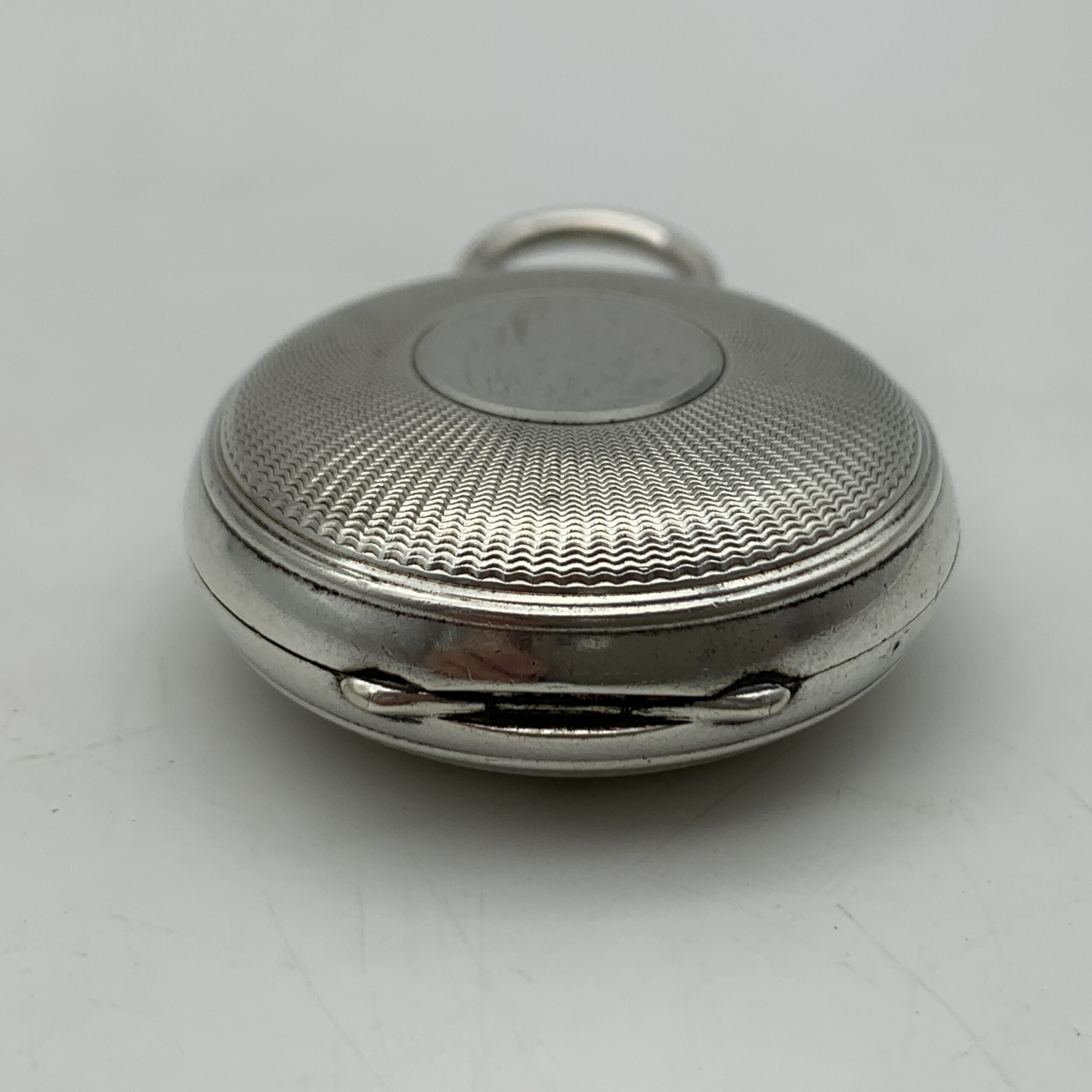 This fine quality, English hallmarked, antique silver sovereign case has a lovely engine turned decoration on both sides with a central round blank cartouche on the front. The case has a sprung lid with a push button opening mechanism and is fitted with a swivel suspension ring. It was made in Birmingham in 1912 by silversmiths ‘Aaron Lufkin Dennison’ (A.L.D) and other than a tiny dent on the case it’s in excellent condition and functions perfectly. It measures 34mm in diameter (50mm with loop), and weighs 23,8g.