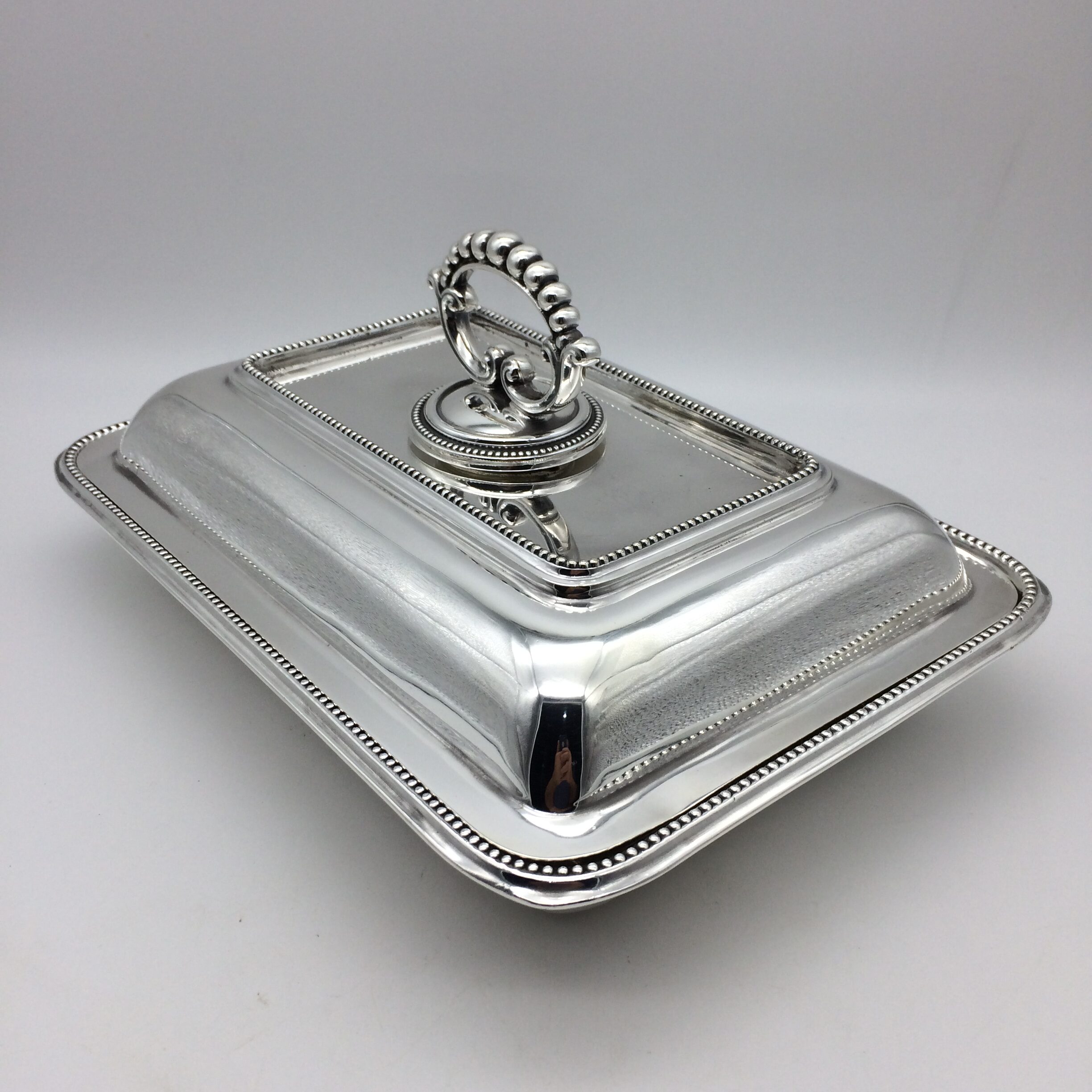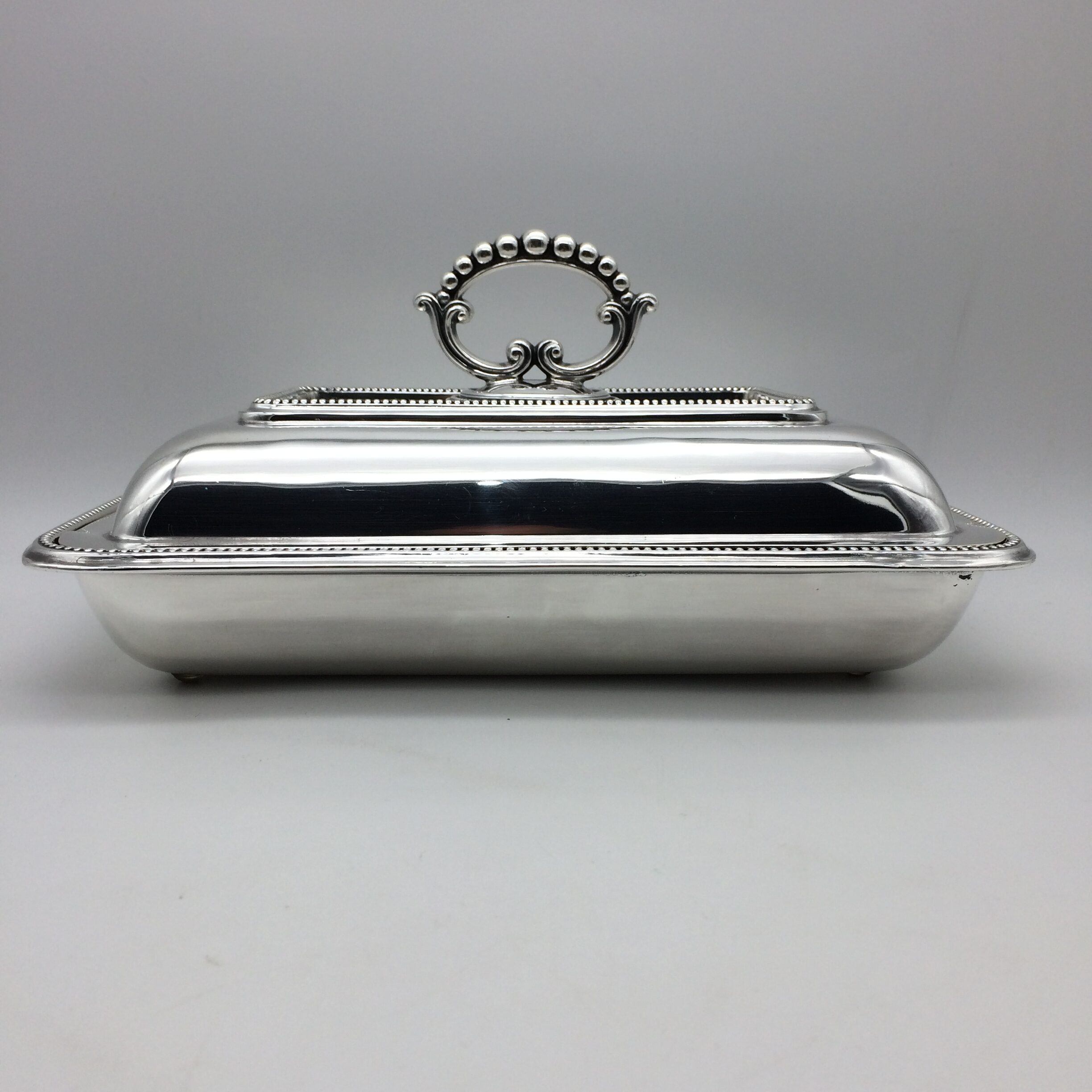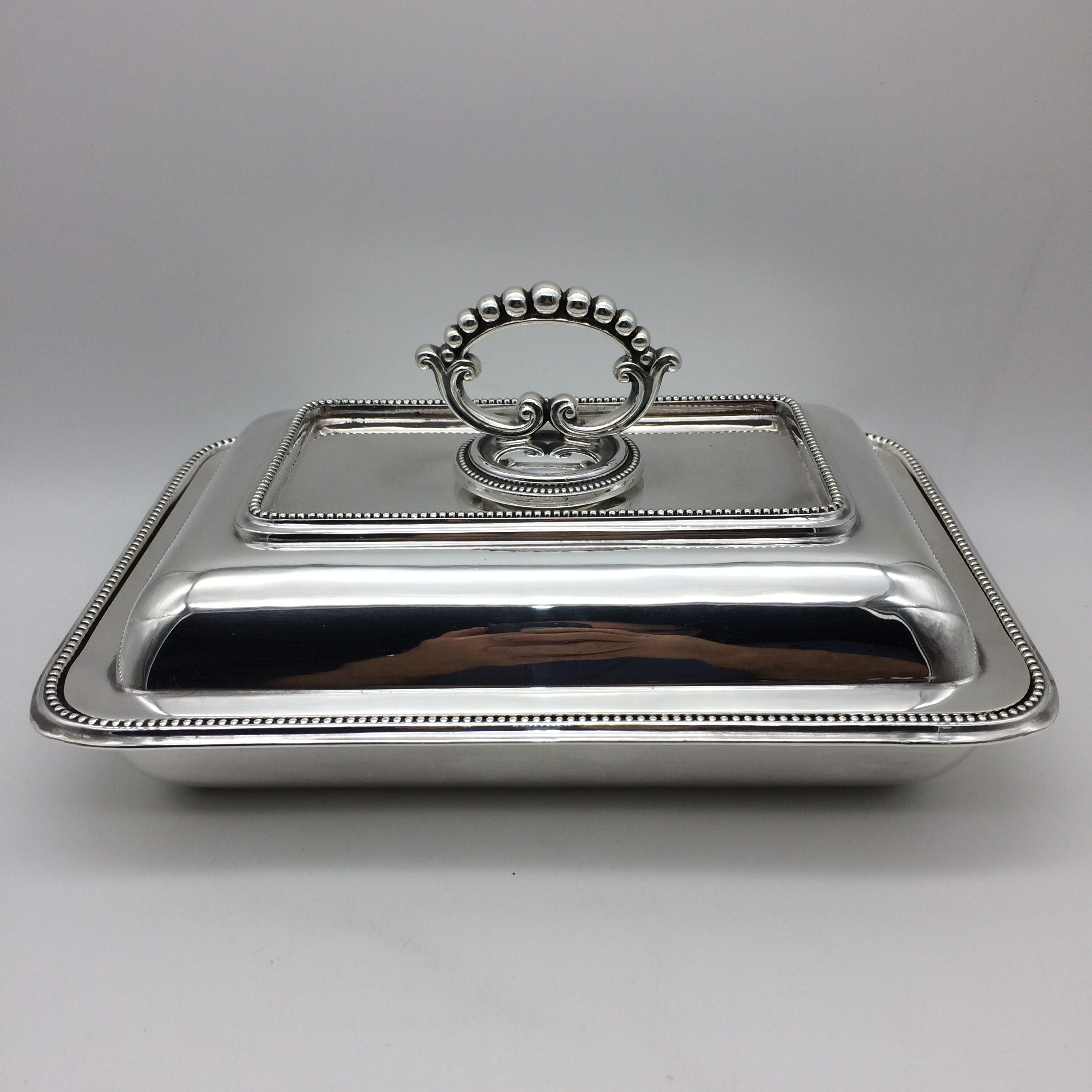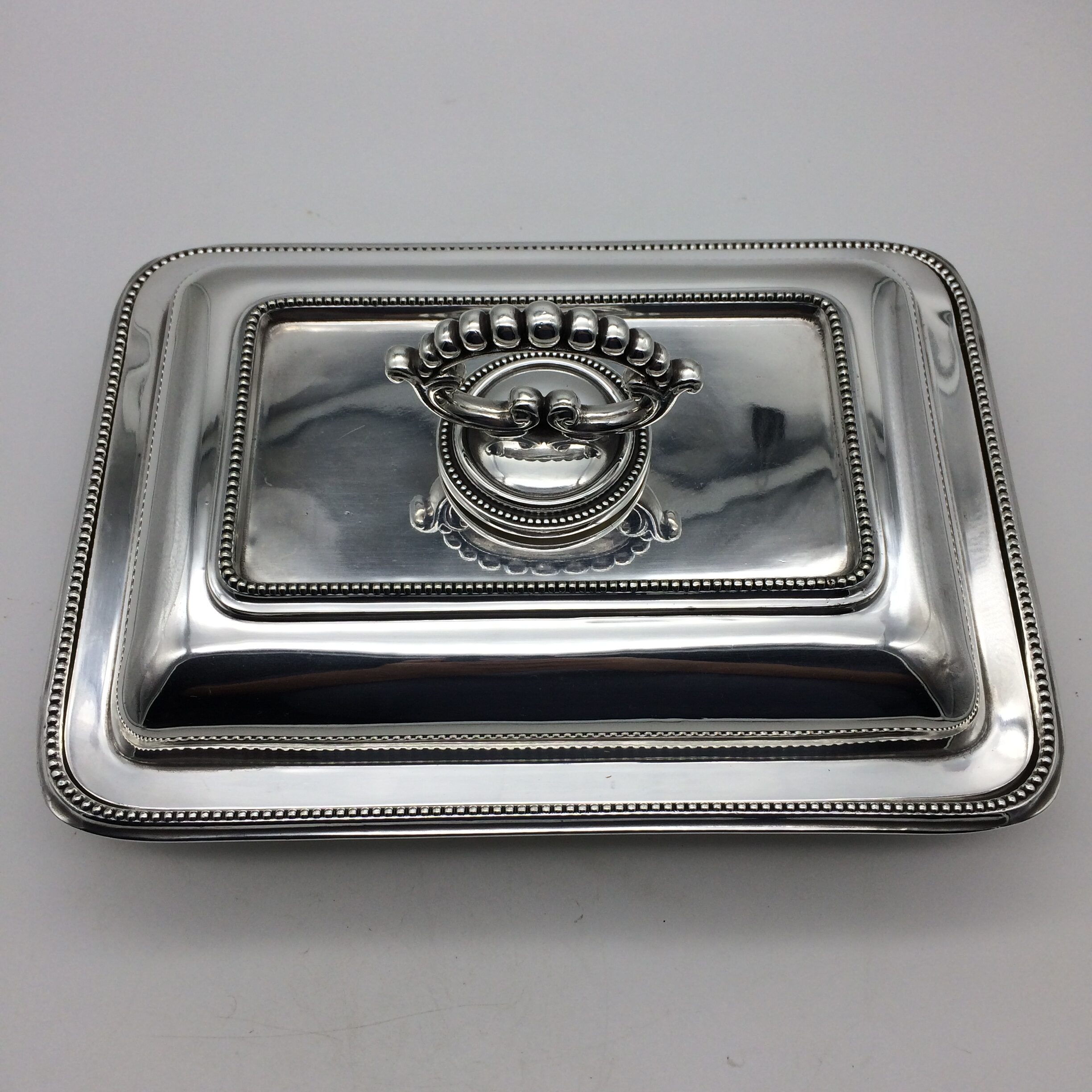 This great quality, silver-plated entrée dish and cover with a removable handle is in excellent condition. It is rectangular in shape with a simple beaded decoration on both the lid, handle and base. The set dates to the early 1900’s and was made by one of the top factory’s, ‘Walker & Hall’, in Sheffield, England. The dish and cover are very heavy and are probably silver-plated on brass. The set stands 12cm high (7,5cm without handle), measures 28,5cm x 20,0cm and weighs 1760g.