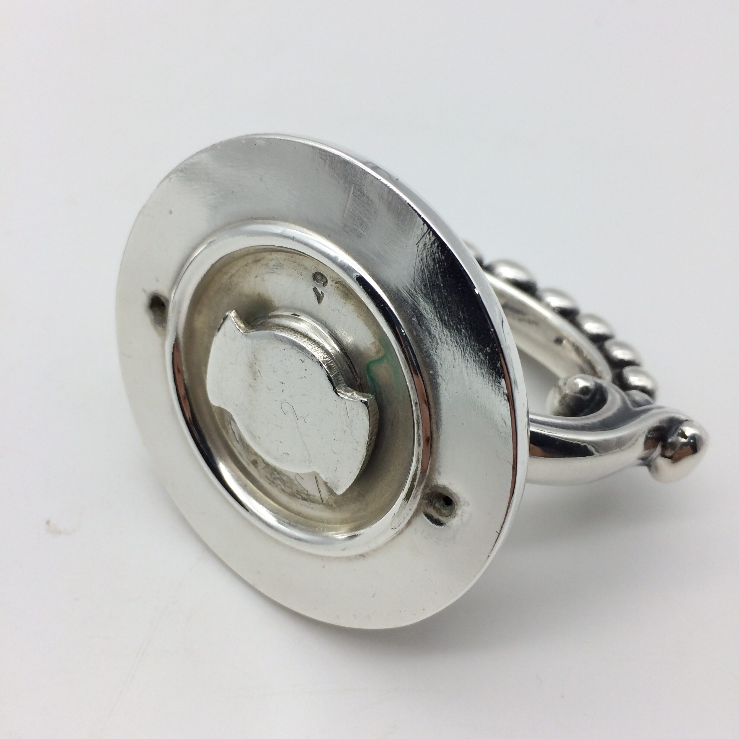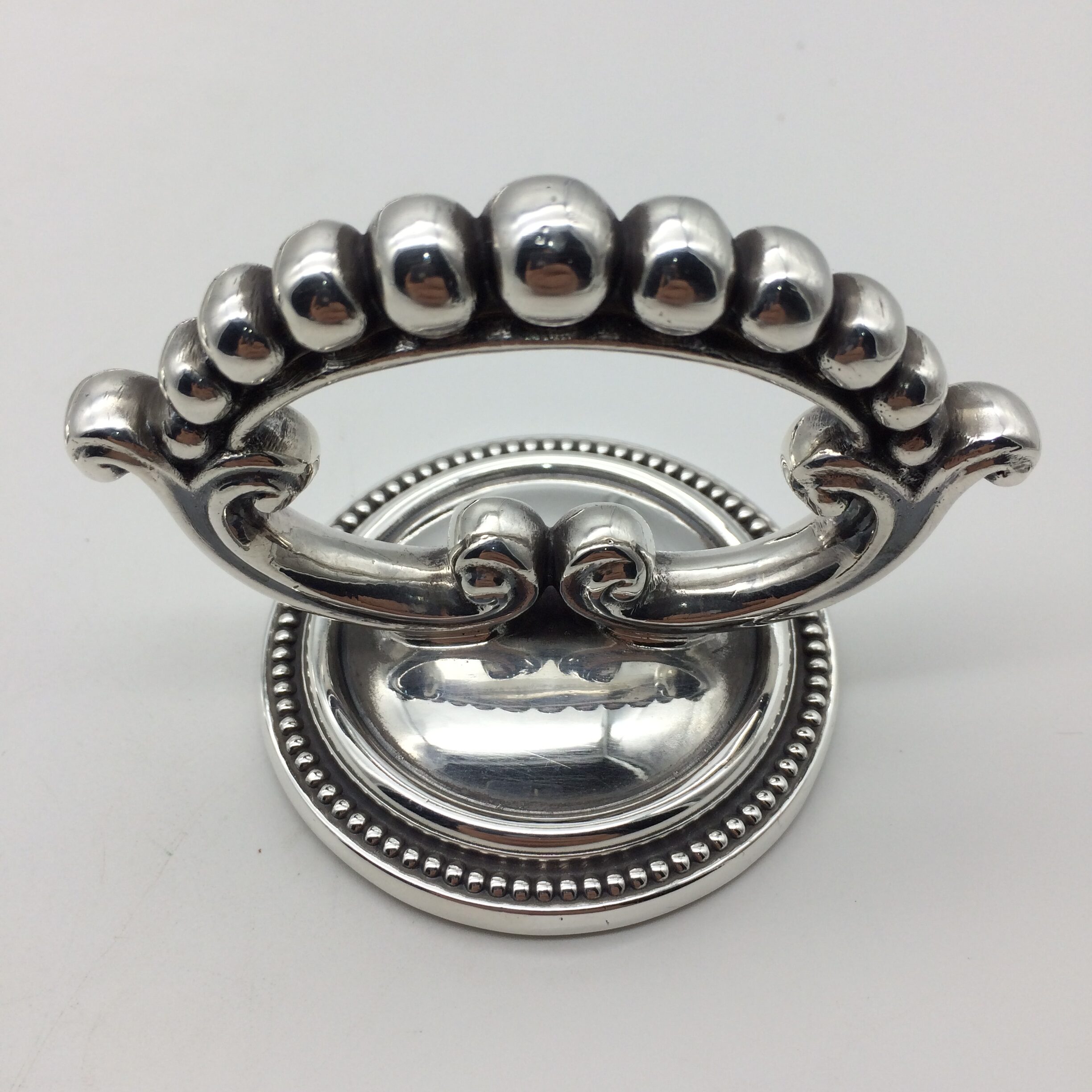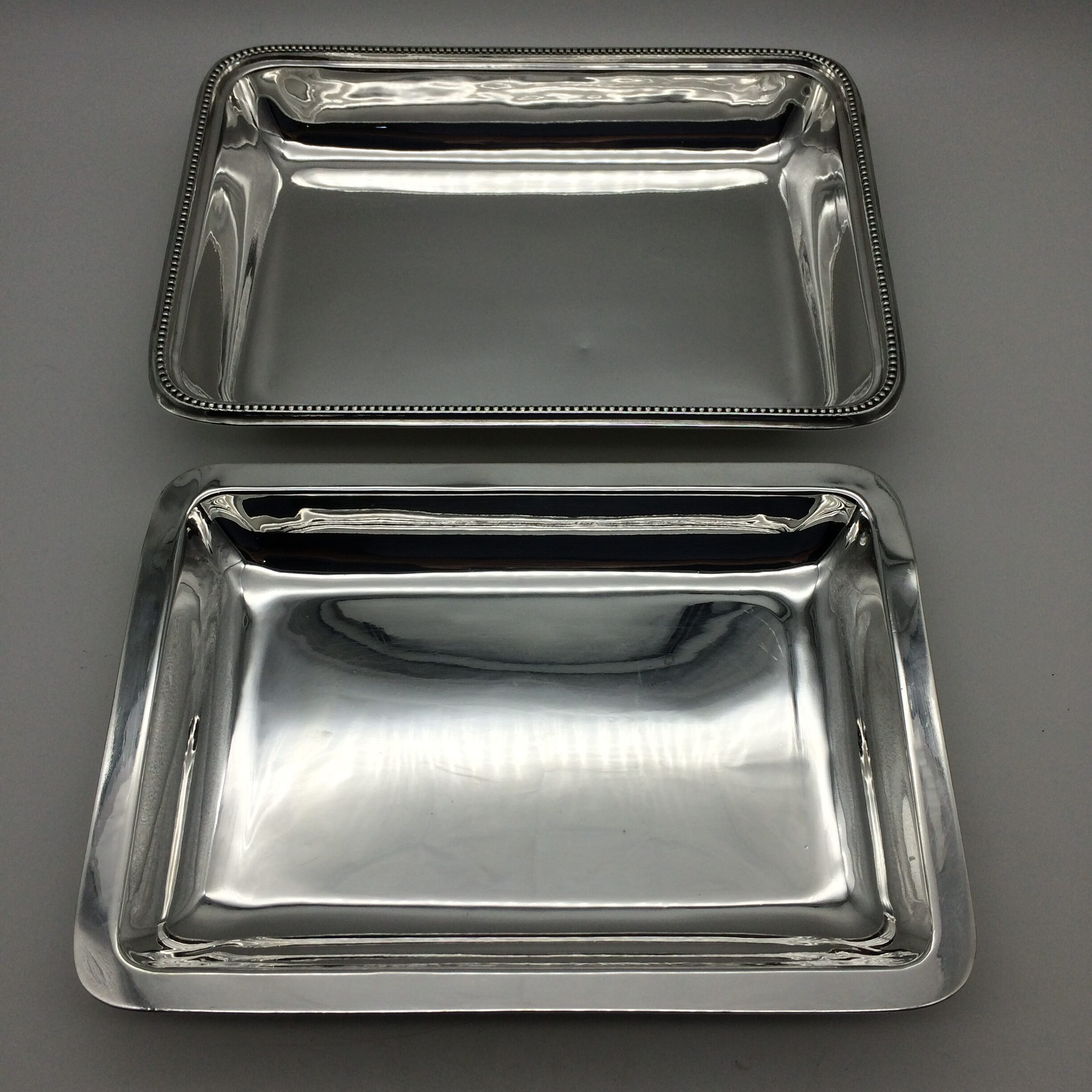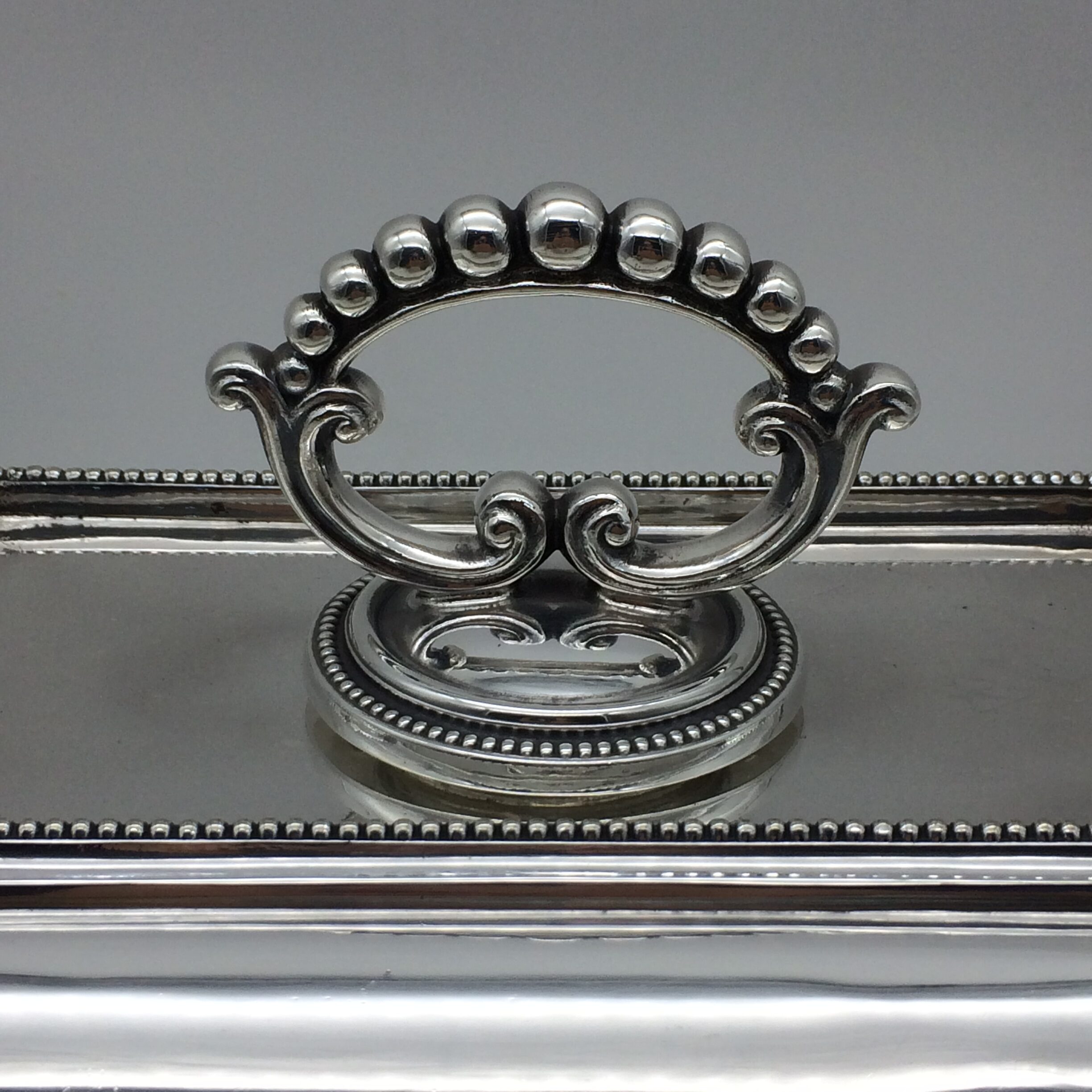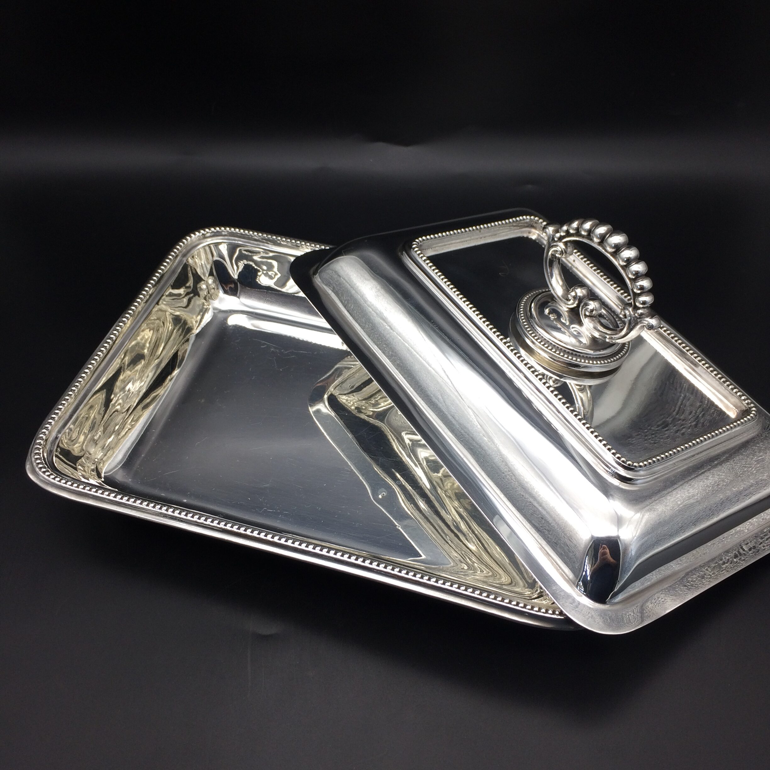 This great quality, silver-plated entrée dish and cover with a removable handle is in excellent condition. It is rectangular in shape with a simple beaded decoration on both the lid, handle and base. The set dates to the early 1900’s and was made by one of the top factory’s, ‘Walker & Hall’, in Sheffield, England. The dish and cover are very heavy and are probably silver-plated on brass. The set stands 12cm high (7,5cm without handle), measures 28,5cm x 20,0cm and weighs 1760g.