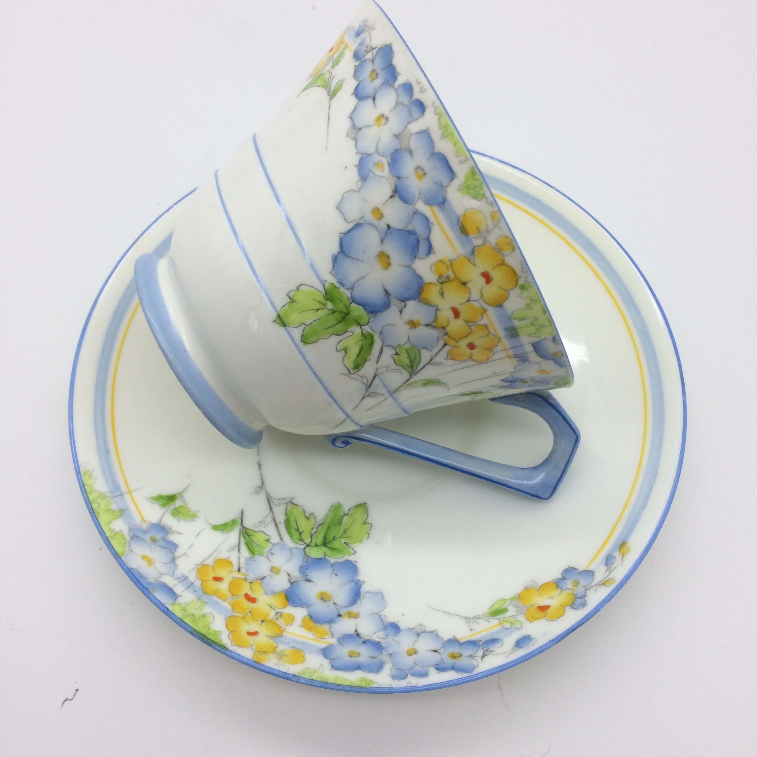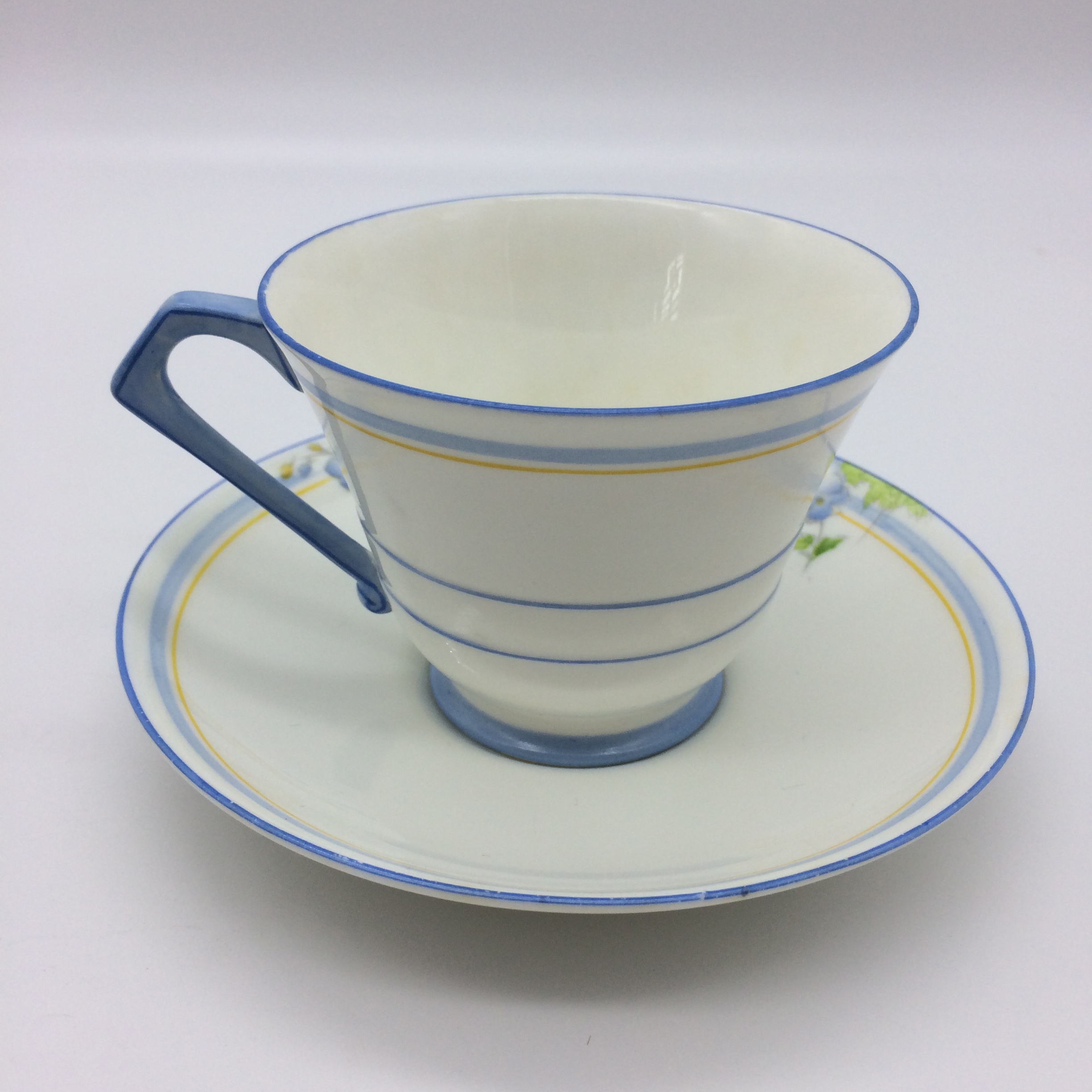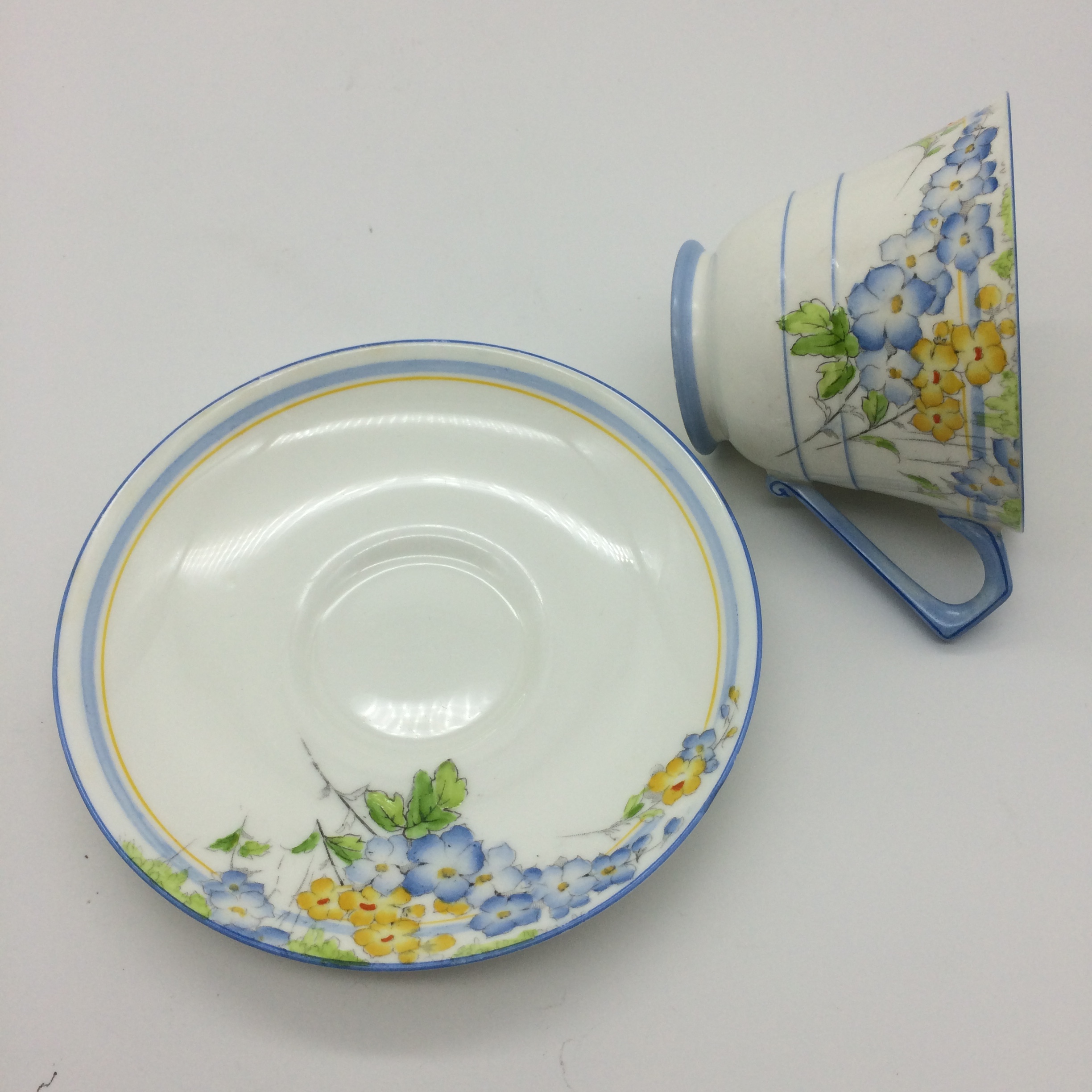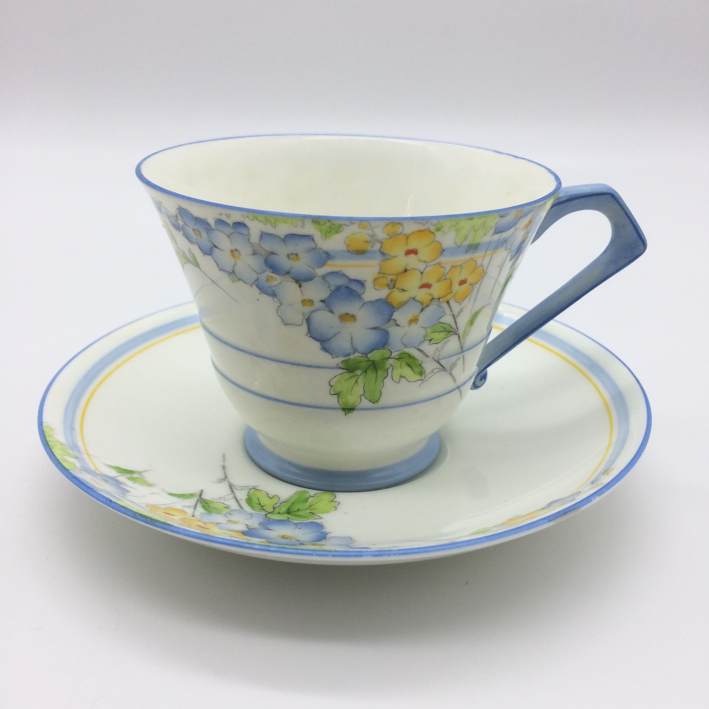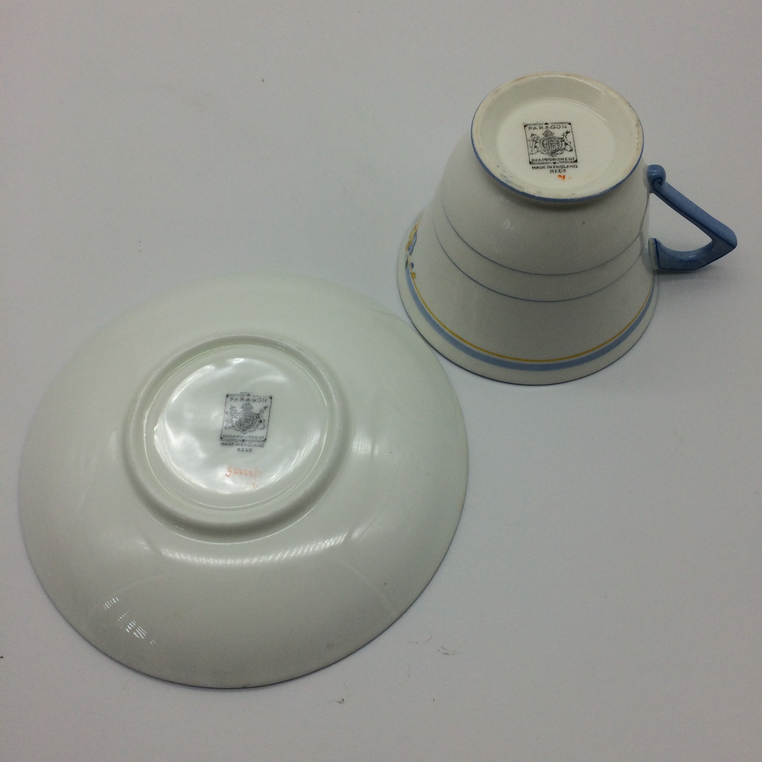 This attractive, art deco, ‘Paragon’ cup and saucer are beautifully hand-painted with pale blue and yellow flowers and green leaves, against a white background with blue trim. The pair are in excellent condition and carry the 1930’s Paragon backstamp.