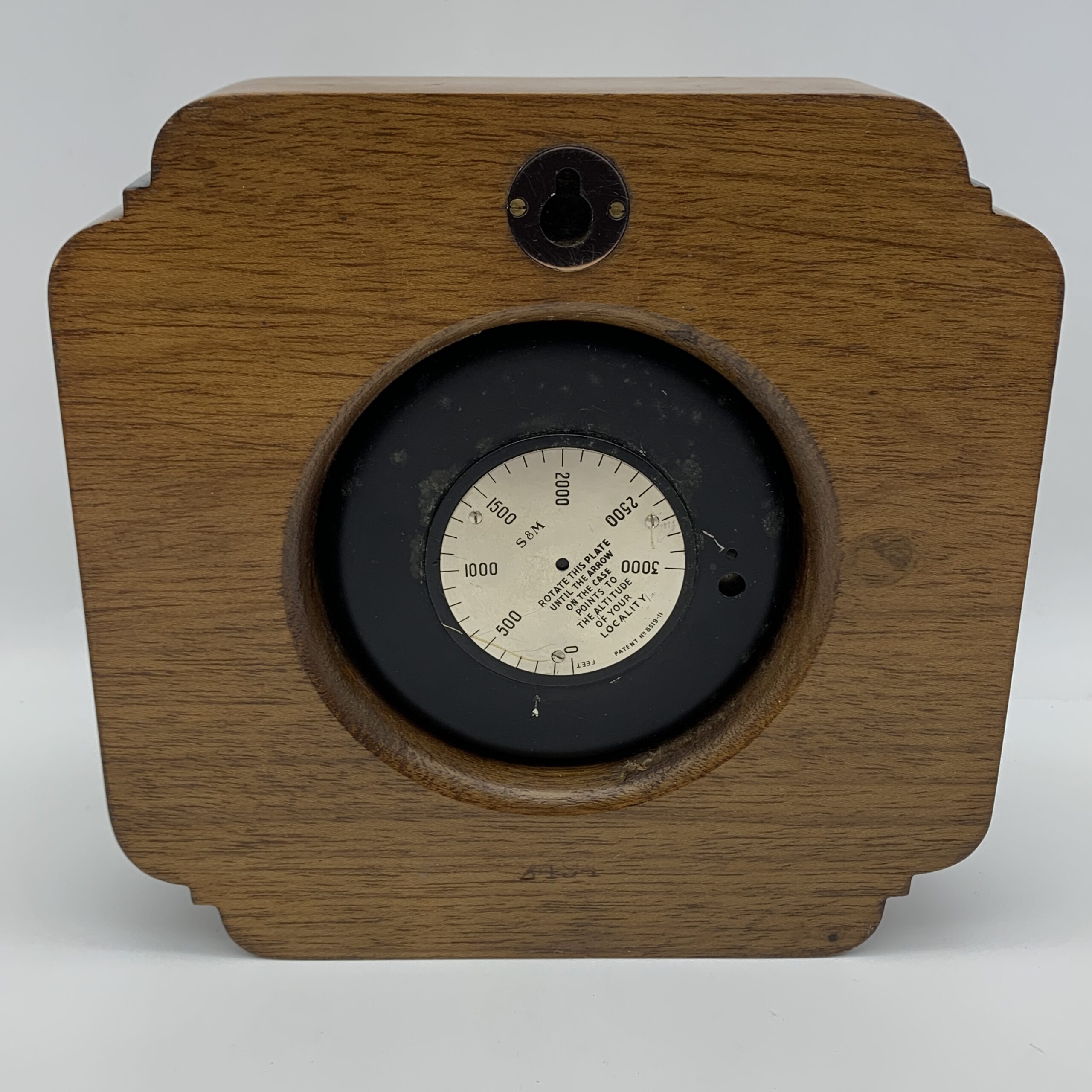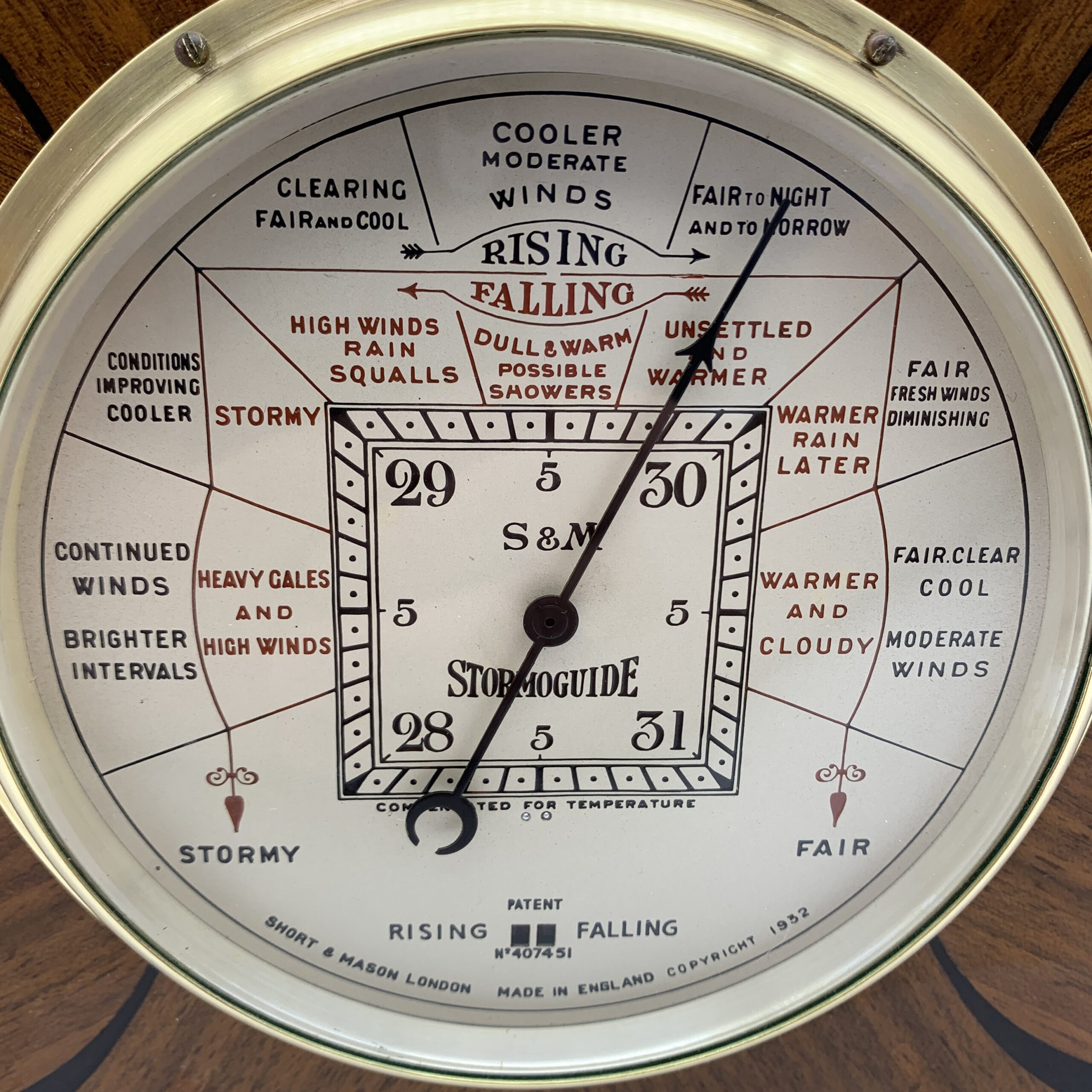 This impressive, scarce, early Art Deco aneroid ‘Stormoguide’ Barometer is mounted in a fabulous, wooden, mahogany square frame with decorative corners. It was made around the 1930’s in London by ‘SHORT & MASON’, who were well known British precision instrument makers. It has a large, behind glass, brass framed round dial, specially marked and worded with black & red detail, to enable the reading of future weather conditions. This lovely barometer is in excellent condition without any visible defects and appears to be working well. It measures 21cm x 20,5cm x 6cm, with a dial diameter of 14cm and weighs 1,5kg. The dial is marked ‘S & M’ with the number ‘407451’.