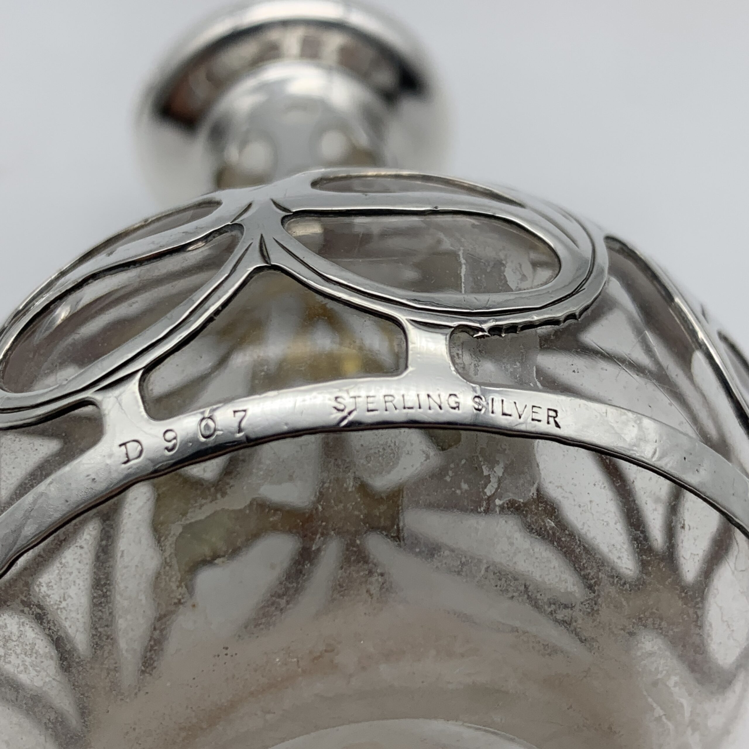 This fabulous, antique, American glass scent bottle and stopper has a wonderful shape and is beautifully decorated and engraved in a thick gauge ‘Gorham’ sterling silver art nouveau overlay. It probably dates between 1895 and 1910 and is stamped near the base ‘STERLING SILVER’ along with the number ‘D907’, a shape number used by the ‘Gorham’ silversmiths. Other than a very tiny chip to the bottom of the stopper and some white interior residue on the base, it’s in great condition. This lovely perfume bottle stands 10,5cm, has a diameter of 6cm and weighs 138g.