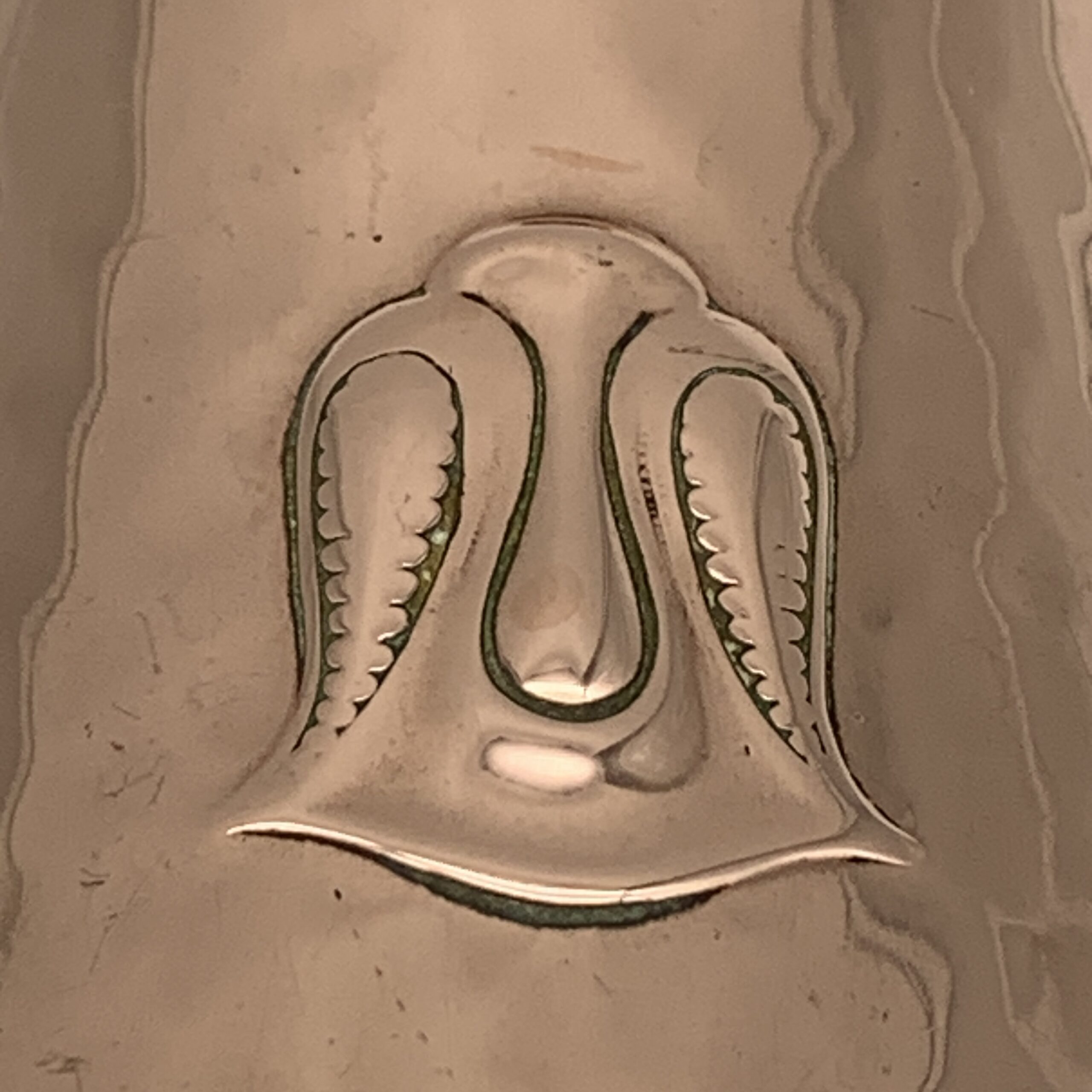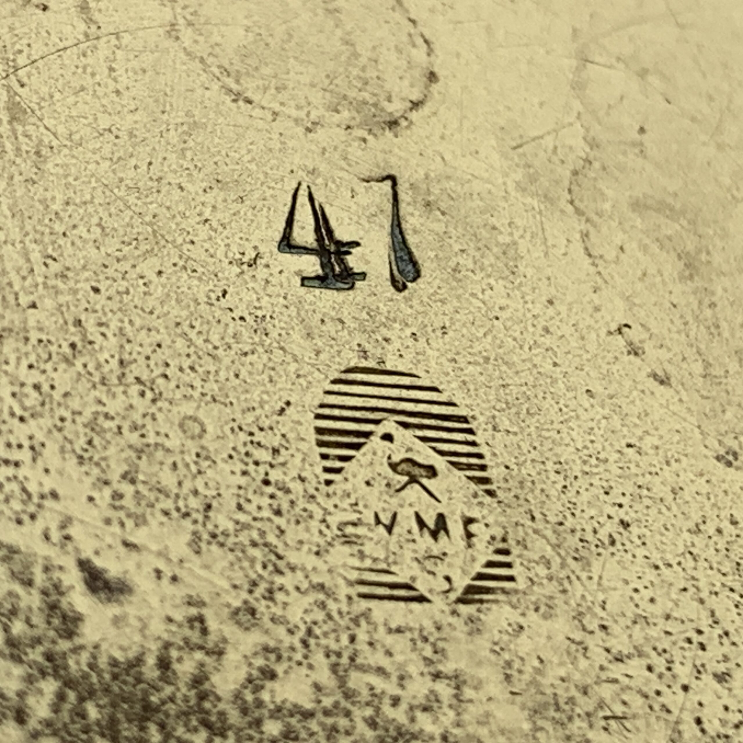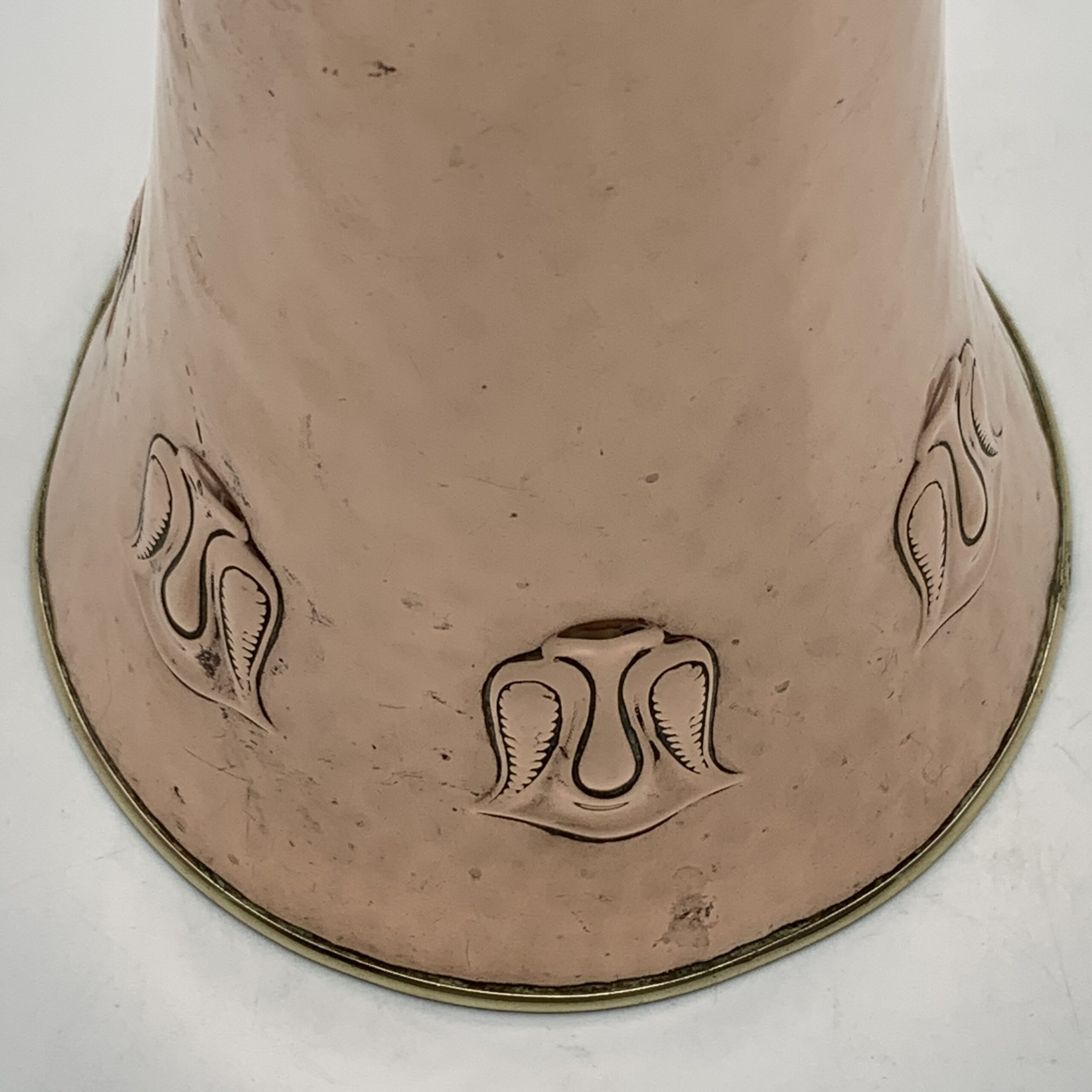 This wonderful, art nouveau, ‘jugendstil’ copper and brass lidded jug, with a hammered finish, was made in the early 1900’s by the sort after German factory ‘WMF’ (Wurttembergische Metallwaren Fabrik). It has an attractive shape with a slender, tapering copper body resting on a flared base and topped with a domed hinged lid. It is beautifully decorated around the lower half with raised, organic art nouveau detail and finished off with a brass handle and trim around the base. Other than a couple of very minor dents around the base it’s in great condition with a lovely, rich, polished colour and is stamped with the ‘WMF’ ‘Beehive Ostrich’ mark on the base. The jug stands 25cm high with a base diameter of 12cm and weighs 520g.