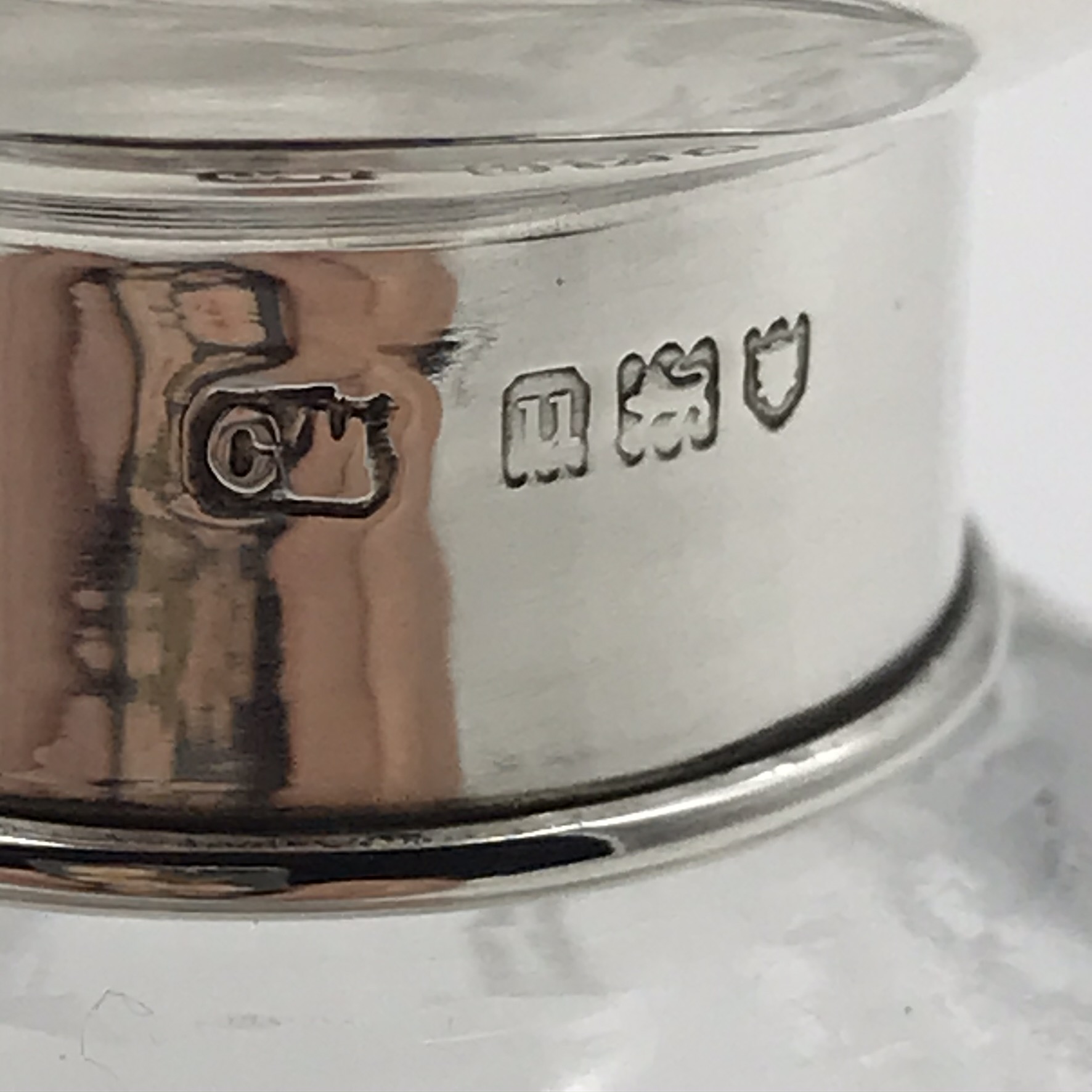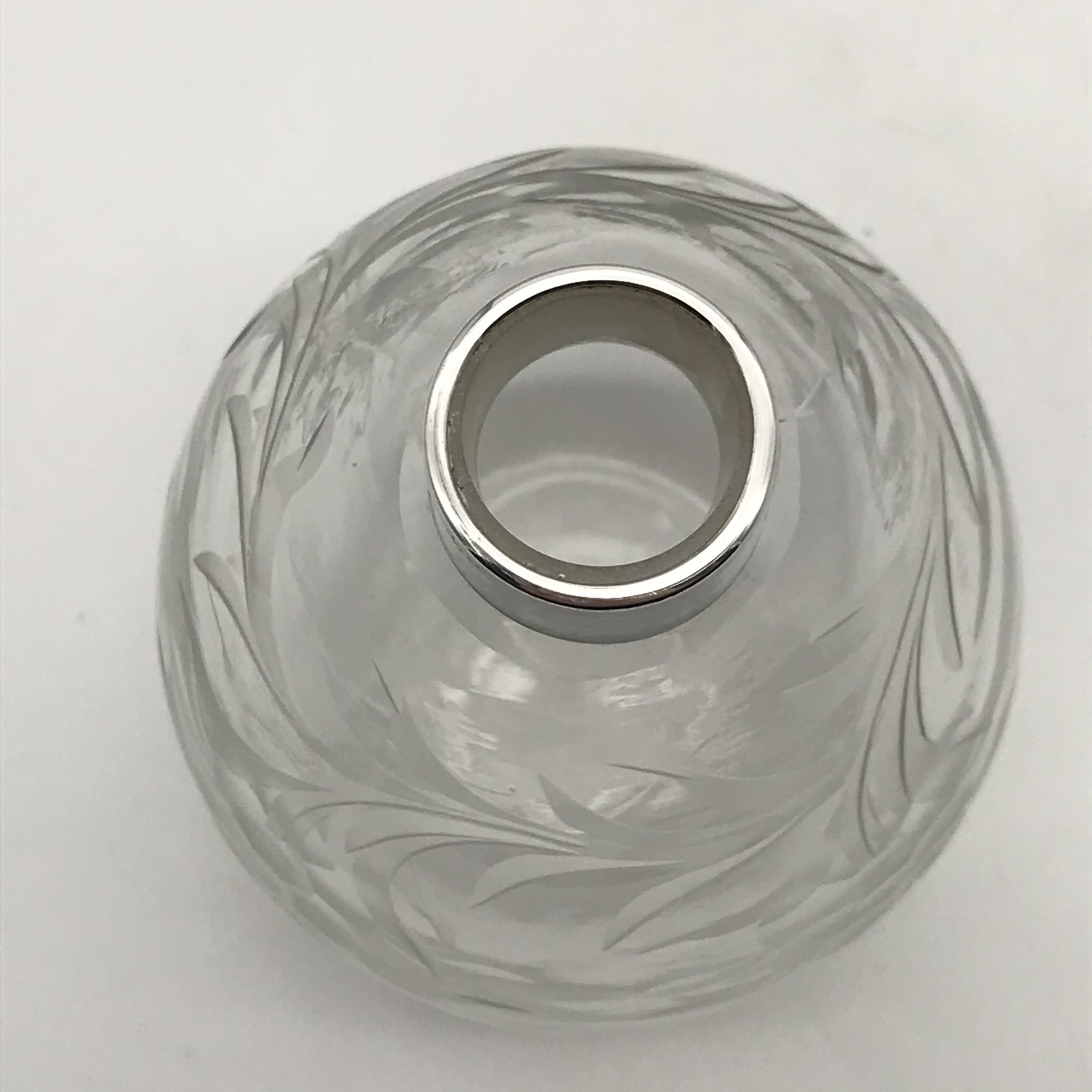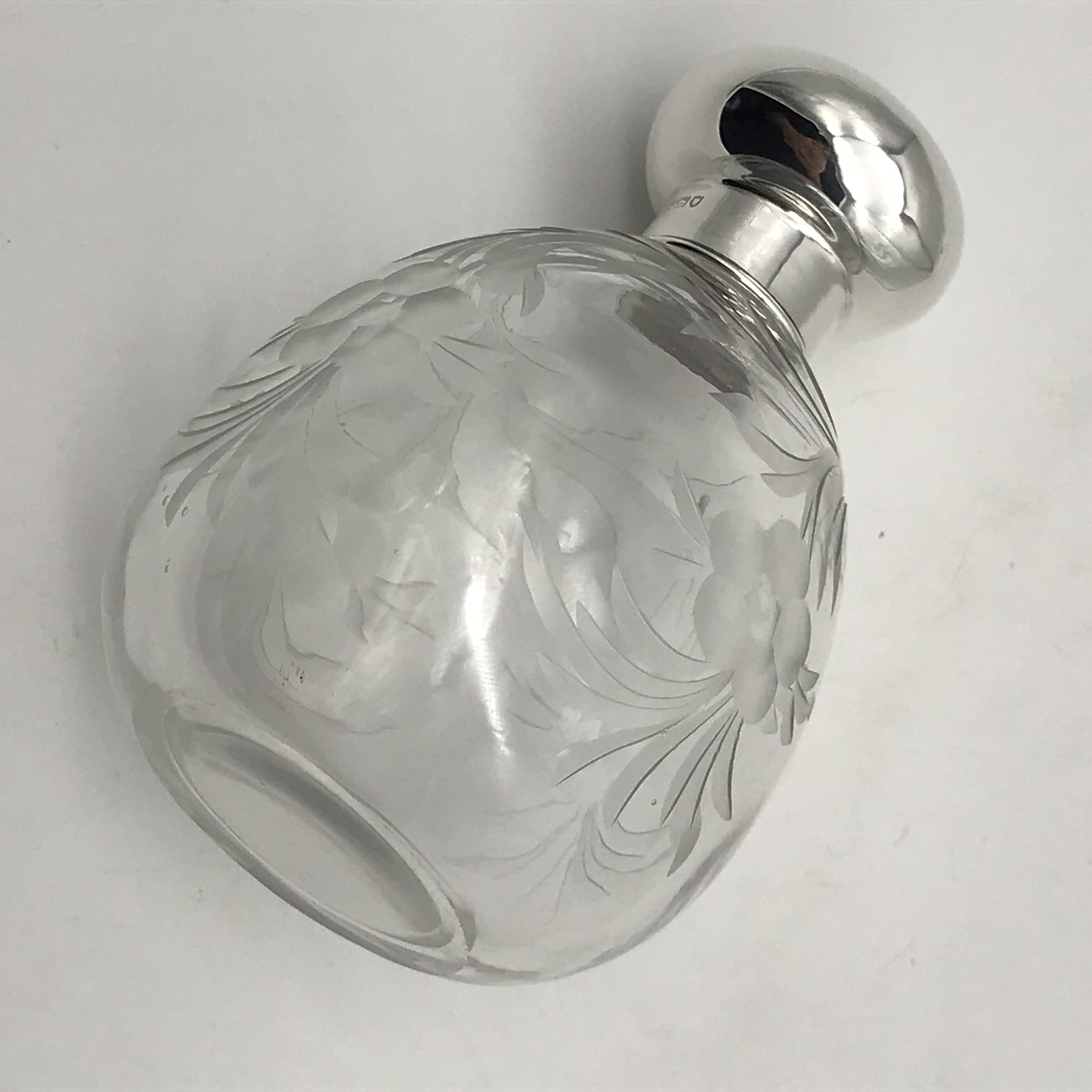 This very attractive, English hallmarked, sterling silver and crystal antique perfume bottle is in excellent condition and comes with its original small stopper. It has a very pretty and beautifully hand-cut floral body with a solid silver domed pull-off lid and collar. The lid was made in London in 1915 by silversmiths ‘Charles May’ (C.M). The scent bottle stands 11cm high with a diameter of 7,5cm at its widest, and weighs 292g.
