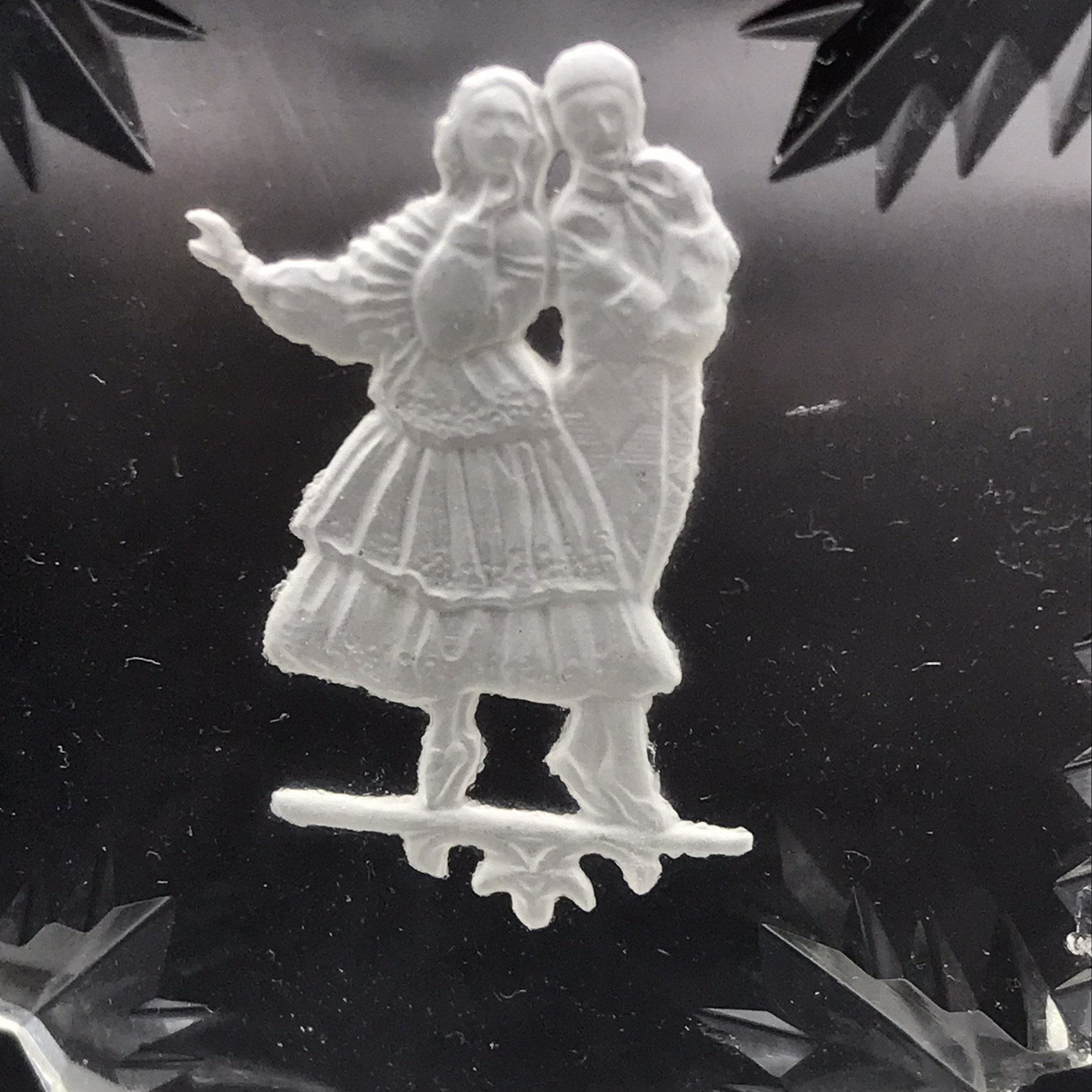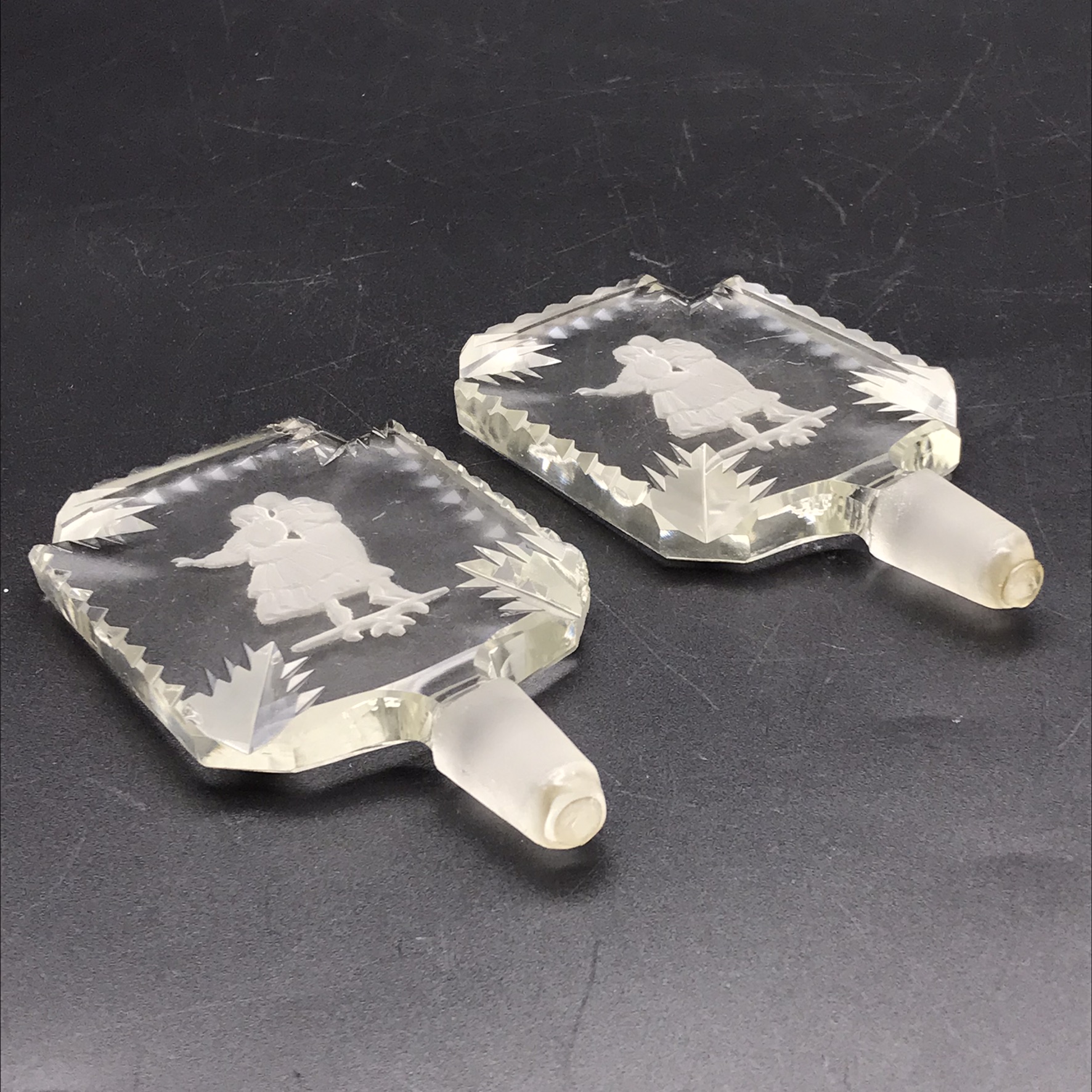 This beautiful, early pair of matching, art deco, cut-crystal scent bottles have unusual deep, star-cut bodies with fabulous, large intaglio etched stoppers. They’re beautifully cut in a thick gauge crystal with a solid square base, making them difficult to knock over. The large crystal stoppers are rectangular in shape with a lovely thickness and cut corners and each have an etched, intaglio cut ‘dancing couple’ in the centre. Other than a few very tiny nicks they’re in great condition and the stoppers fit well. They each stand 13cm high, 6,3cm without the stoppers, have a base measurement of 6cm x 6cm and together weigh 510g.