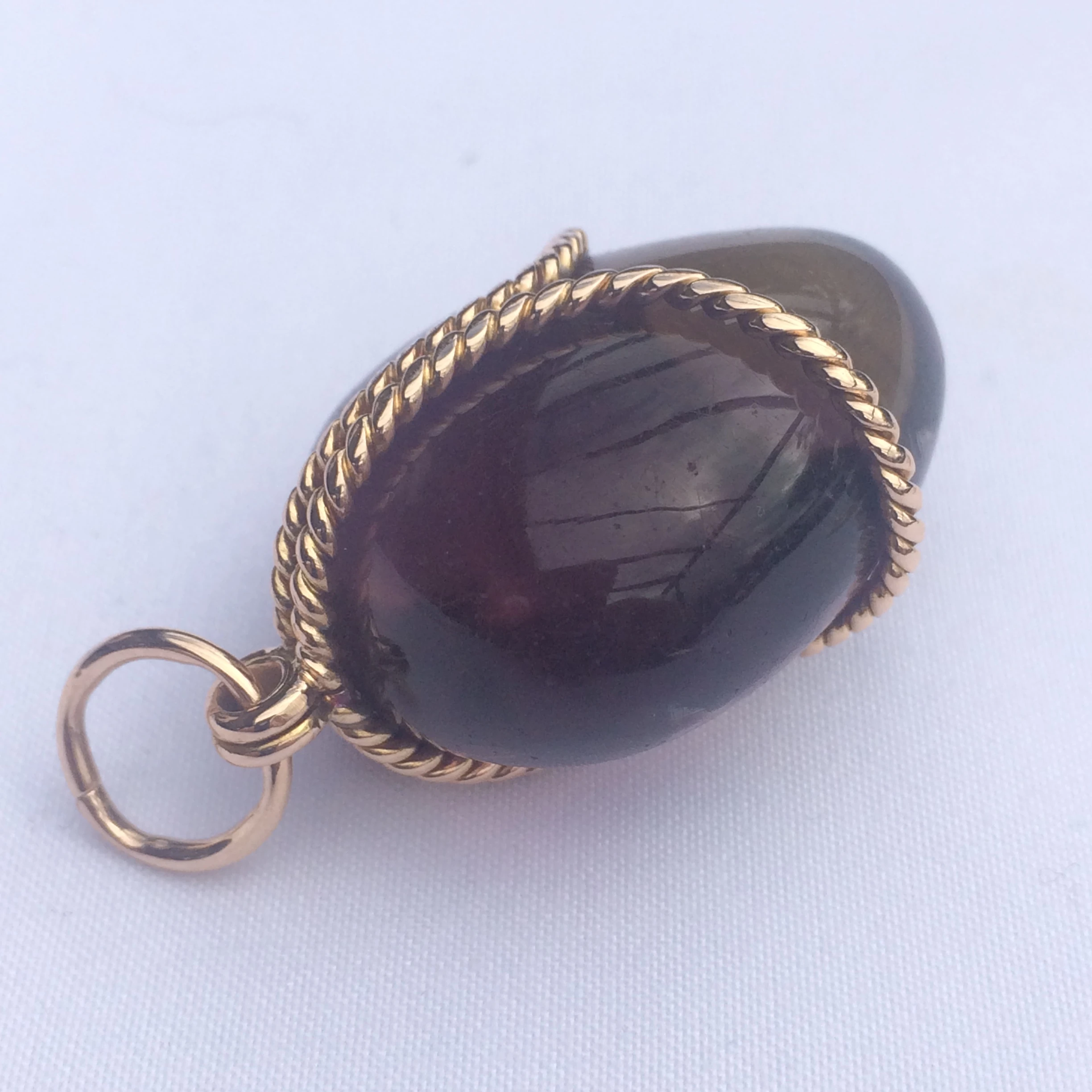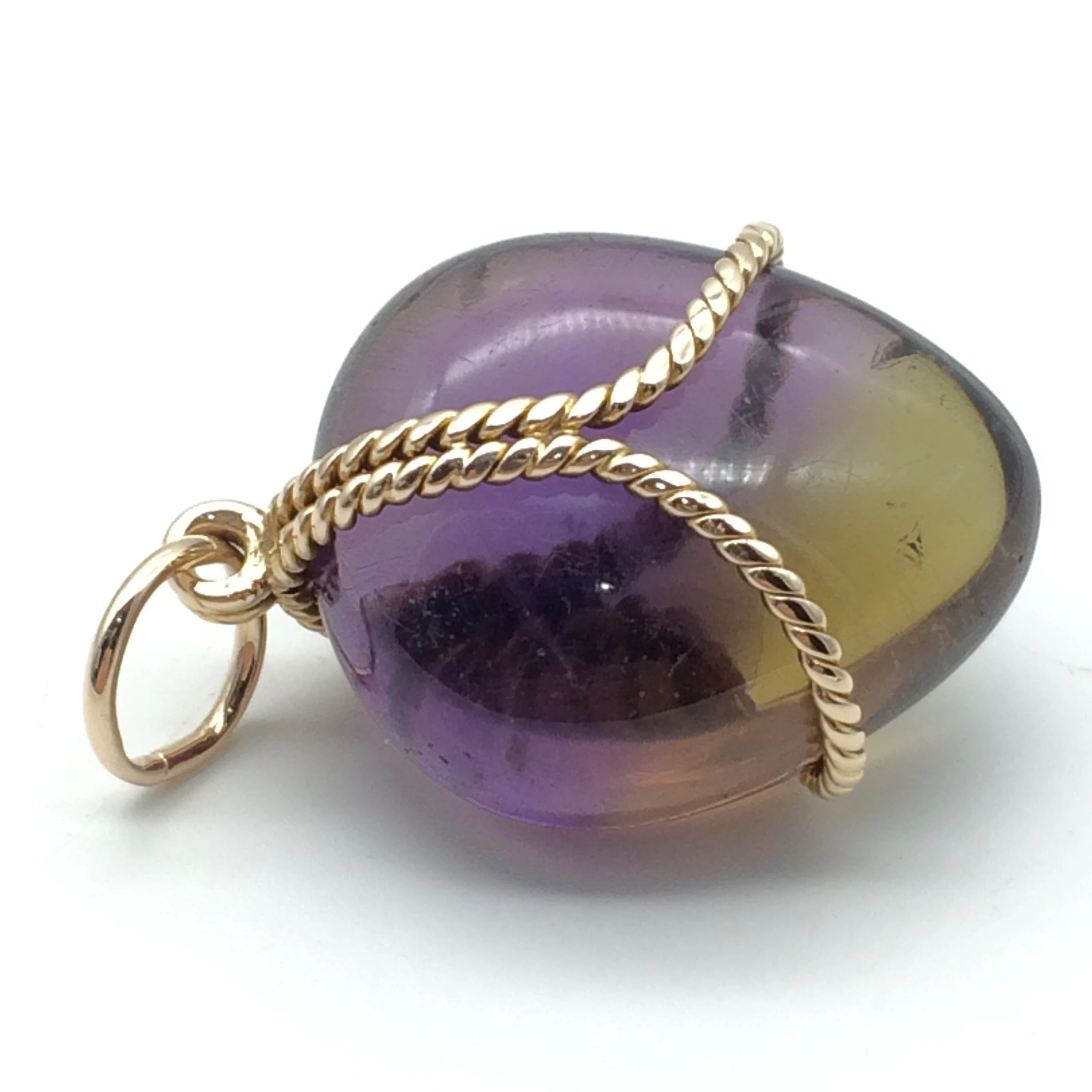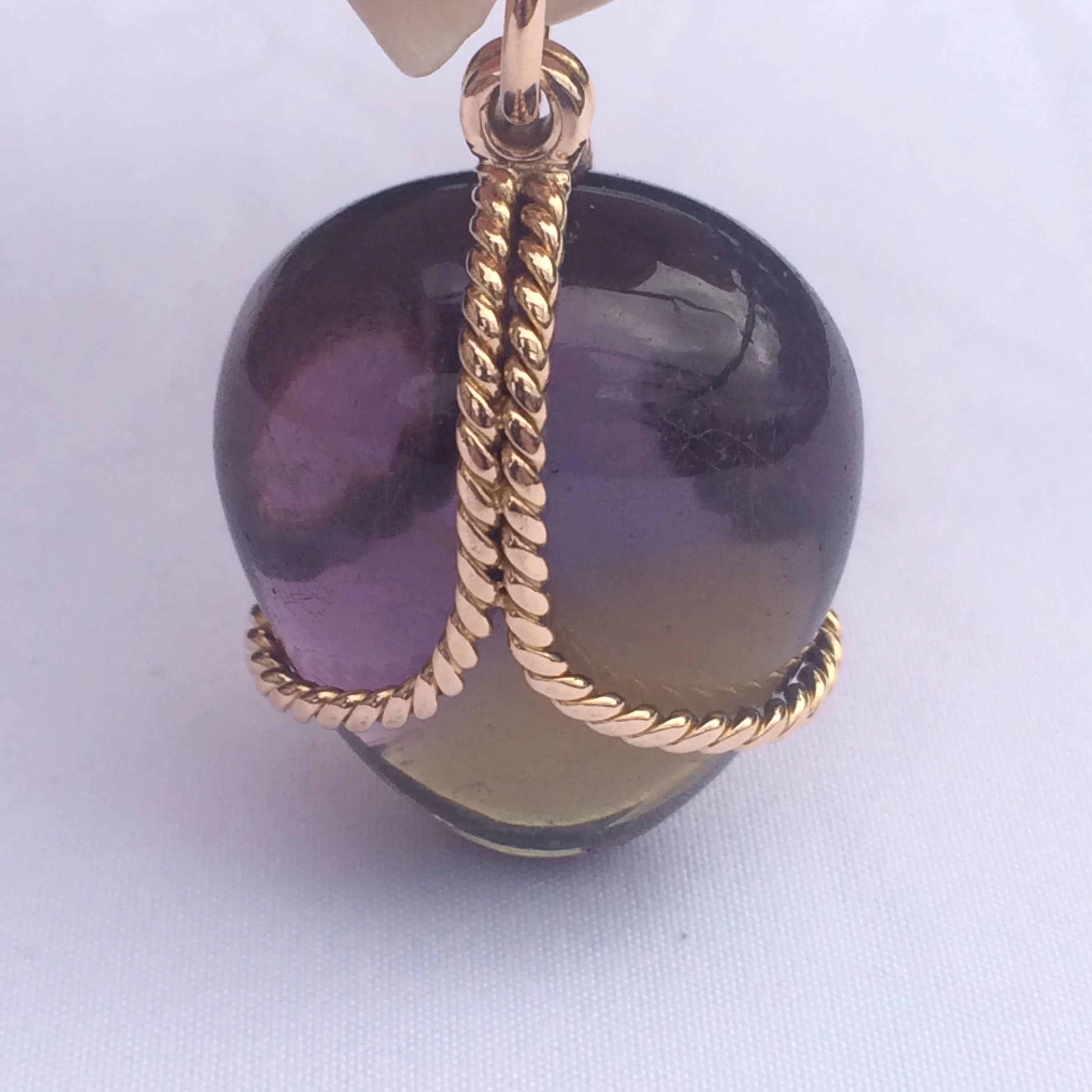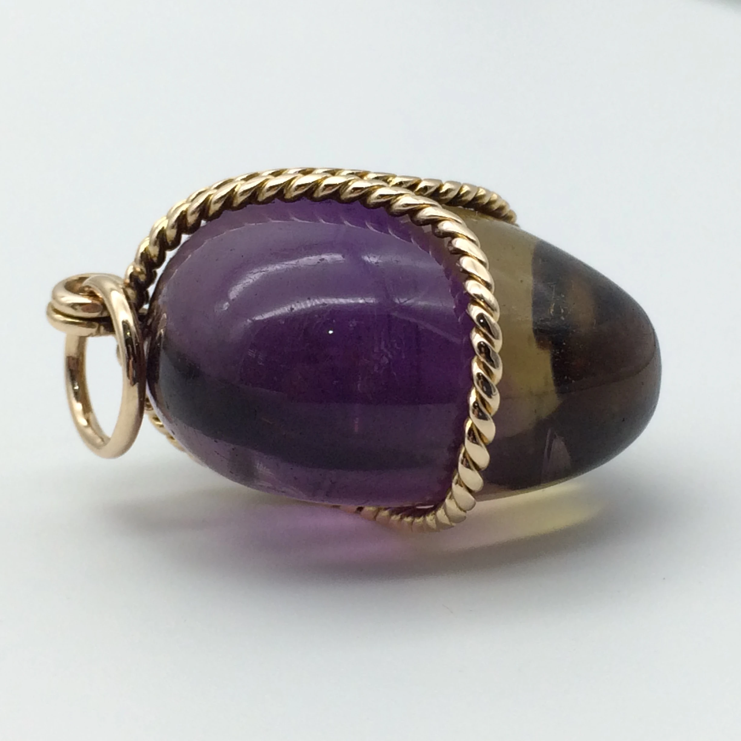 This unusual and very attractive, vintage pear-shaped gold pendant is set with a large natural cabochon, seldom seen, Ametrine stone. The stone is transparent, with a lovely mixture of purple and golden yellow towards the bottom. It is set in an attractive and simple setting which presents the stone well. The pendant measures 26mm x 37mm (45mm with hanger) x 20mm, weighs 24,1g and is in excellent condition. This pendant comes with a detailed valuation, a copy of which is listed below. The replacement value is R13800.